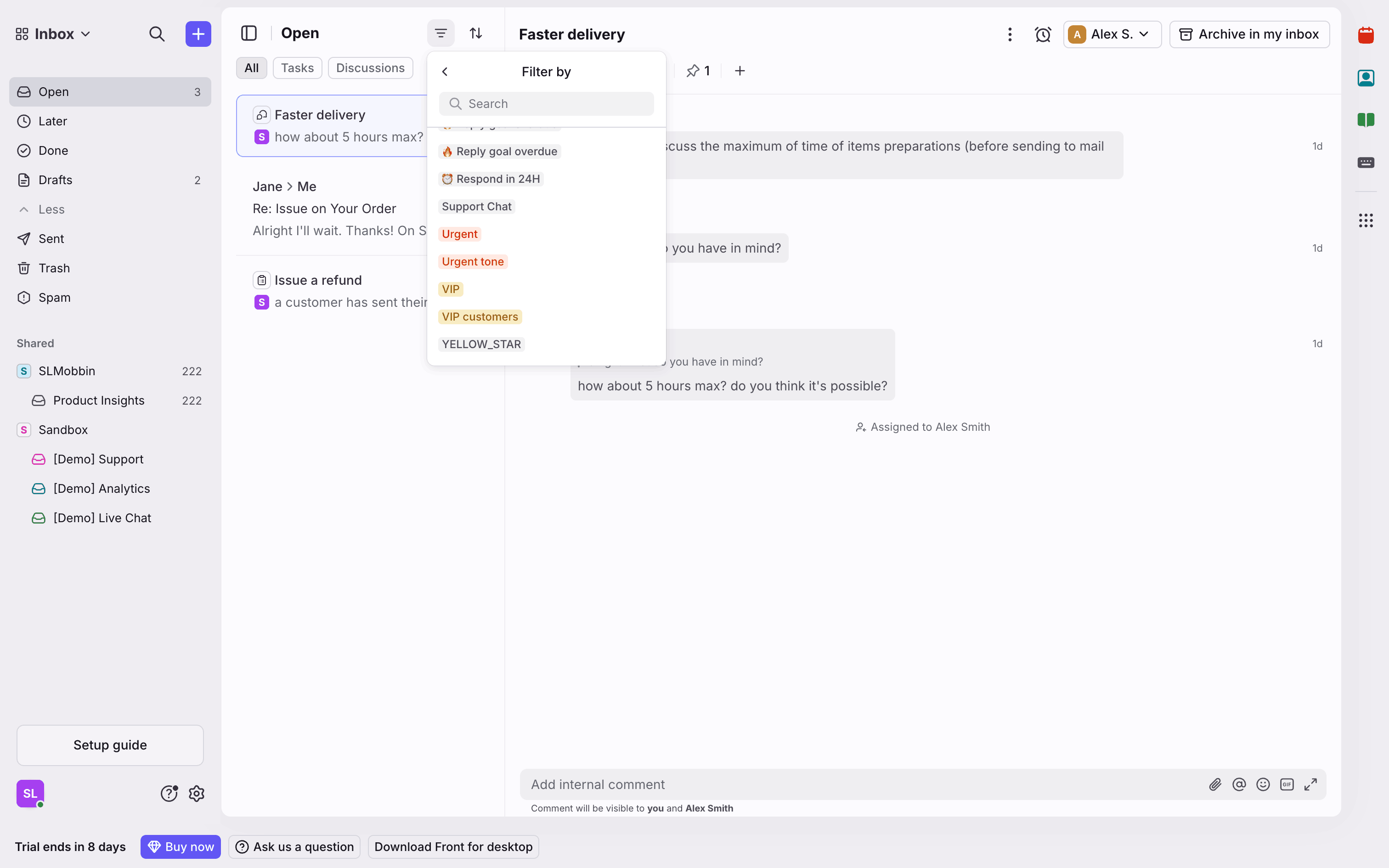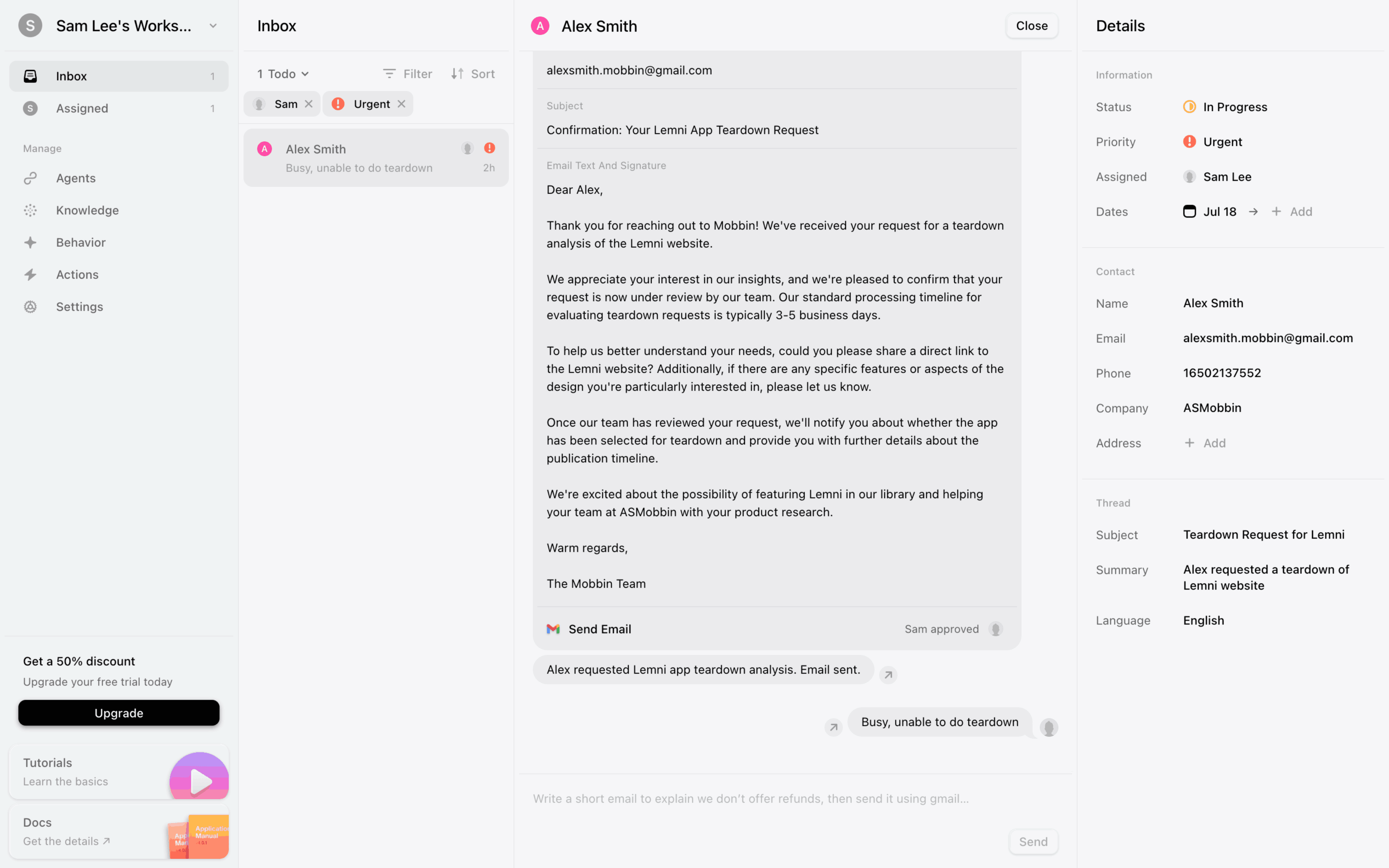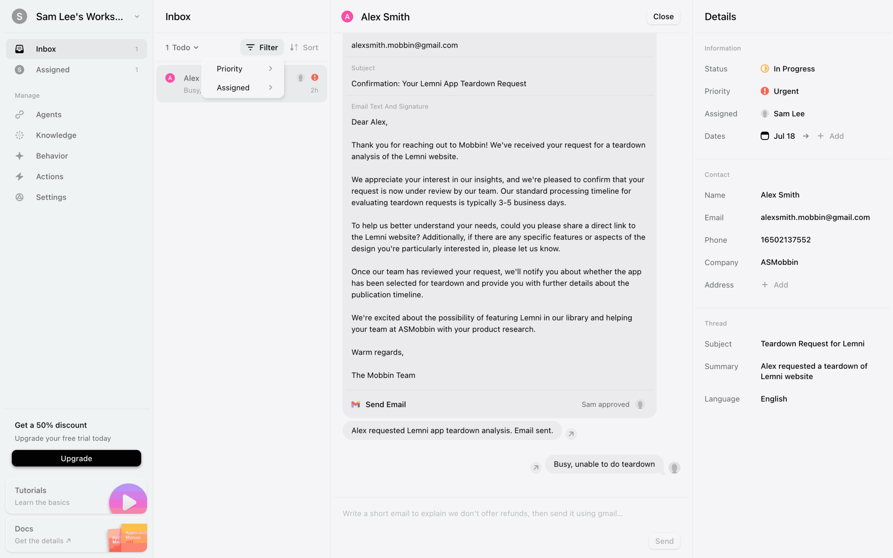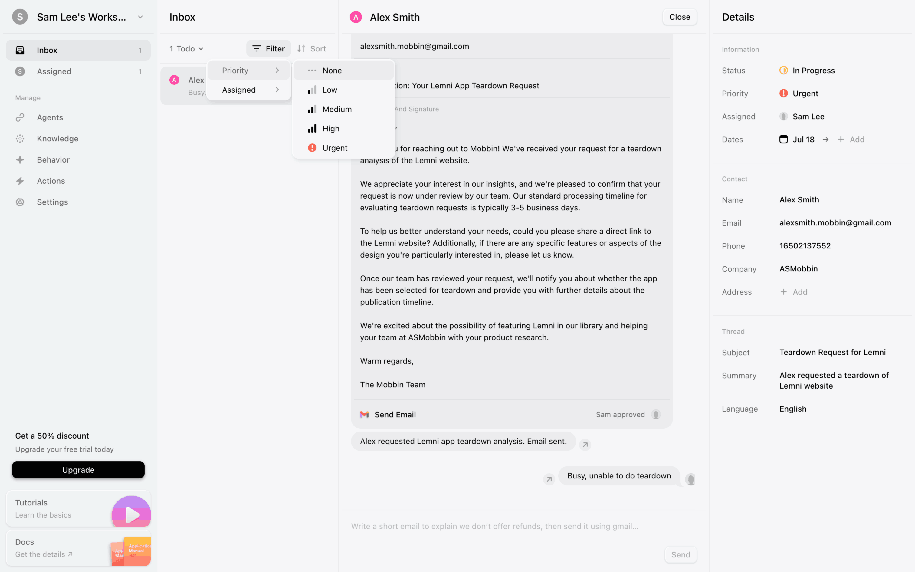The user changes an email's priority. They open the priority dropdown, select "Urgent", and the inbox updates to reflect this change.