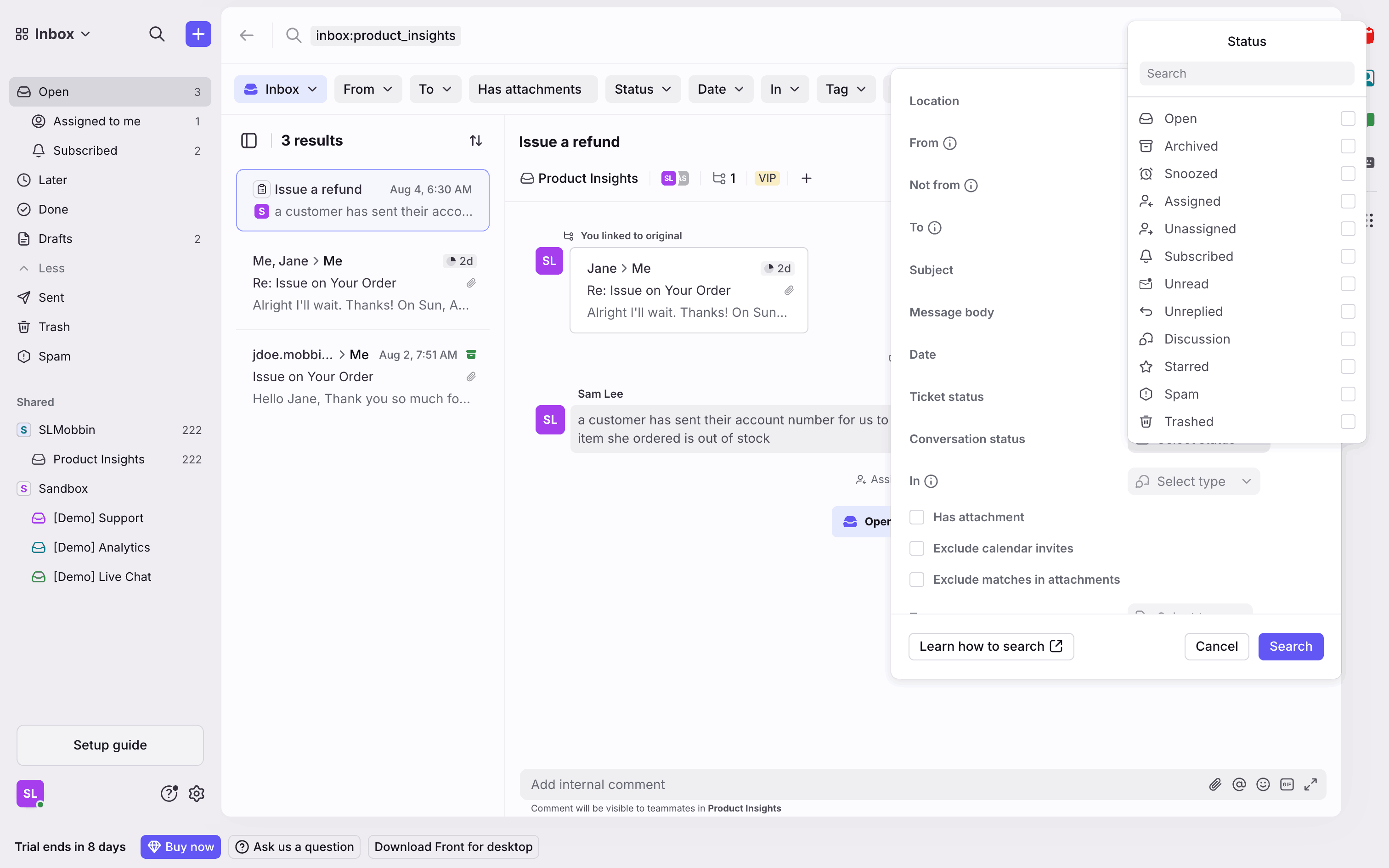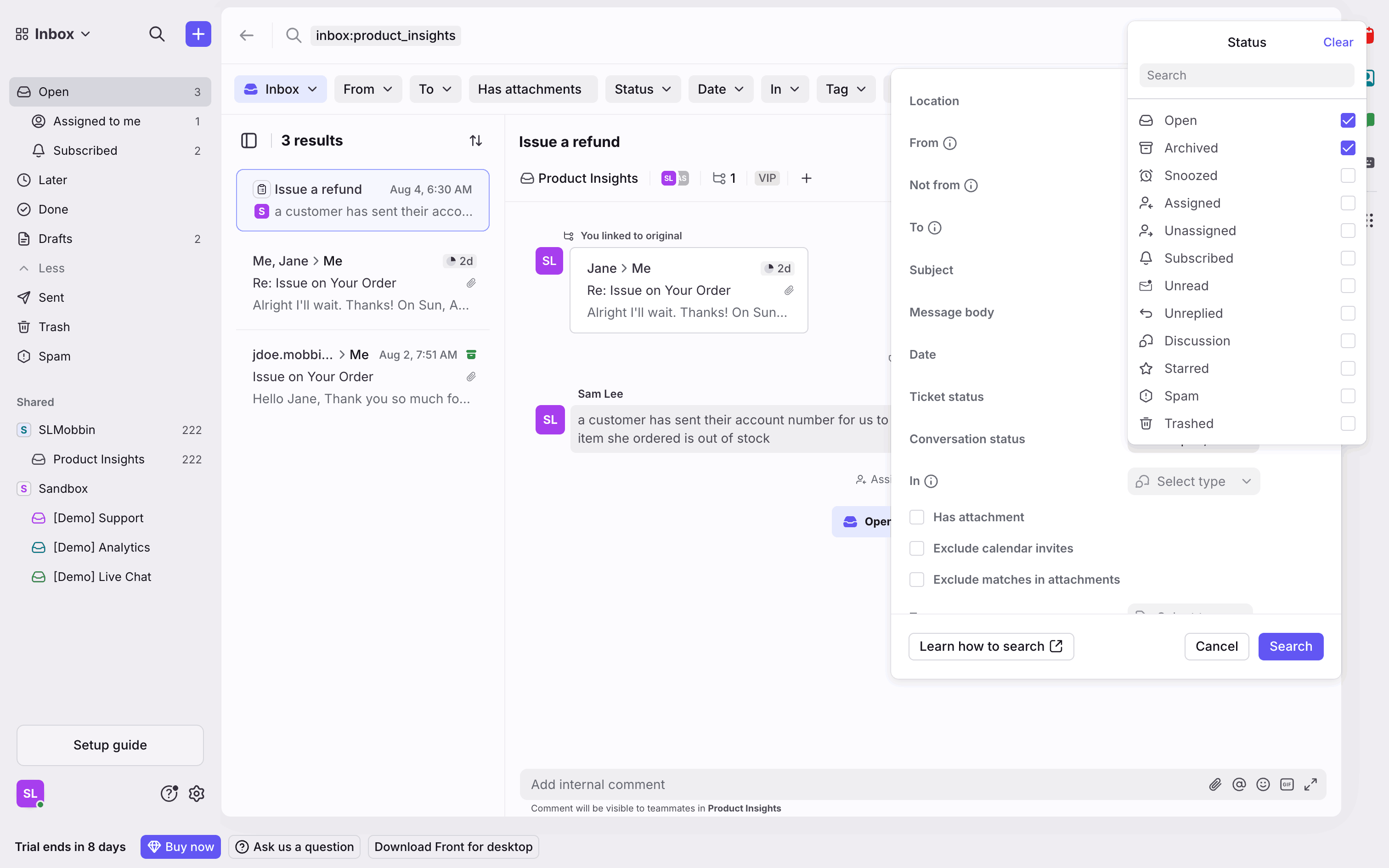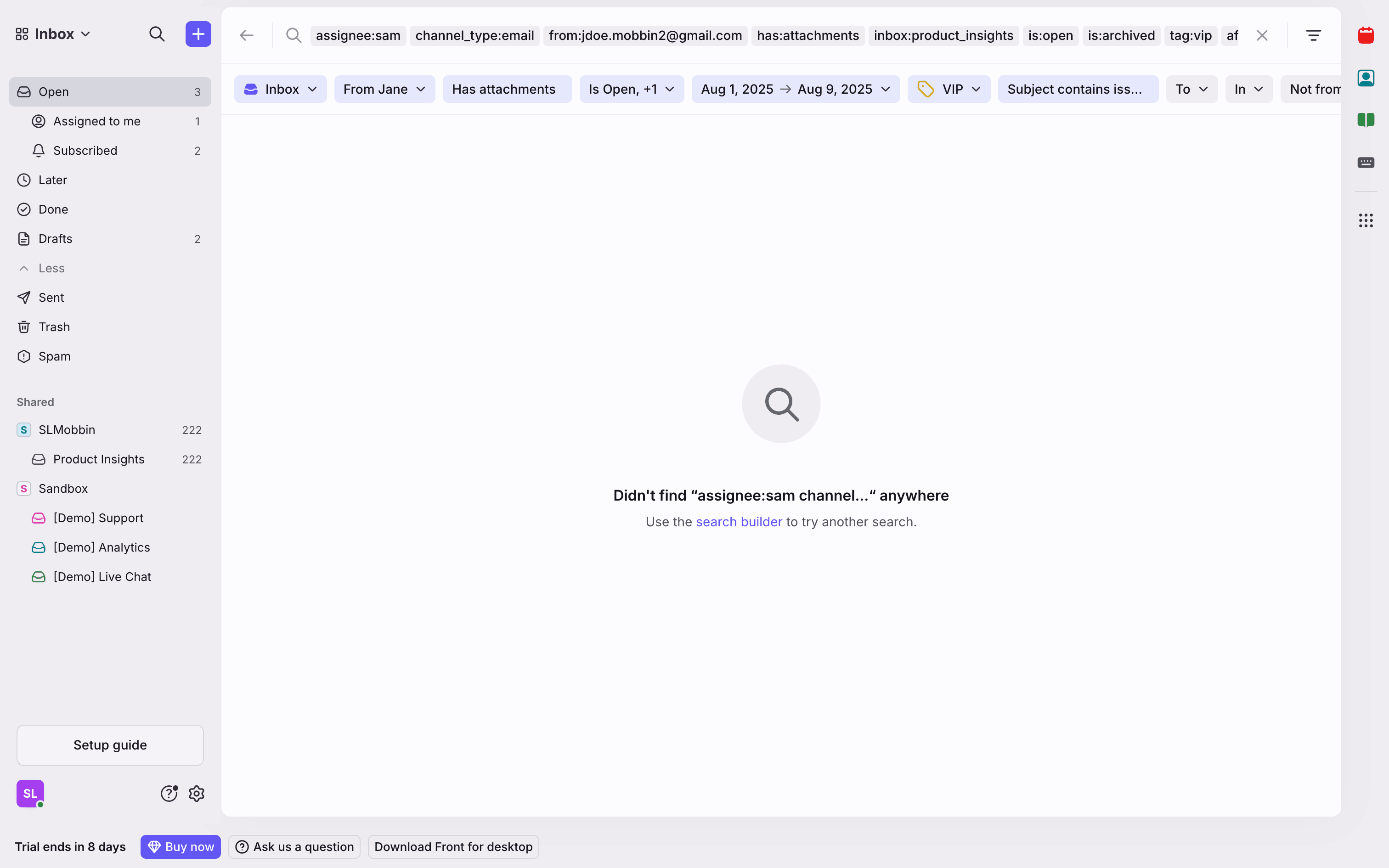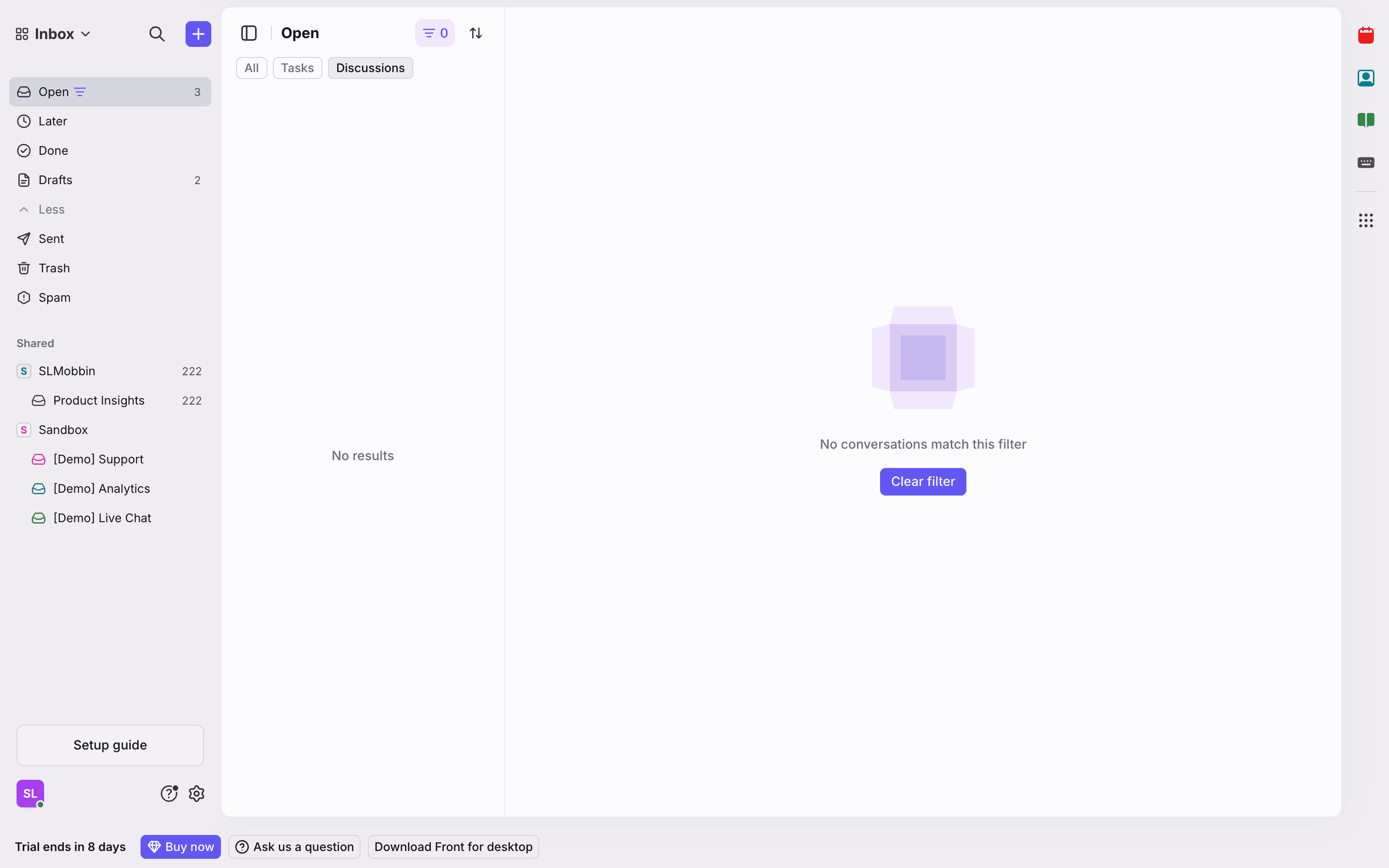 The user filters and sorts their inbox. They apply a filter that results in no conversations being displayed.