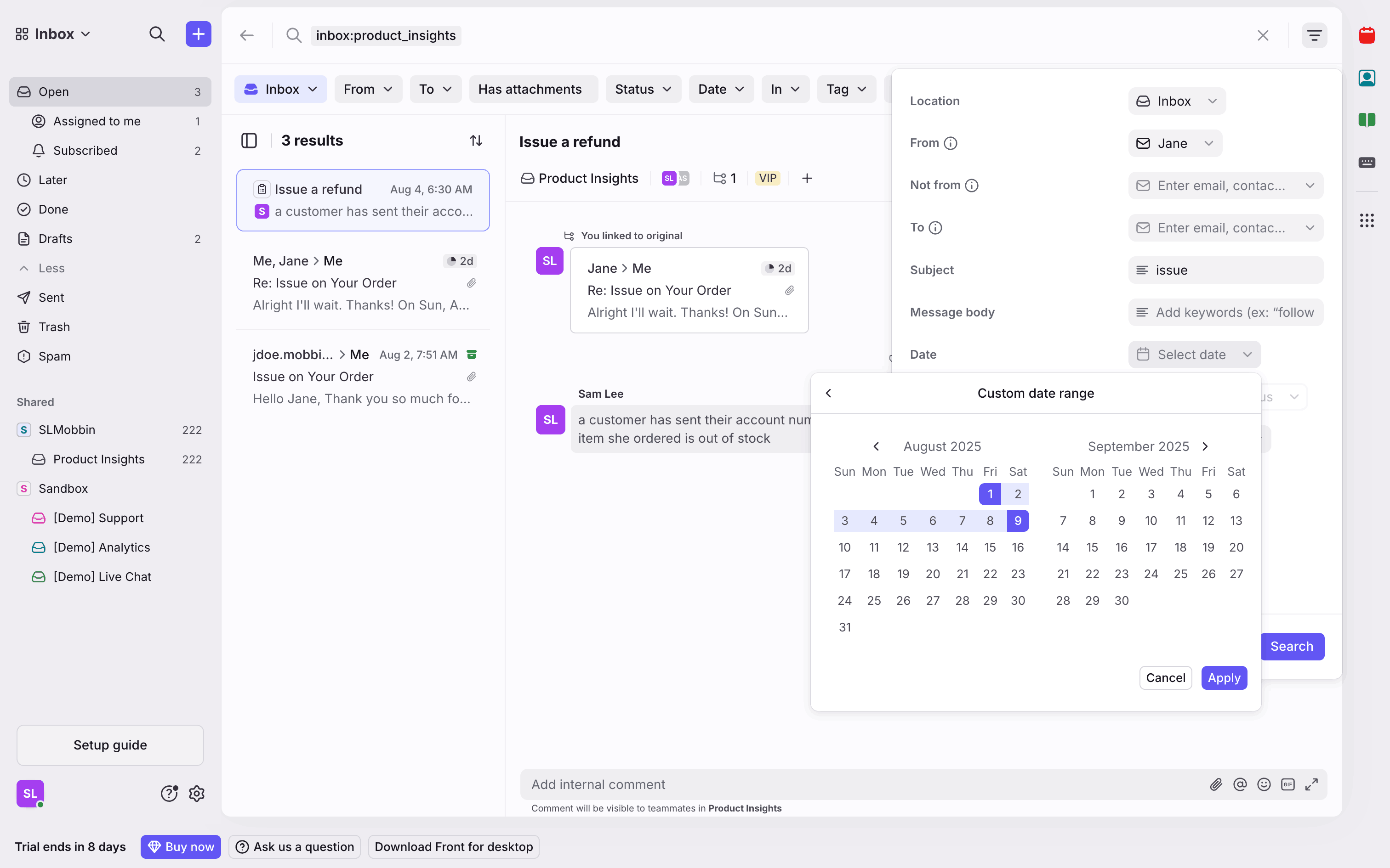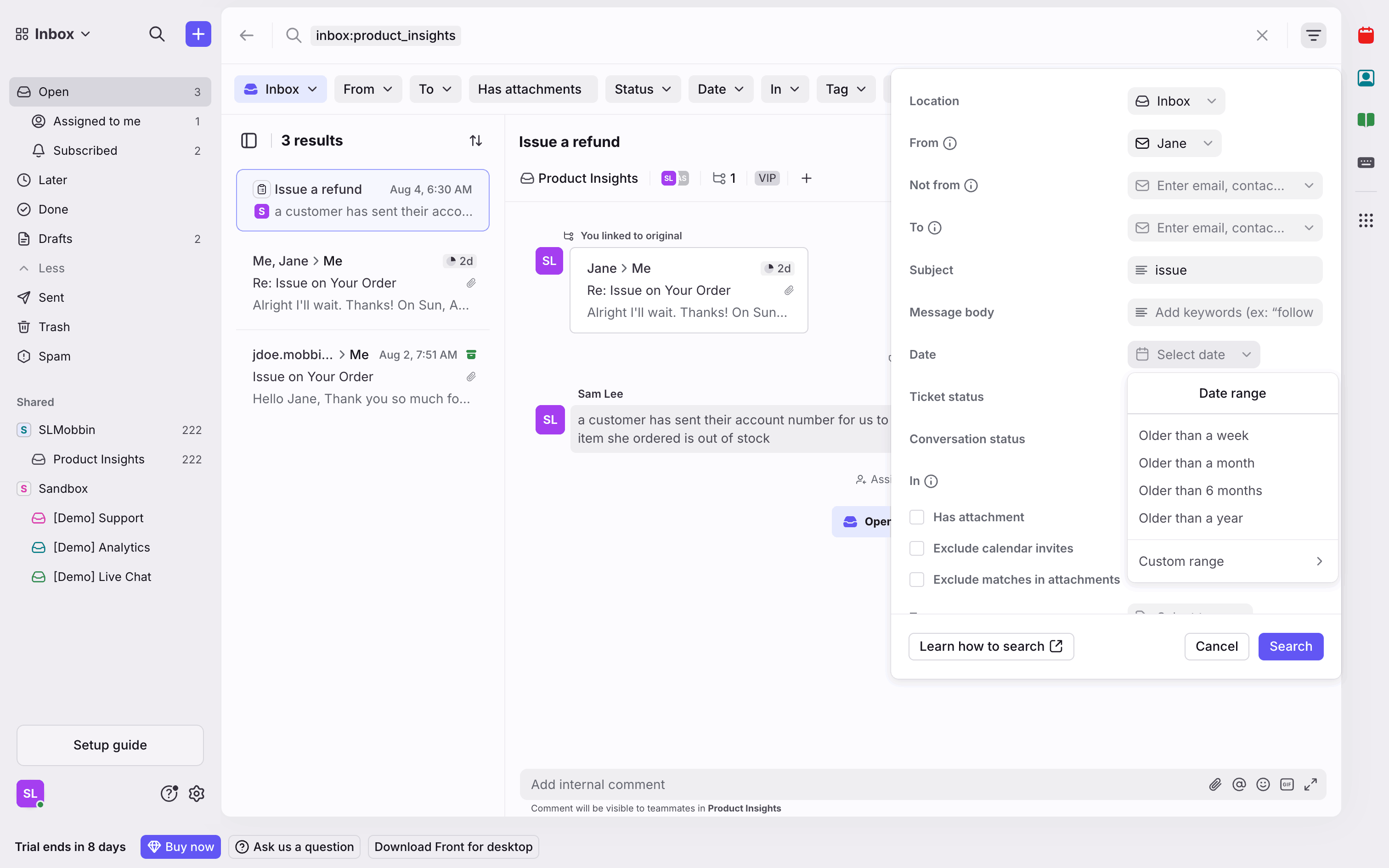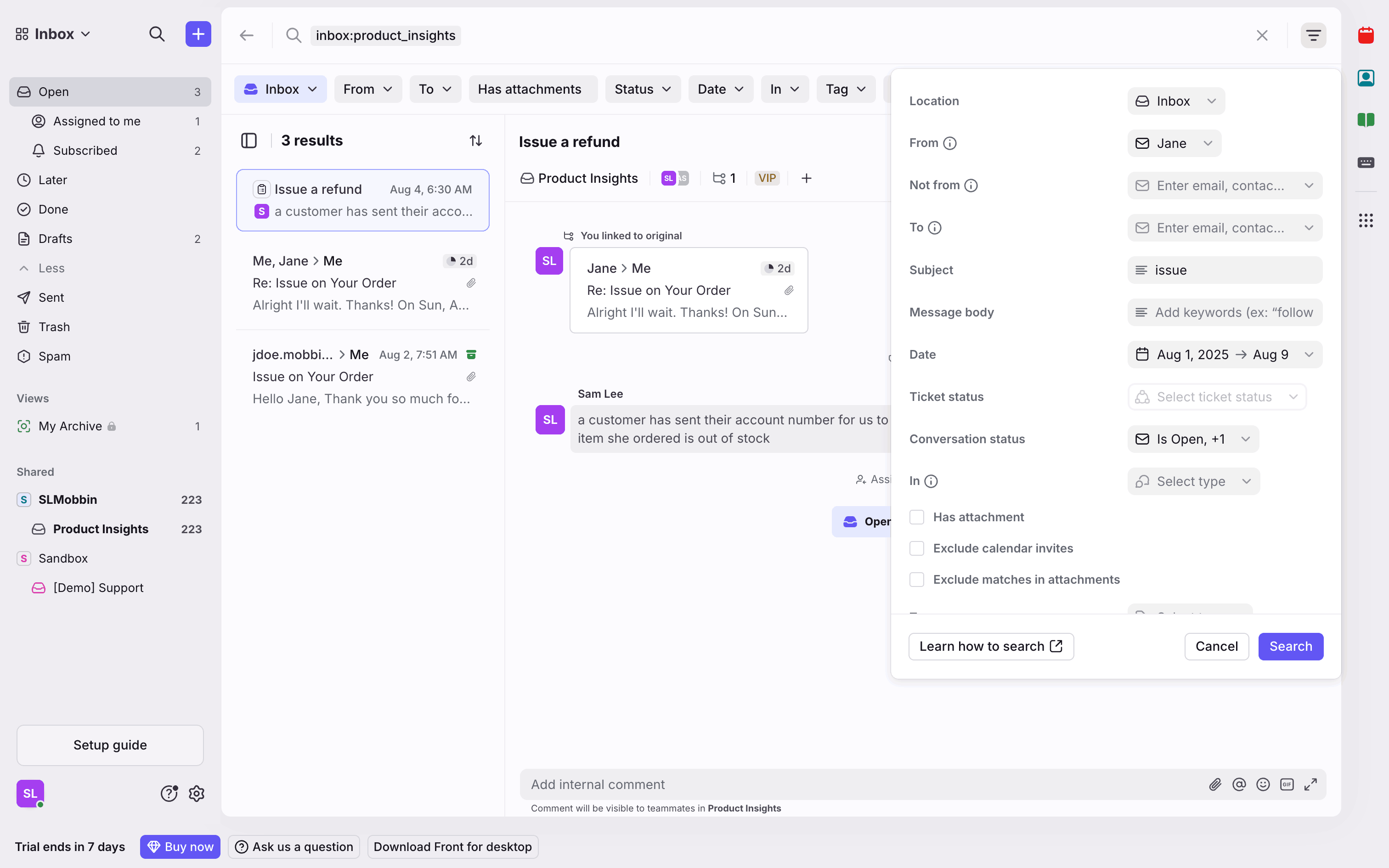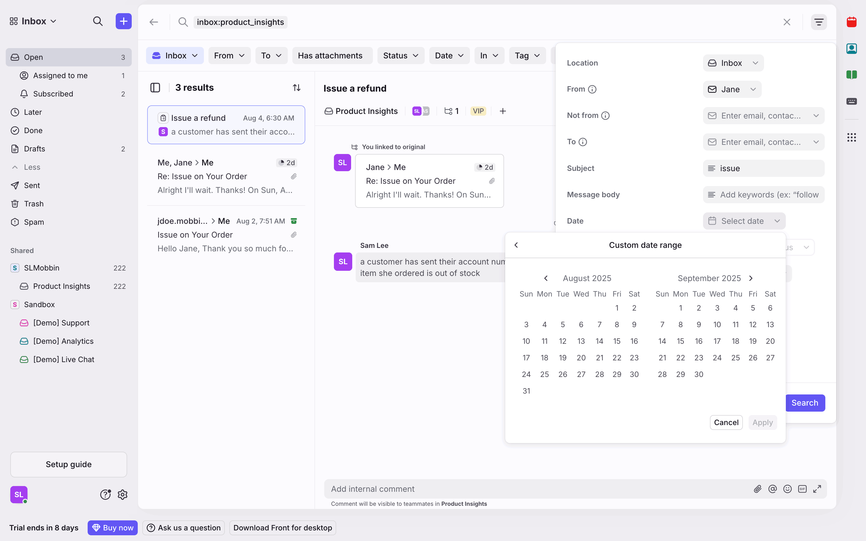 The user filters and sorts their inbox. They apply a filter that results in no conversations being displayed.