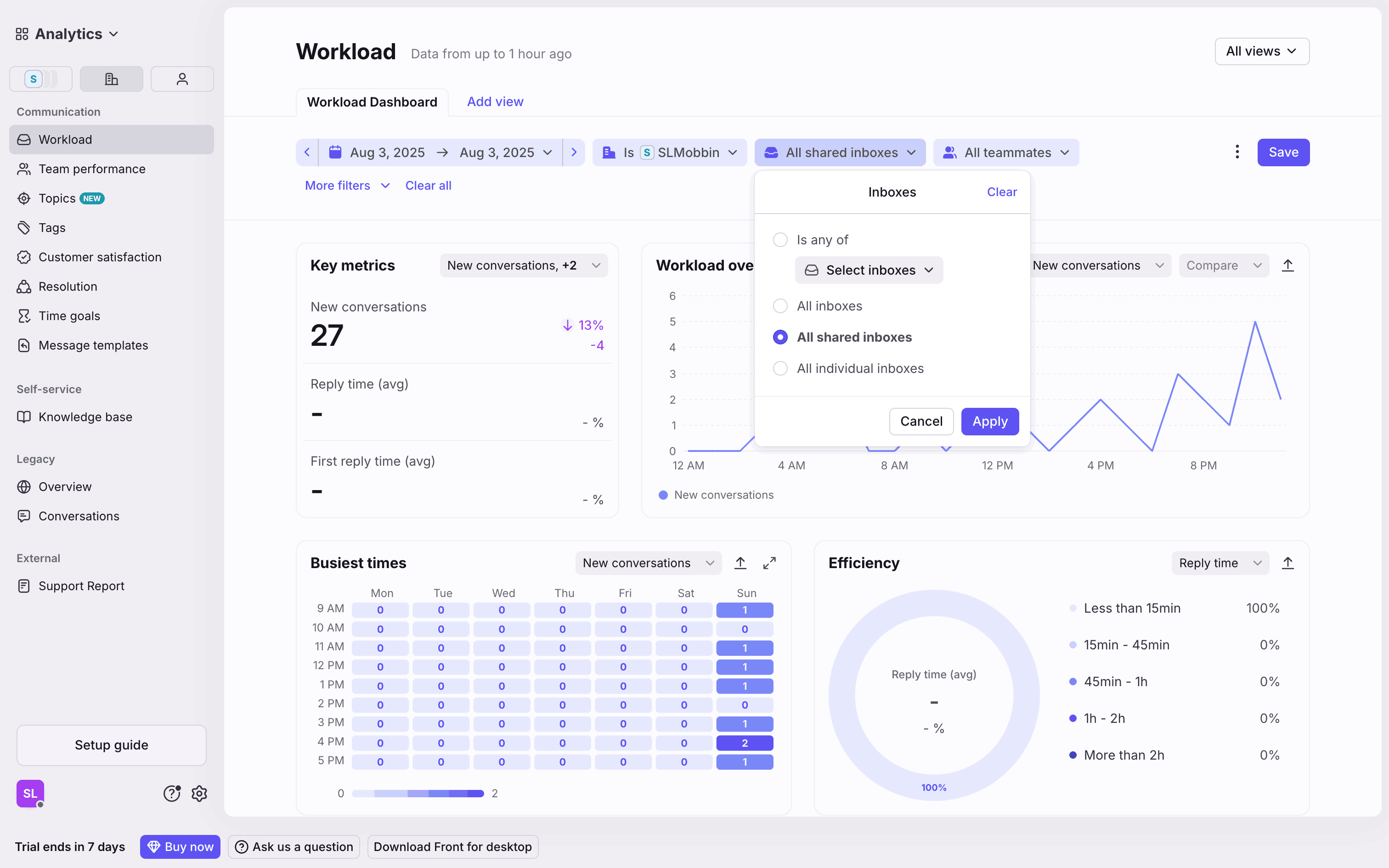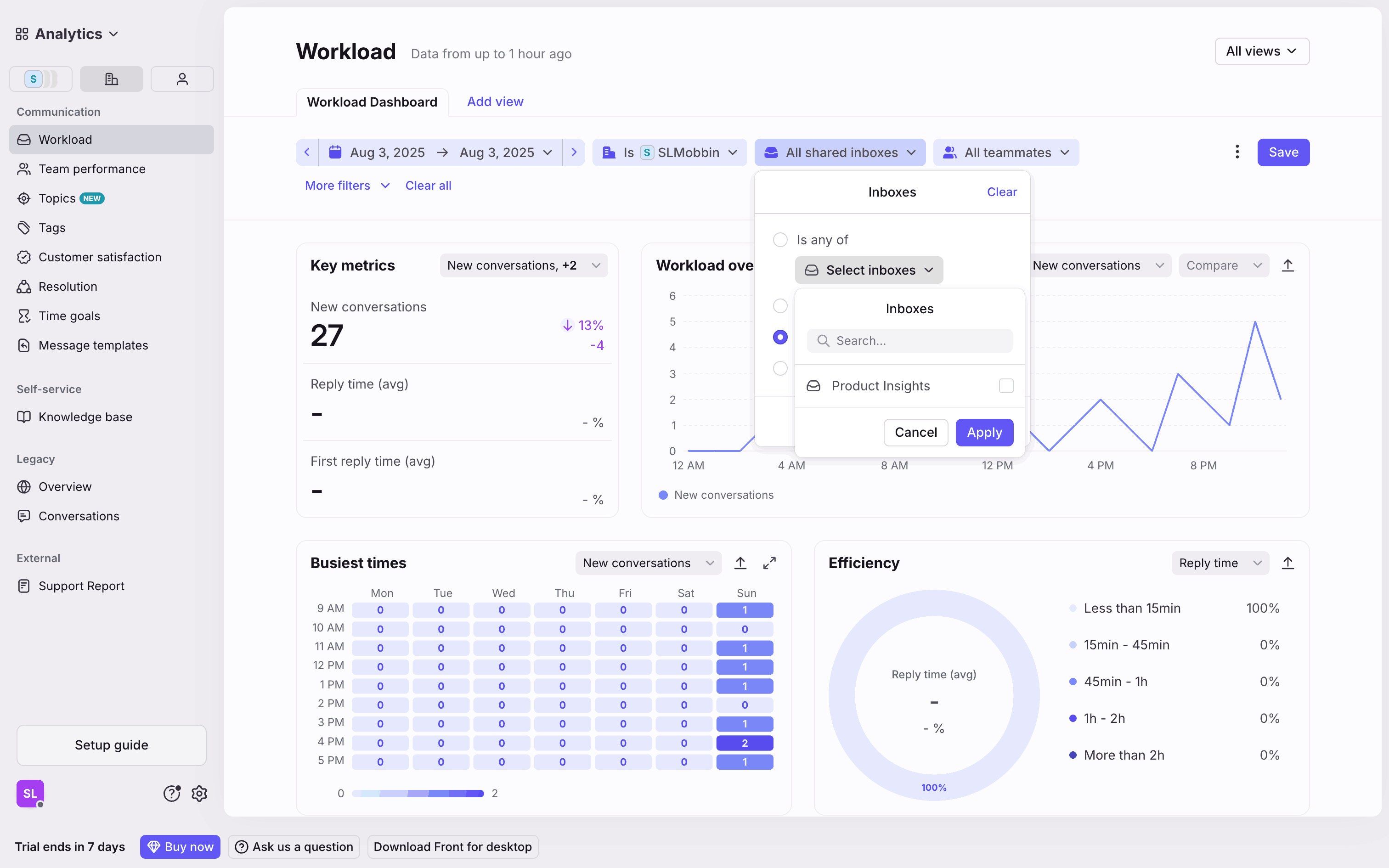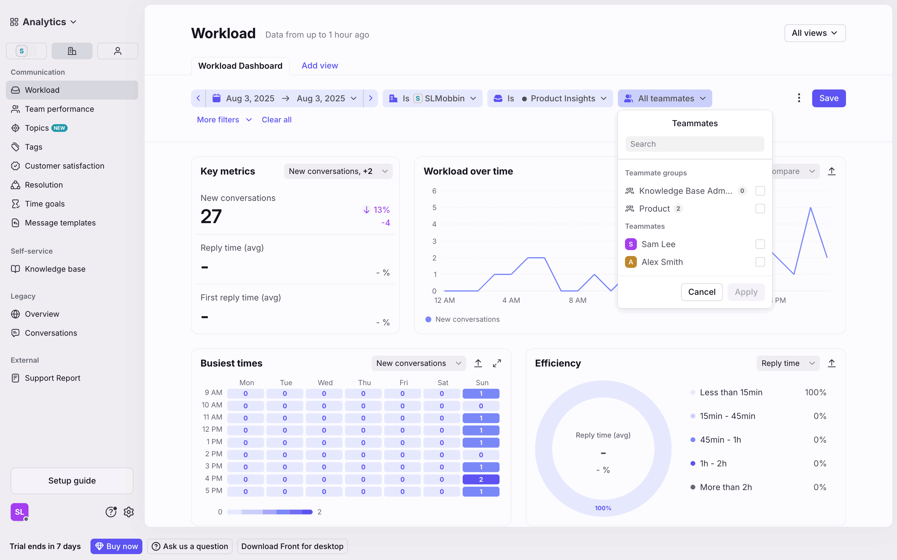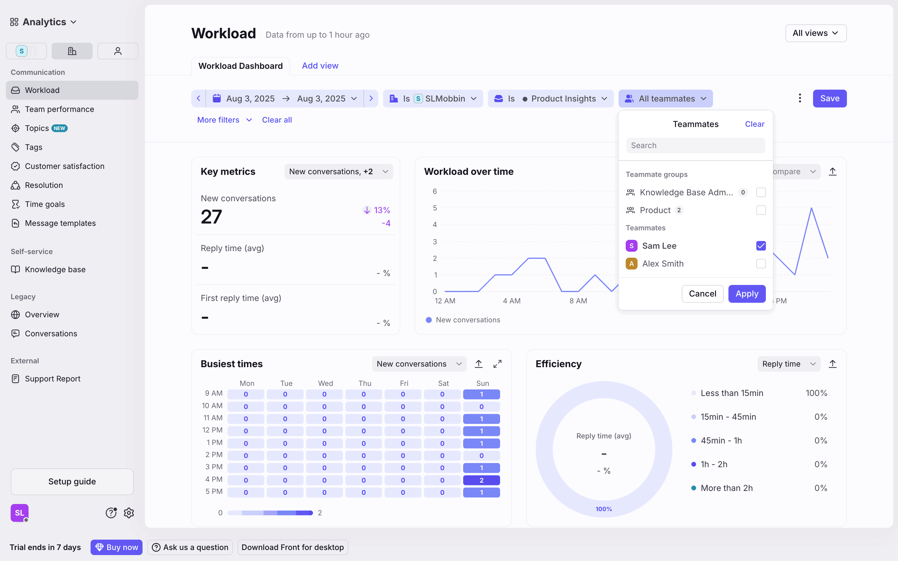The user filters workload data by date, inbox, and teammate. The dashboard updates to reflect the selected filters.