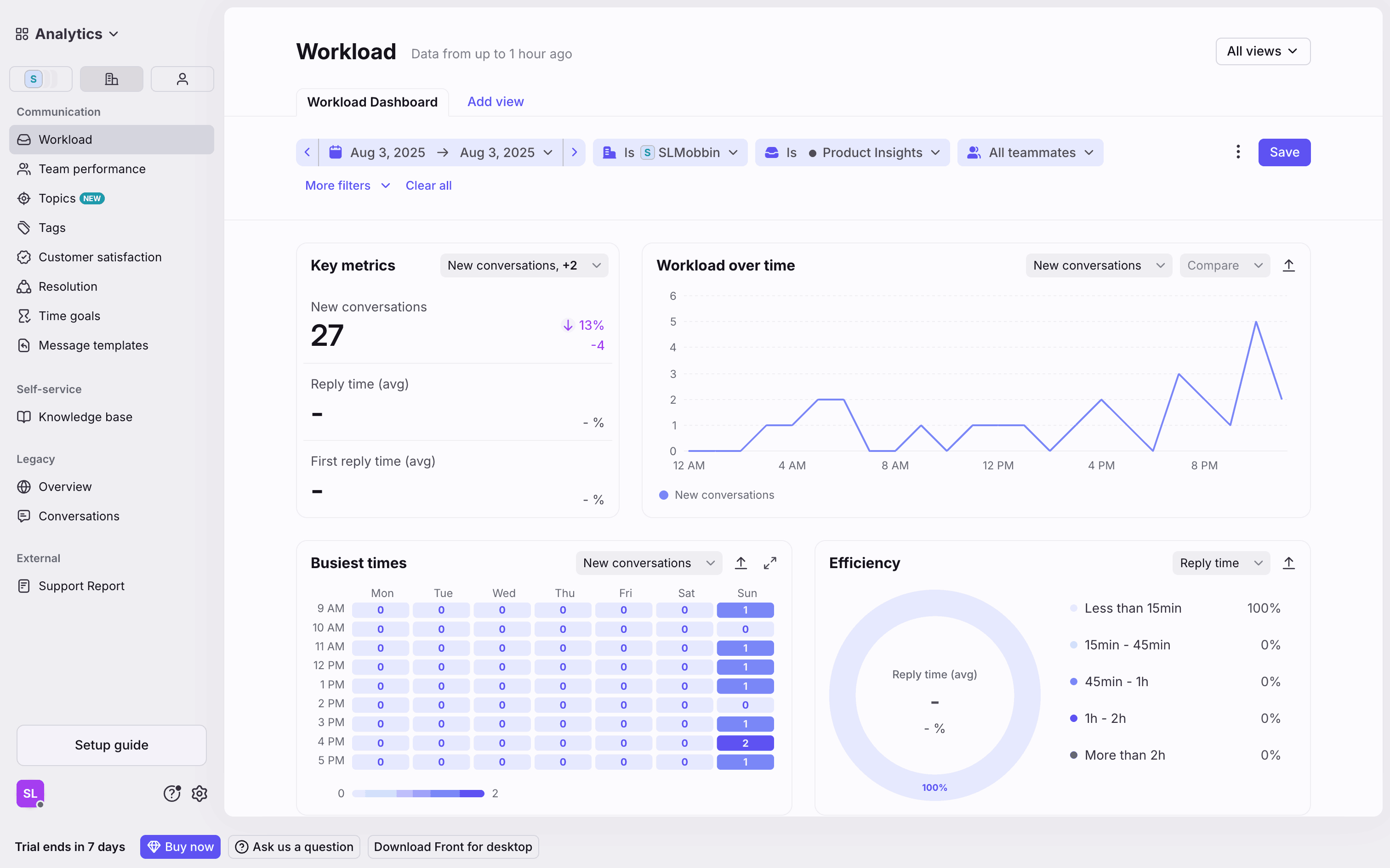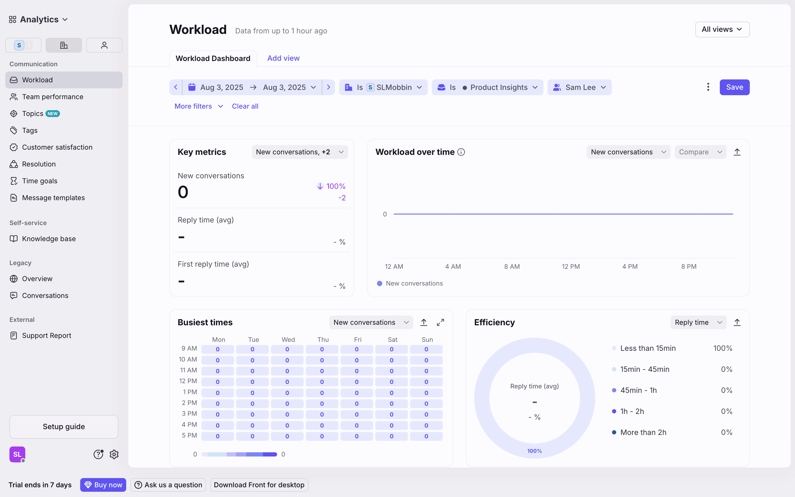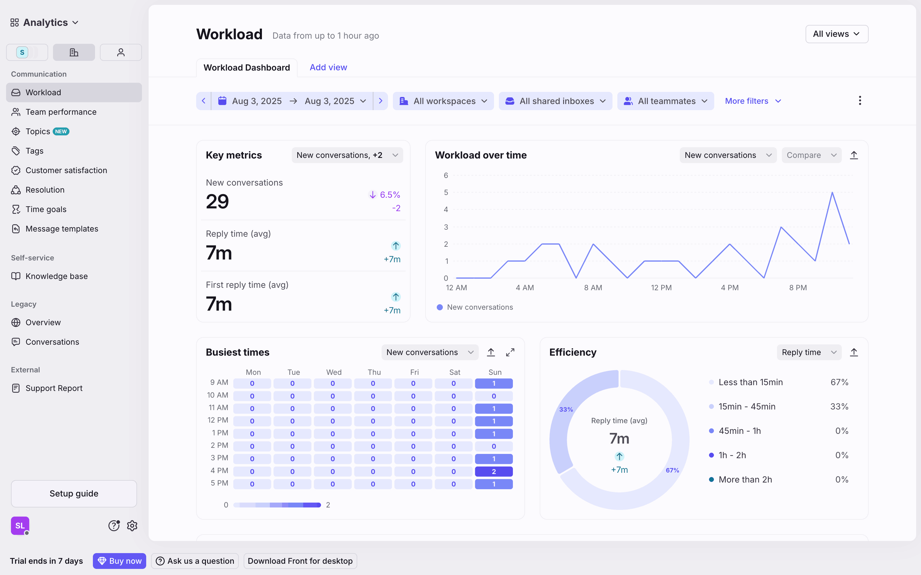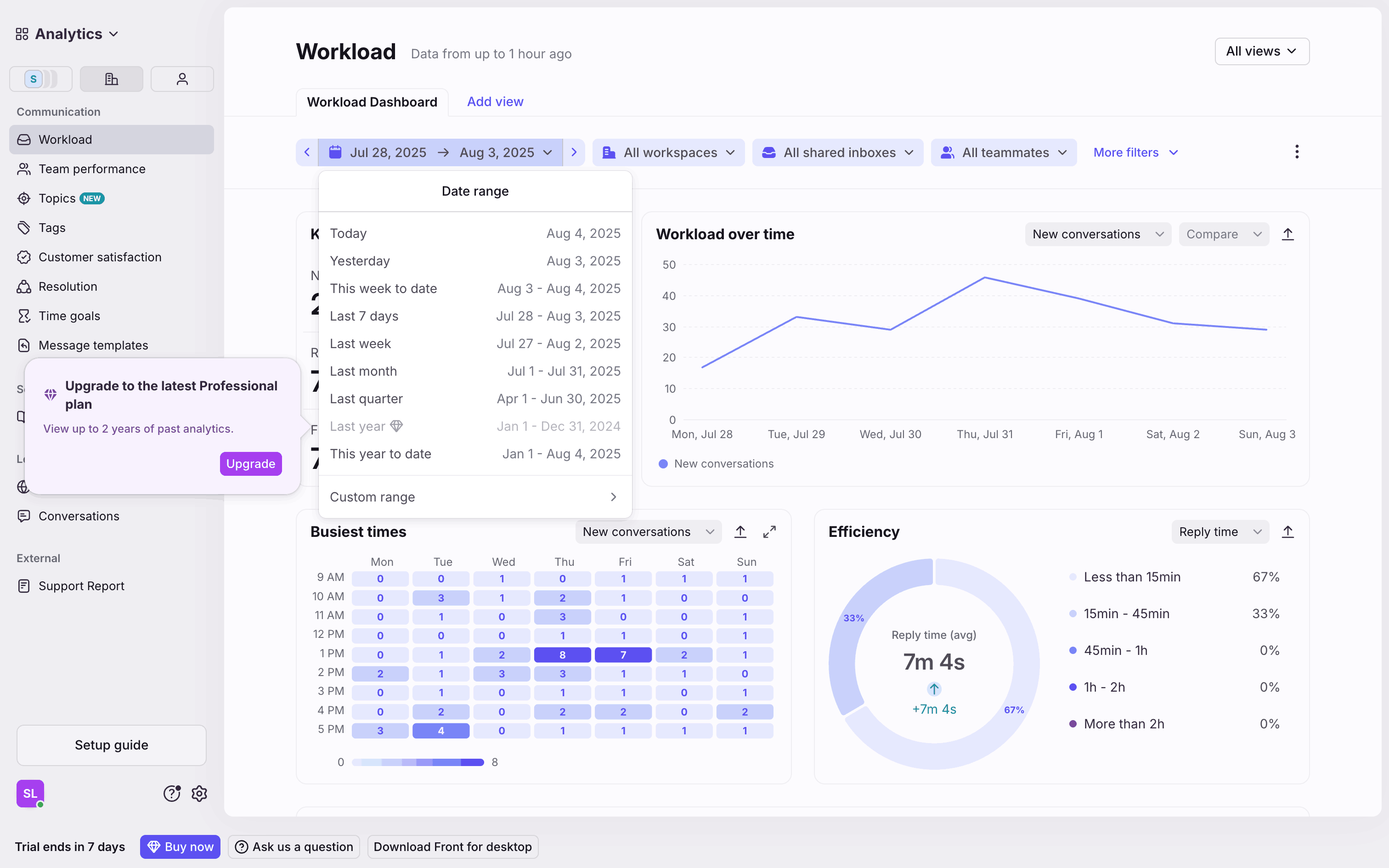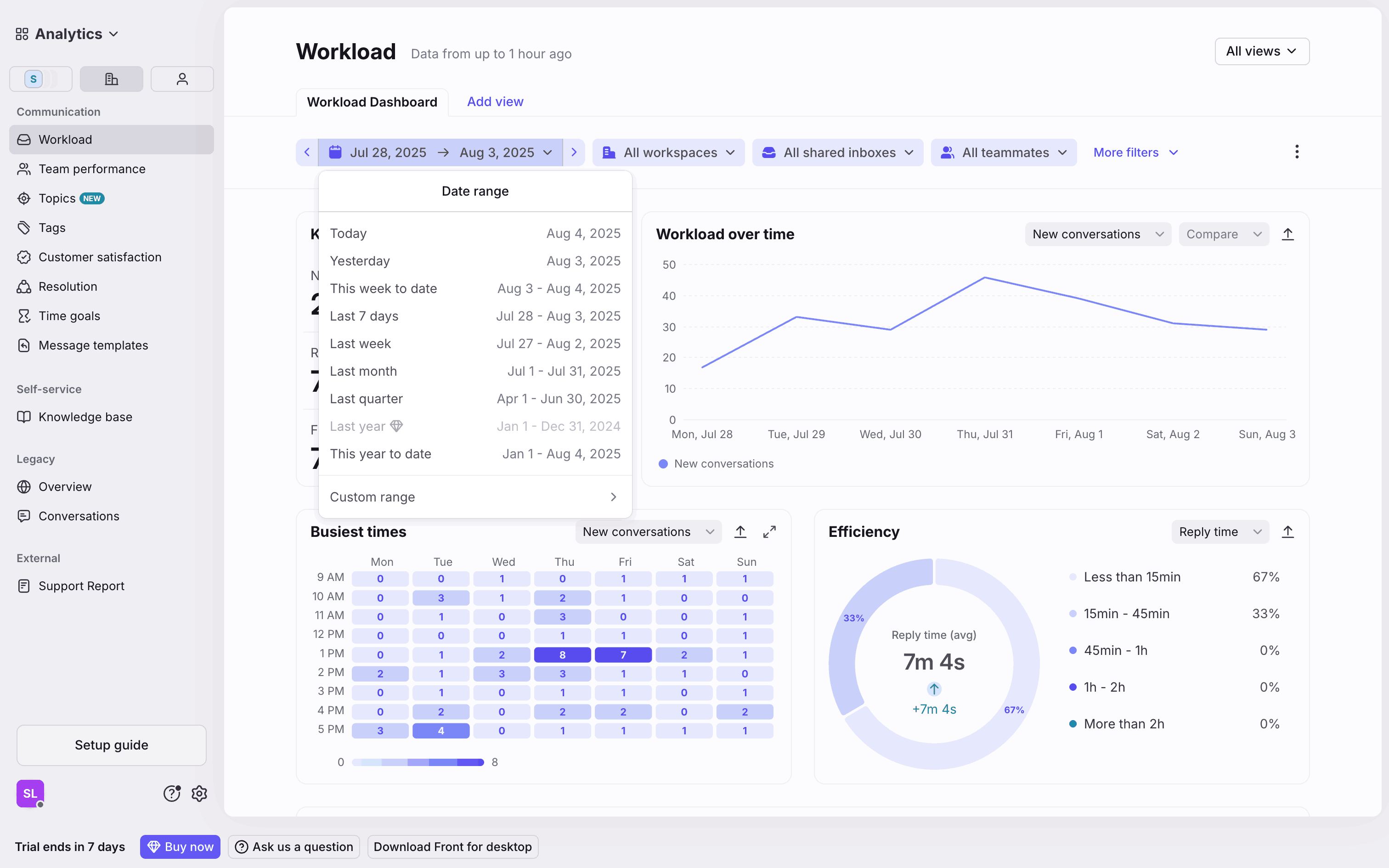 The user filters workload data by date, inbox, and teammate. The dashboard updates to reflect the selected filters.