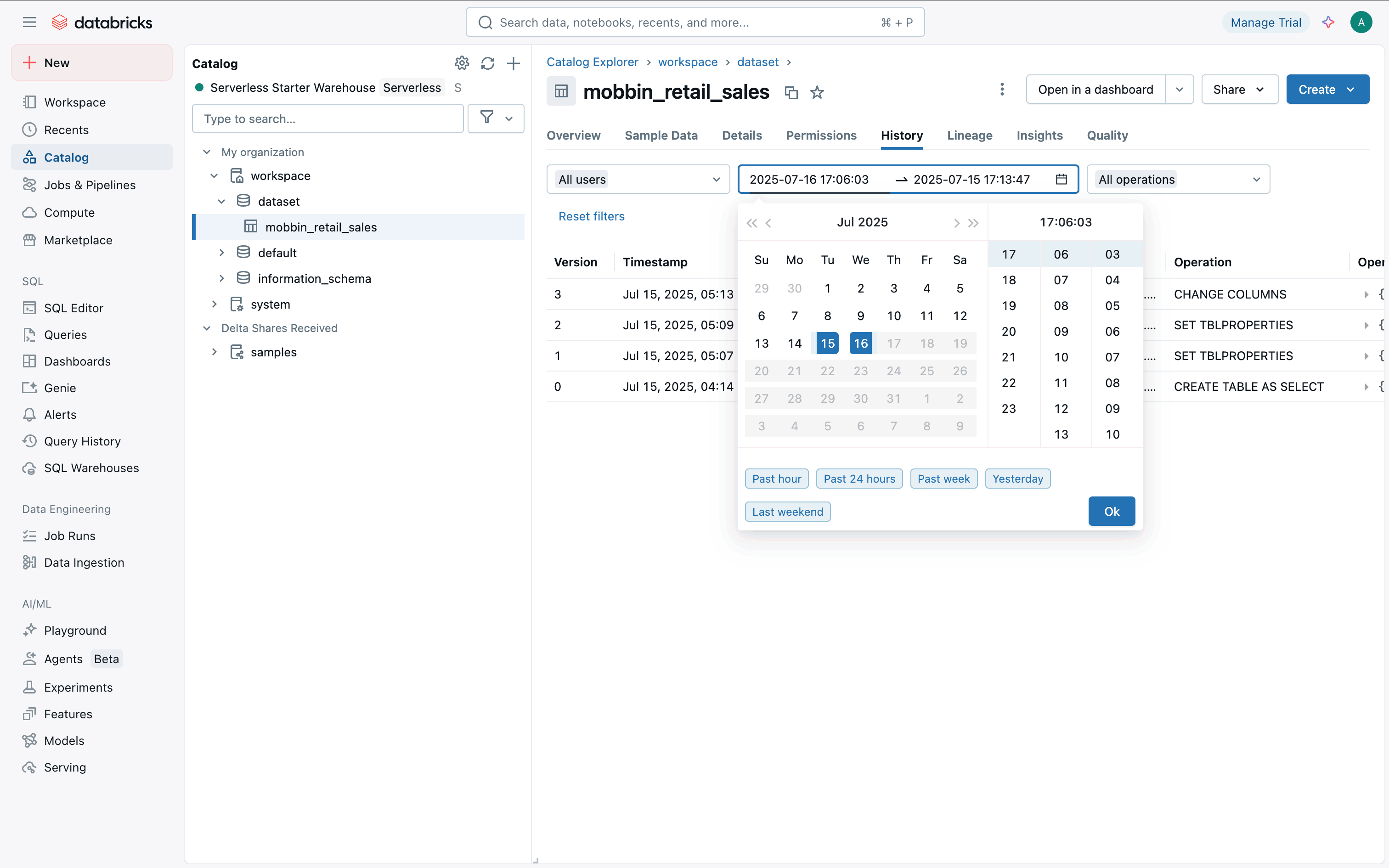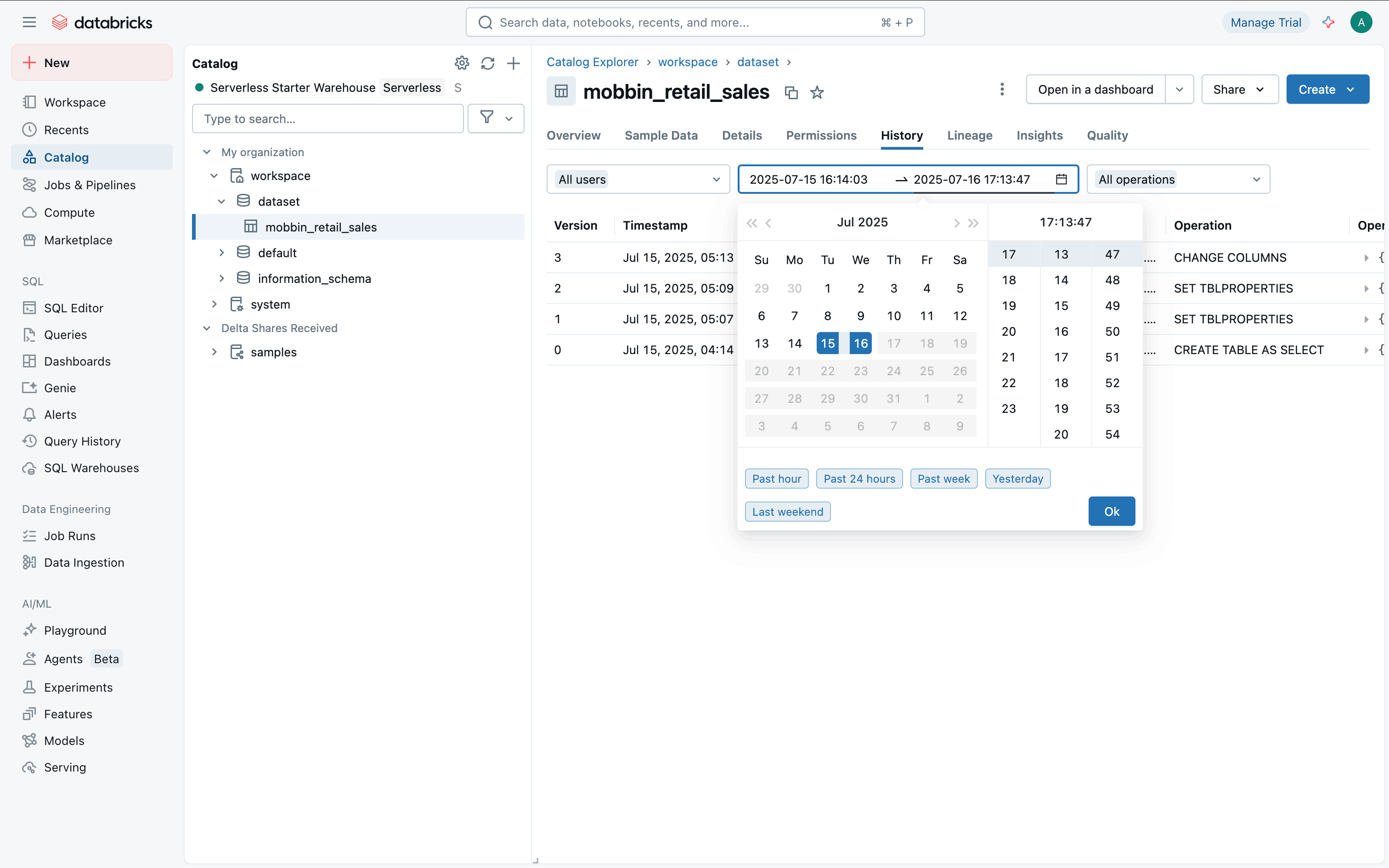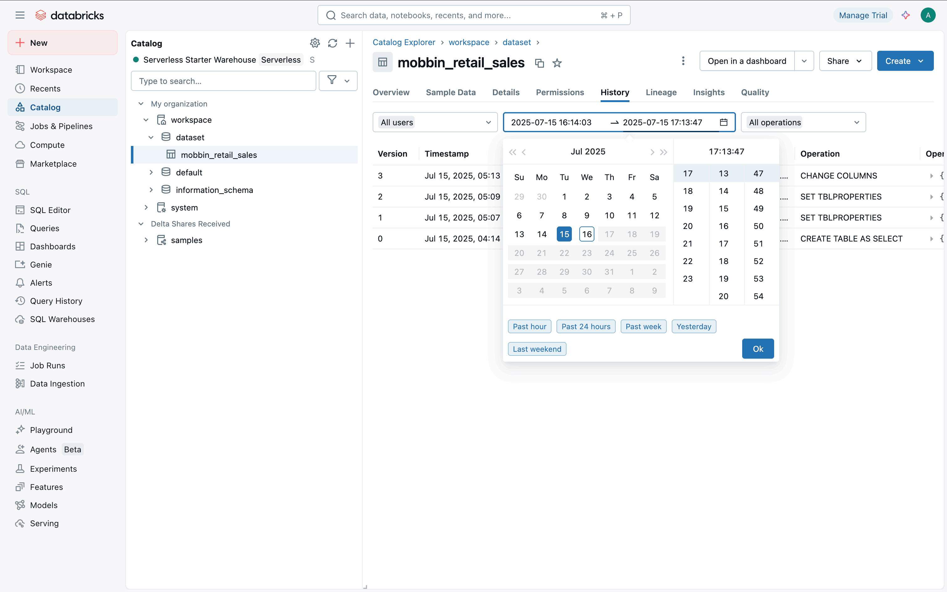 The user filters the history of a dataset by selecting a date range and a specific operation. This allows them to view a subset of the history.