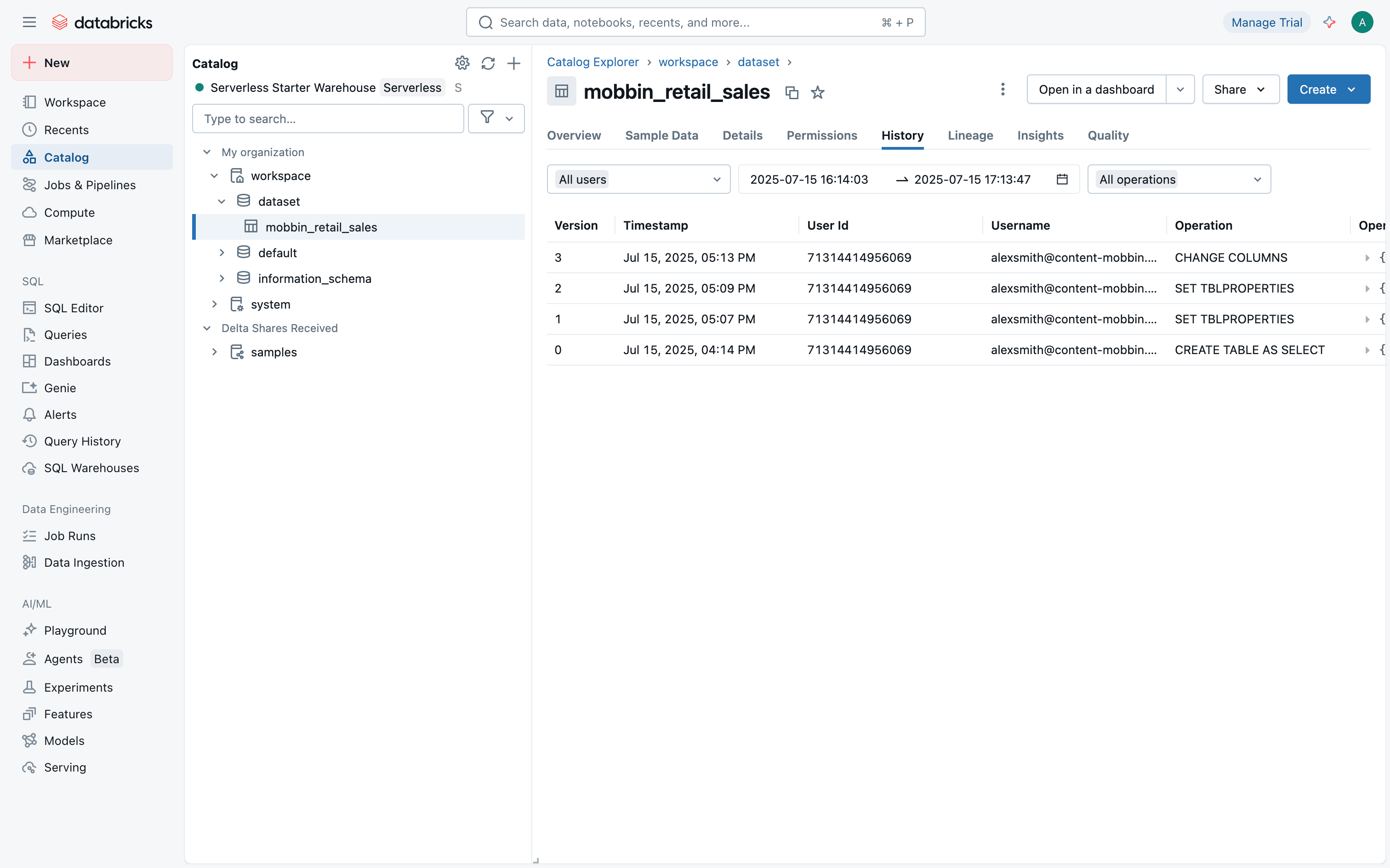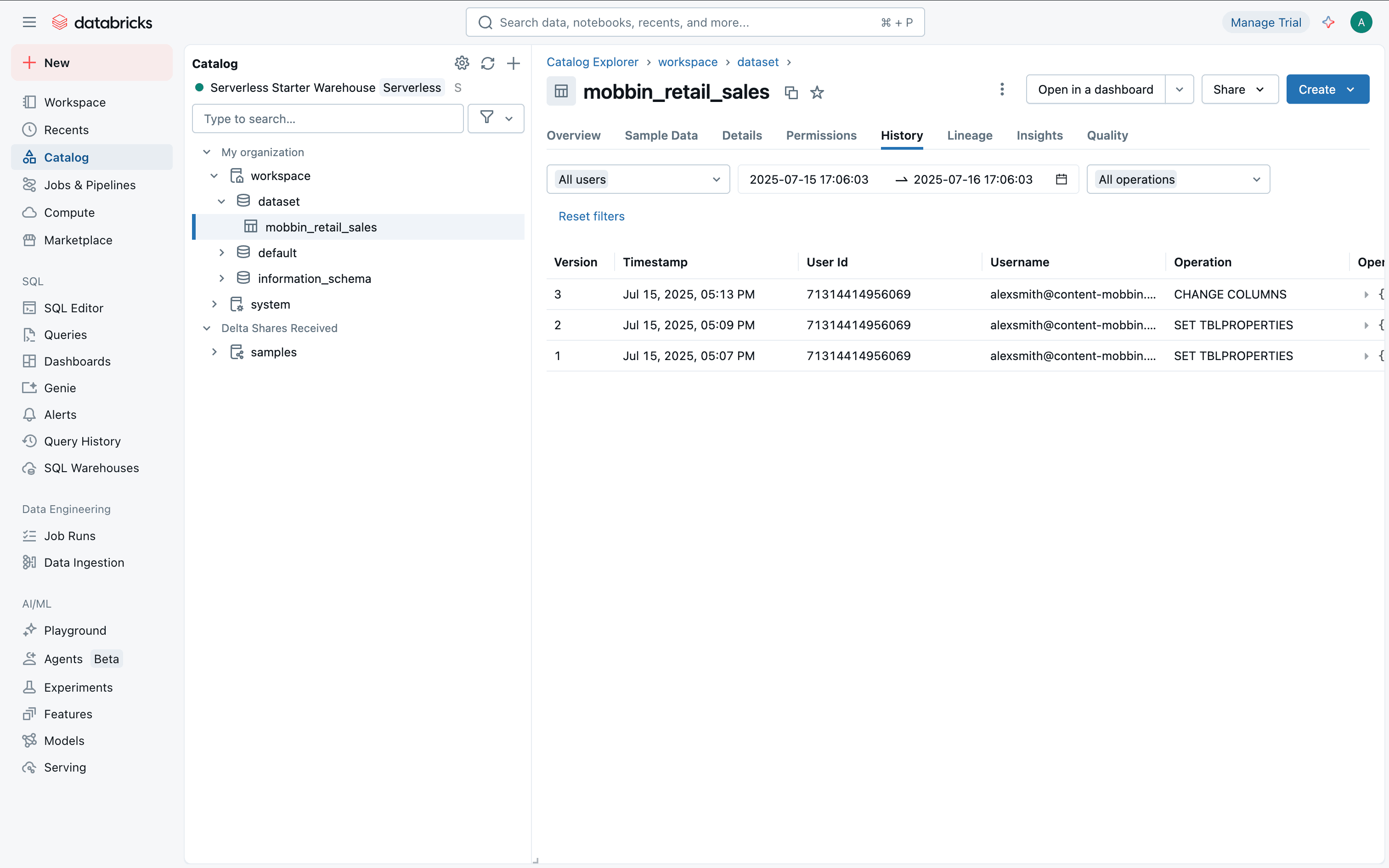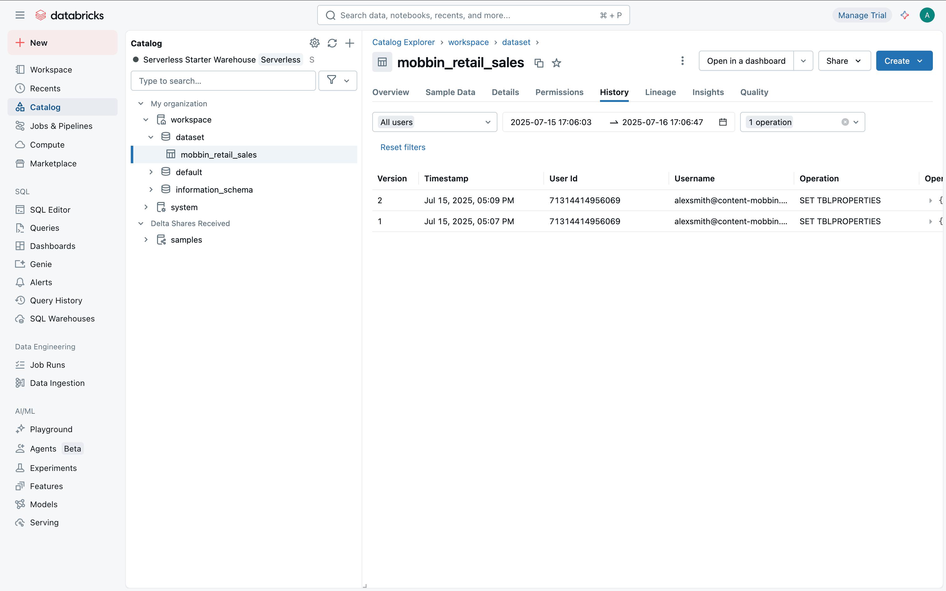 The user filters the history of a dataset by selecting a date range and a specific operation. This allows them to view a subset of the history.