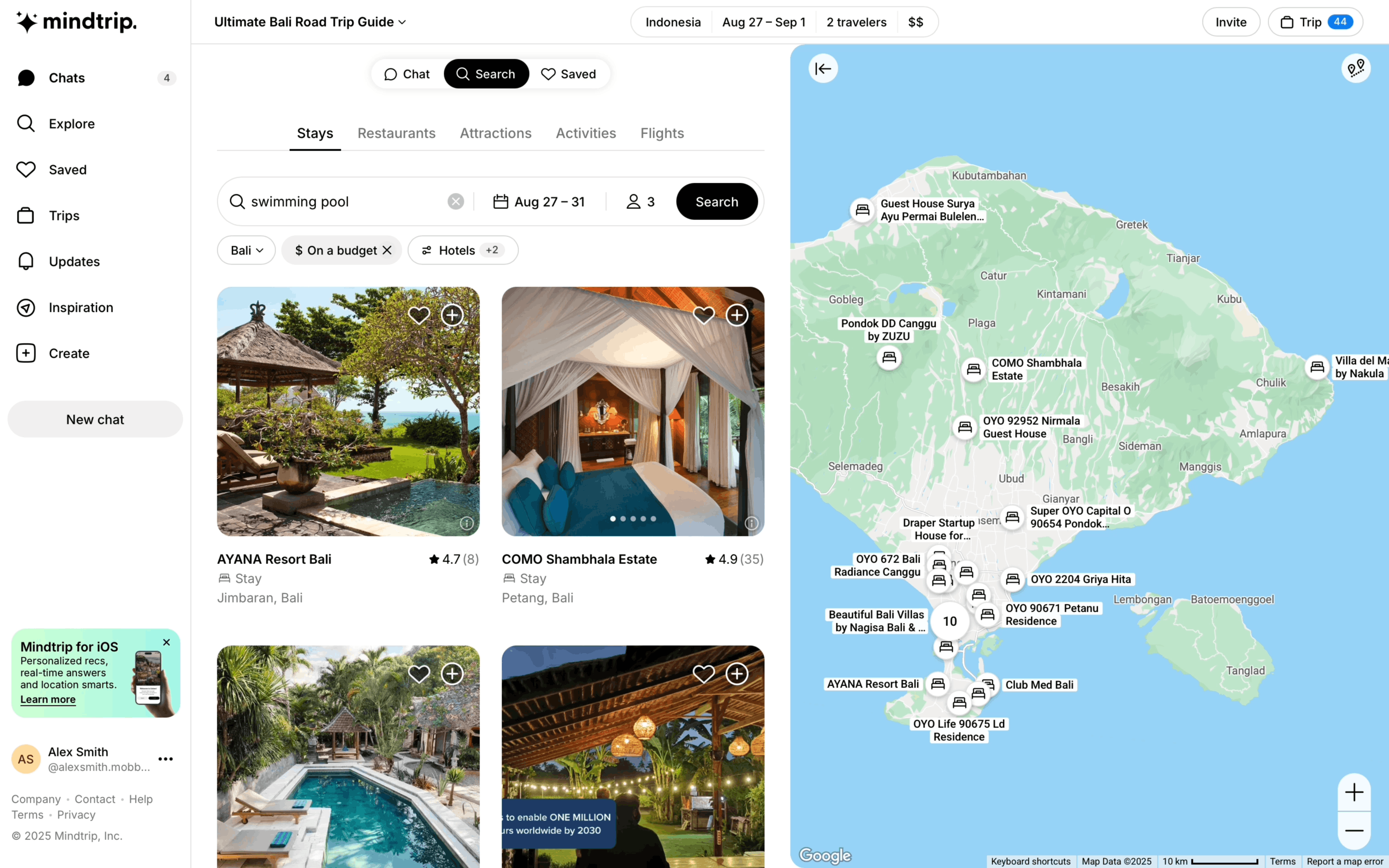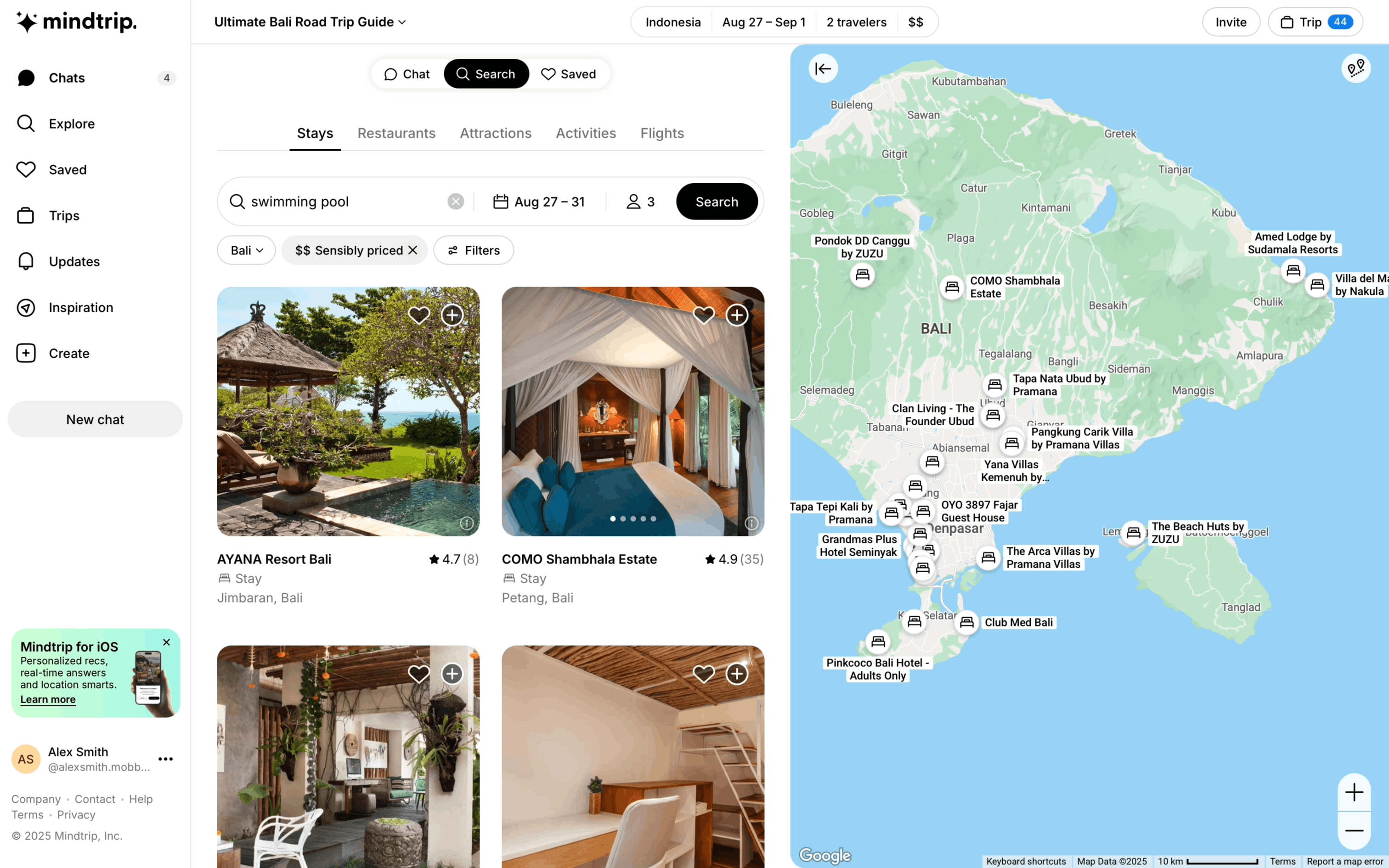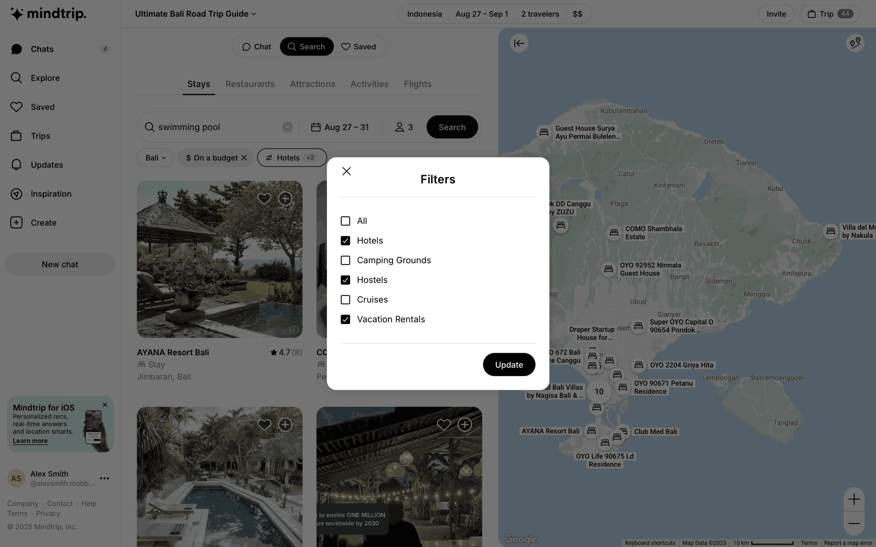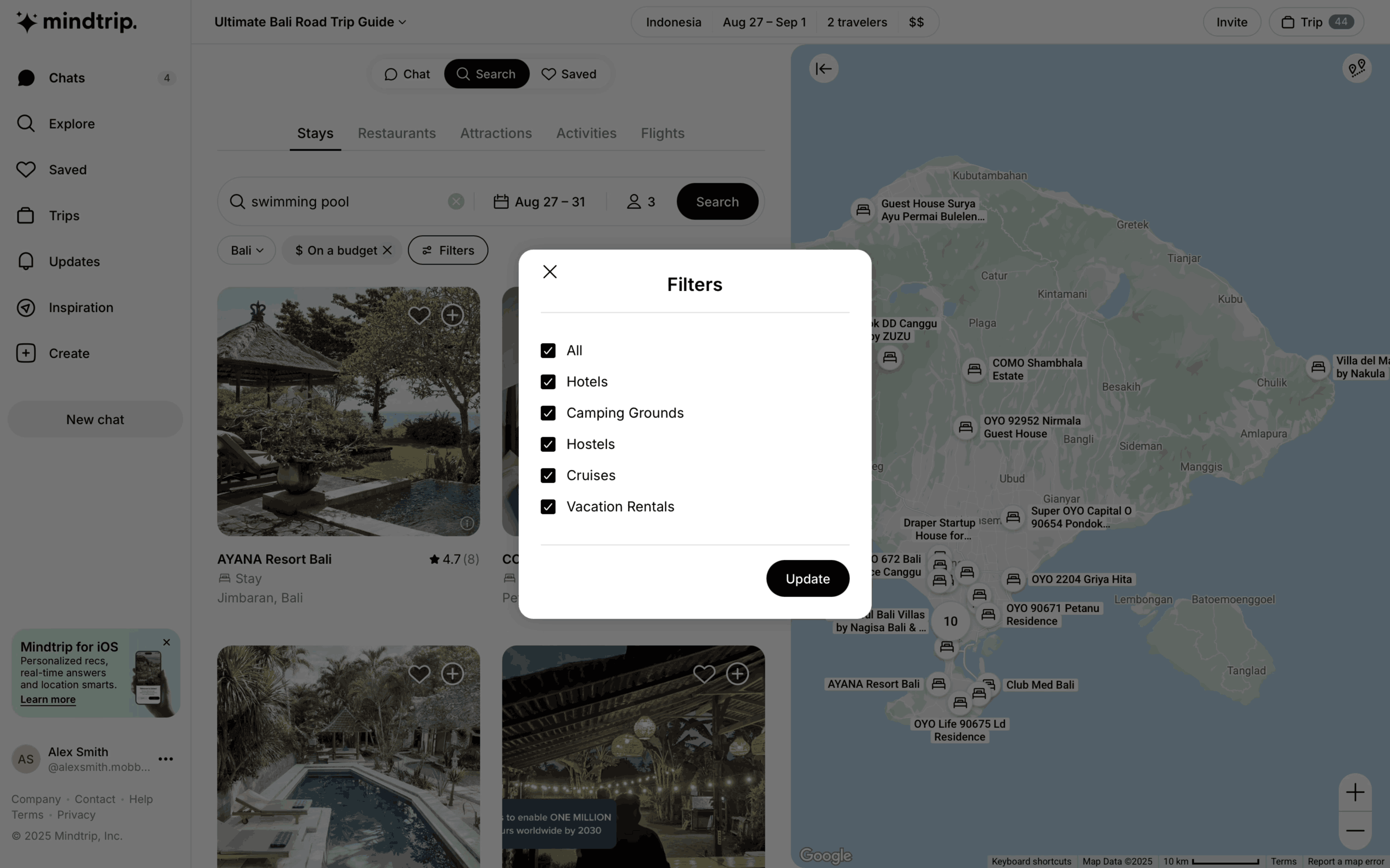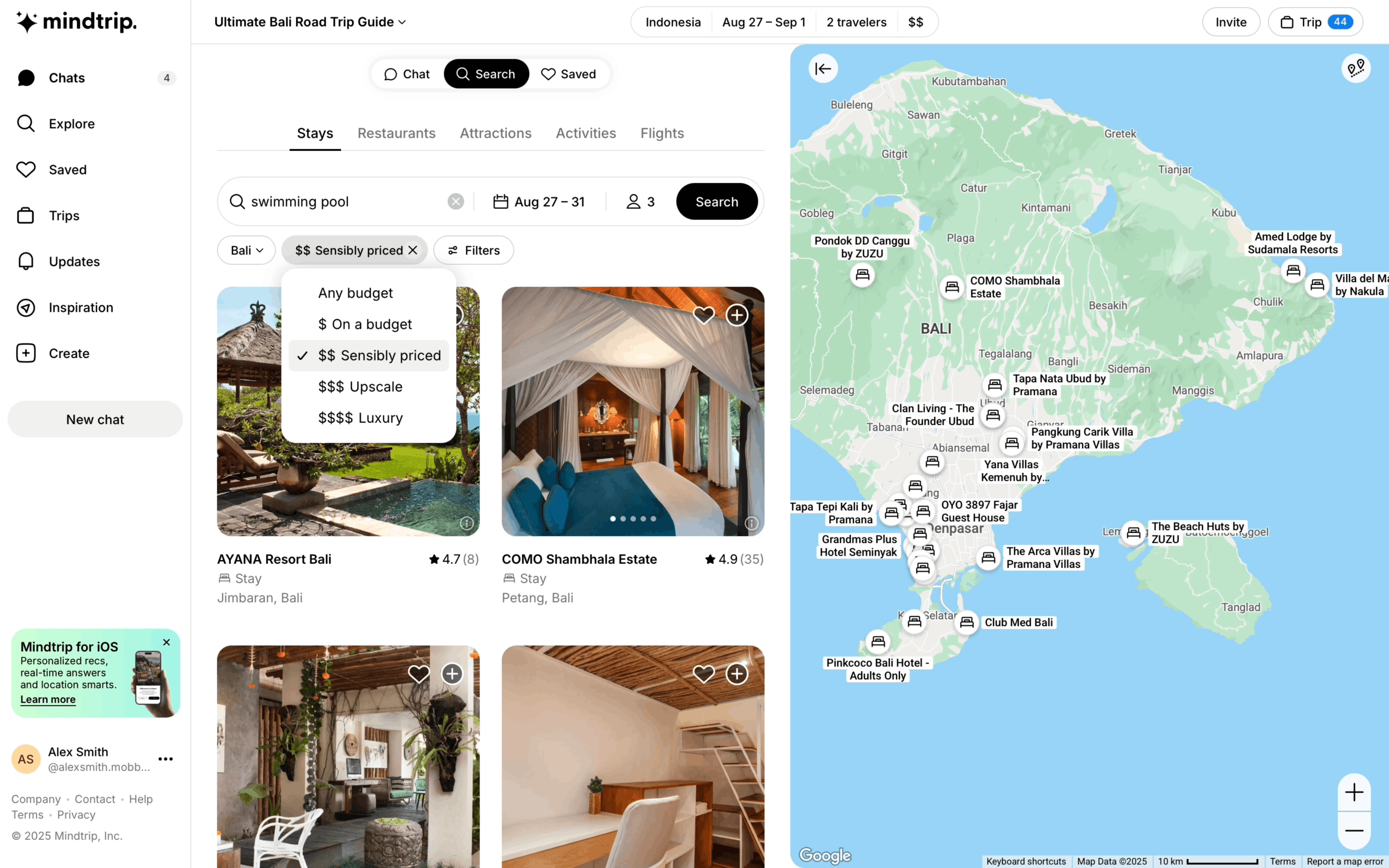 The user searches for stays, filters by location, budget, and stay type. The final result is a list of hotels in Bali that are on a budget.