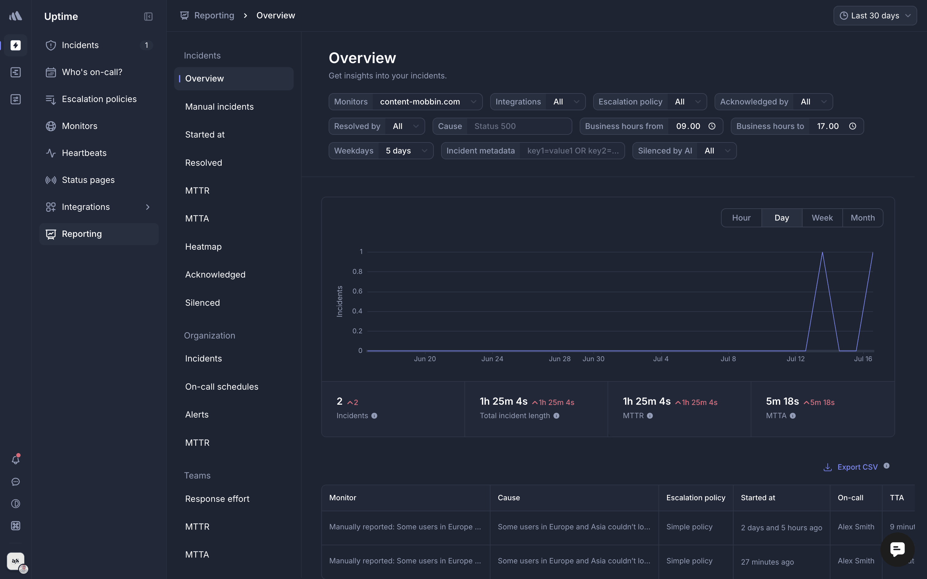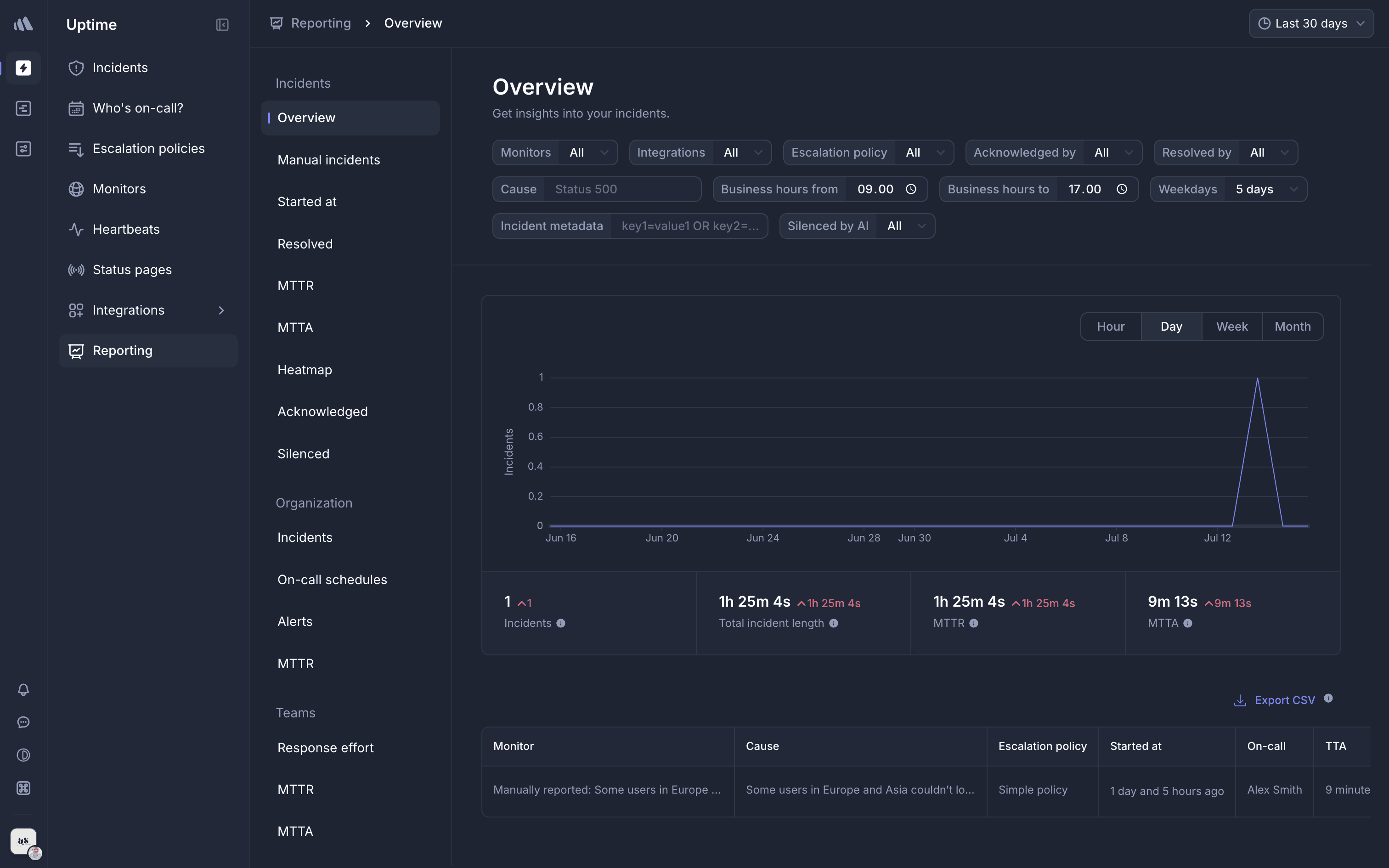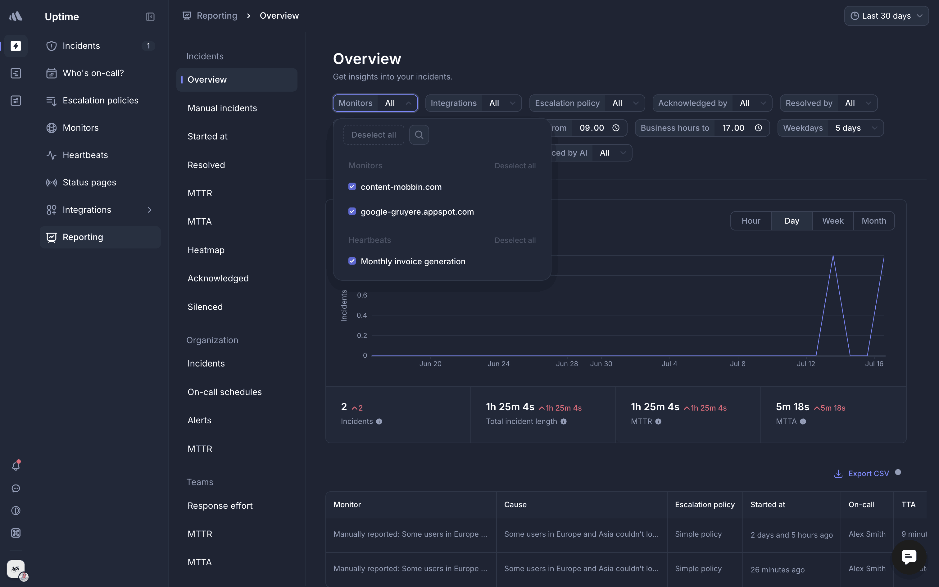 The user filters the incident overview by searching and selecting a specific monitor. The overview is then updated to reflect the selected monitor.