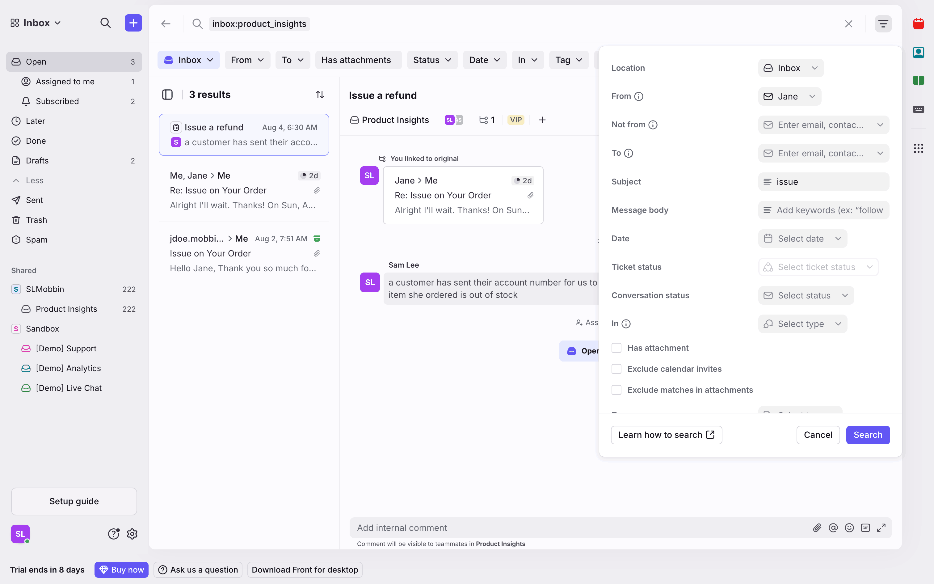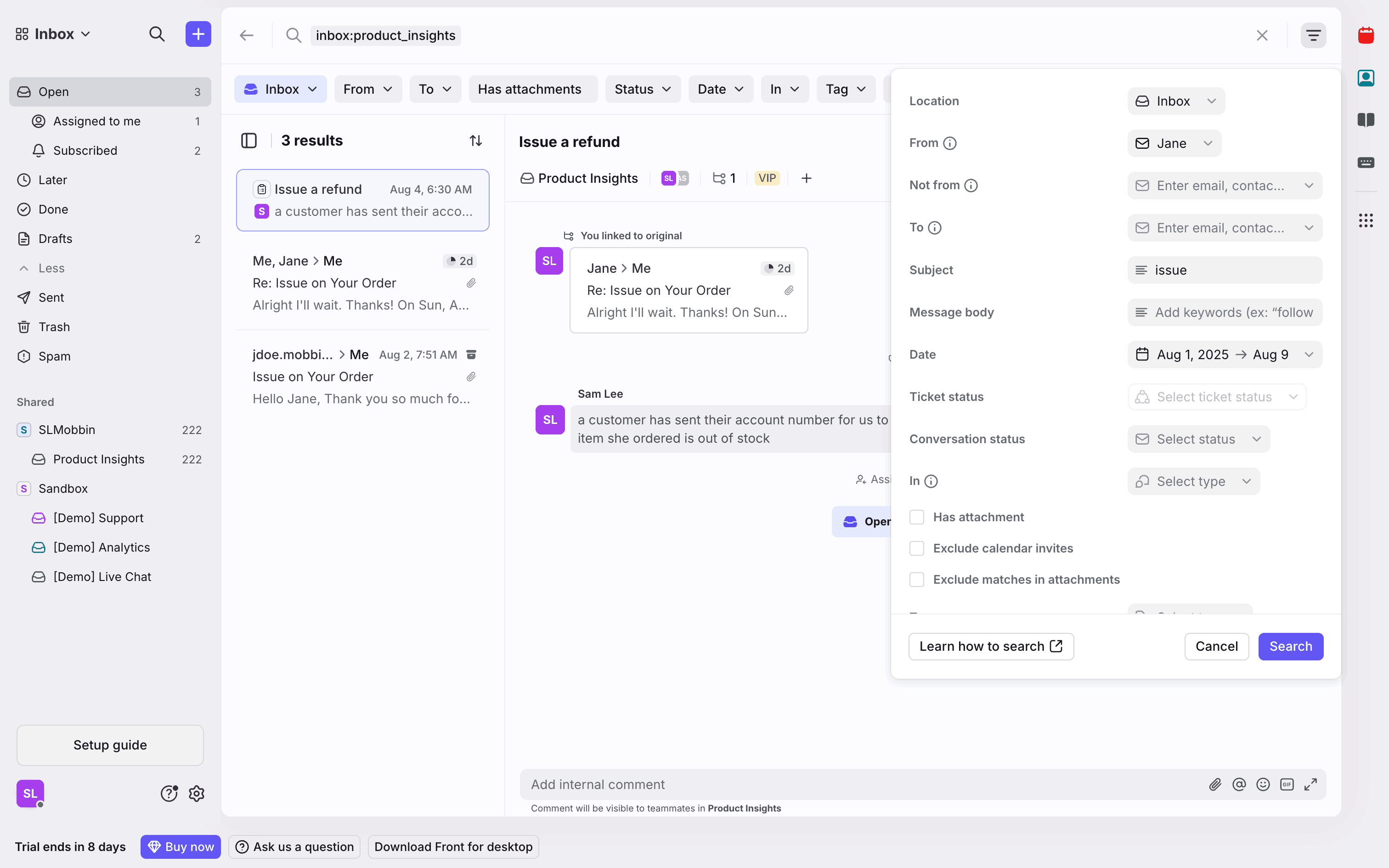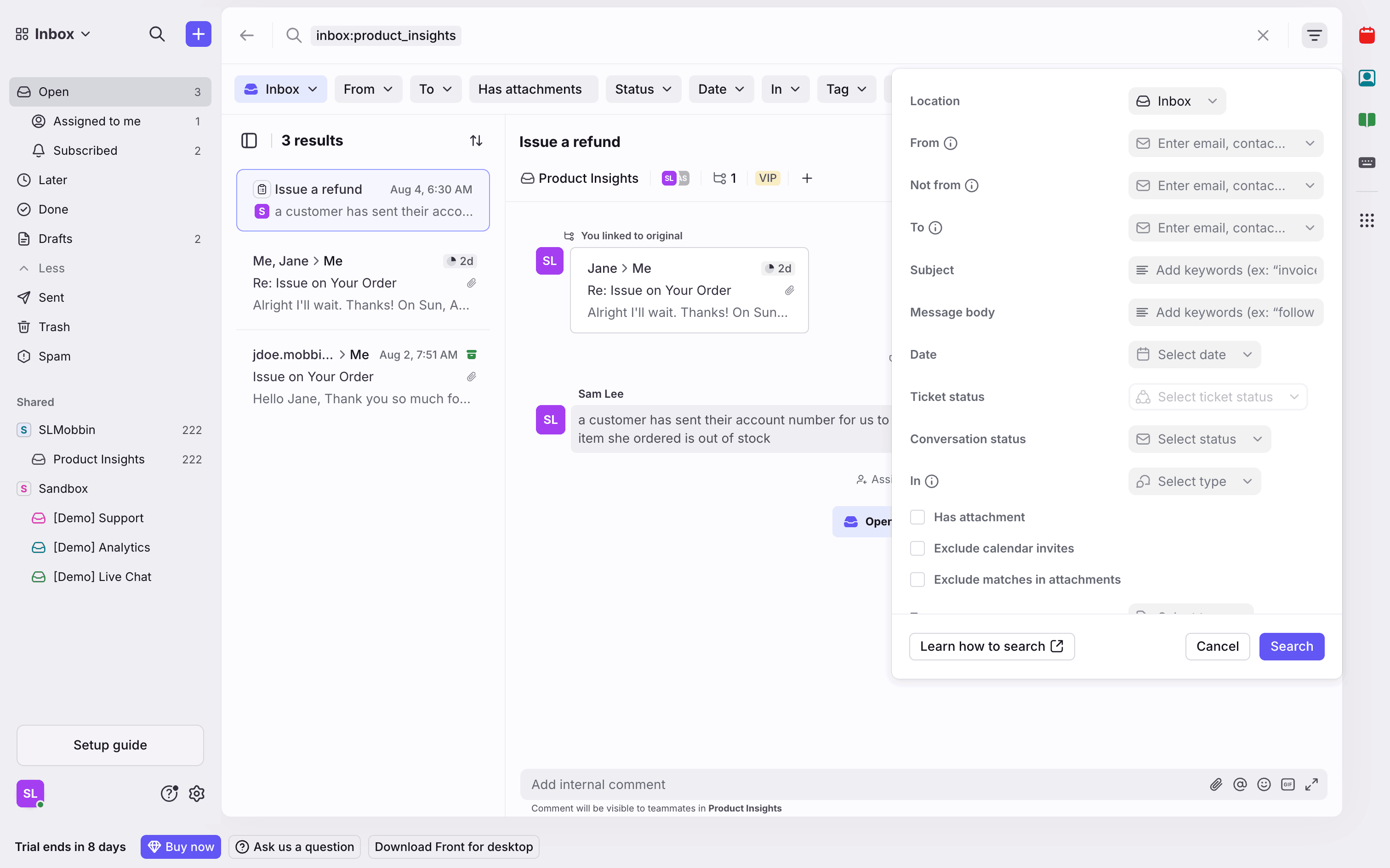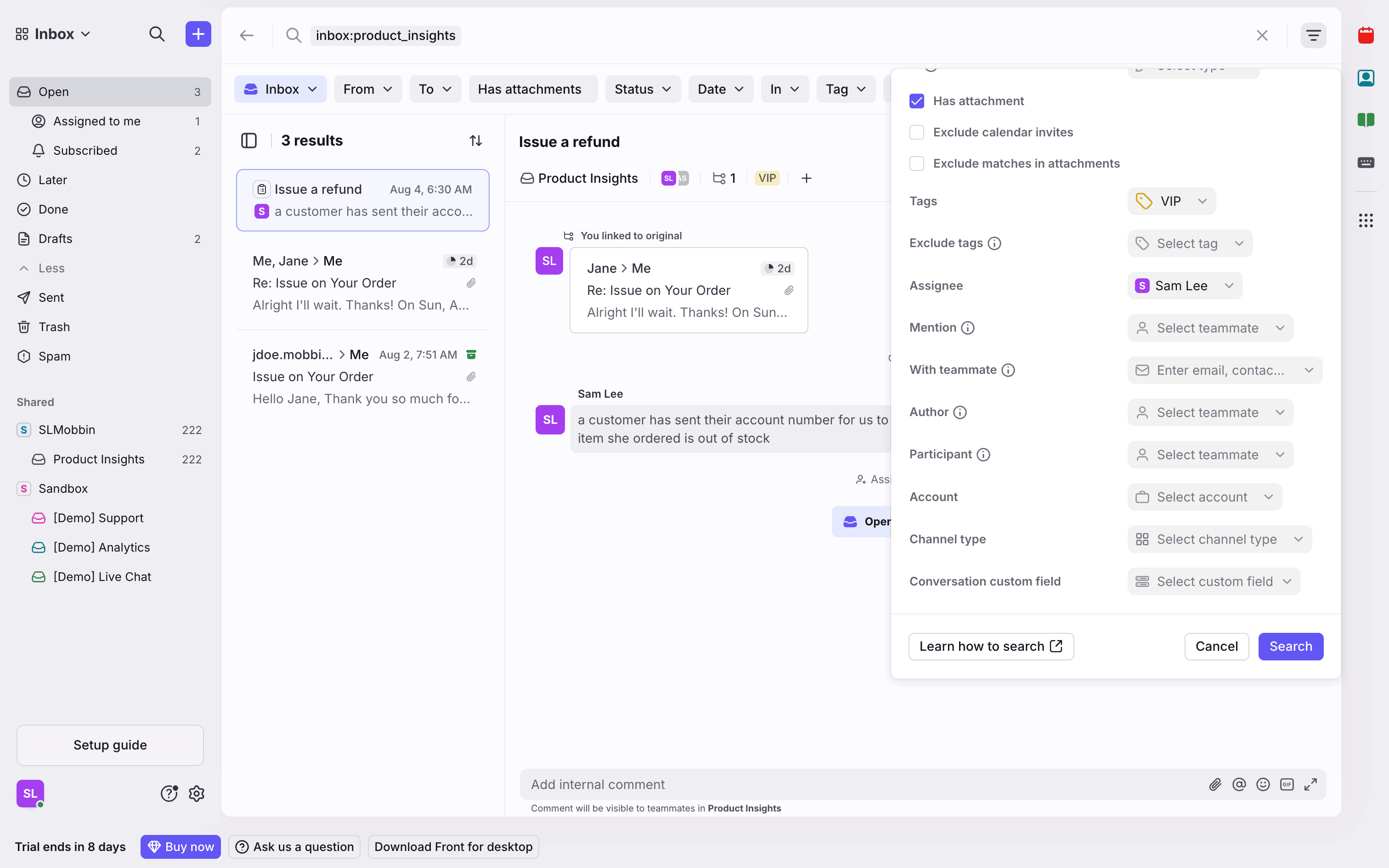 The user filters their inbox by sender, subject, date, status, attachments and tags. The search returns no results after applying all filters.