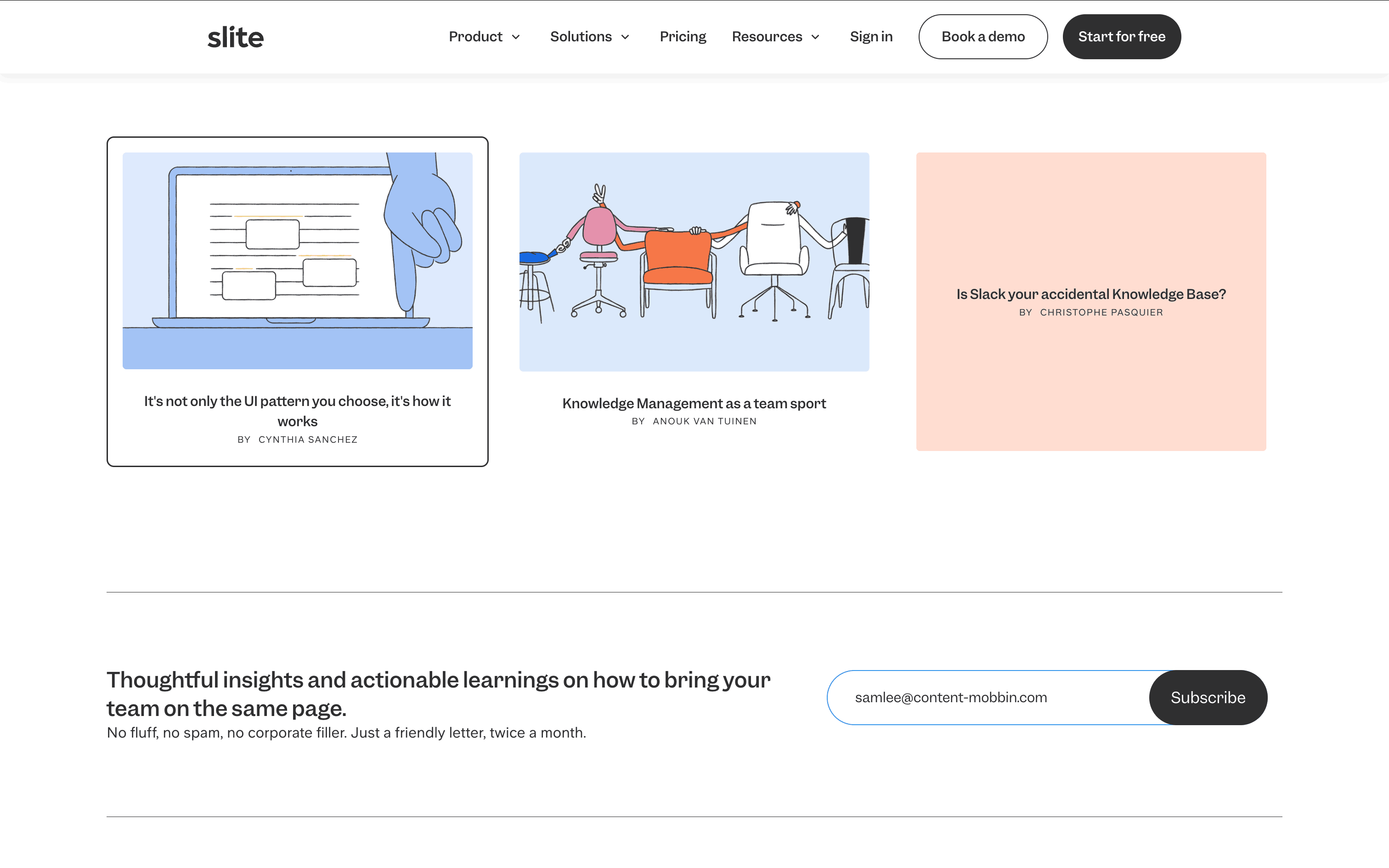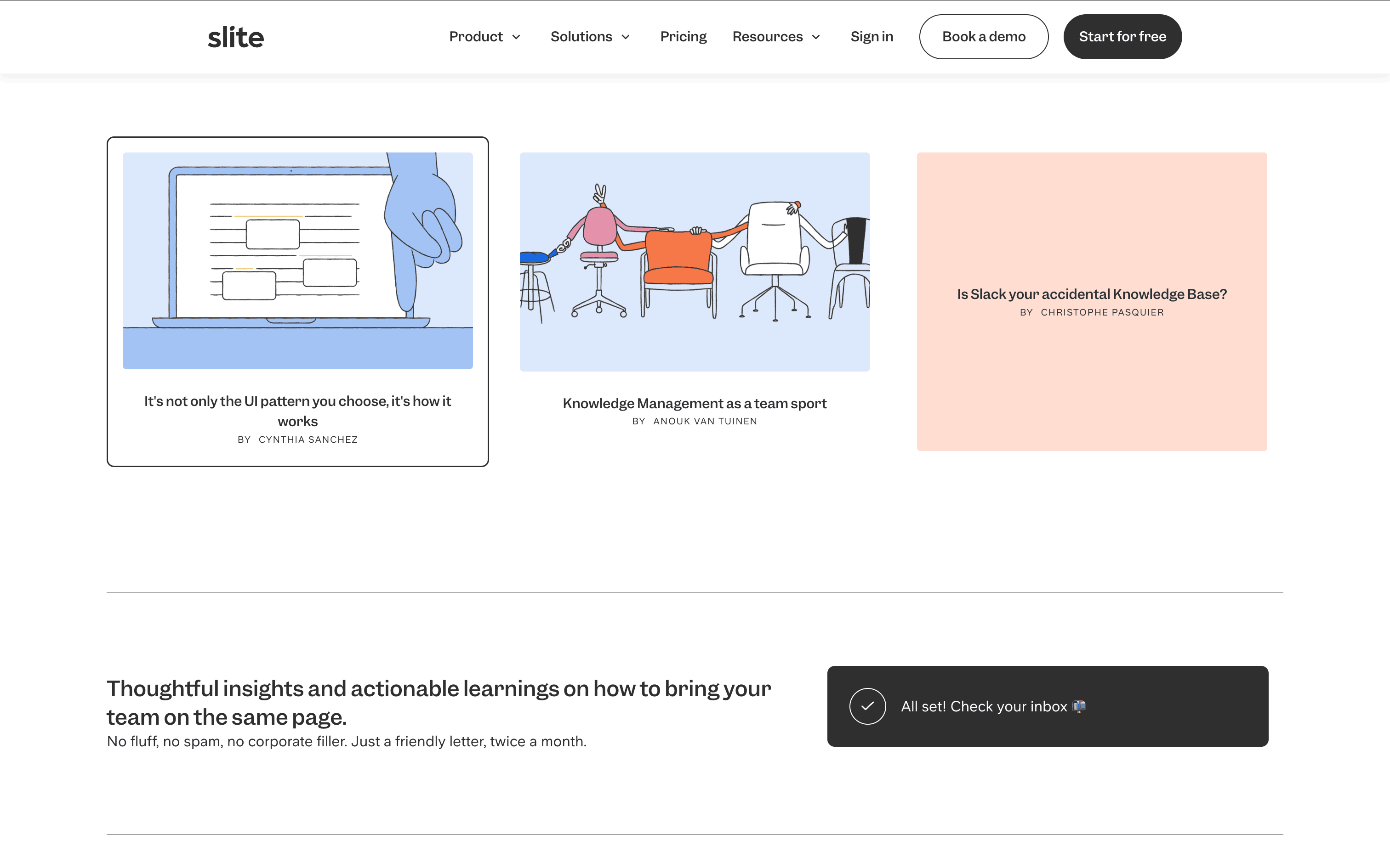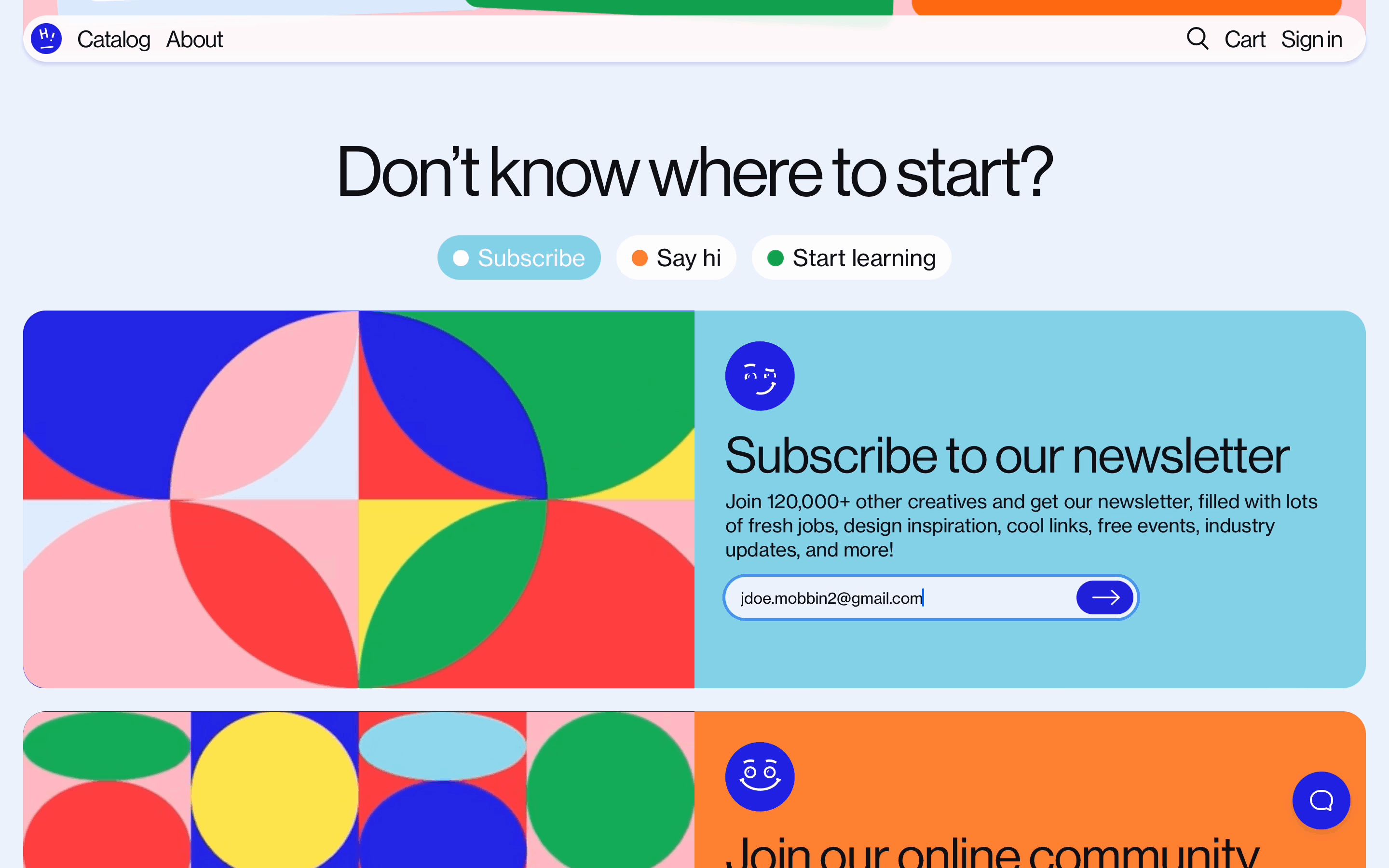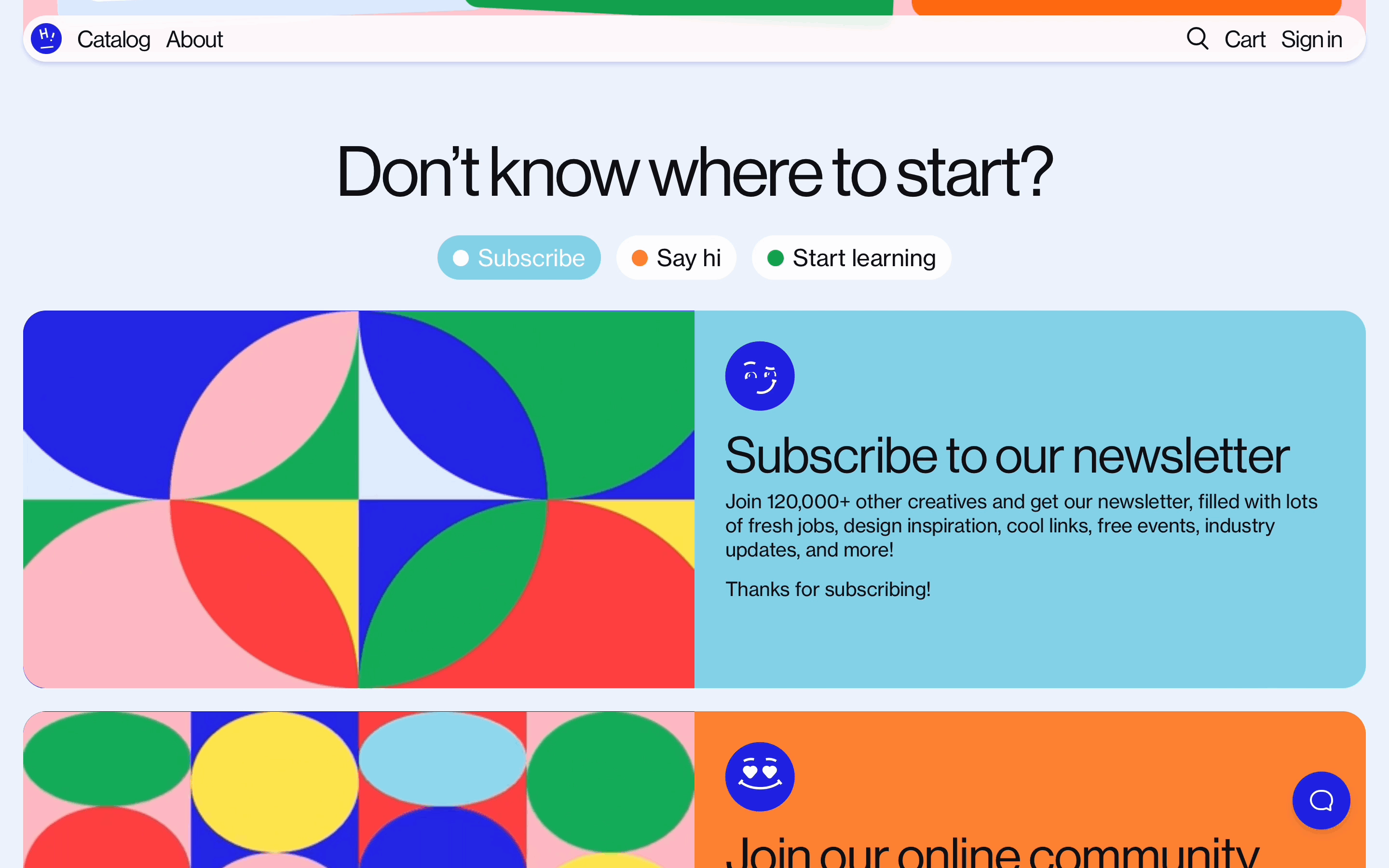 The user flow demonstrates subscribing to a newsletter. The user enters their email and receives a confirmation message.