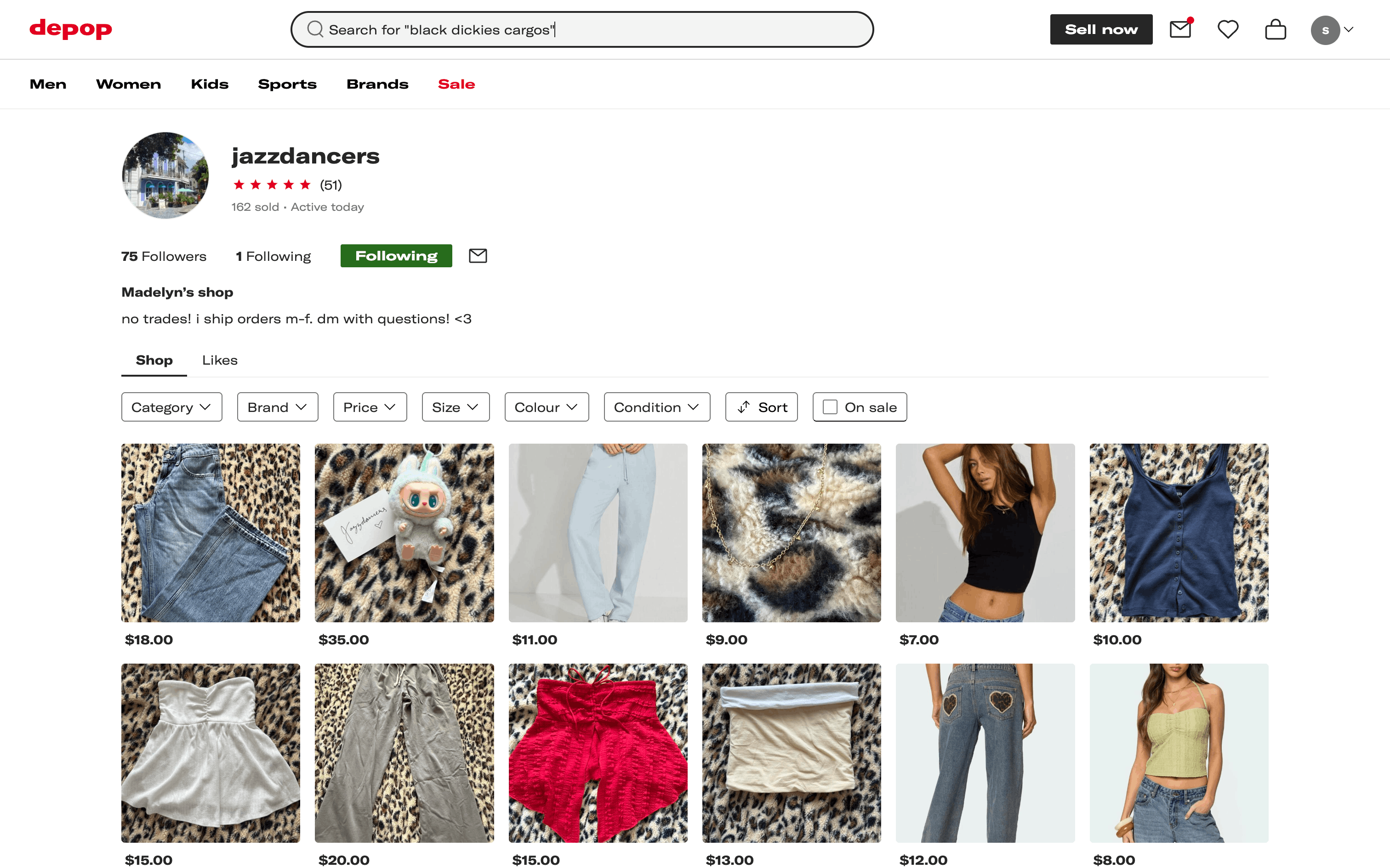 The user views a seller's profile and then follows the seller. The "Follow" button changes to "Following" to confirm the action.