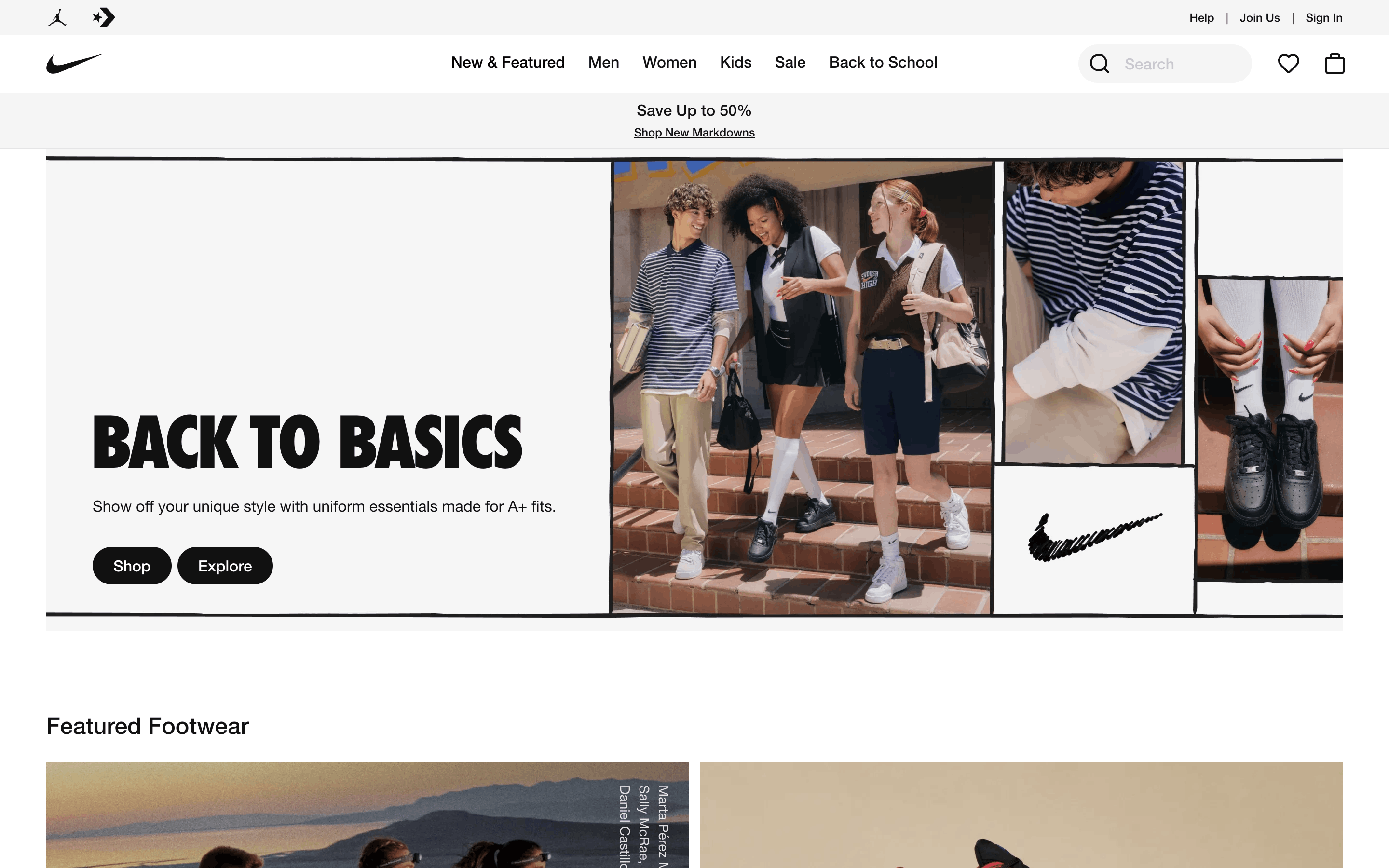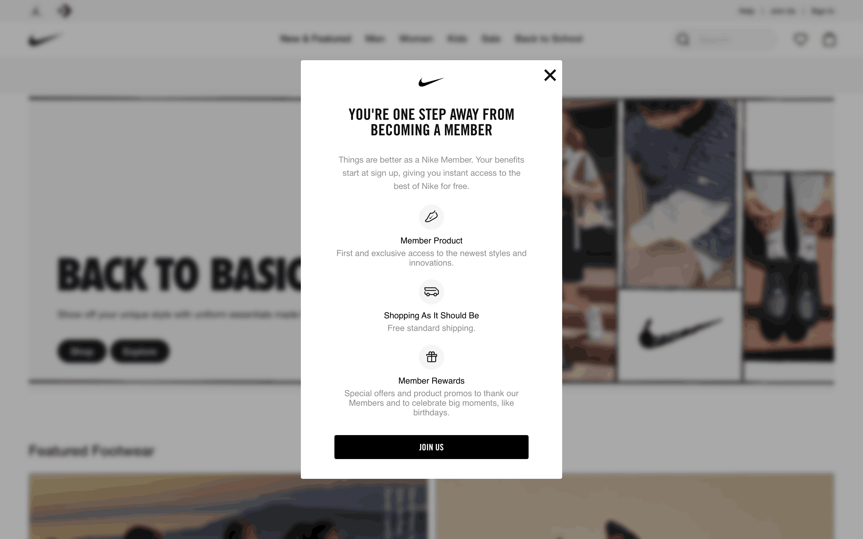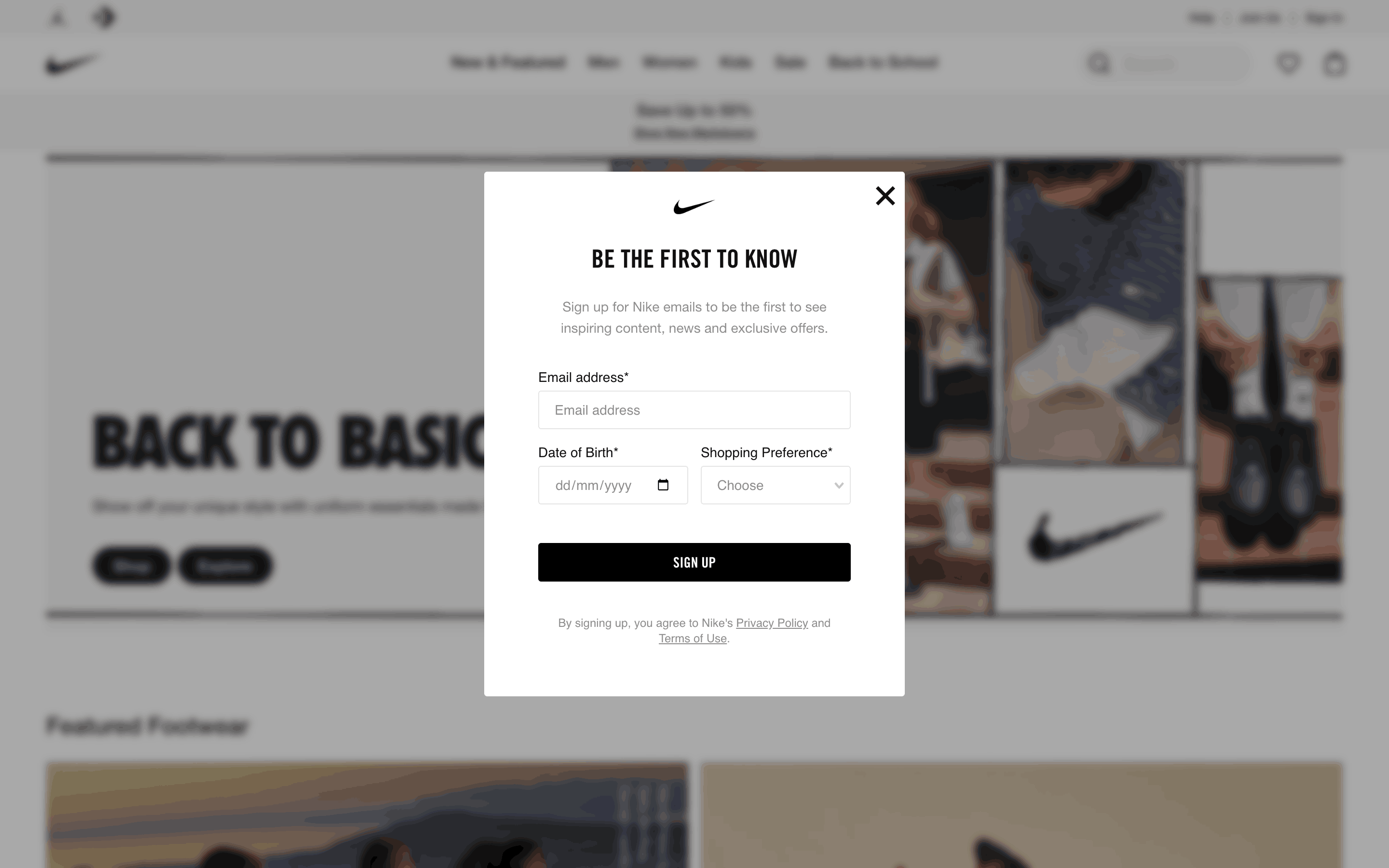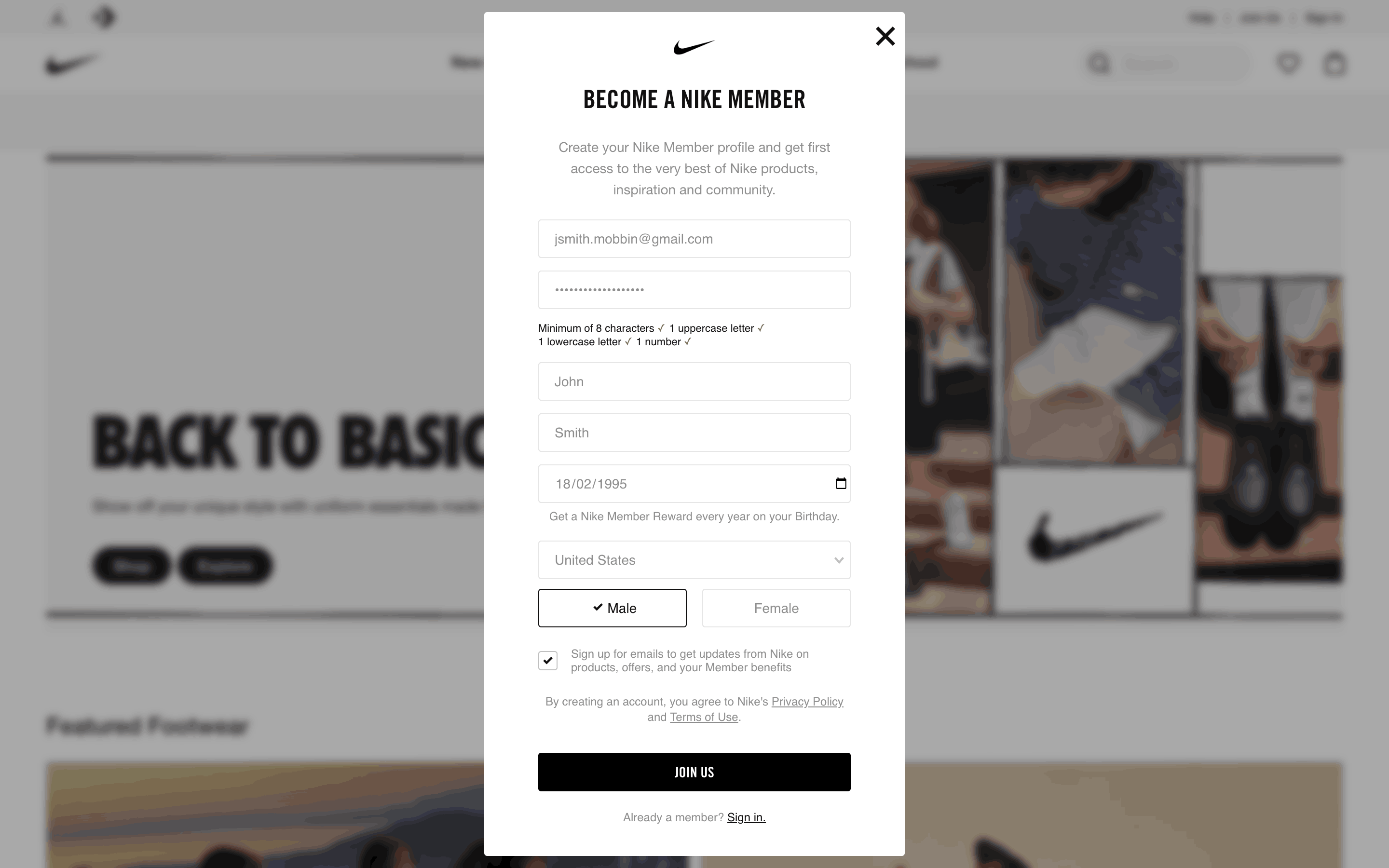 The user flow involves signing up for the newsletter and then being prompted to create a Nike membership account. The user then fills out the membership form.