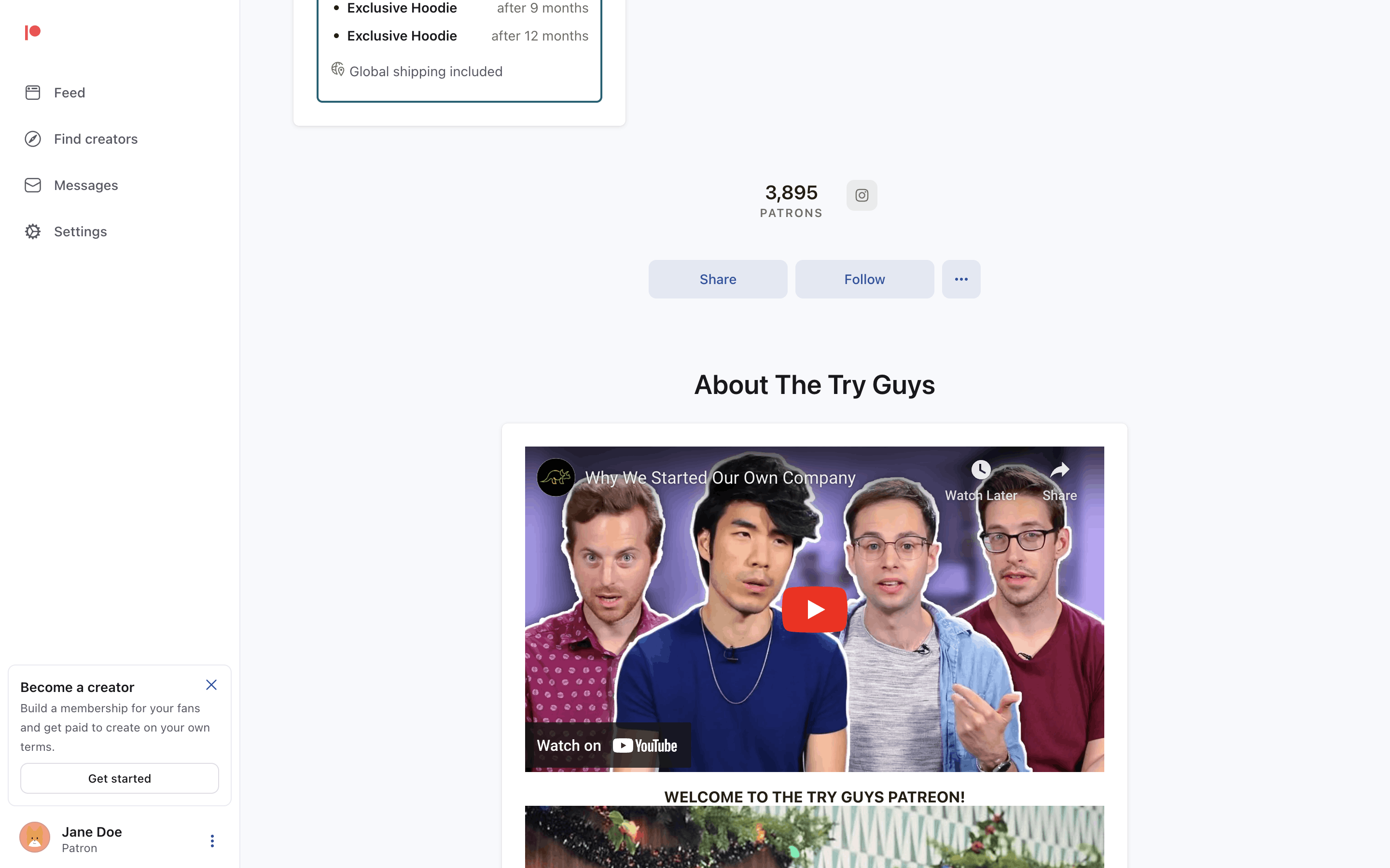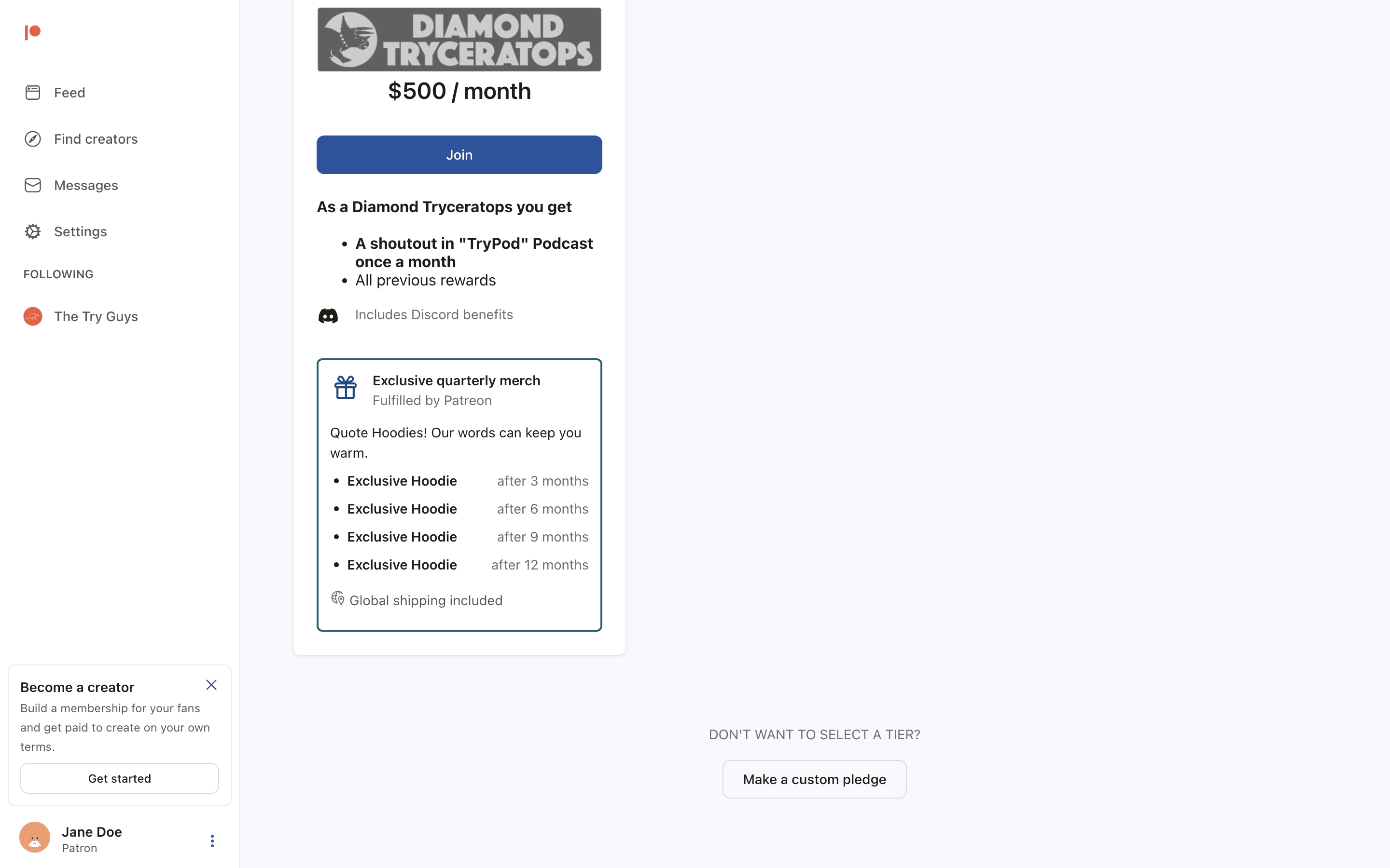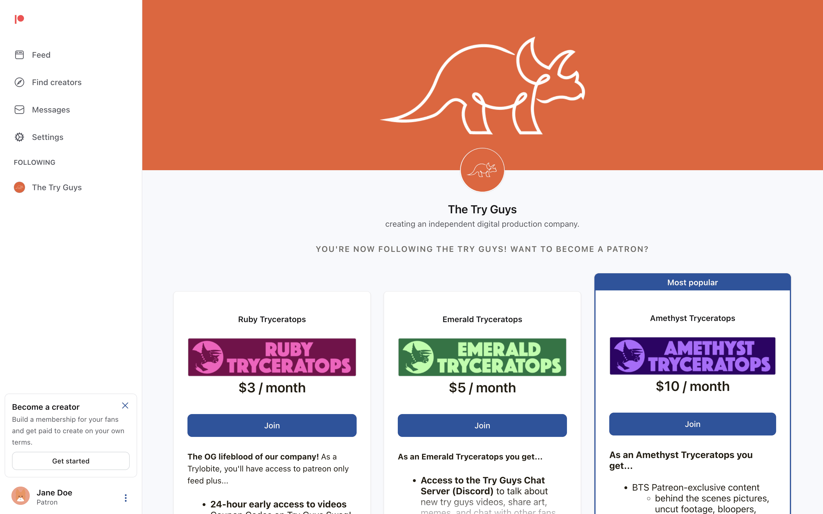 The user views a creator's page, follows them, and is then presented with membership options. The flow encourages users to become patrons.