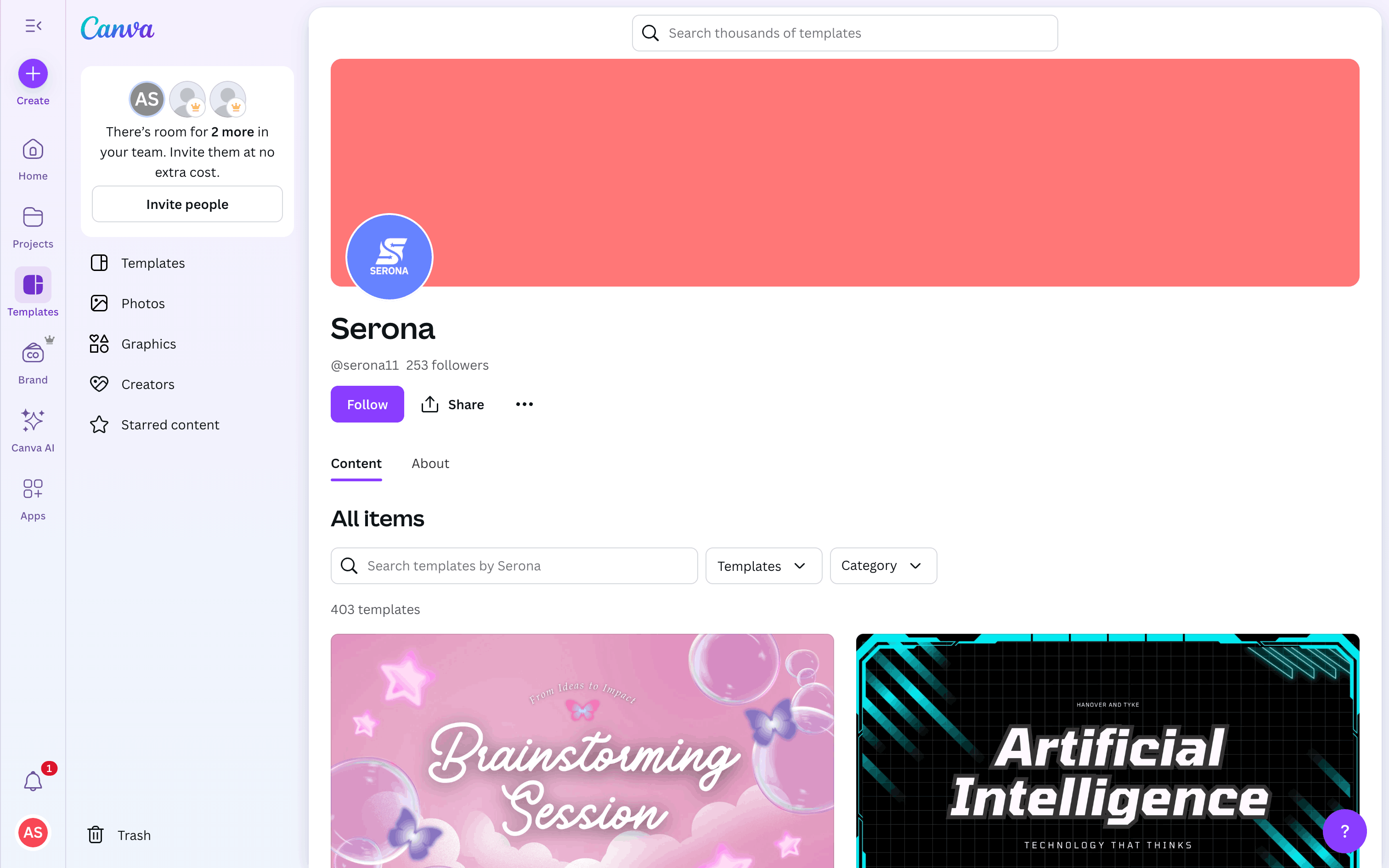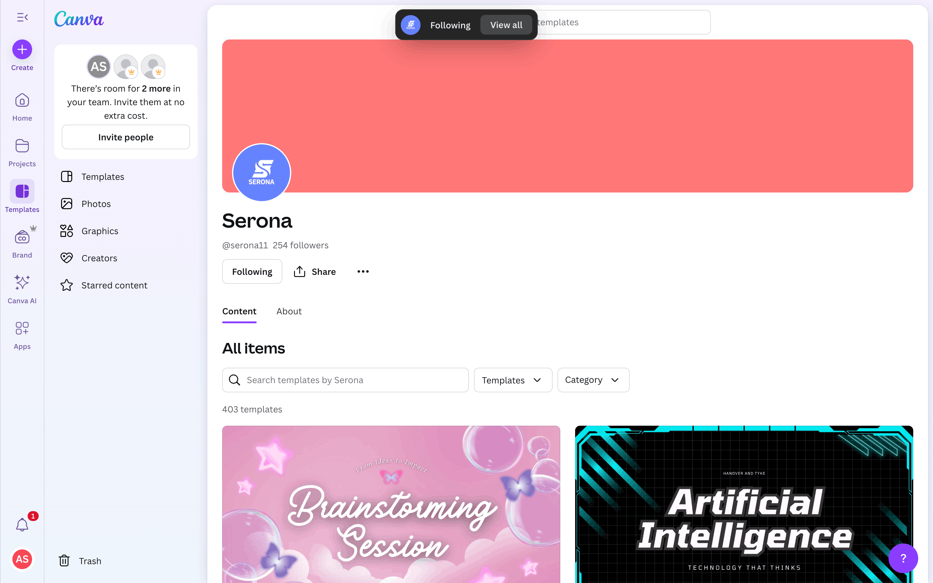 The user views a creator's profile and then follows the creator. The "Follow" button changes to "Following" to reflect the action.