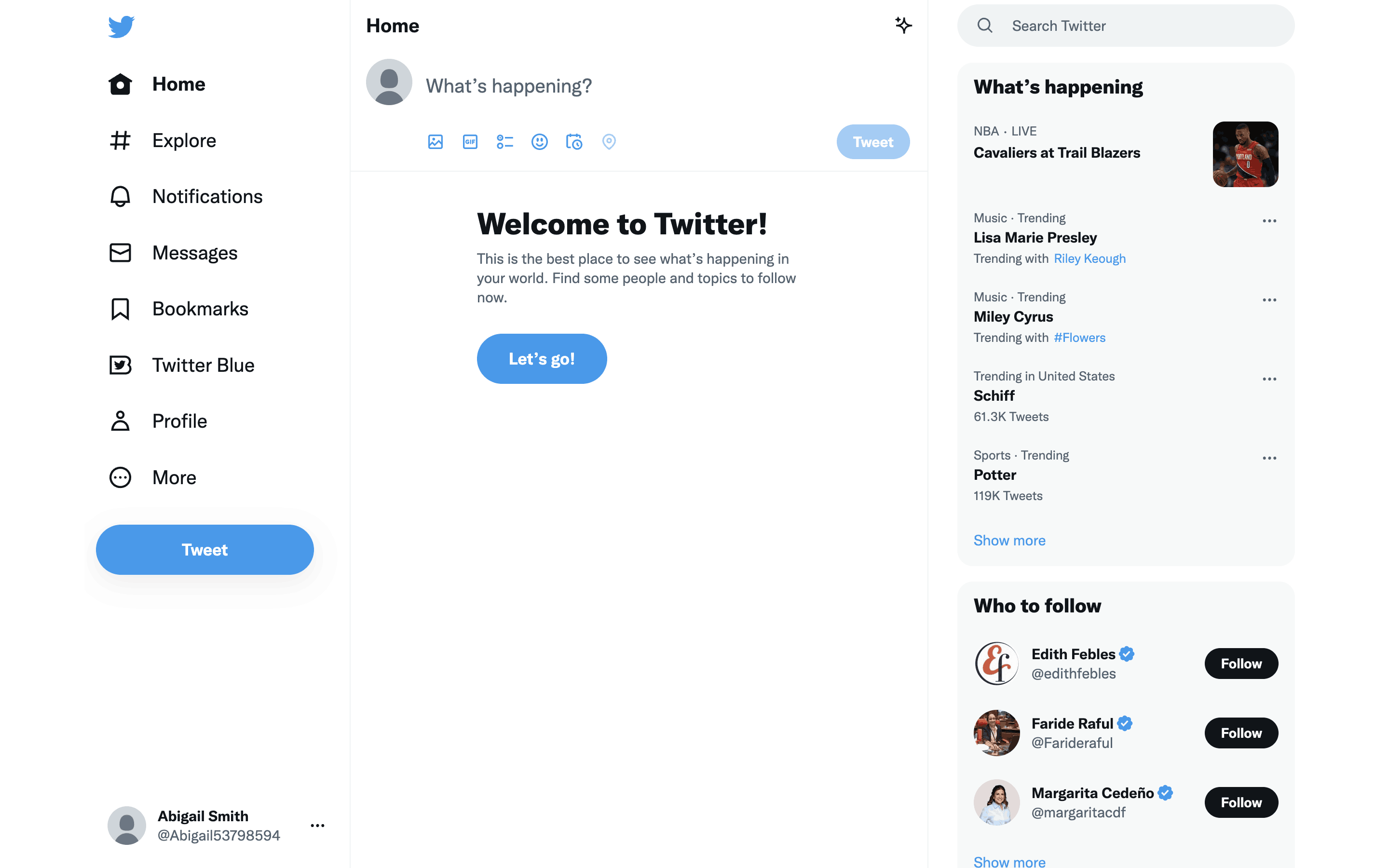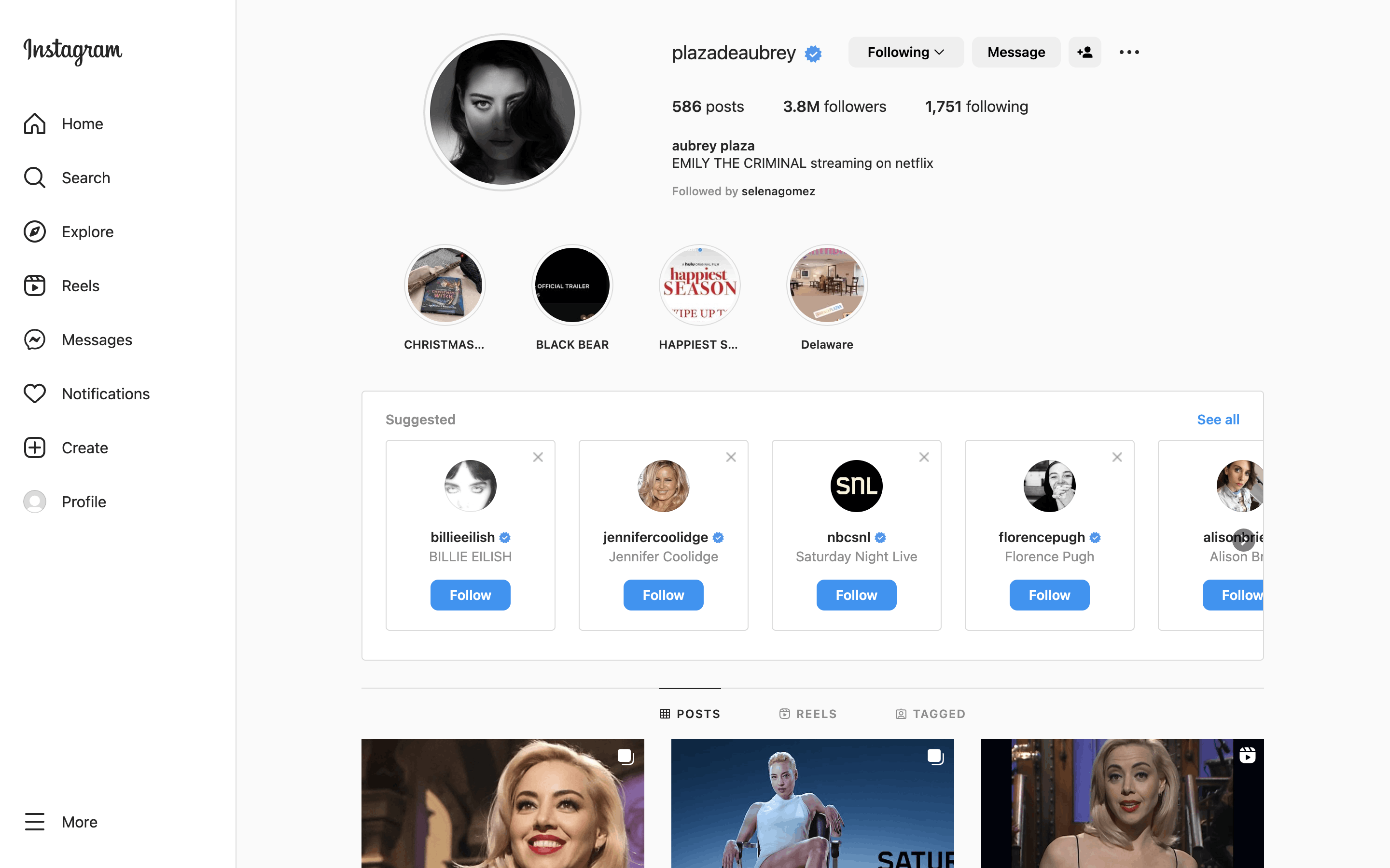 The user navigates through suggested accounts and follows one of them. The 'Follow' button changes to 'Following' to reflect the action.