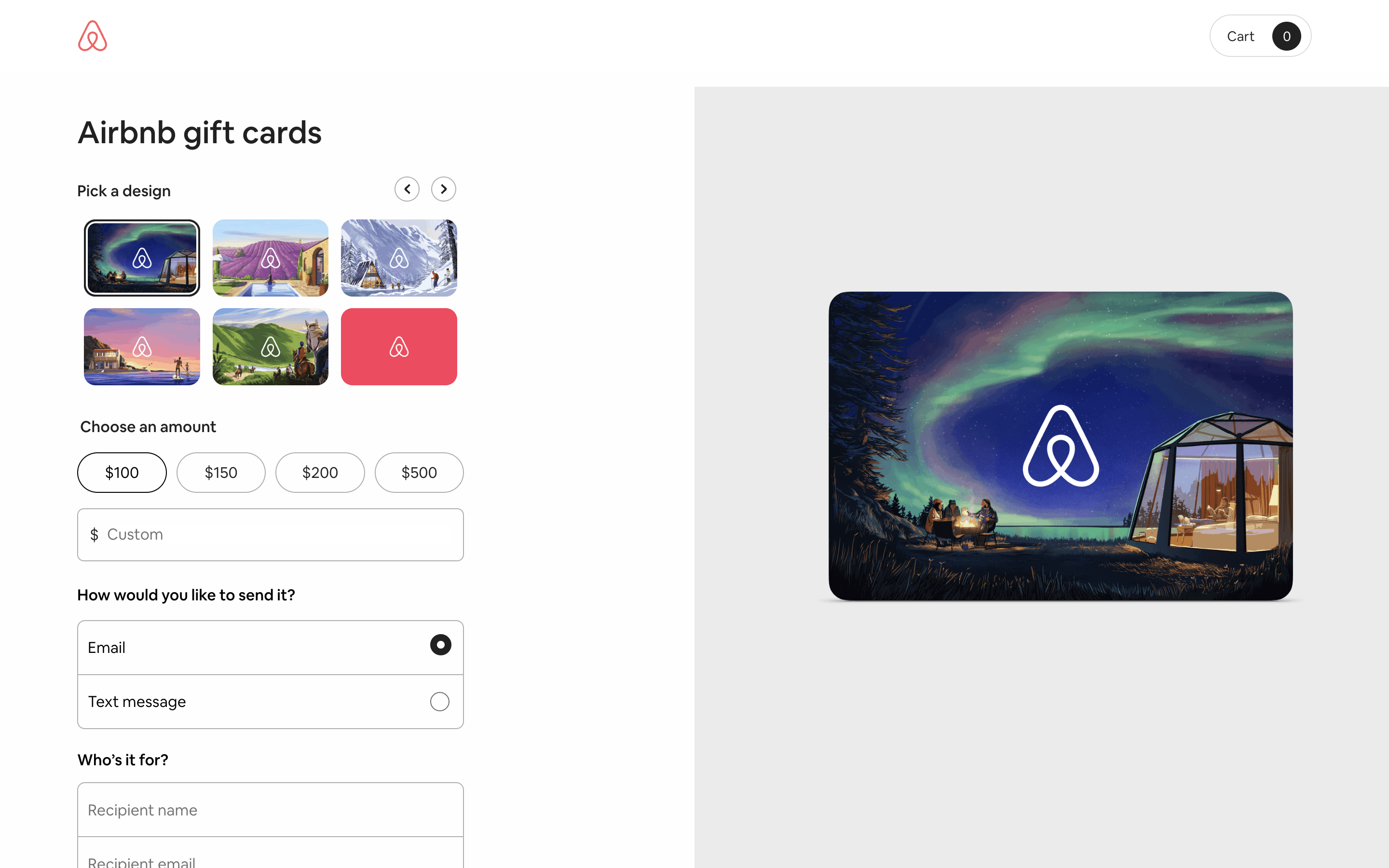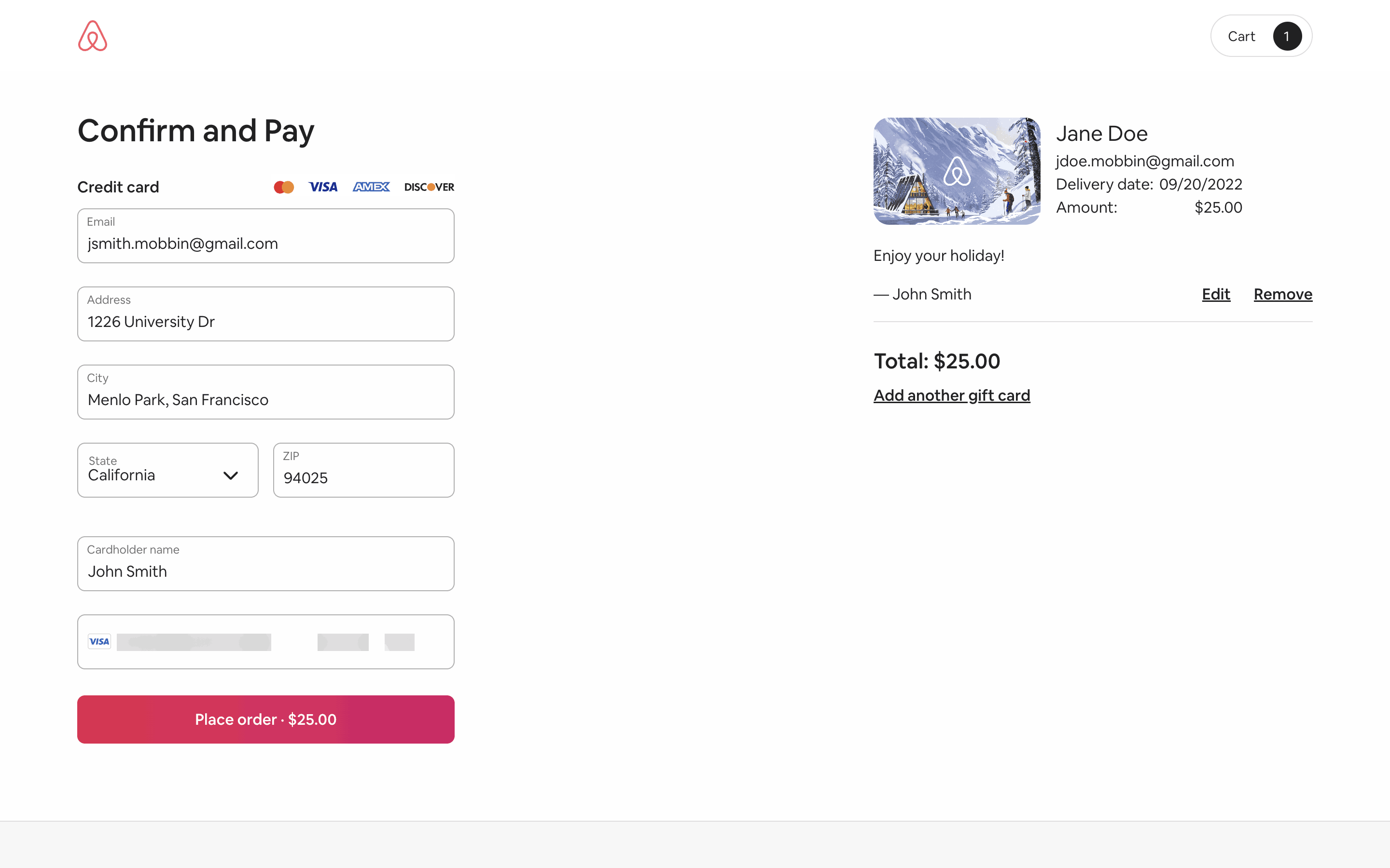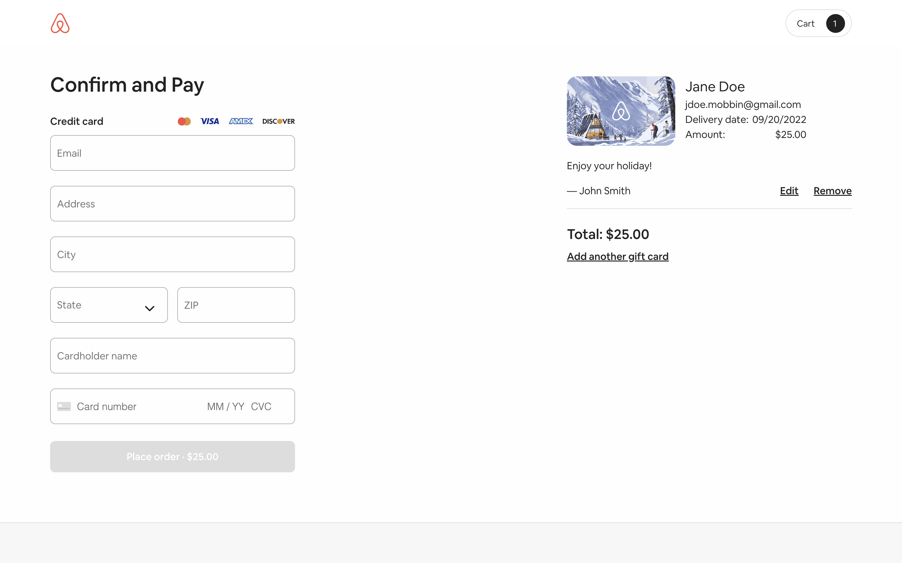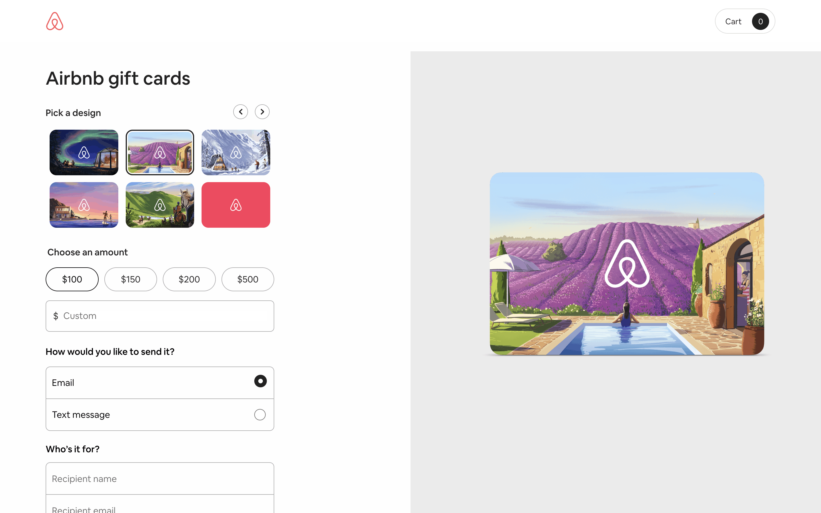 Users select a gift card design, amount, recipient, and add a message. Then, they confirm and pay using their credit card details.