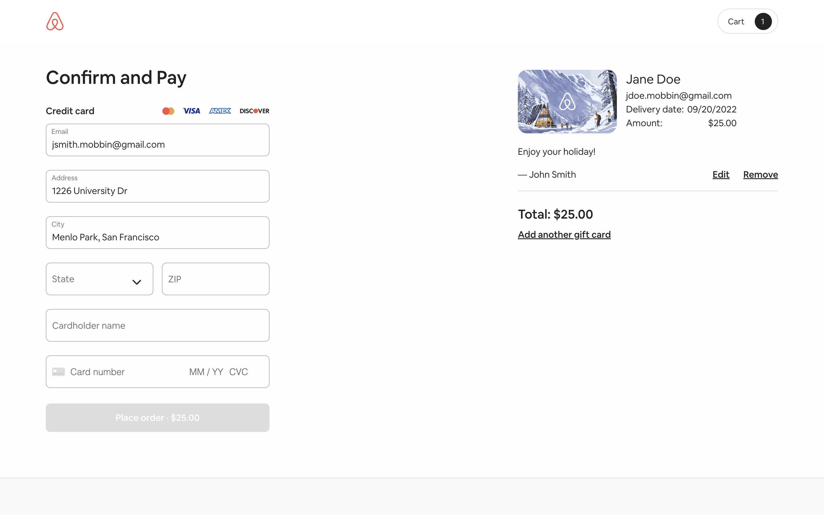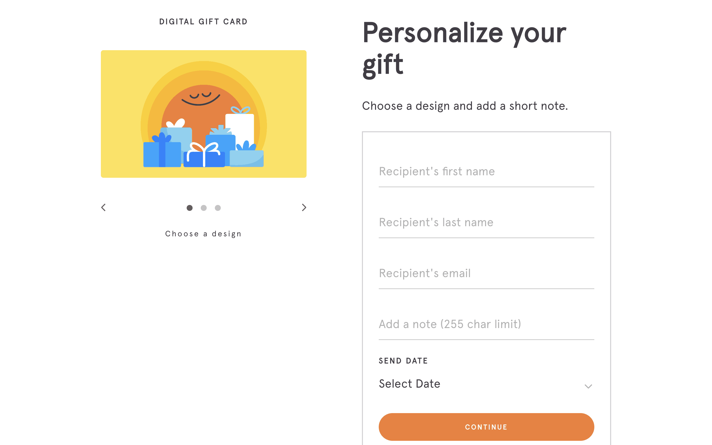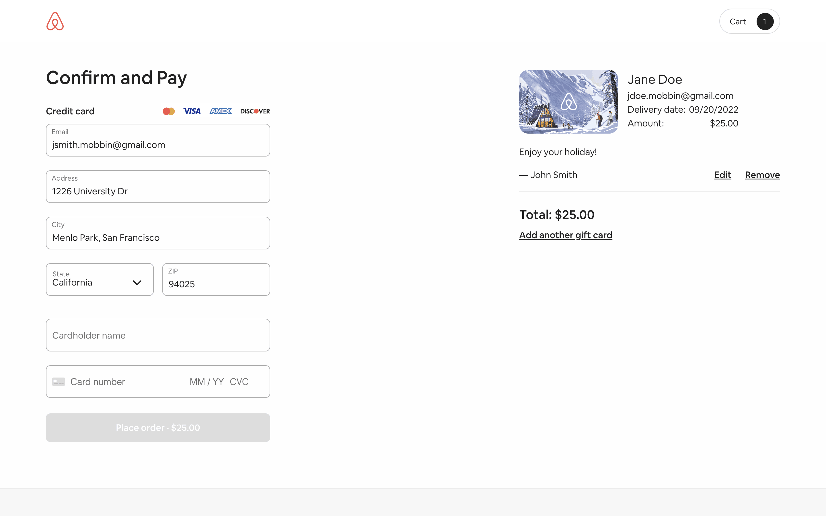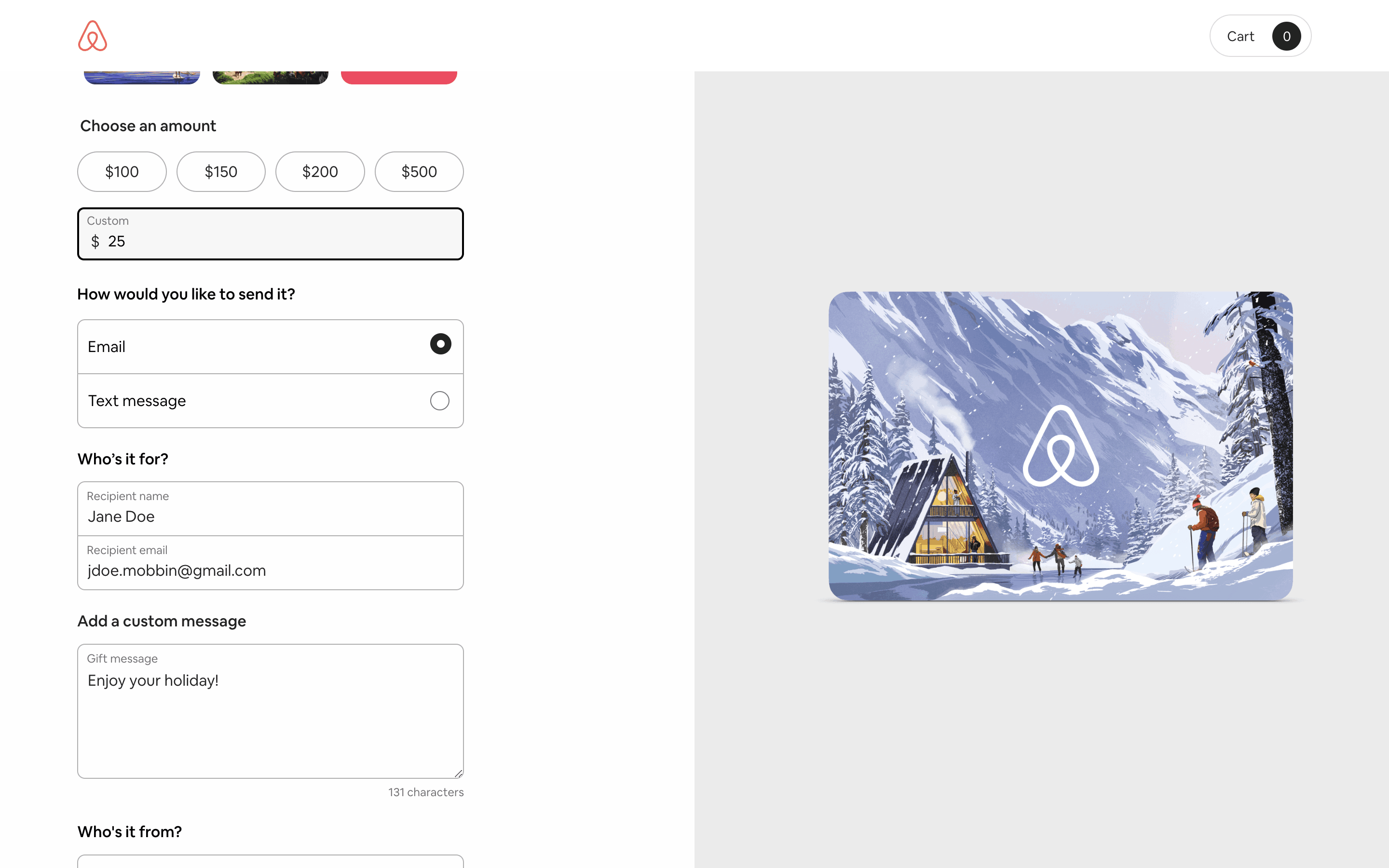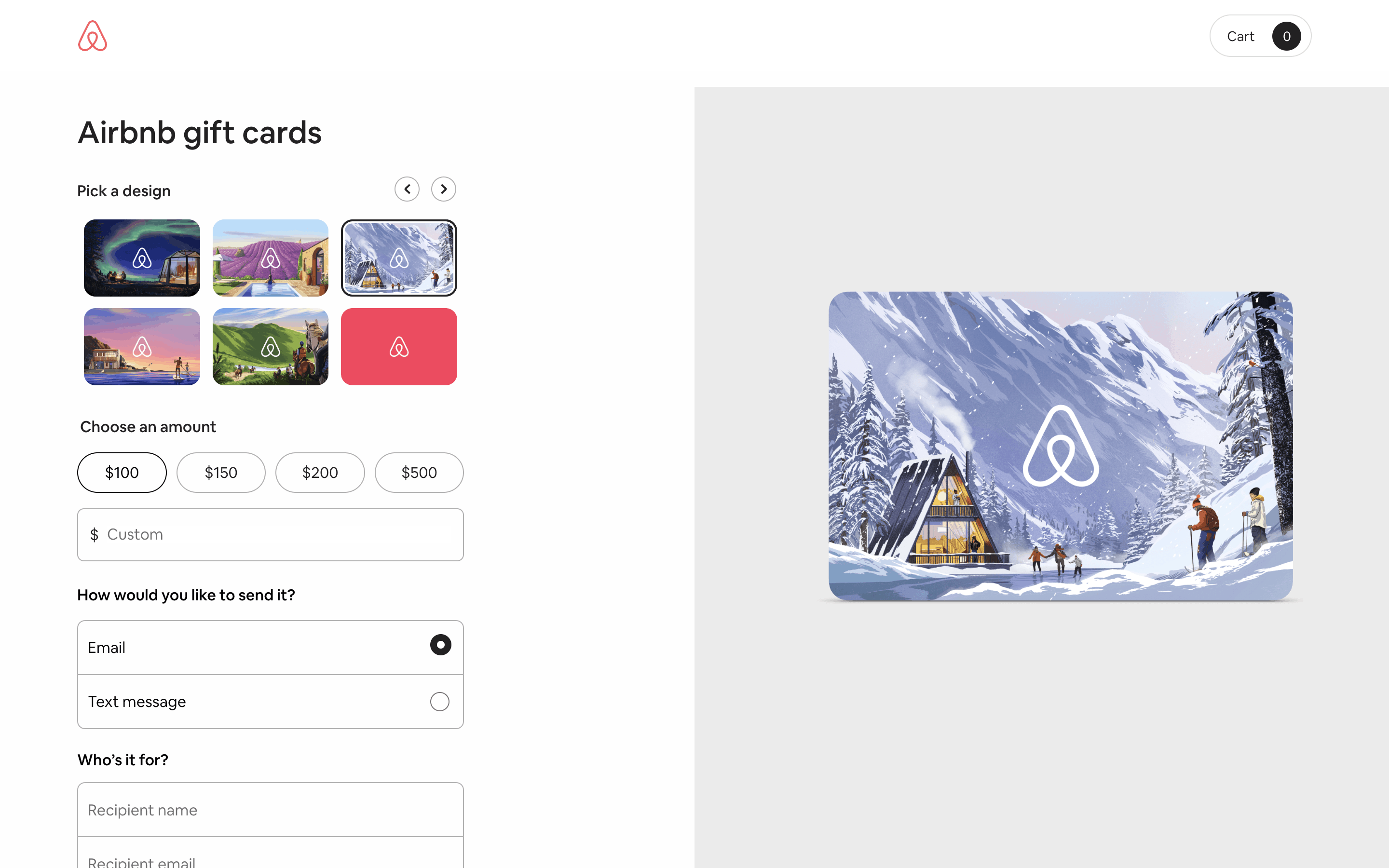 Users select a gift card design, amount, recipient, and add a message. Then, they confirm and pay using their credit card details.