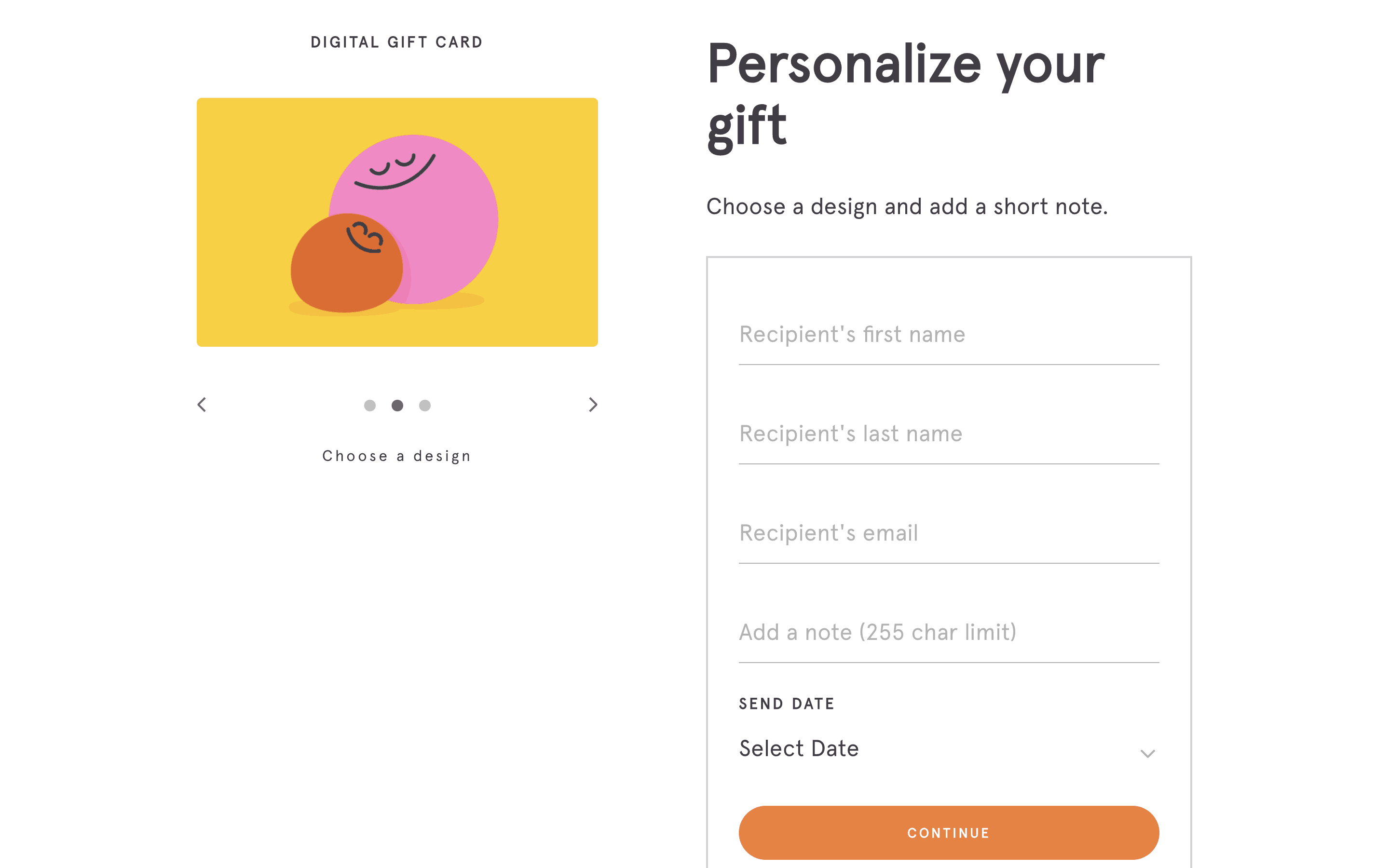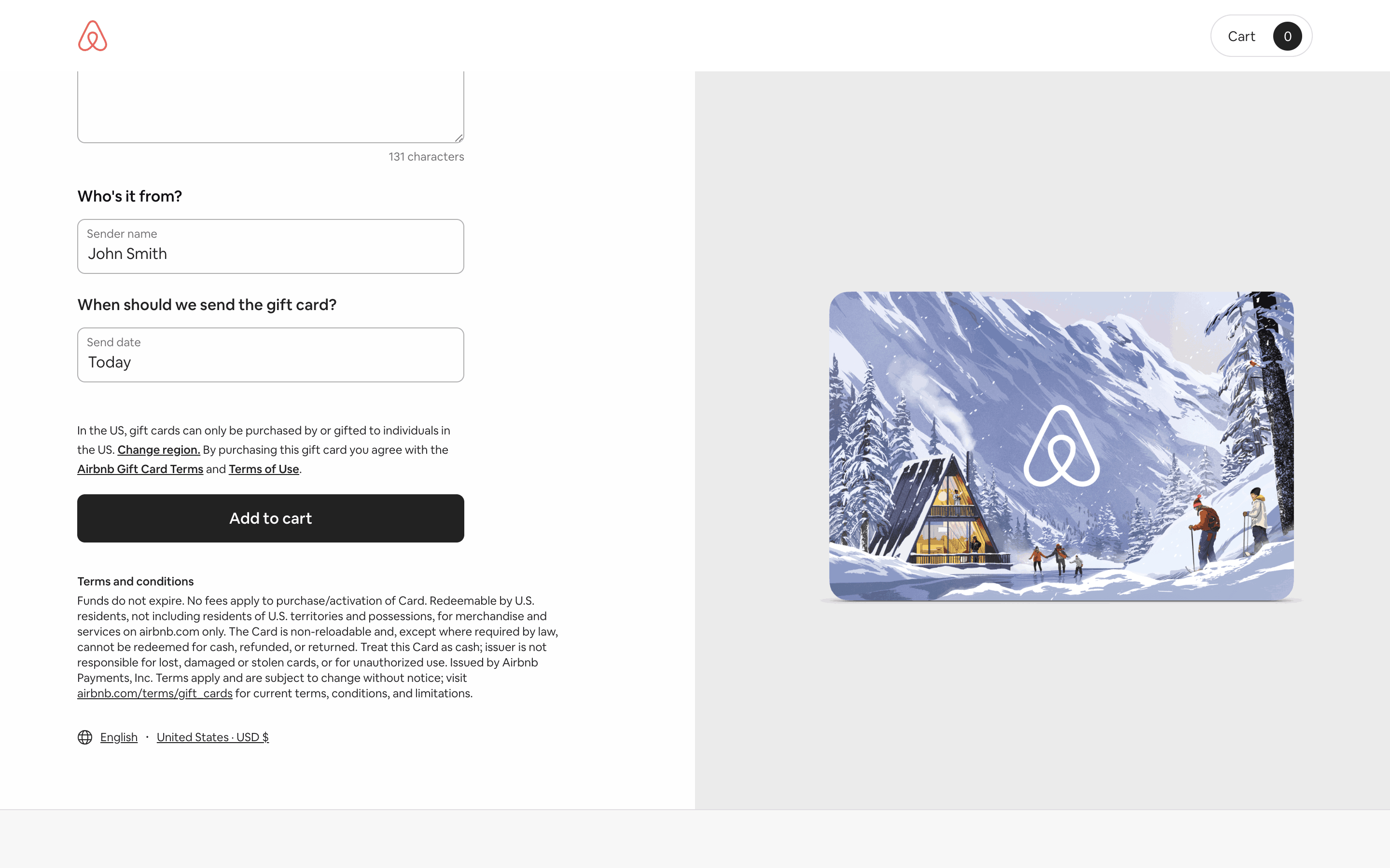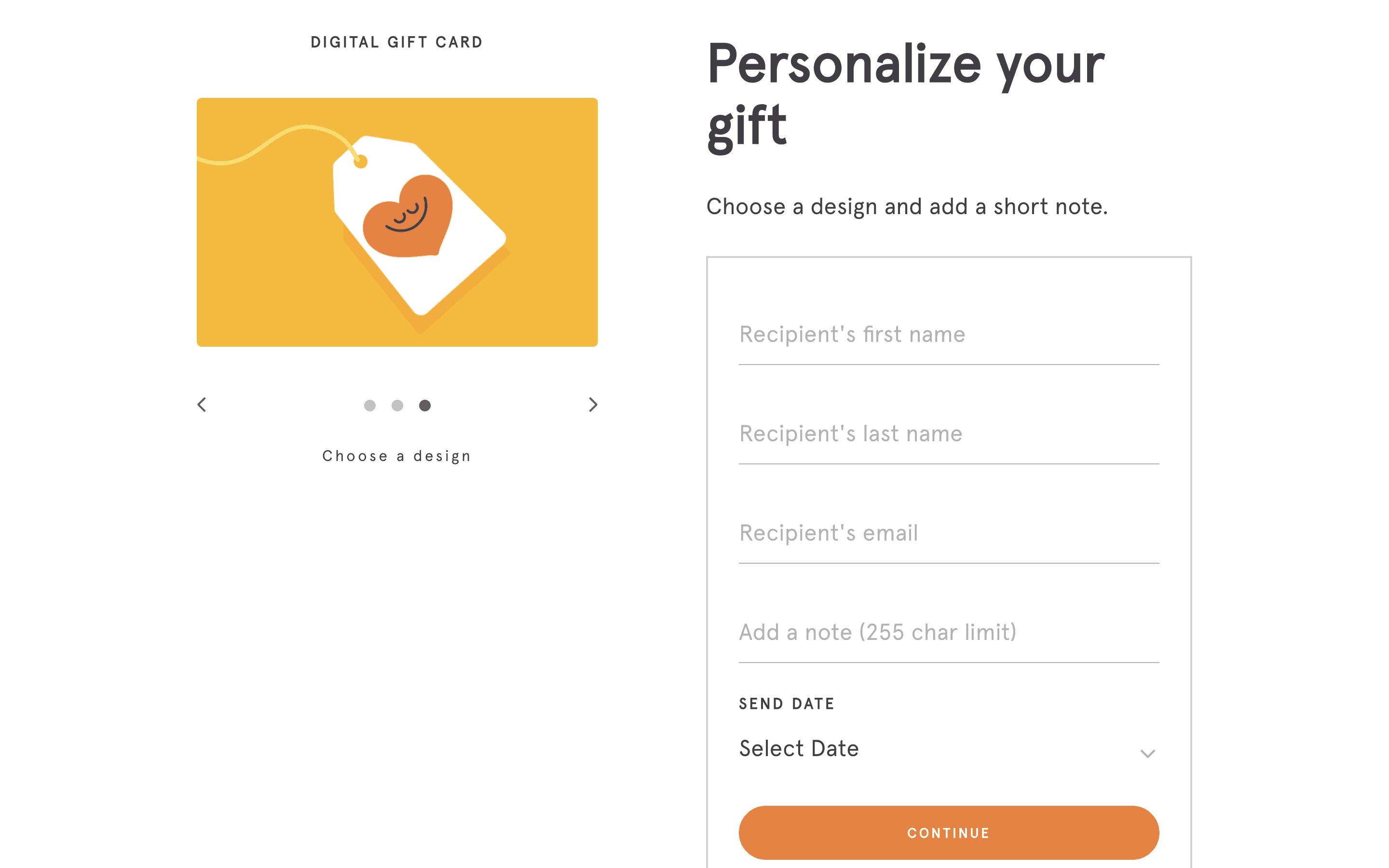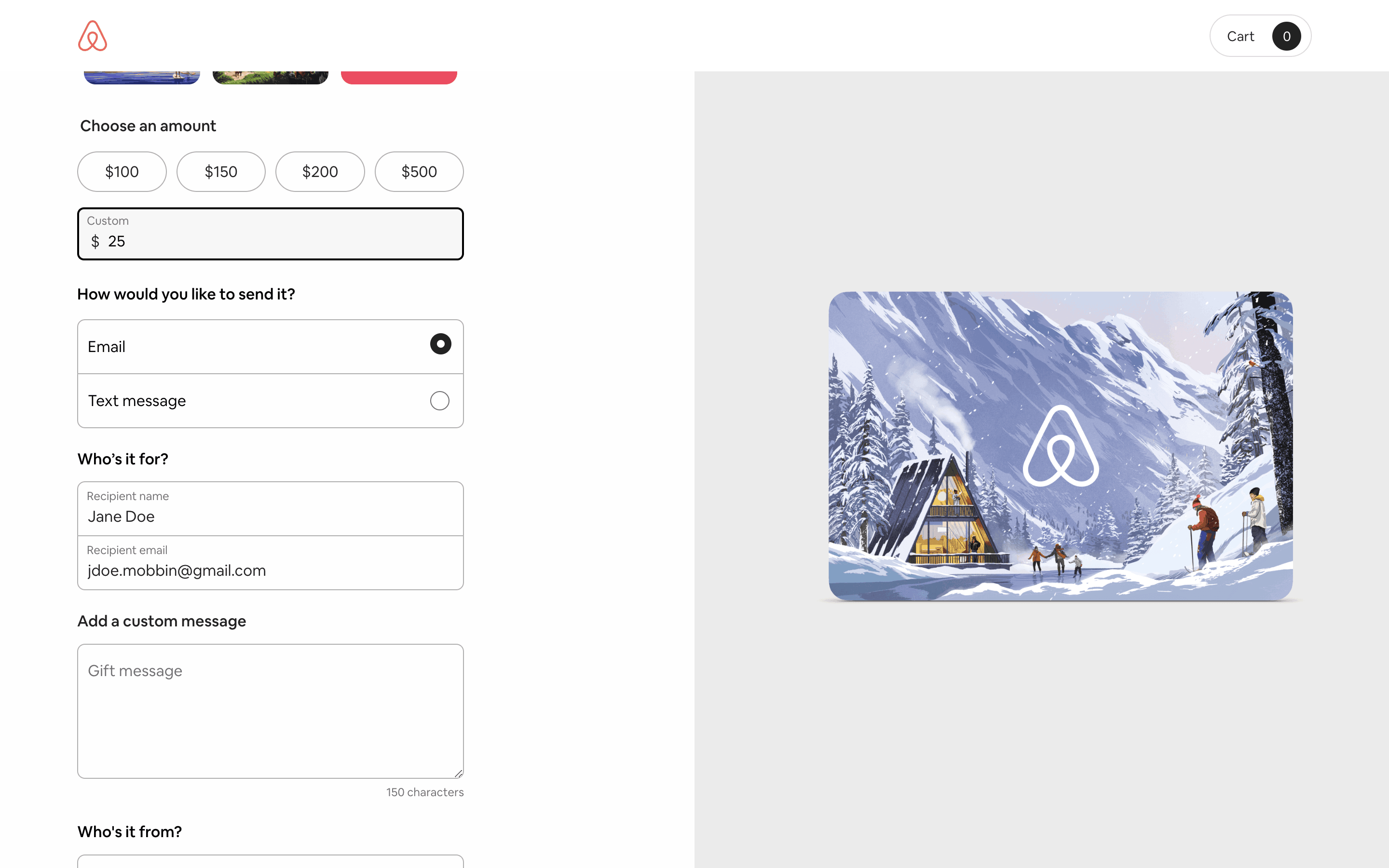 Users select a gift card design, amount, recipient, and add a message. Then, they confirm and pay using their credit card details.