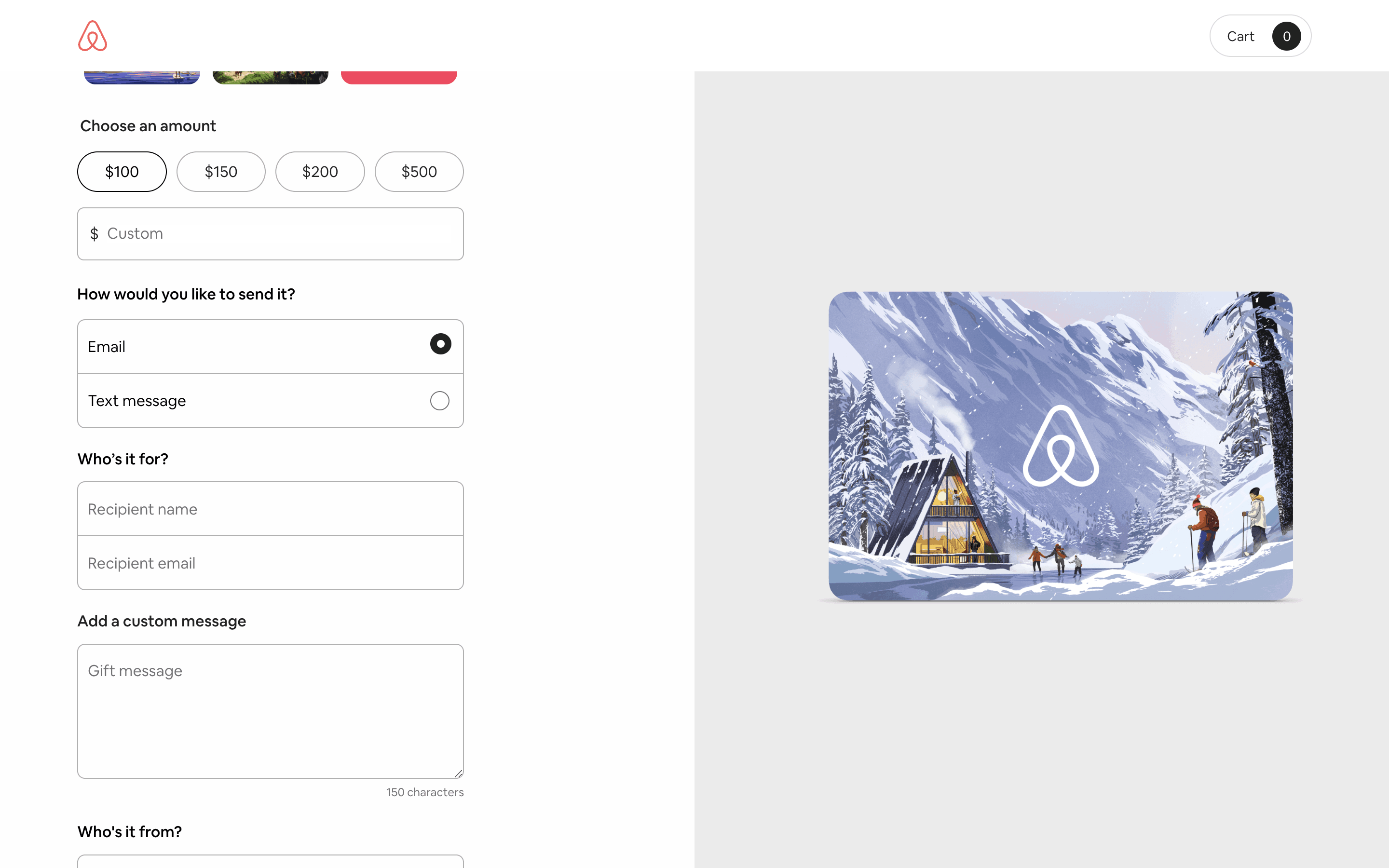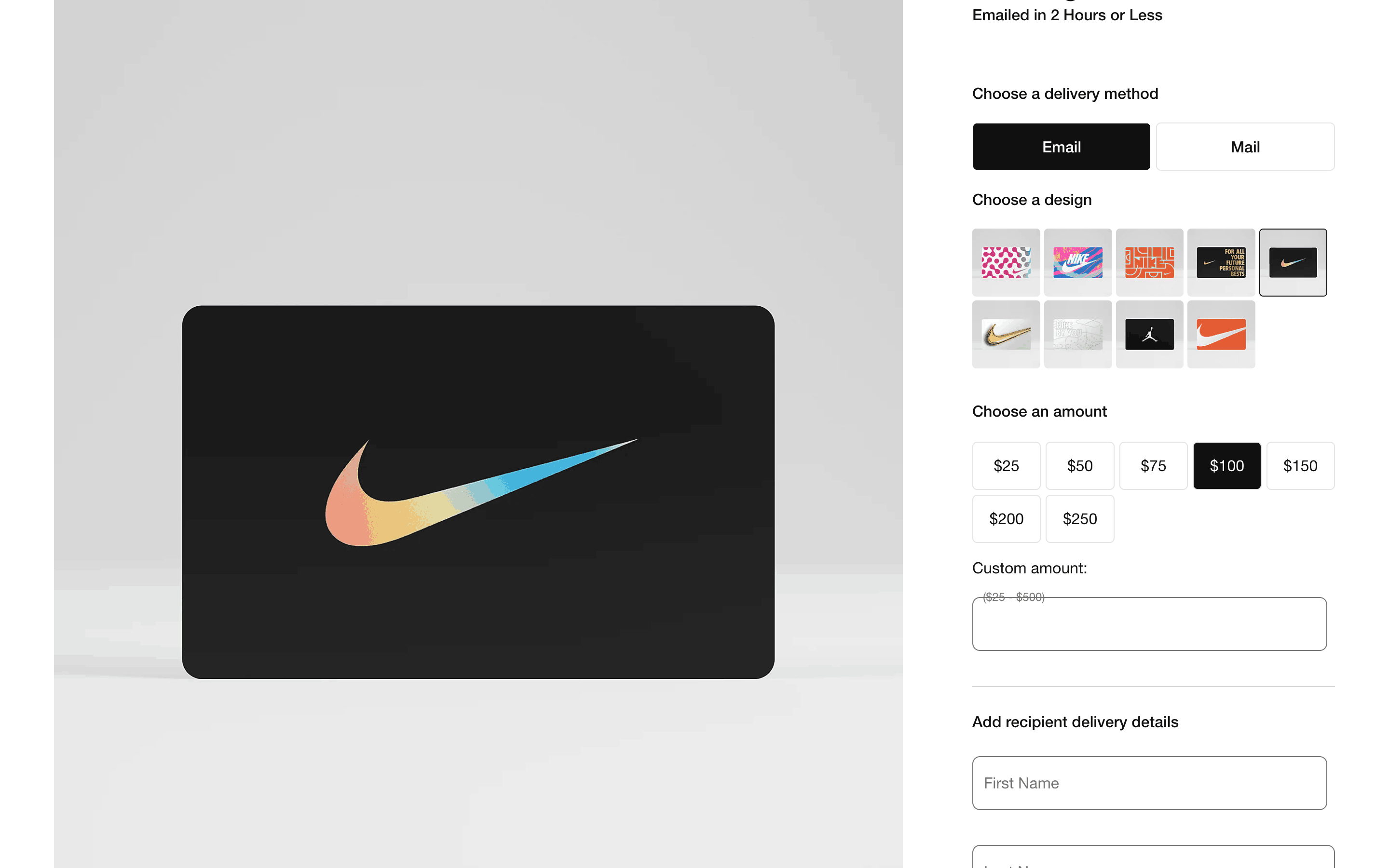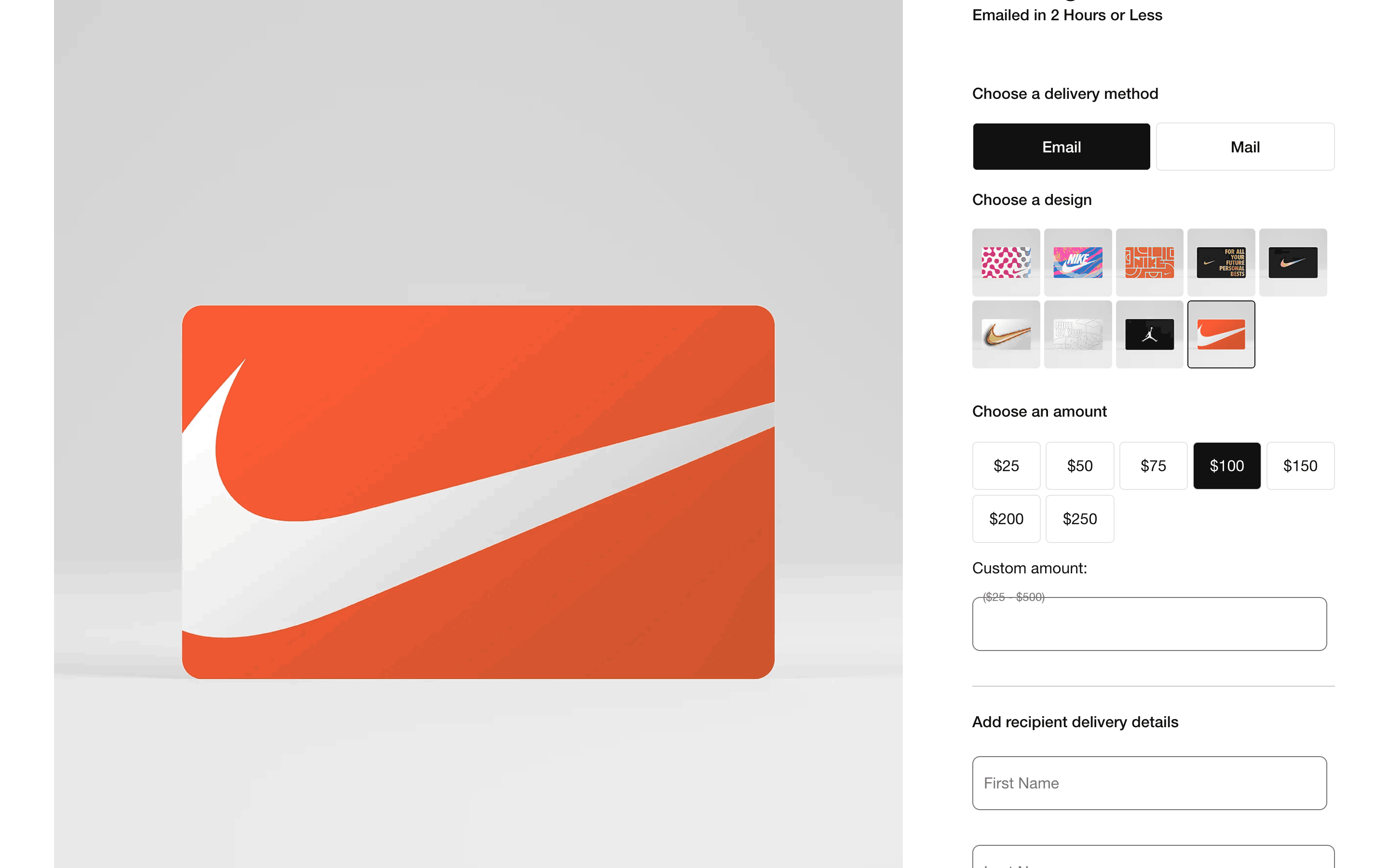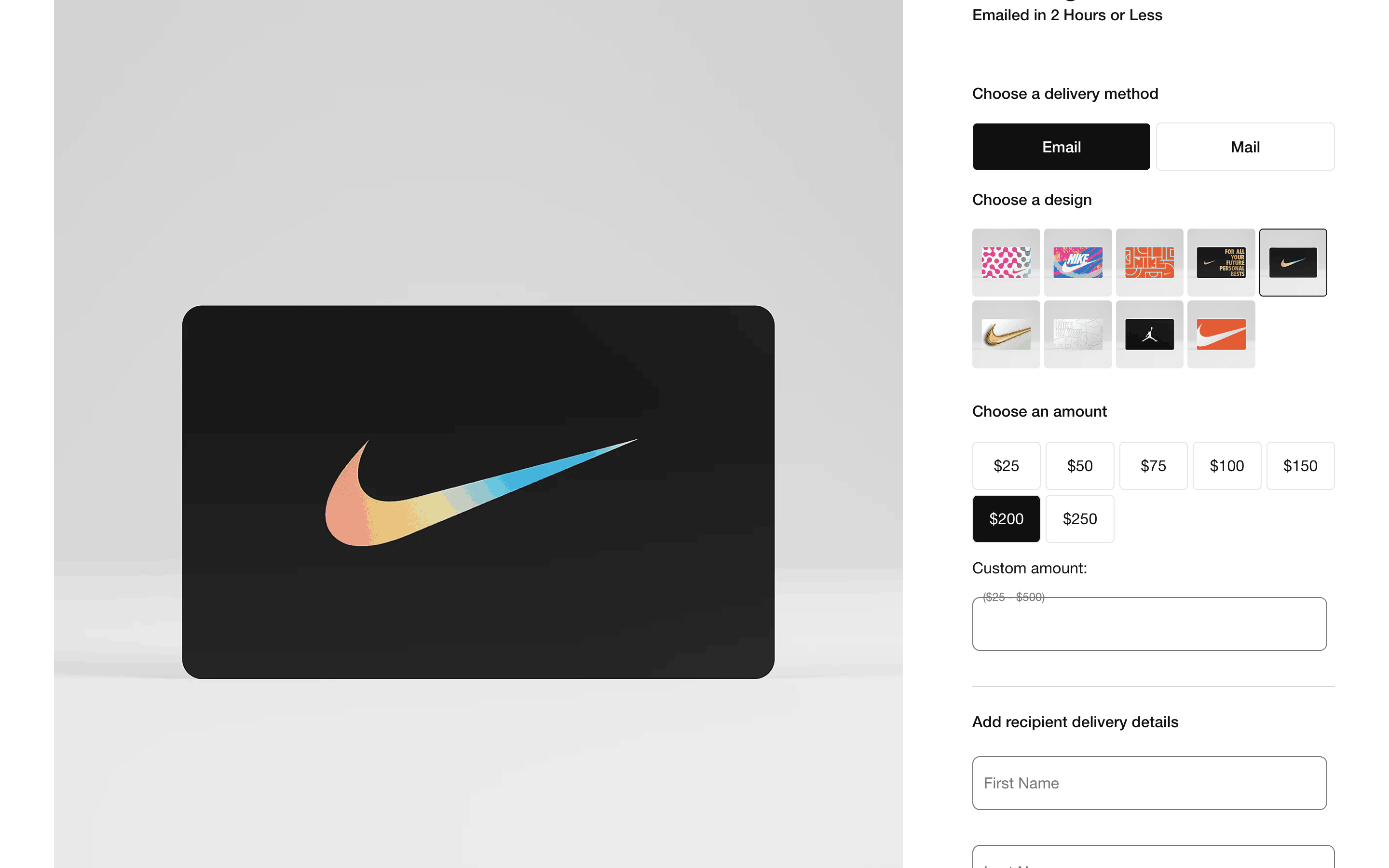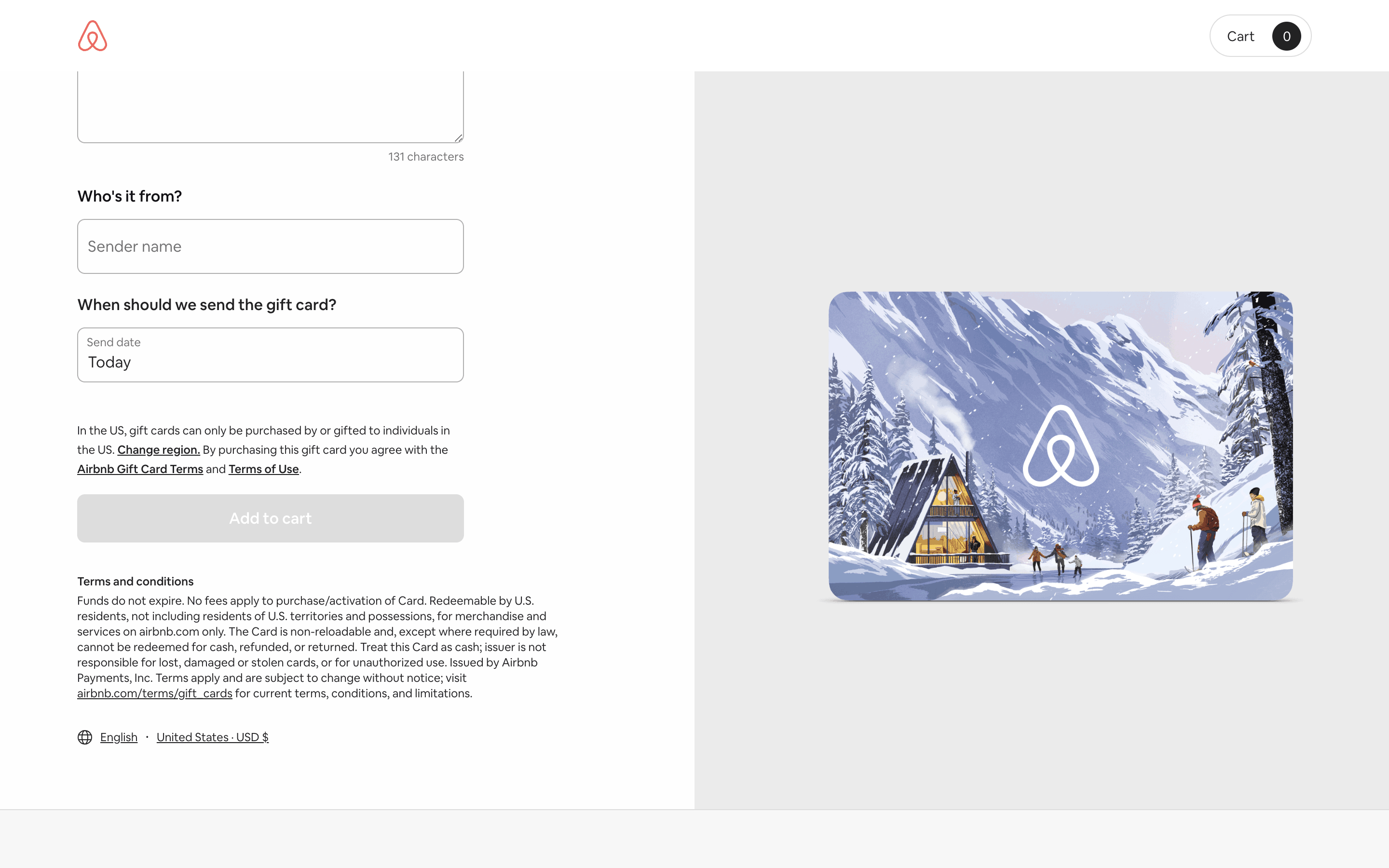 Users select a gift card design, amount, recipient, and add a message. Then, they confirm and pay using their credit card details.