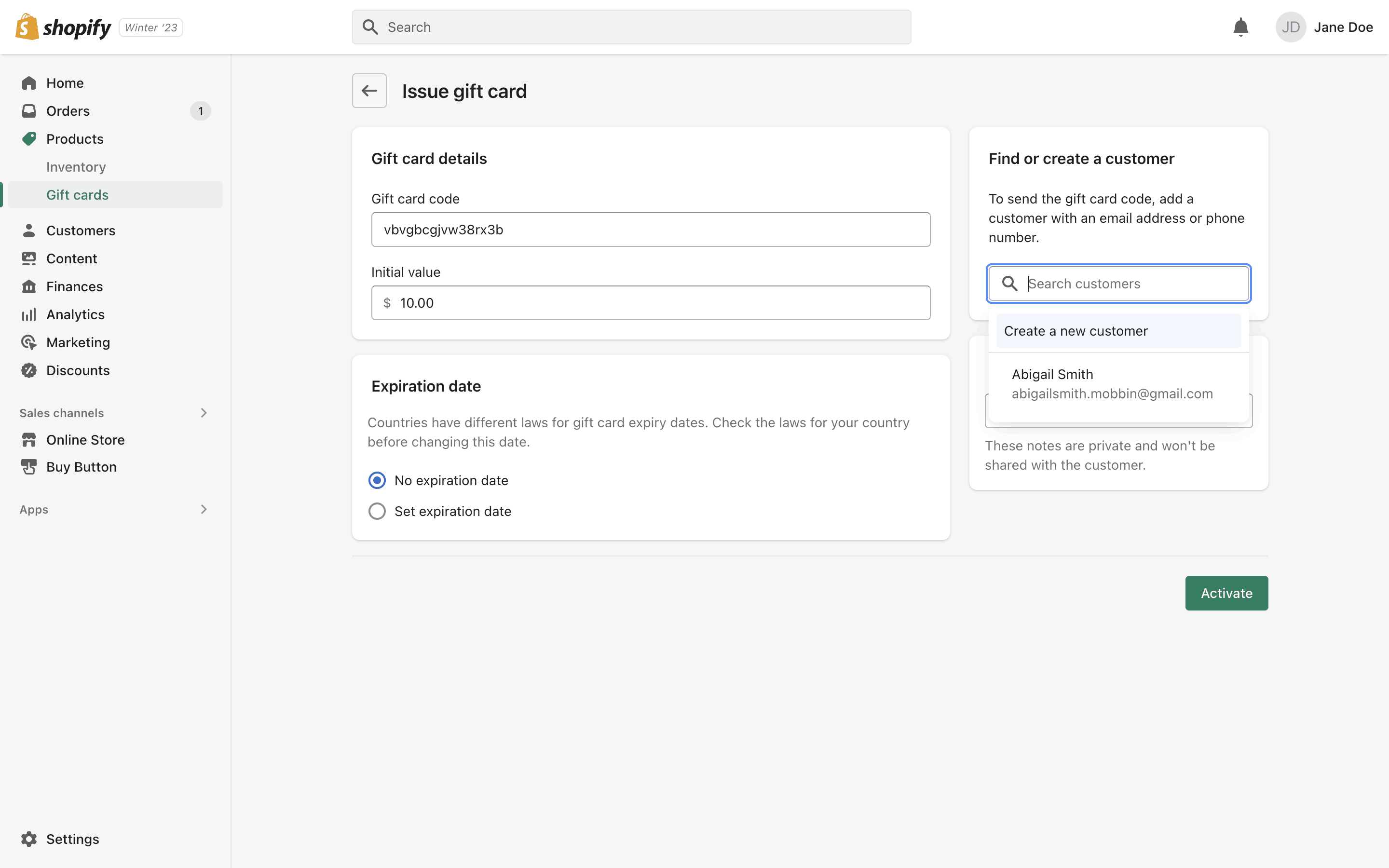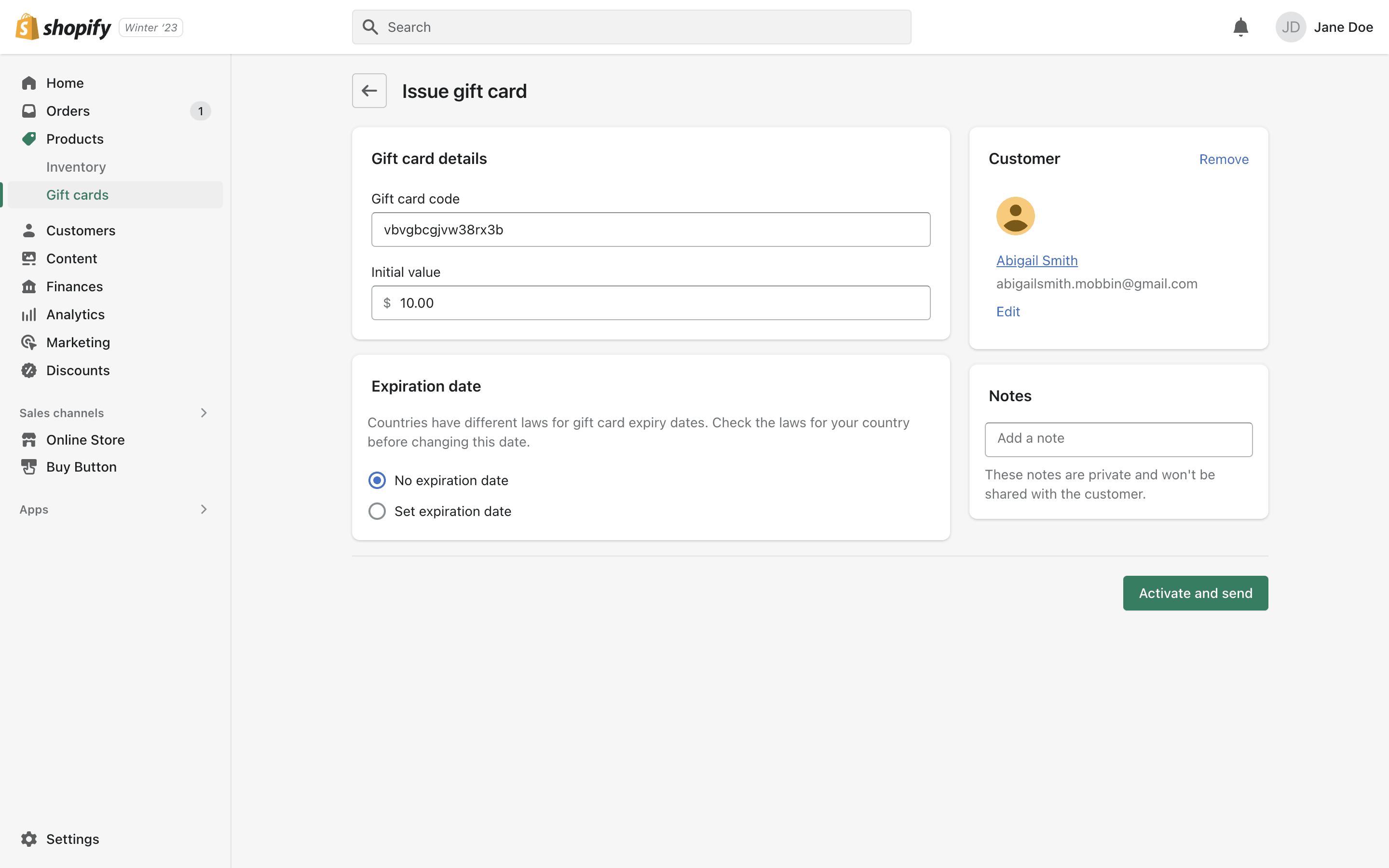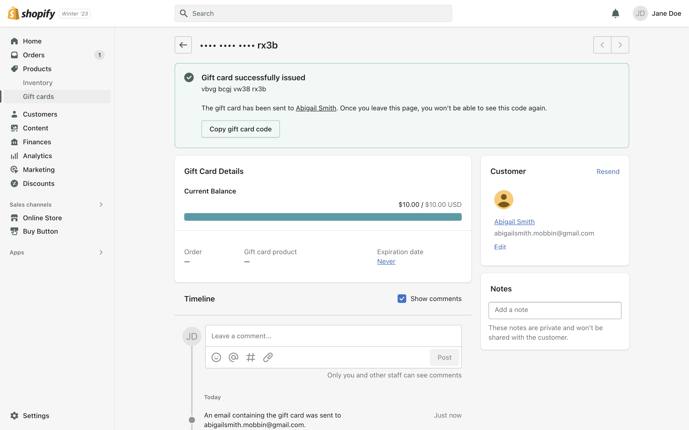 The user flow demonstrates how to issue a gift card to a customer. It involves filling out a form, selecting a customer, and then viewing the gift card details.