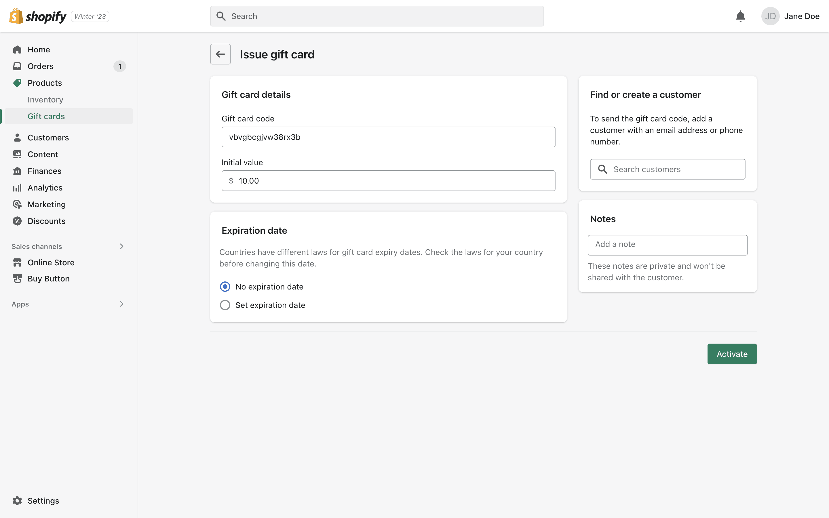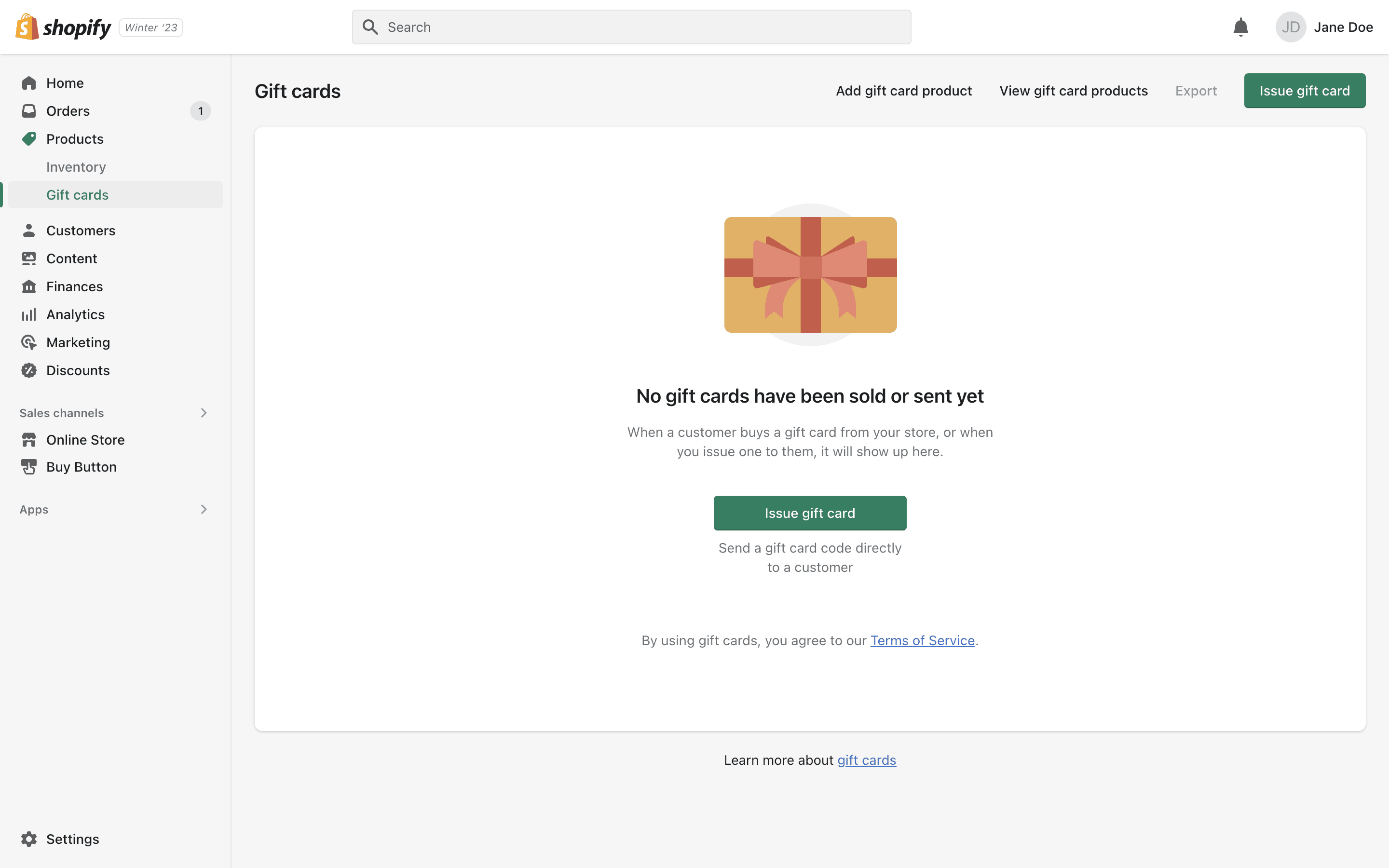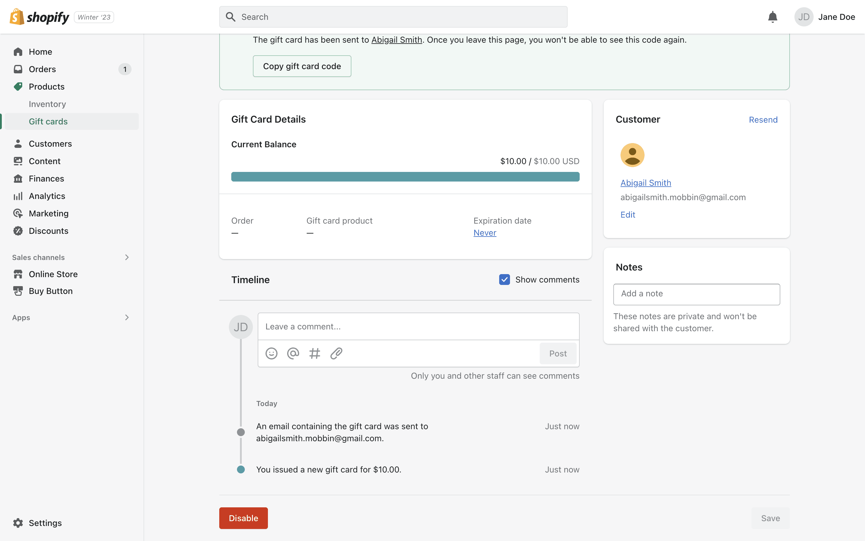 The user flow demonstrates how to issue a gift card to a customer. It involves filling out a form, selecting a customer, and then viewing the gift card details.
