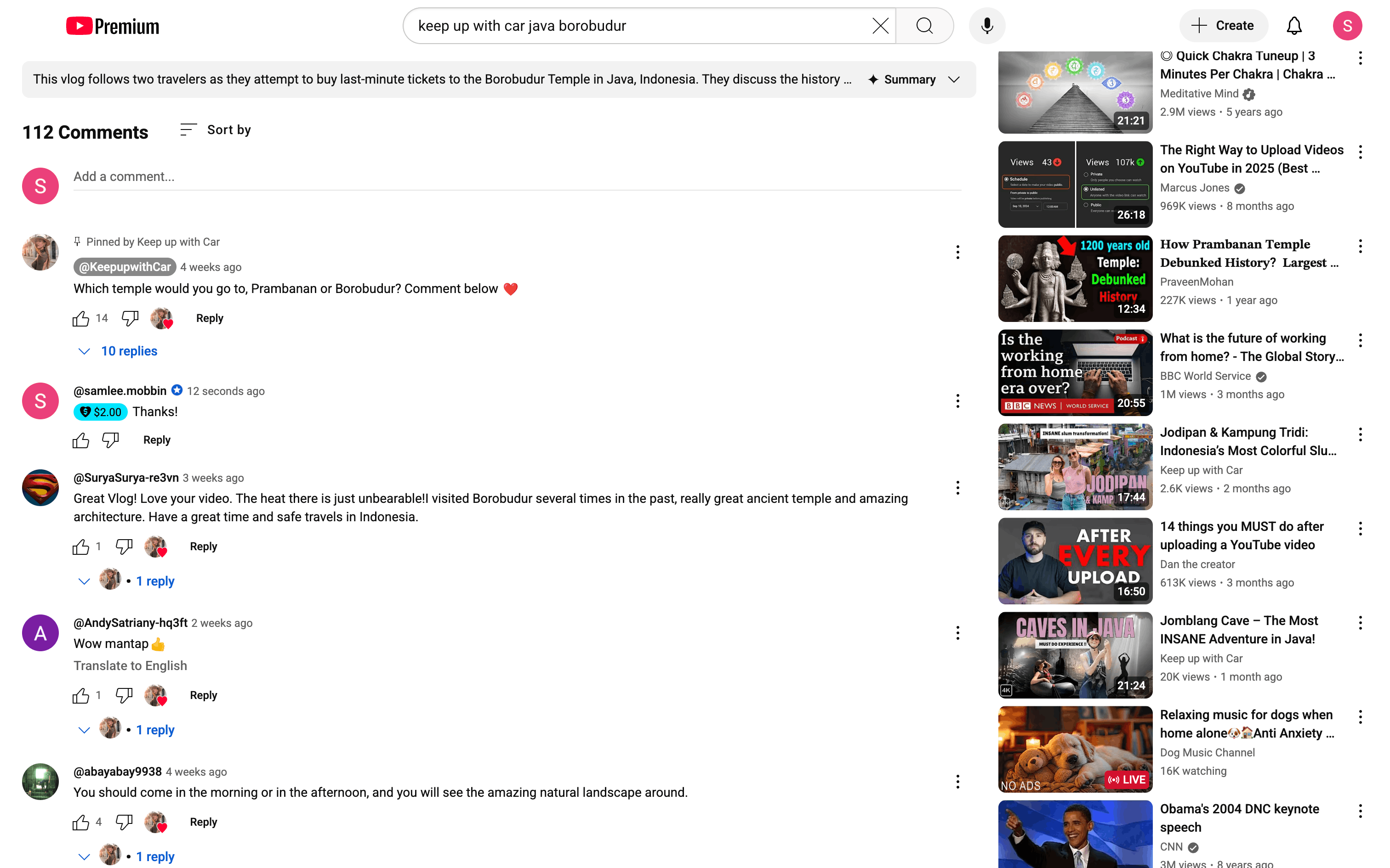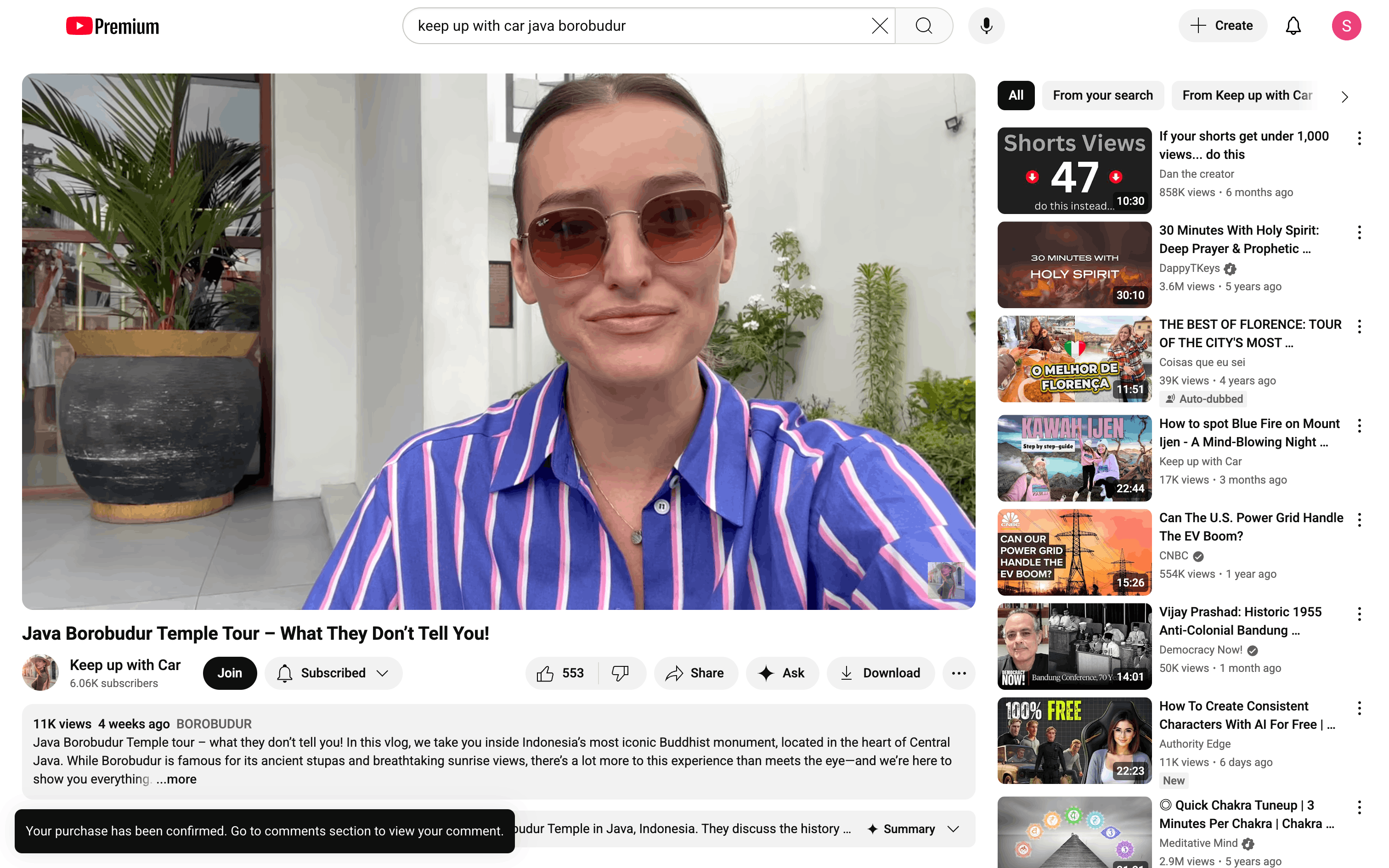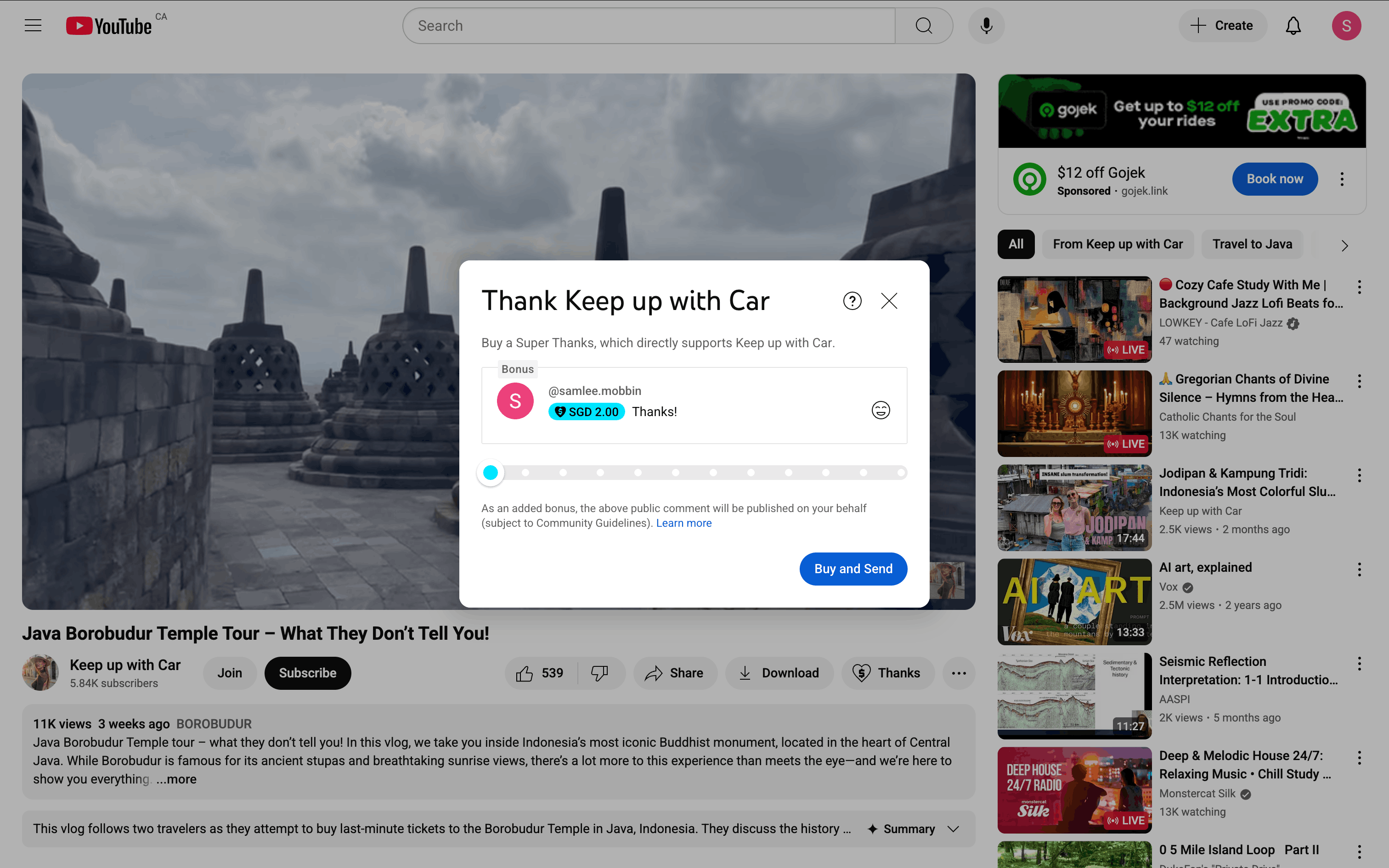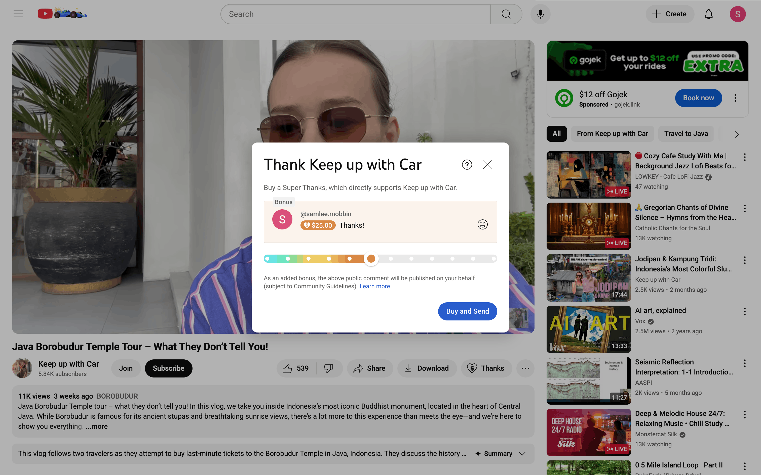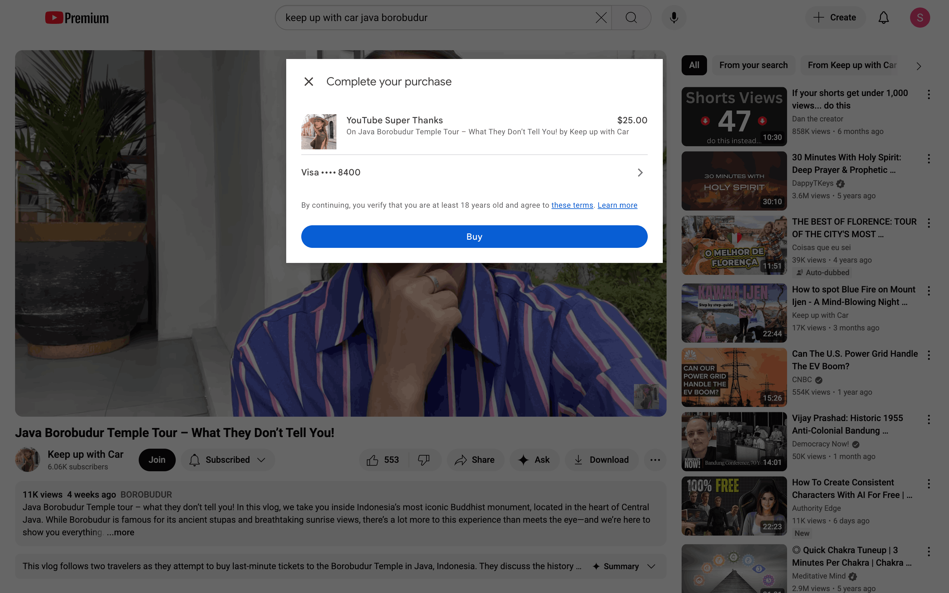 The user sends a Super Thanks to a channel. They select the amount, confirm the purchase, and are redirected to the comments section.