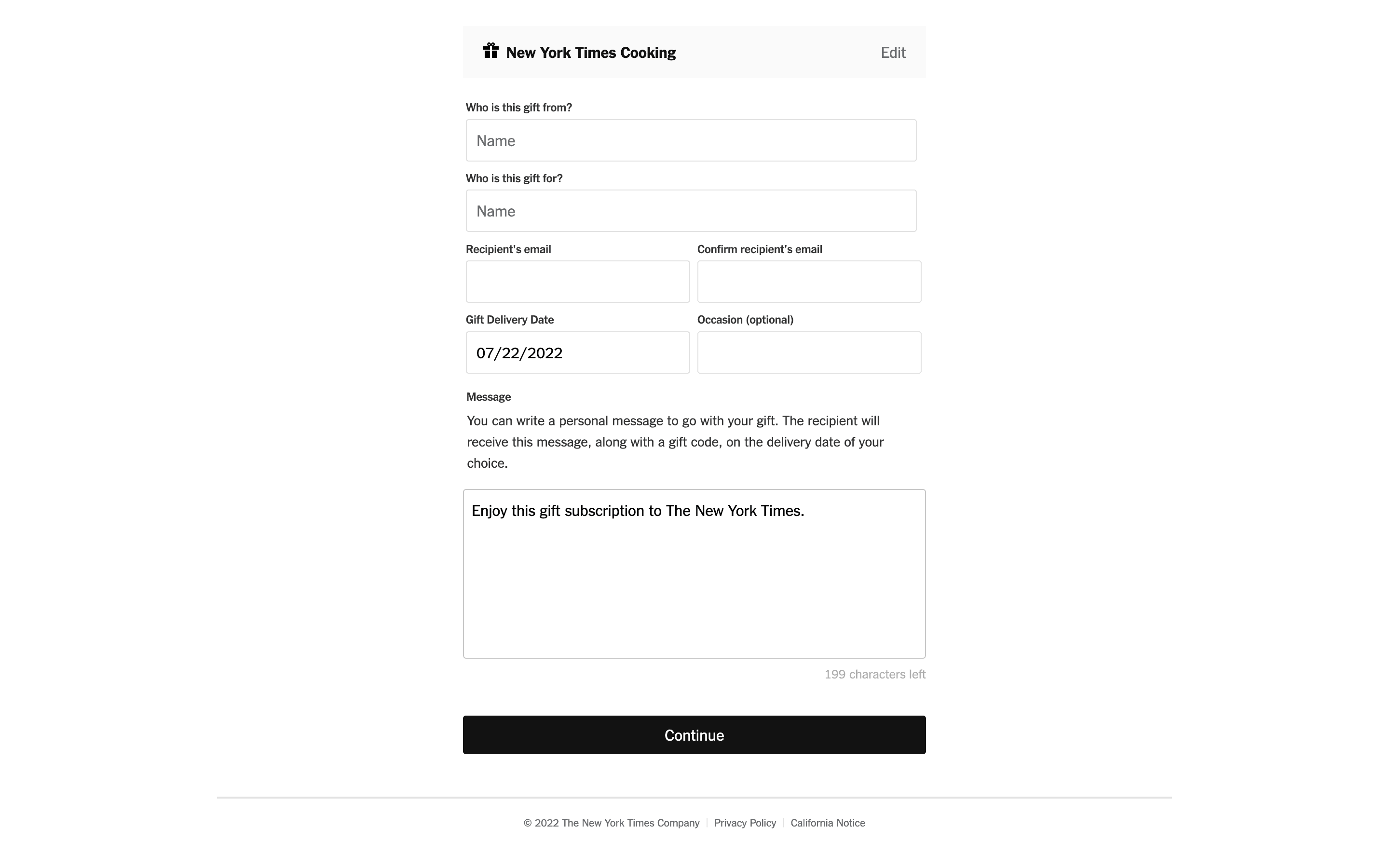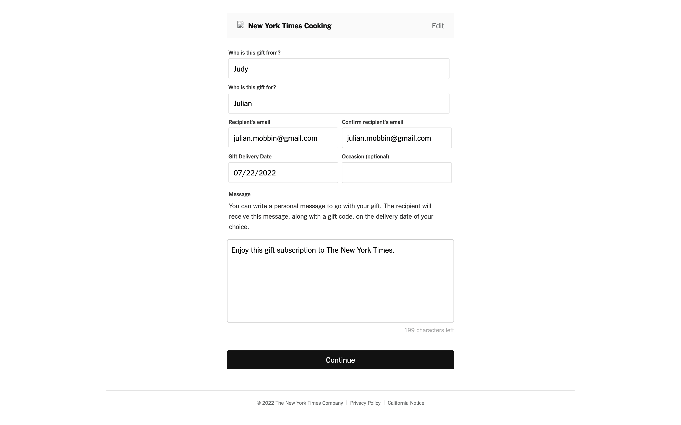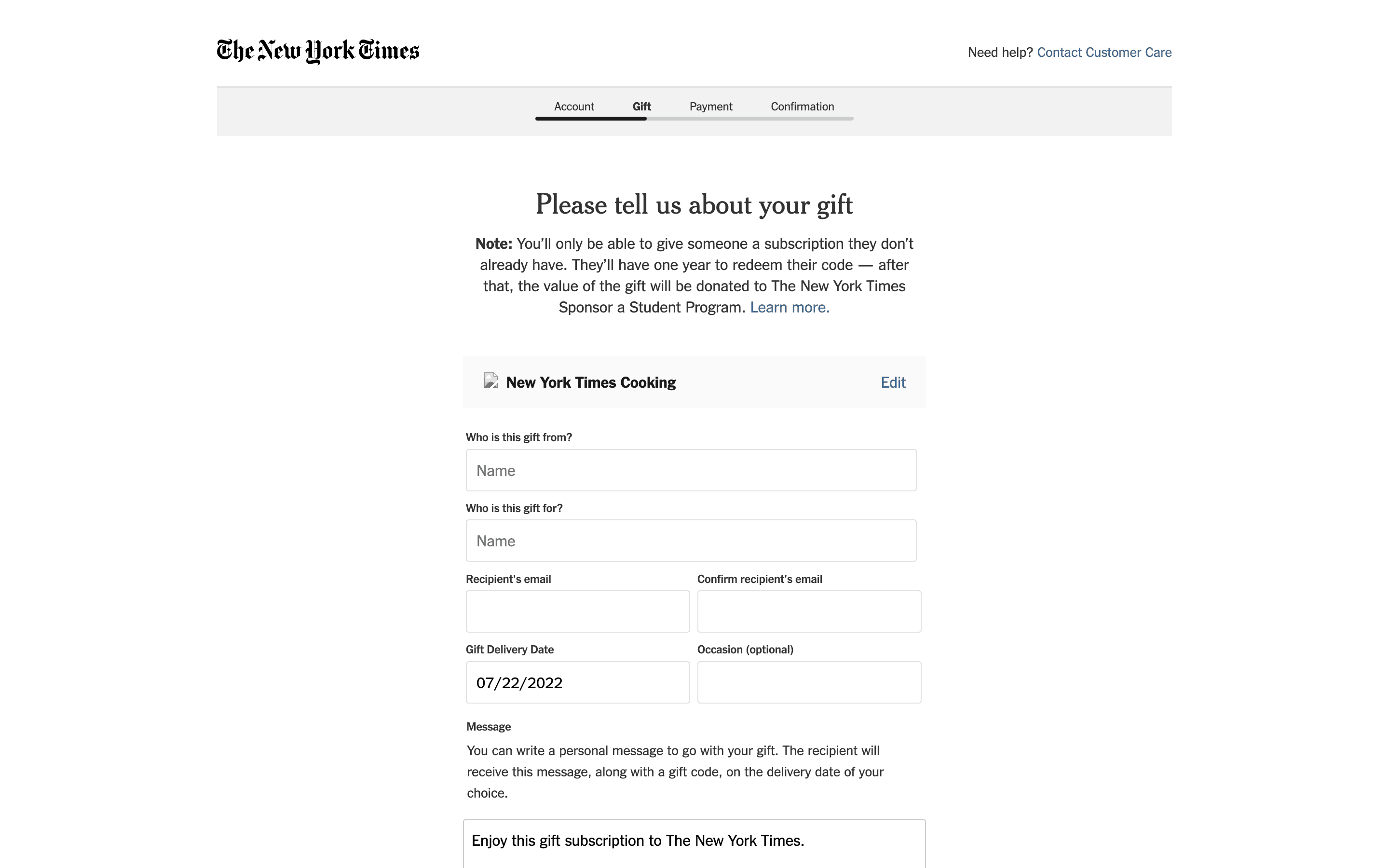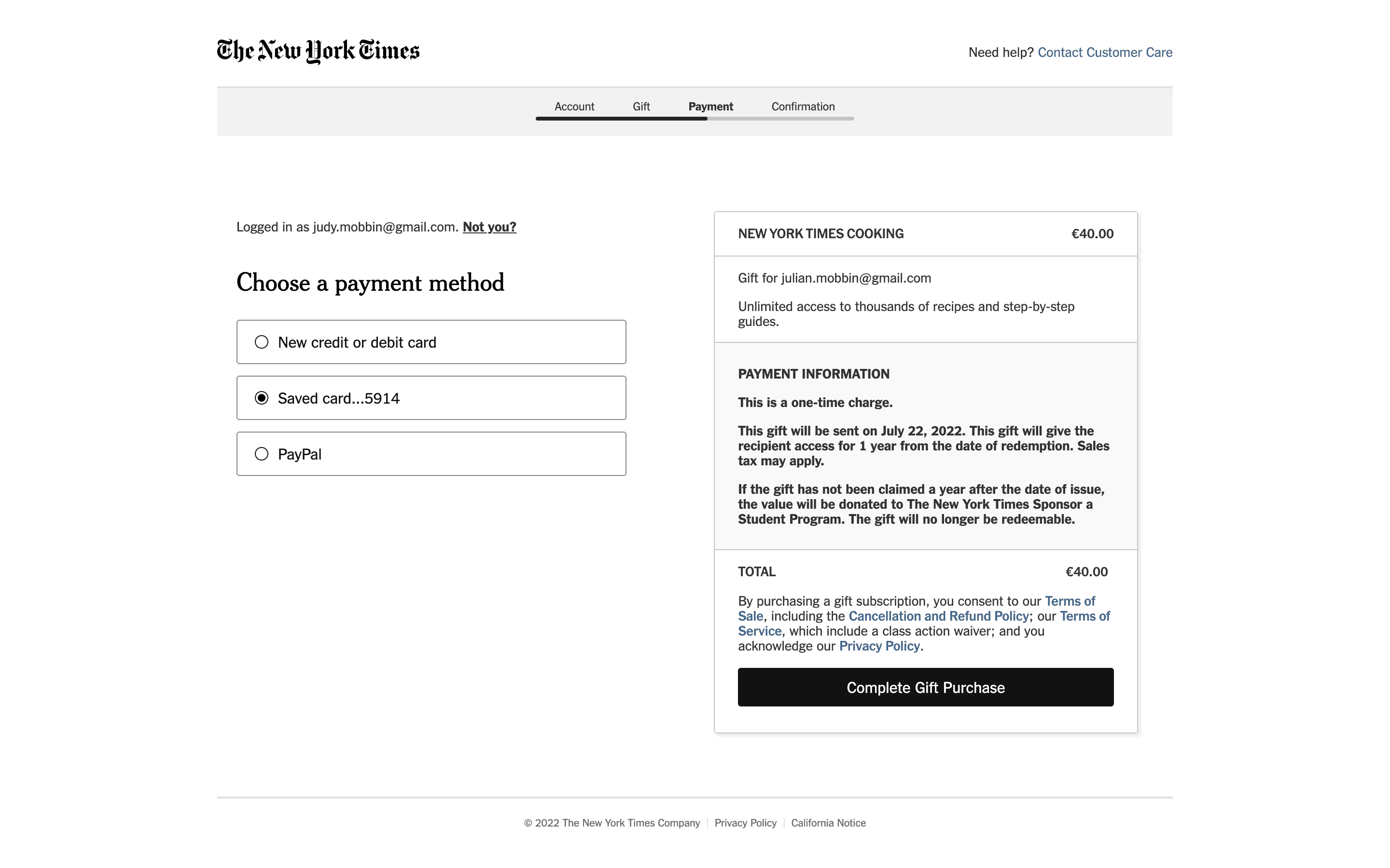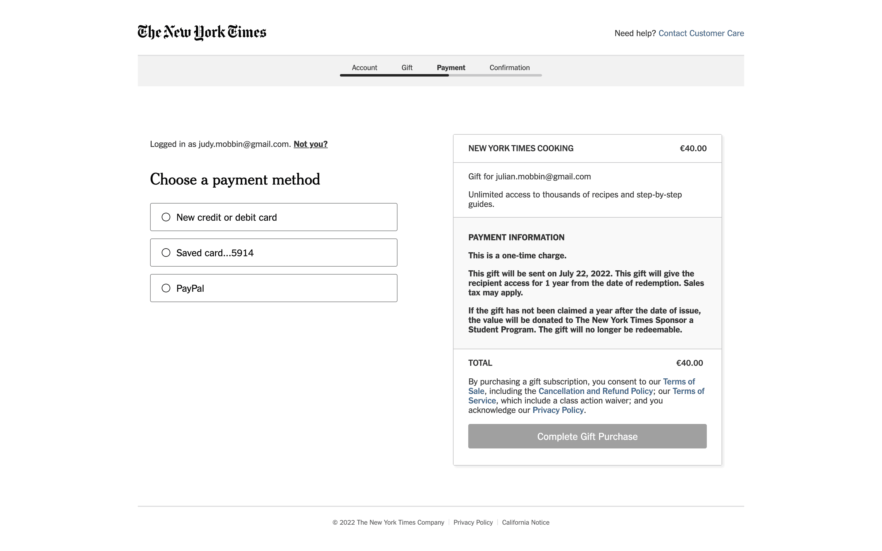 The user flow showcases gifting a New York Times Cooking subscription. It involves filling out gift details and selecting a payment method.