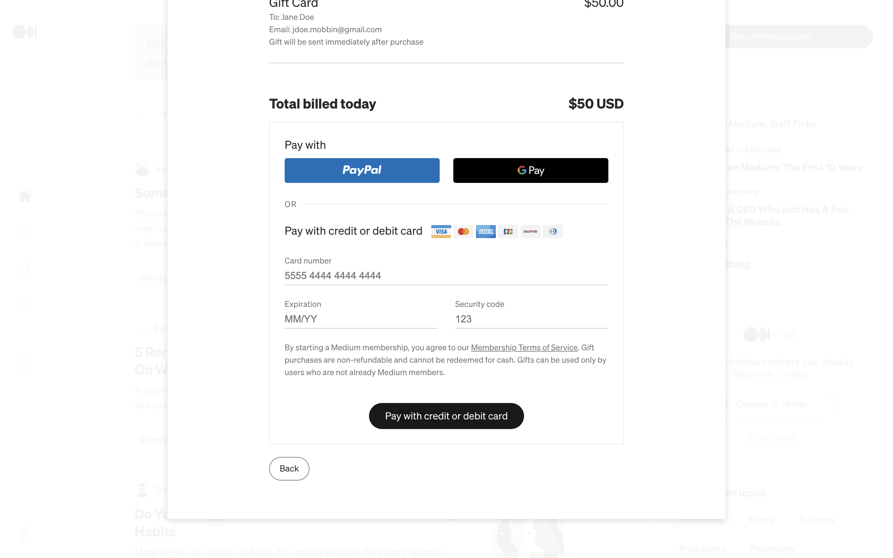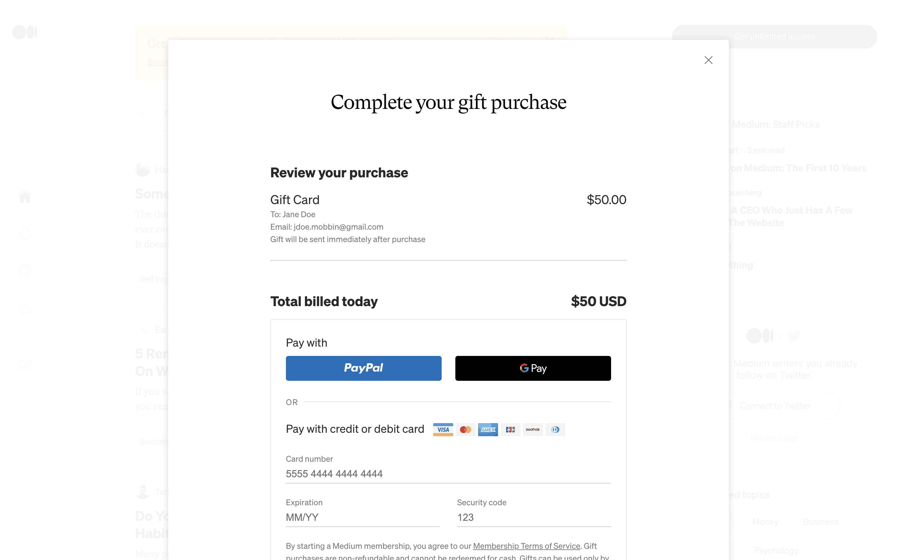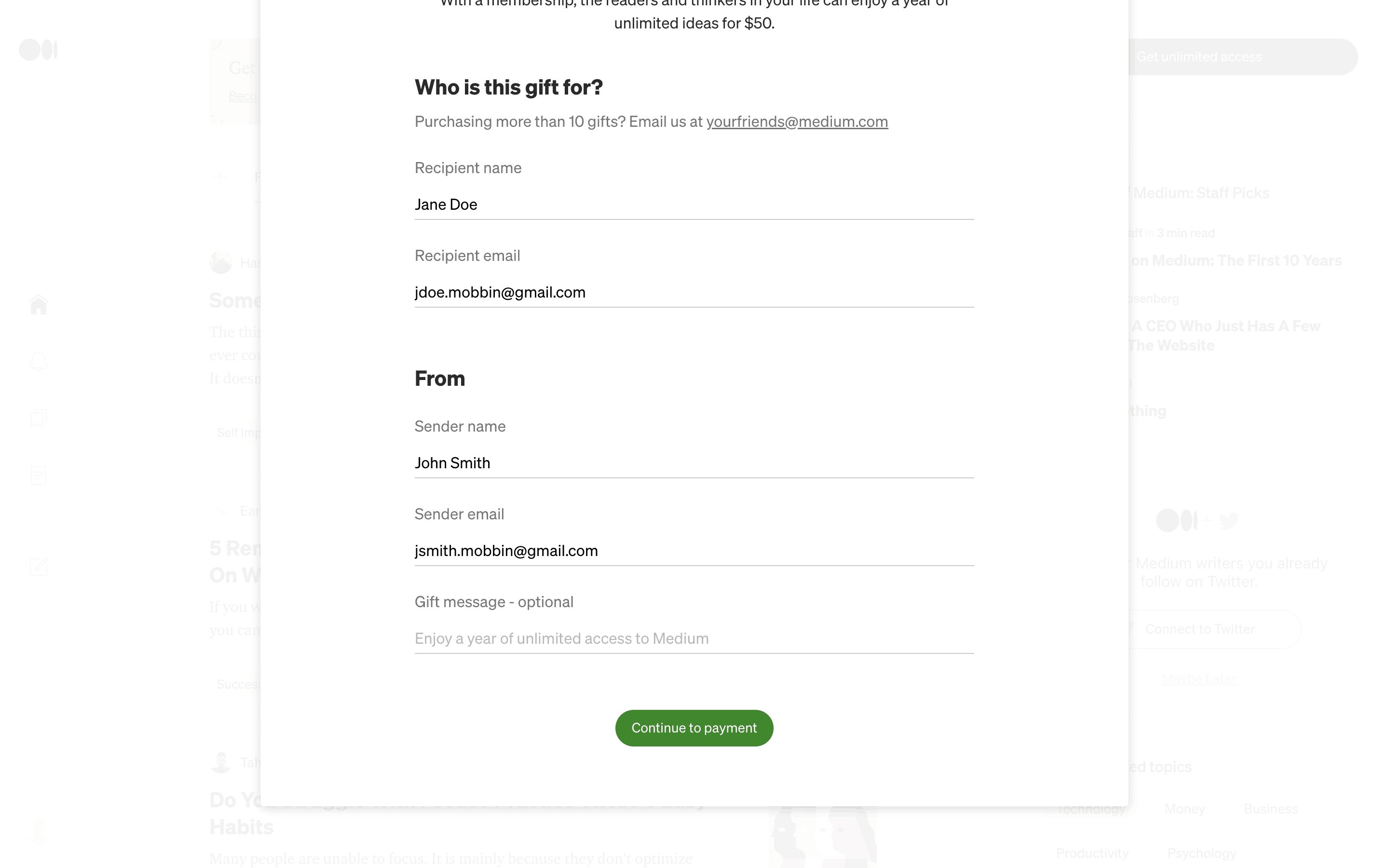 The user flow shows the process of gifting a Medium membership. It involves filling a form with recipient details and completing the purchase via a payment form.