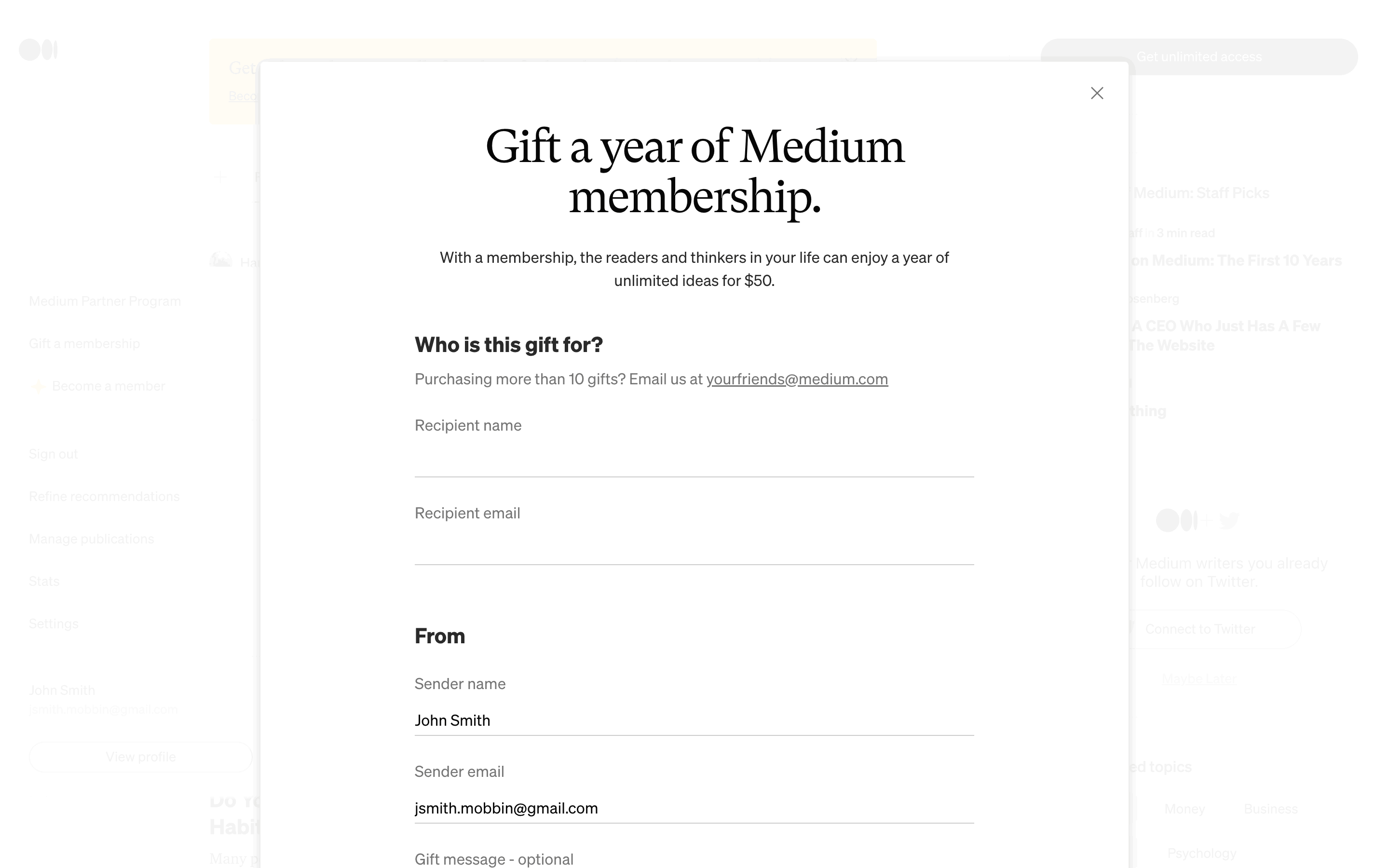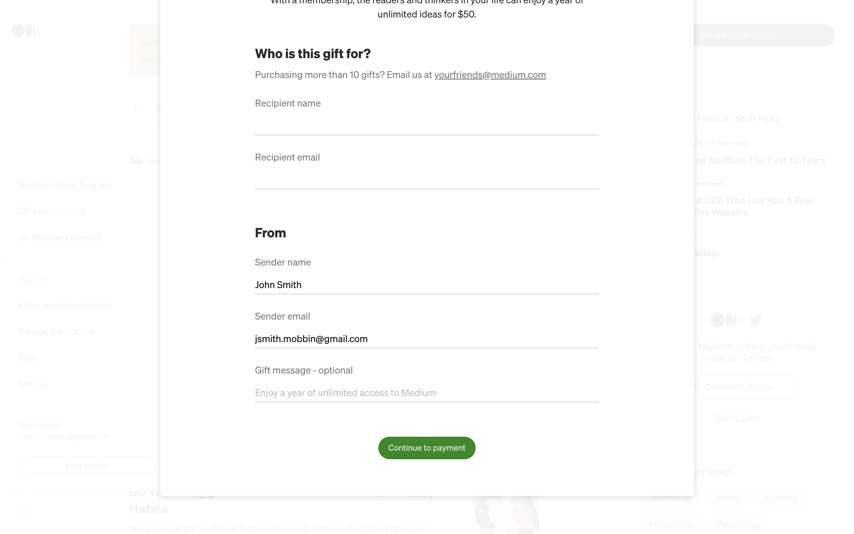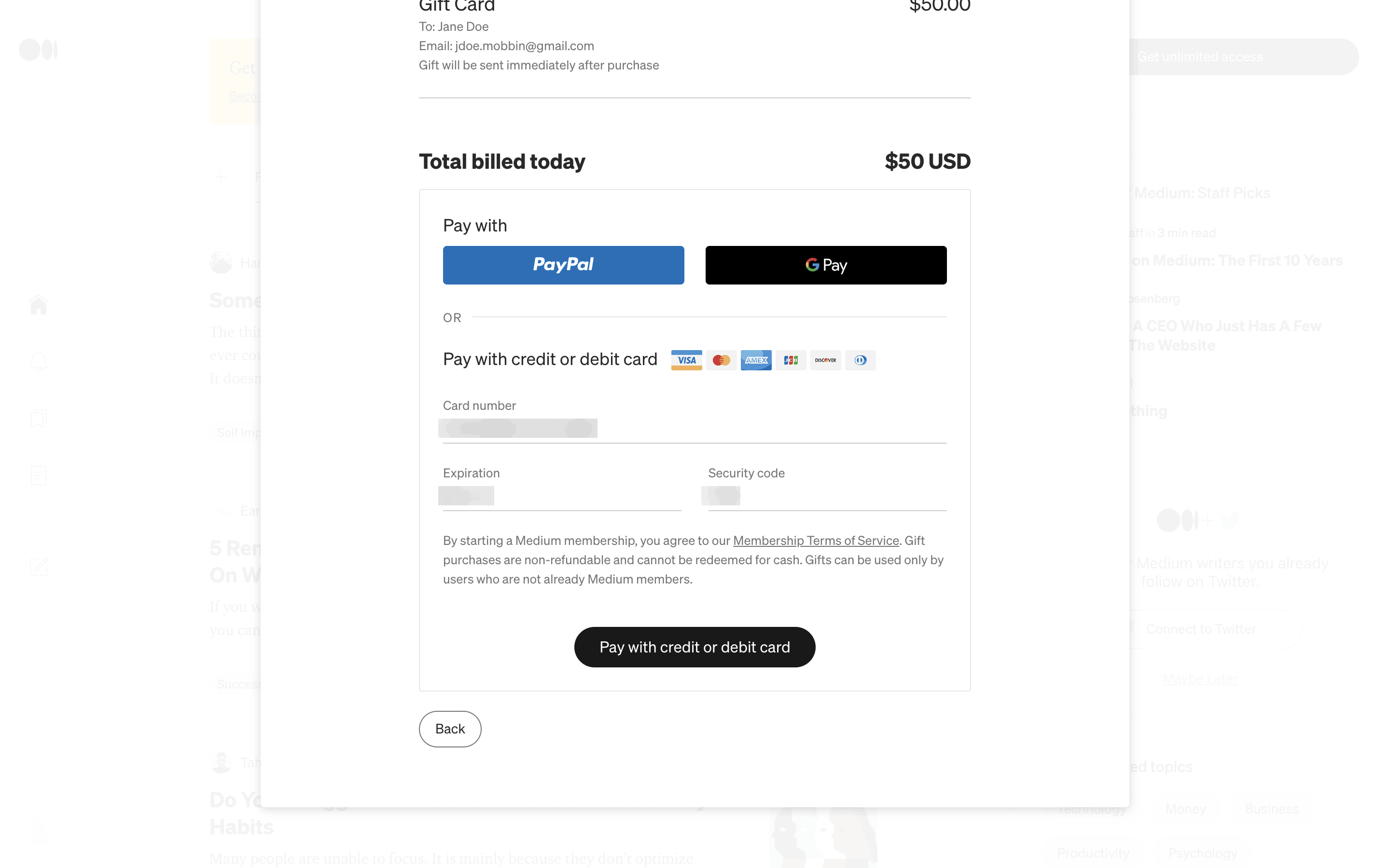 The user flow shows the process of gifting a Medium membership. It involves filling a form with recipient details and completing the purchase via a payment form.