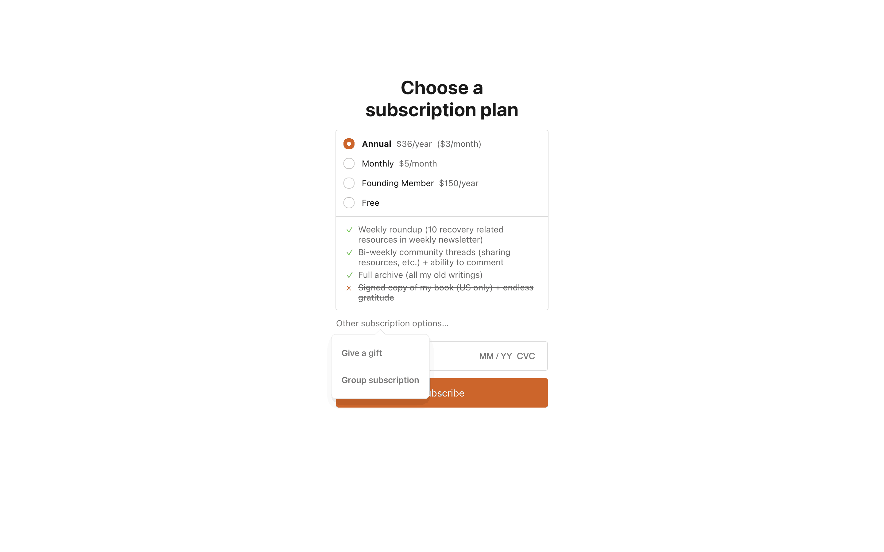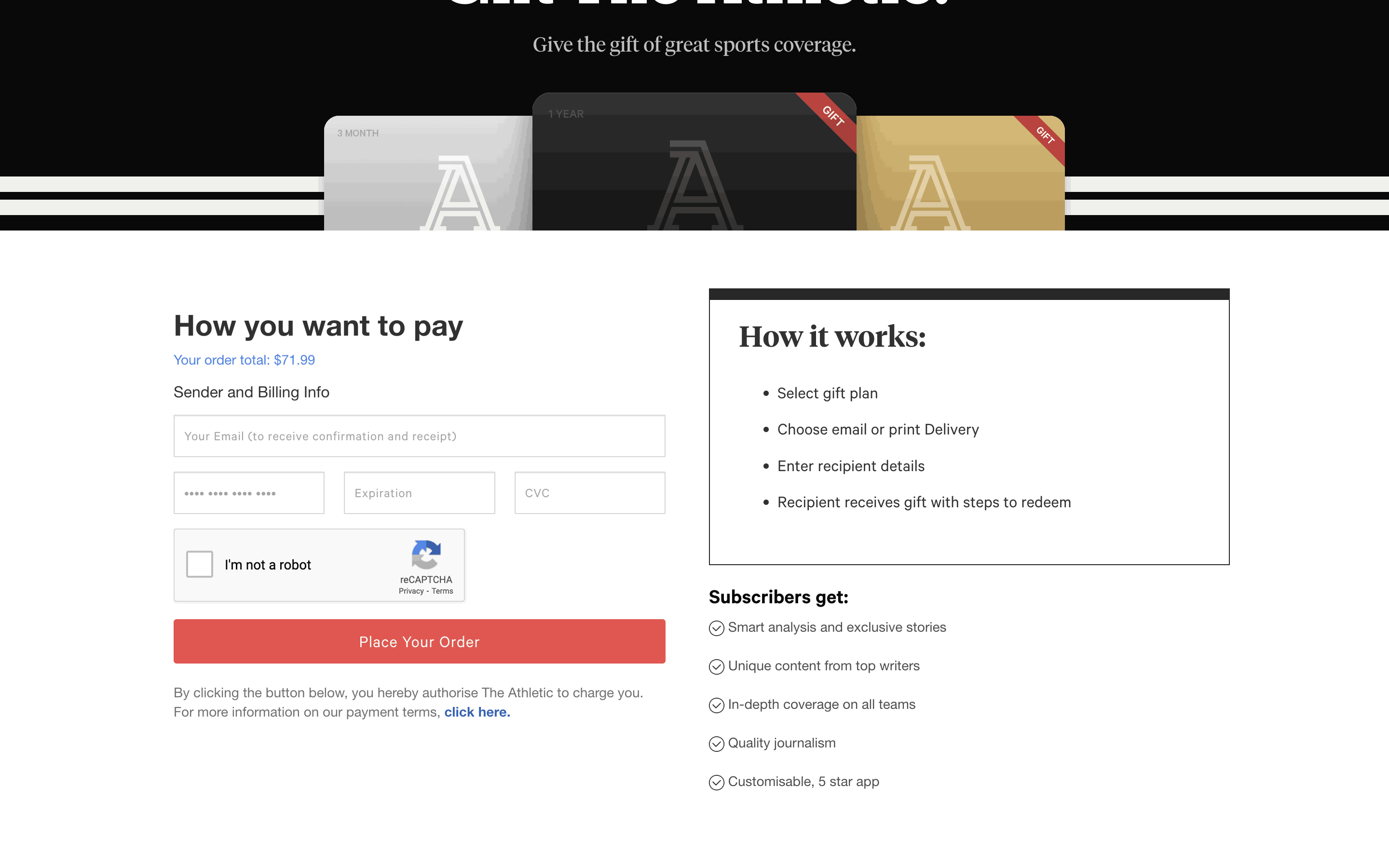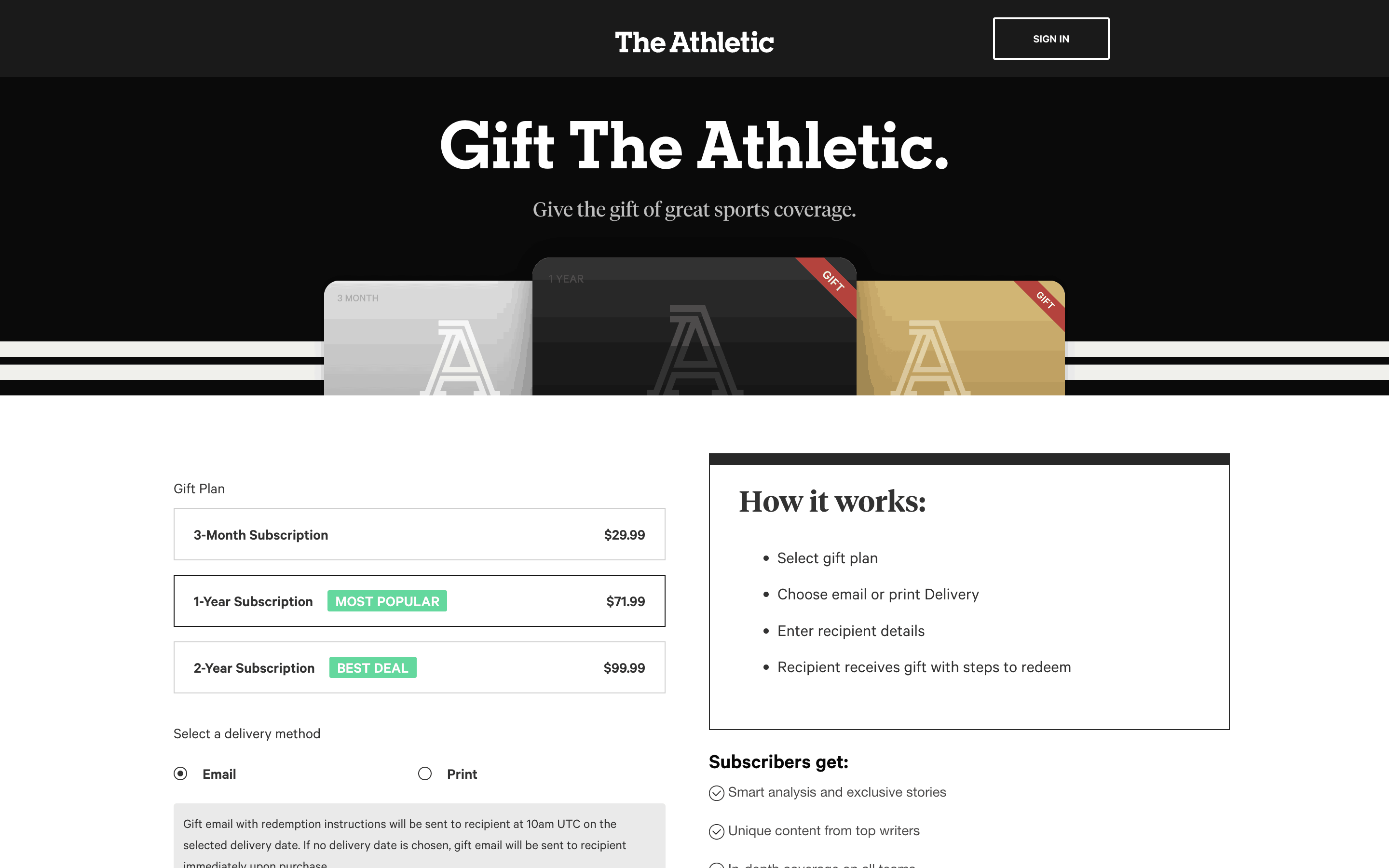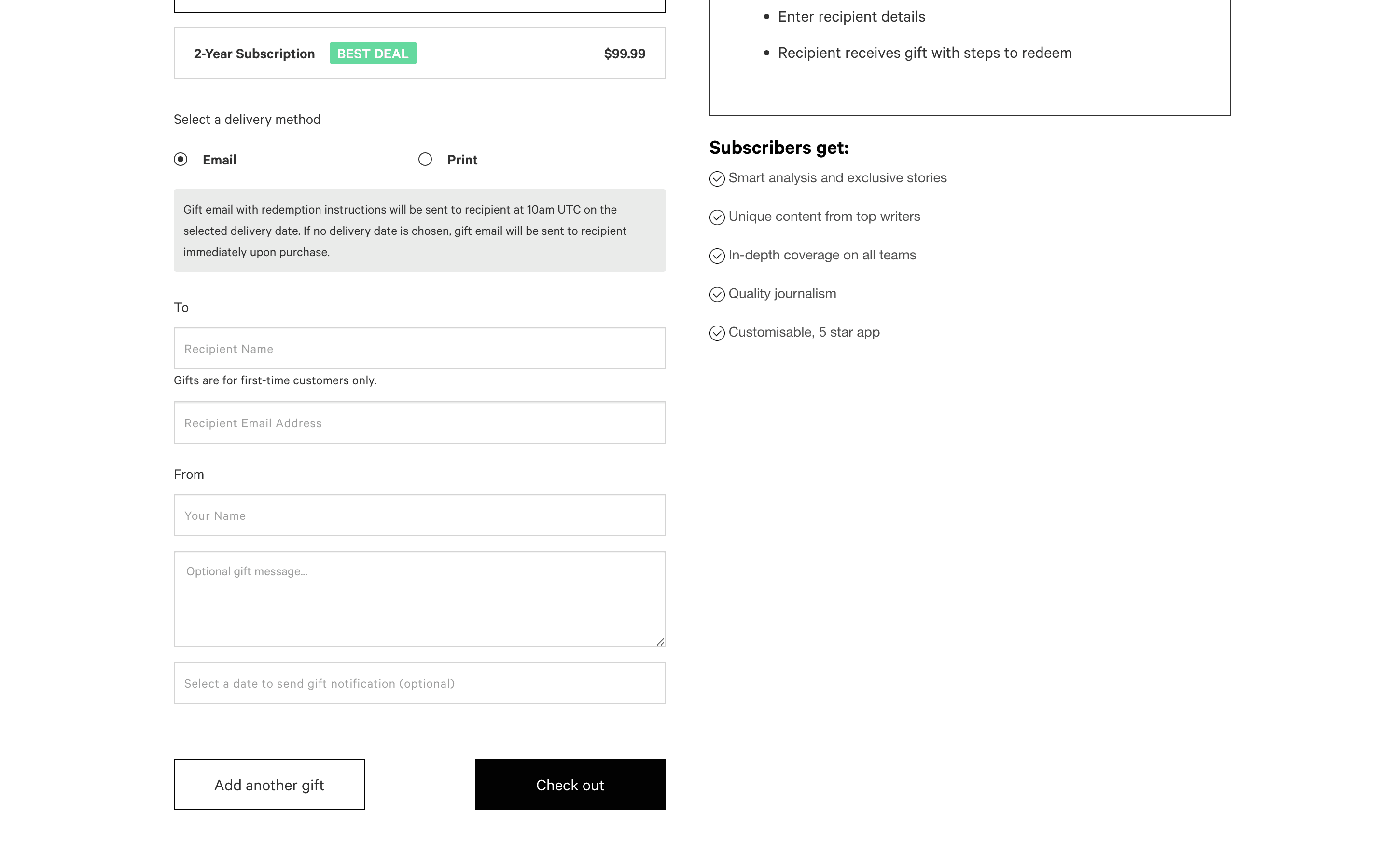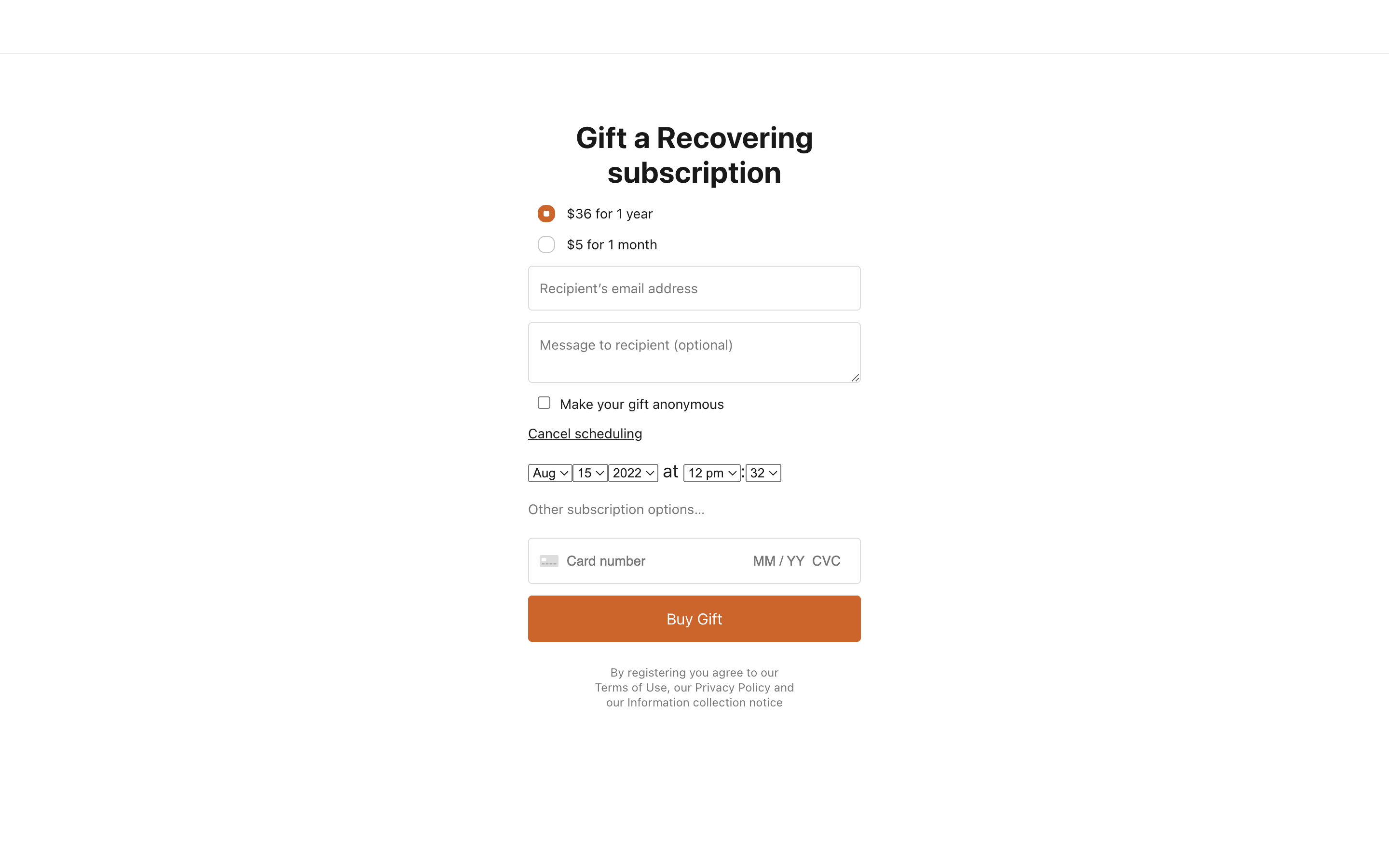 Users select a plan, choose to gift it, provide recipient details and payment, and optionally schedule delivery.
