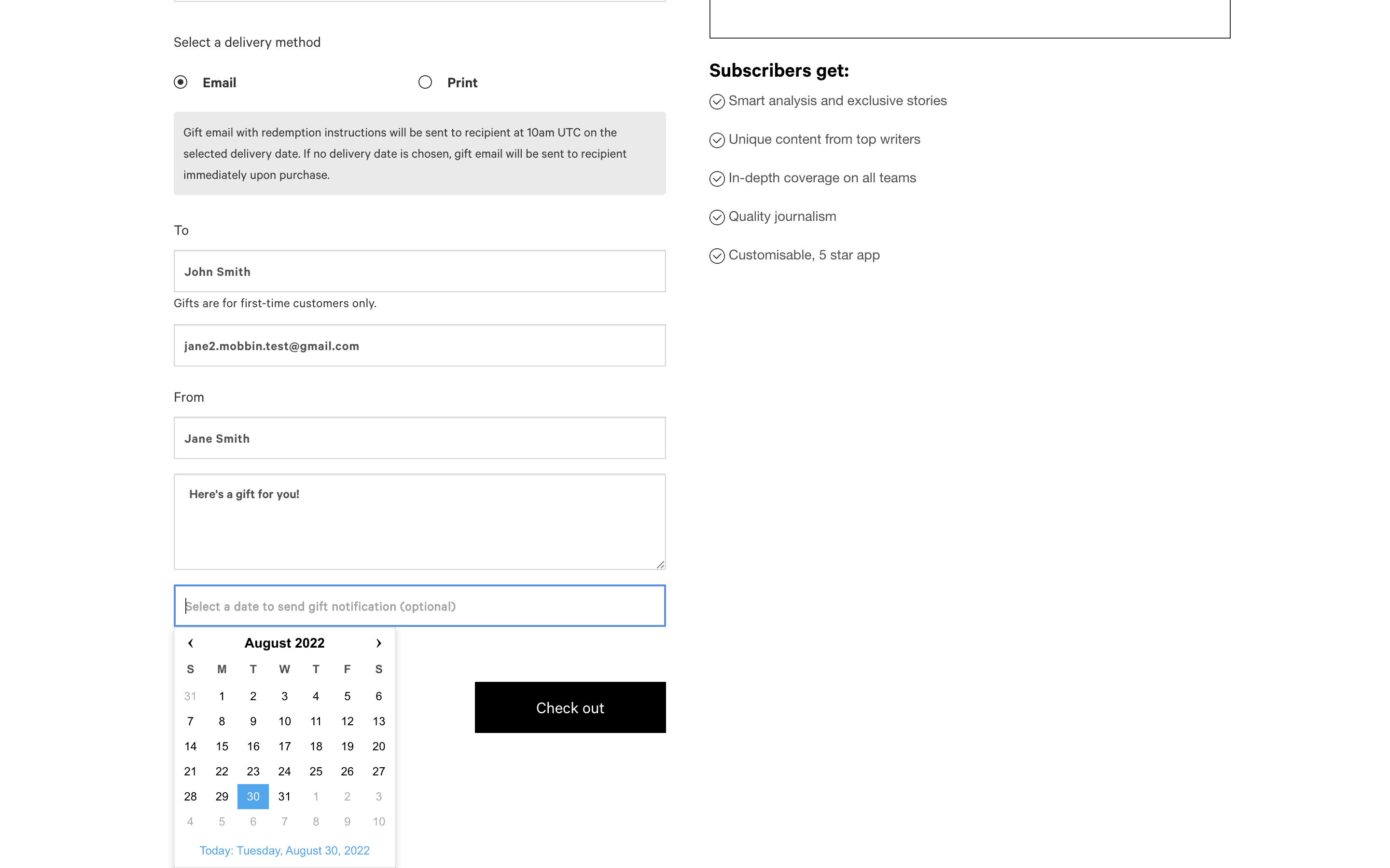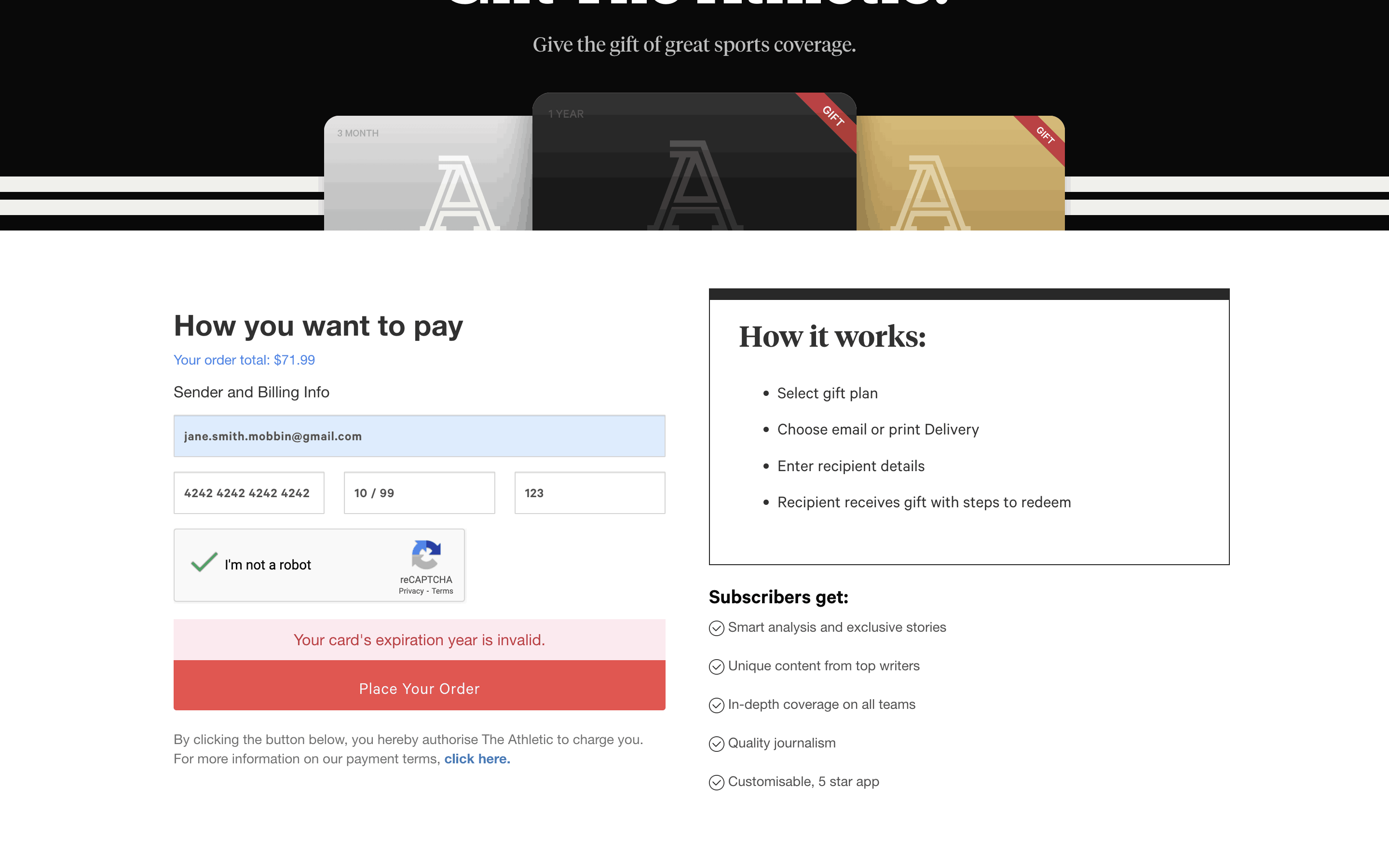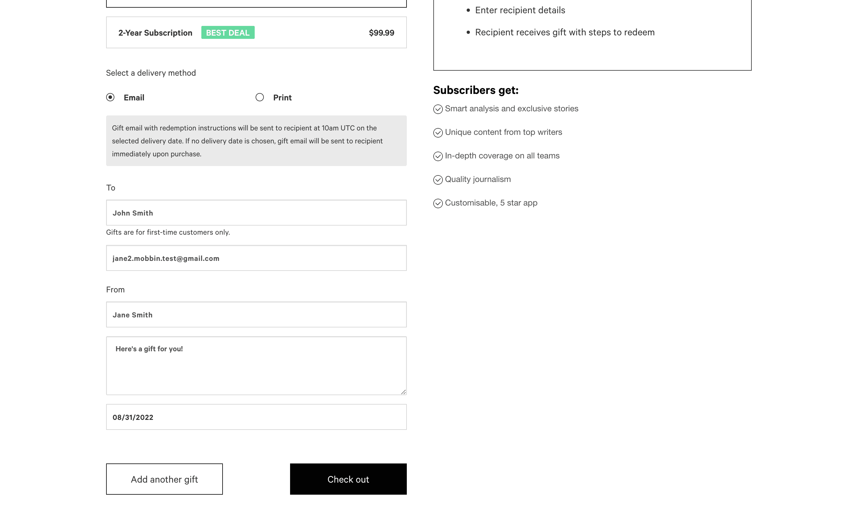 The user flow demonstrates purchasing a gift subscription, including filling out recipient details, selecting a notification date and entering payment information. The flow ends with an error on the payment form.