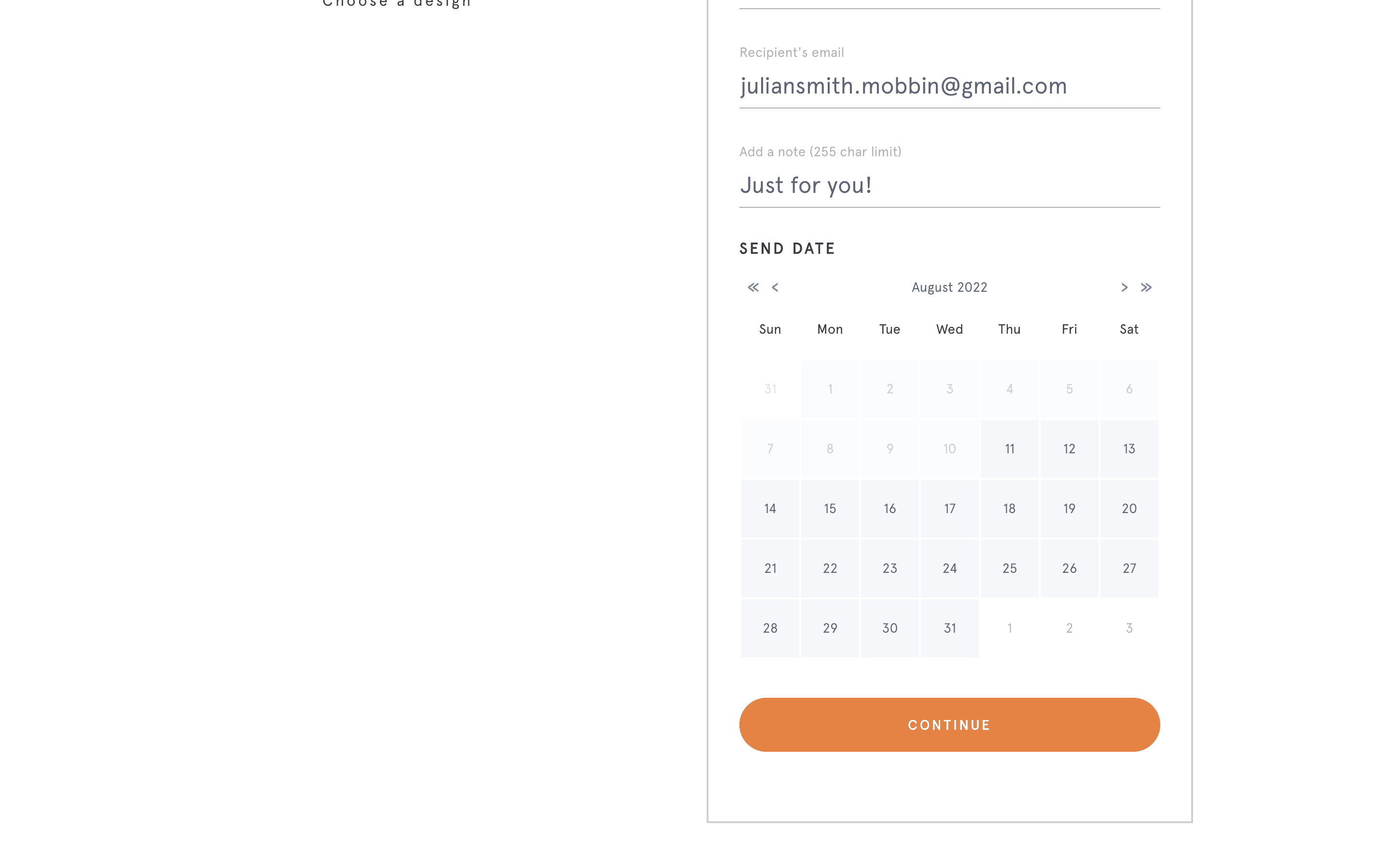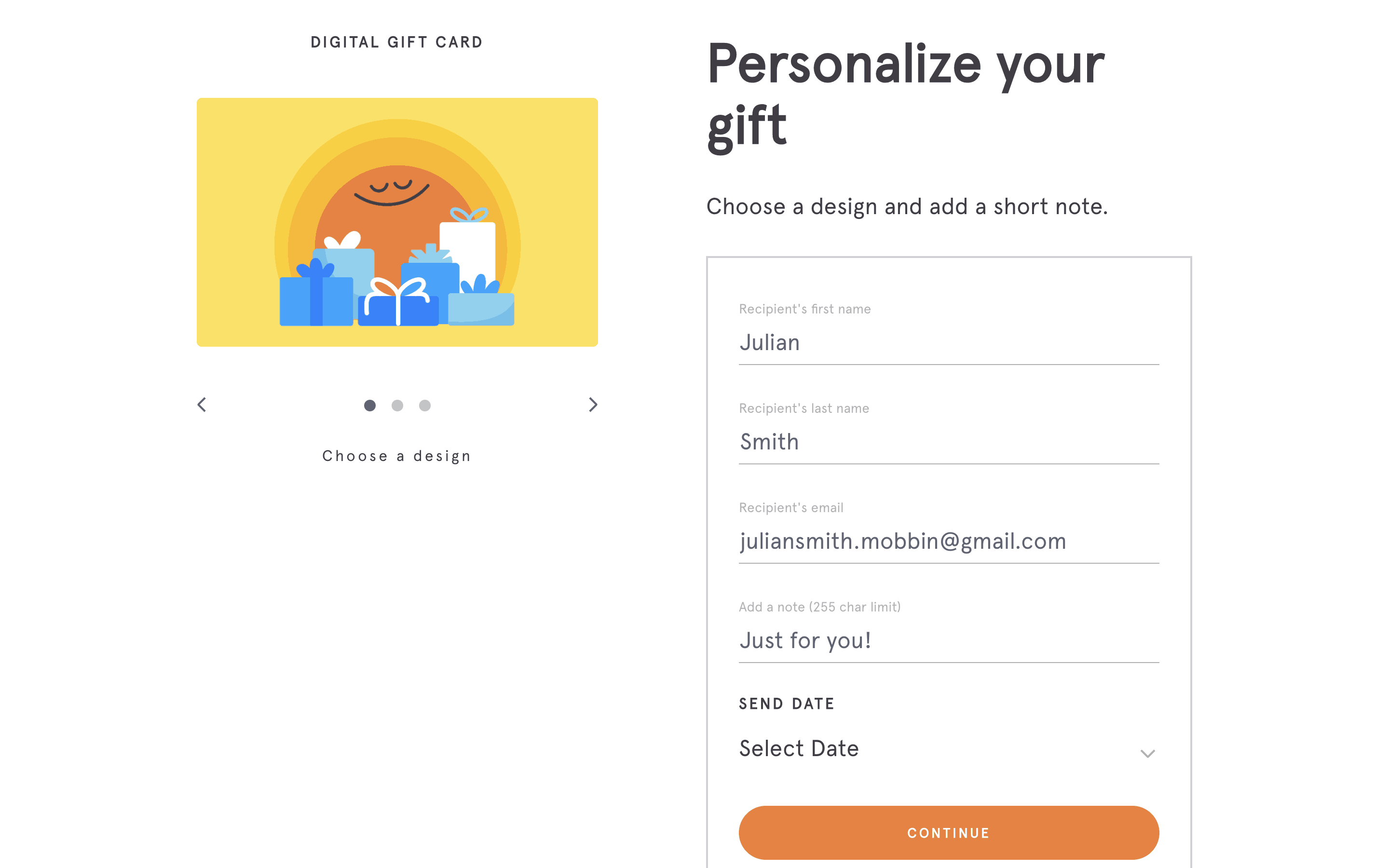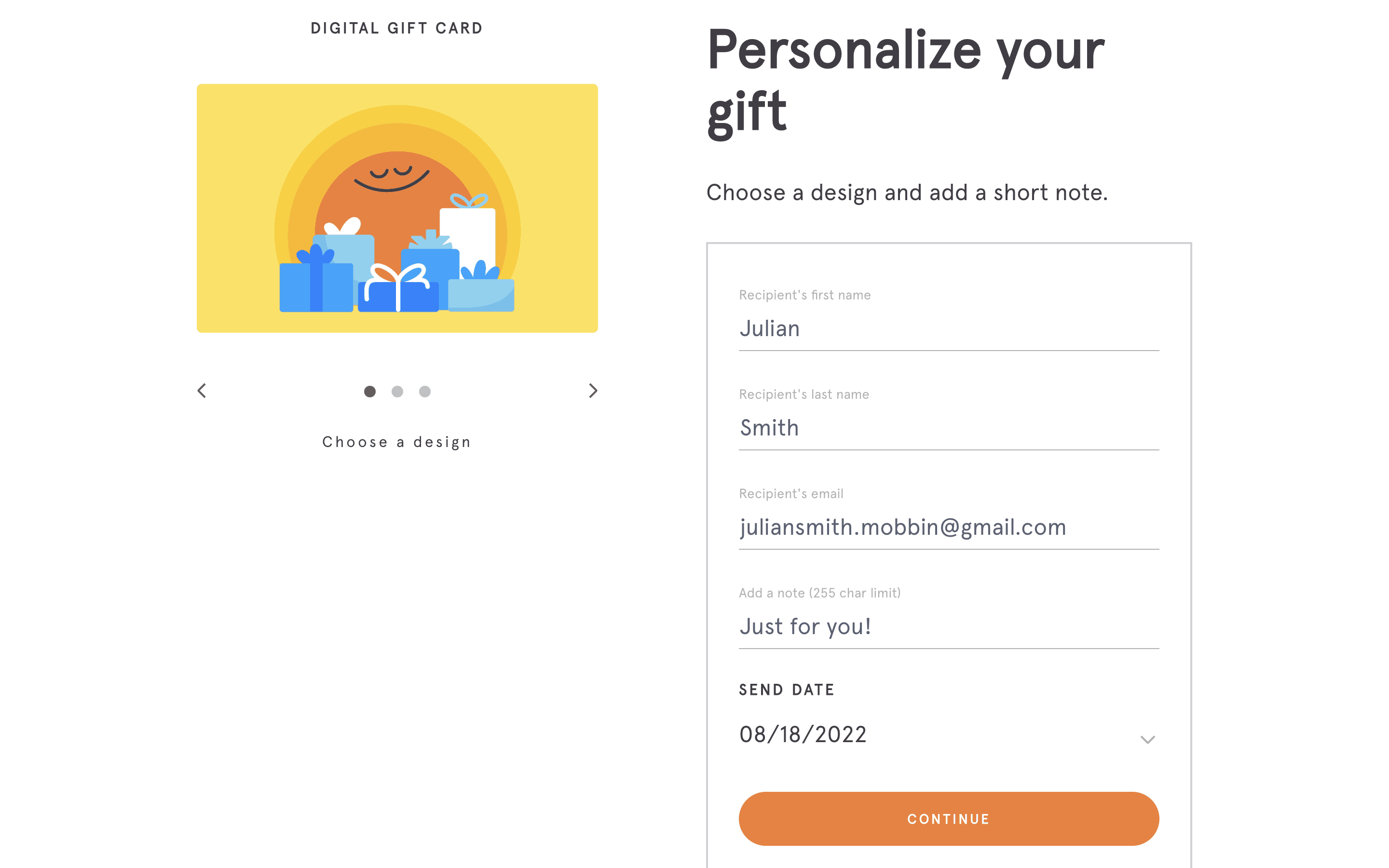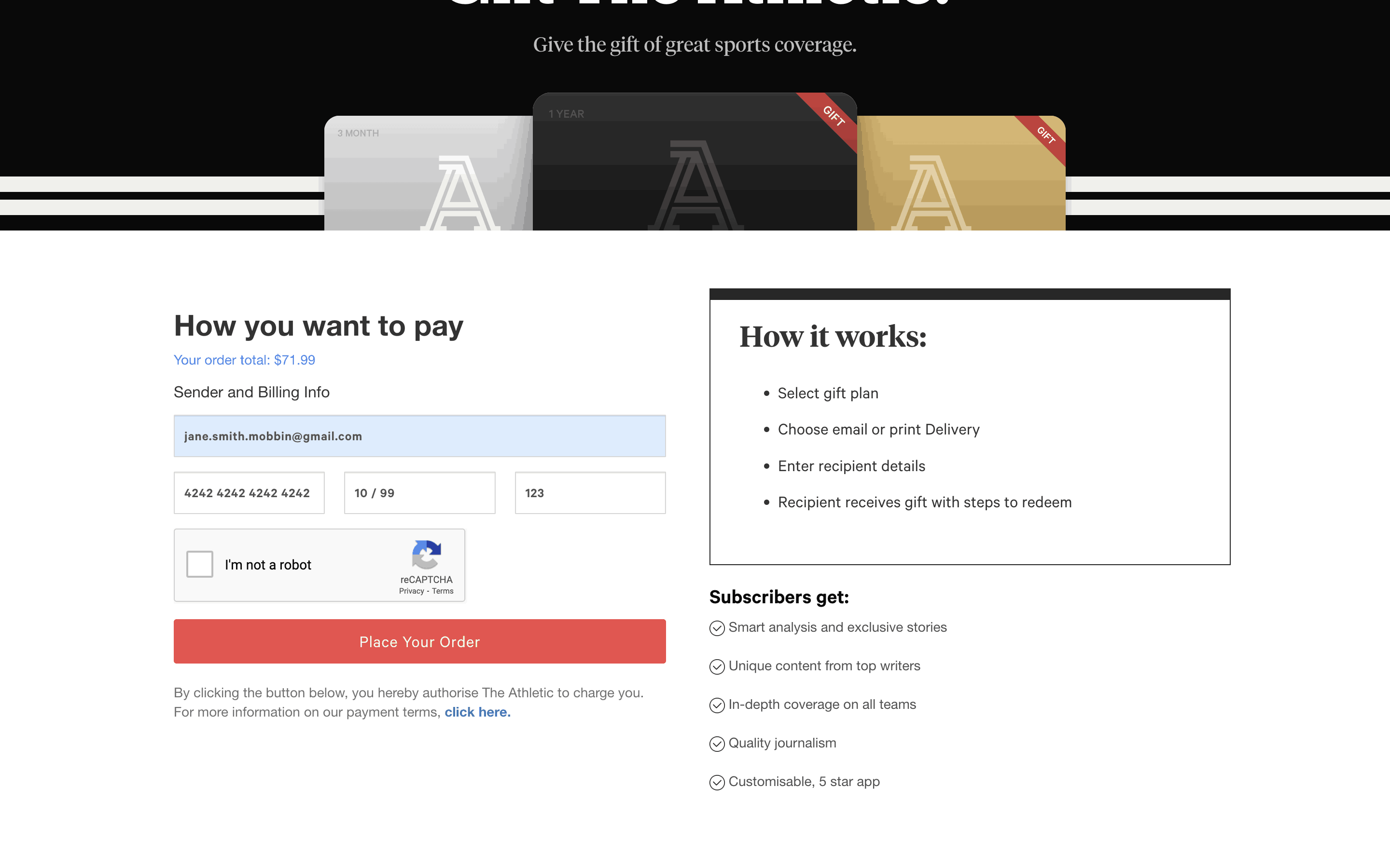 The user flow demonstrates purchasing a gift subscription, including filling out recipient details, selecting a notification date and entering payment information. The flow ends with an error on the payment form.