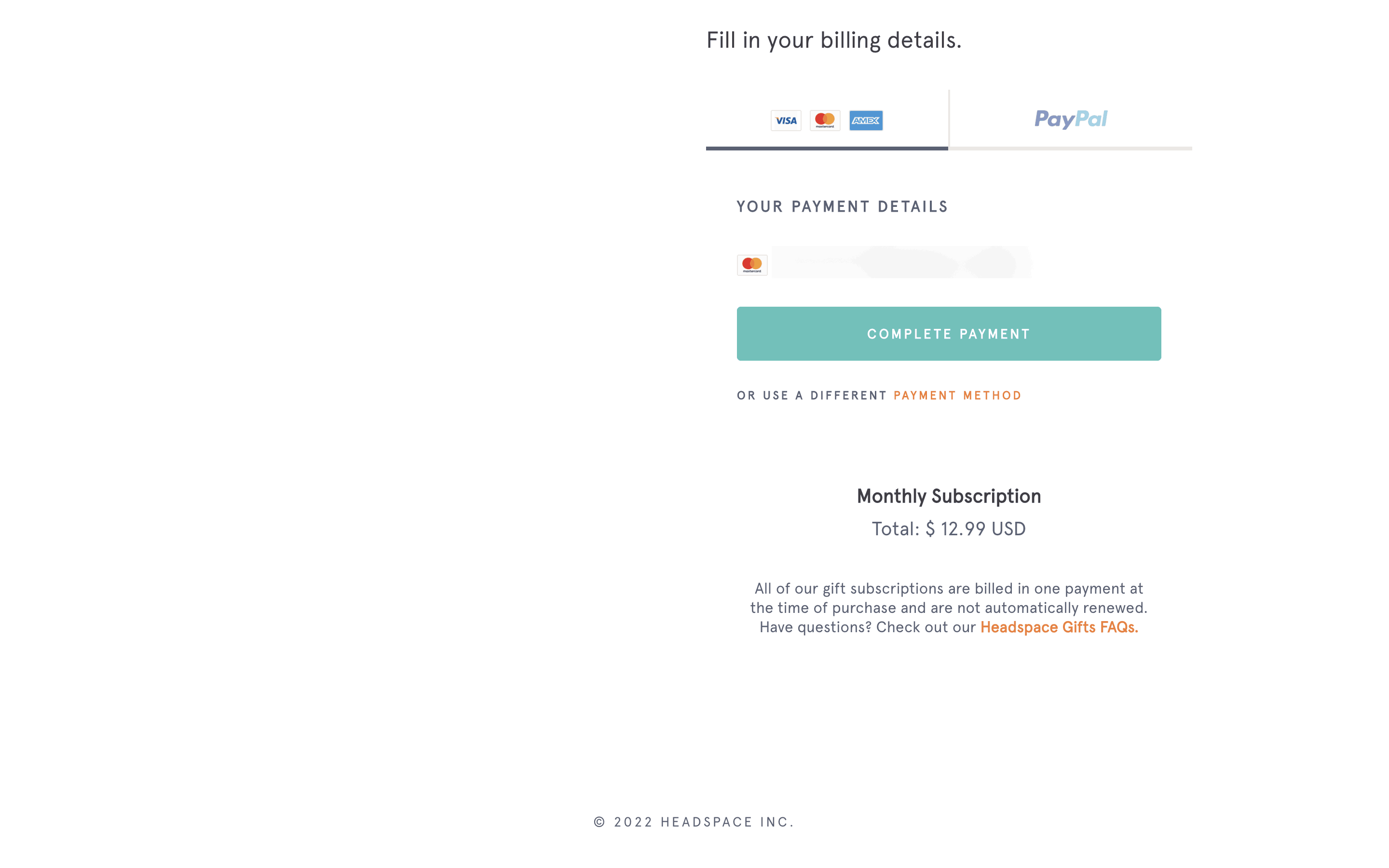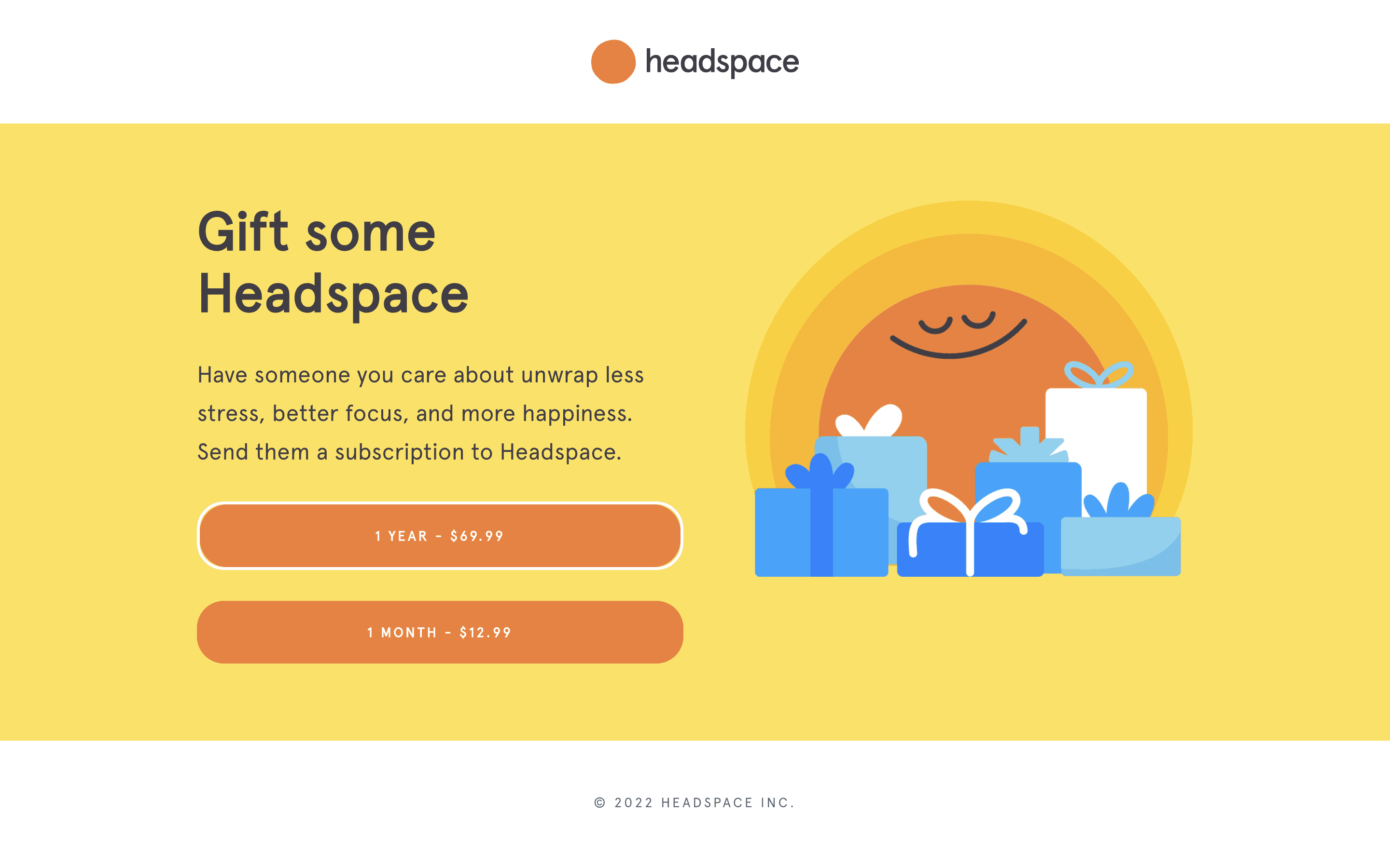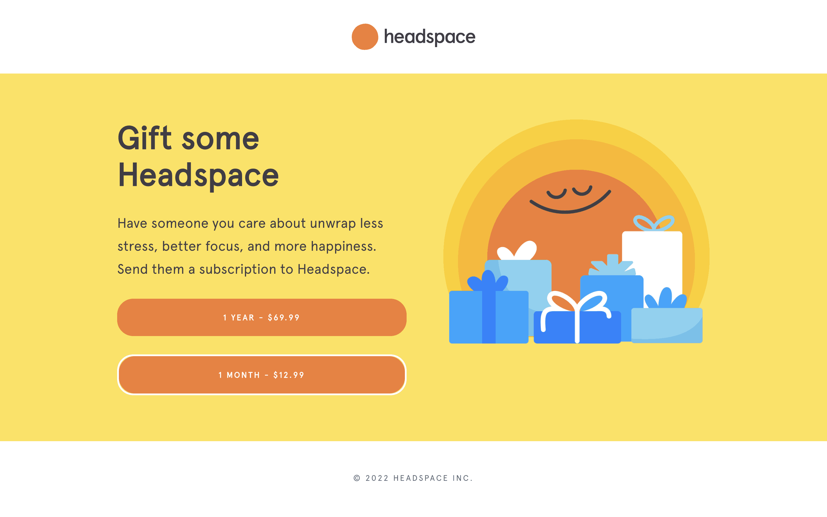 The user flow demonstrates sending a Headspace gift subscription. It involves selecting a gift, personalizing it, and completing the purchase with payment details.
