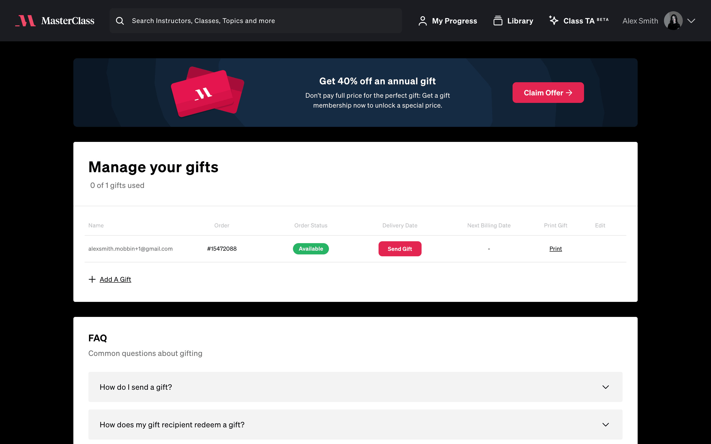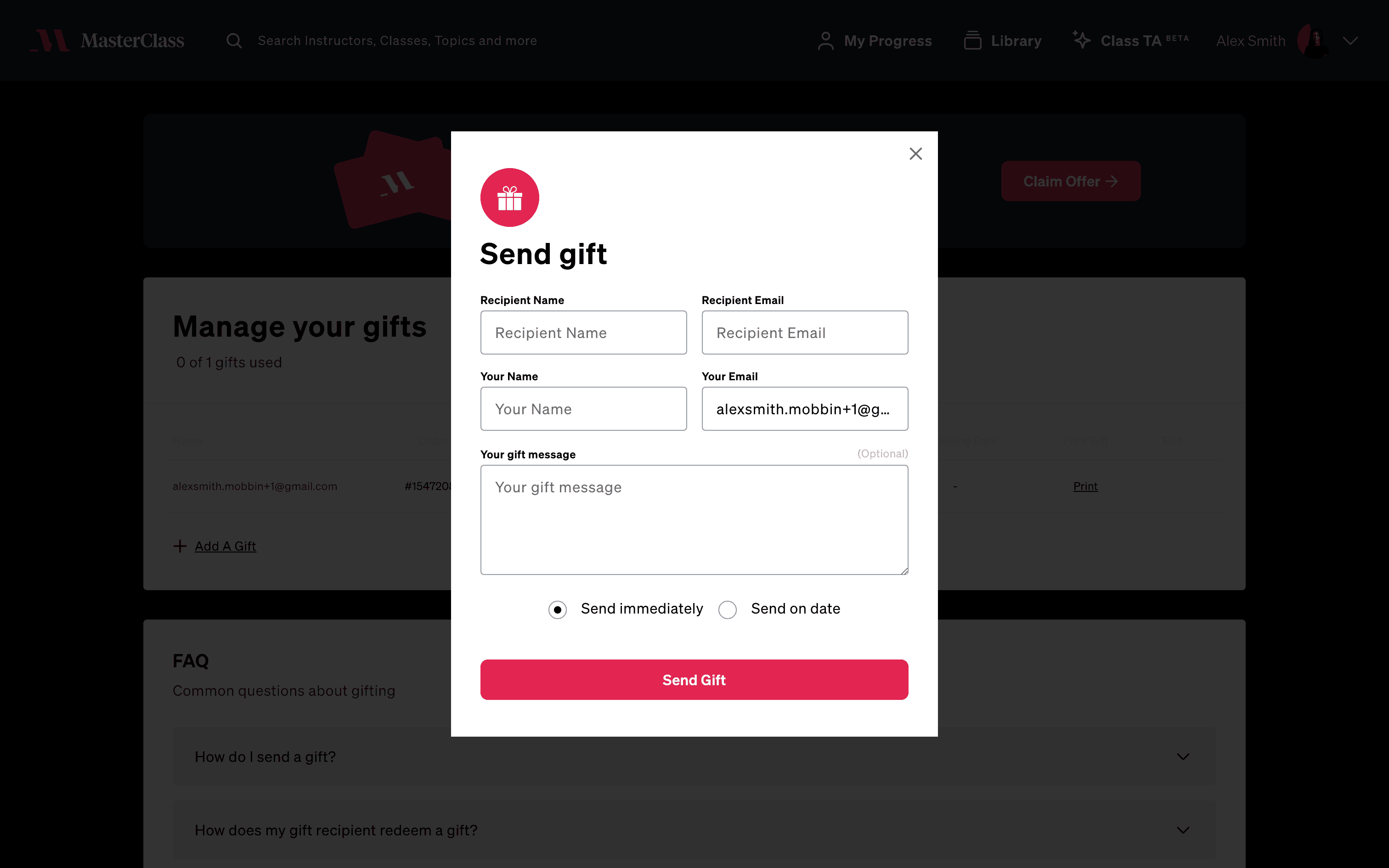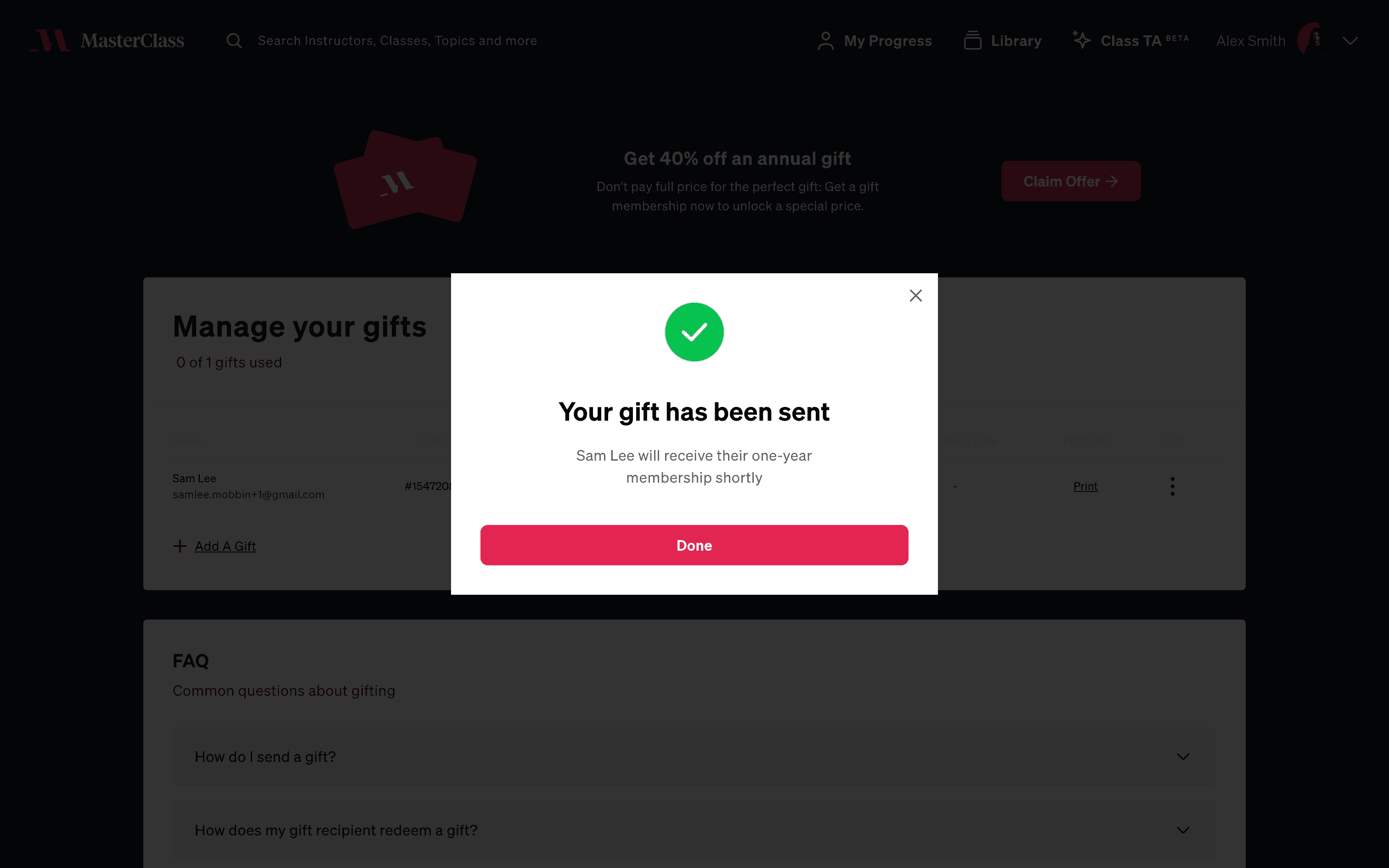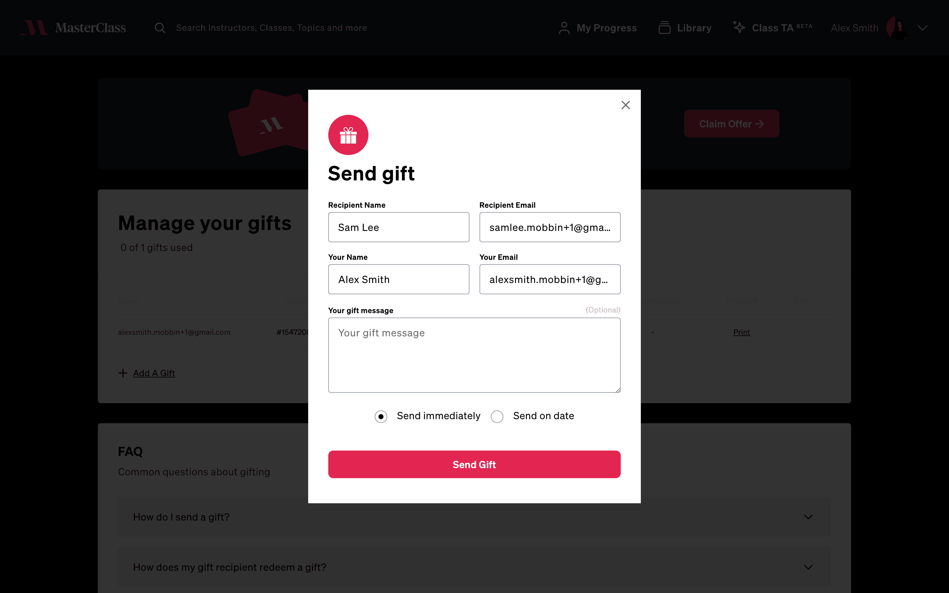 The user flow demonstrates sending a gift through Masterclass. It involves navigating to the gift management section, filling out recipient details, and confirming the gift delivery.