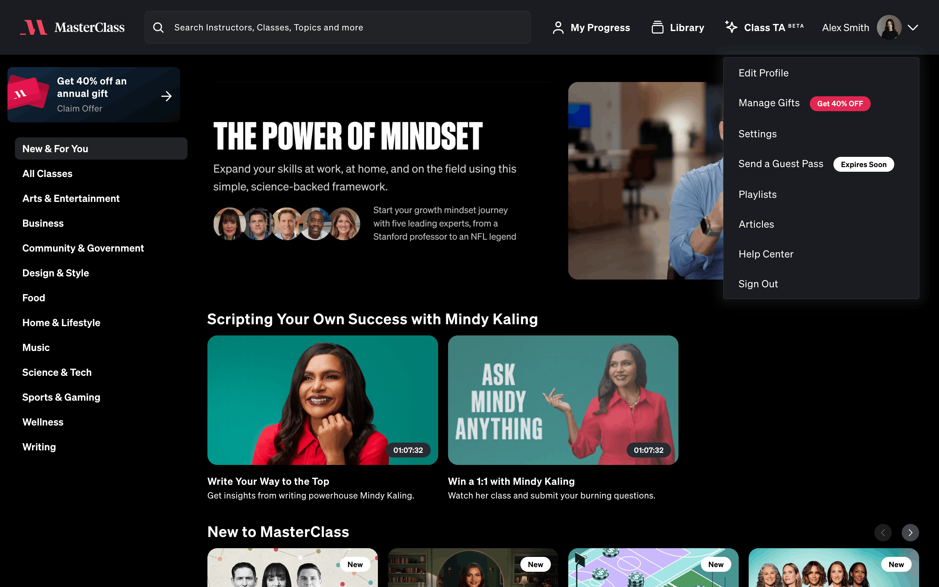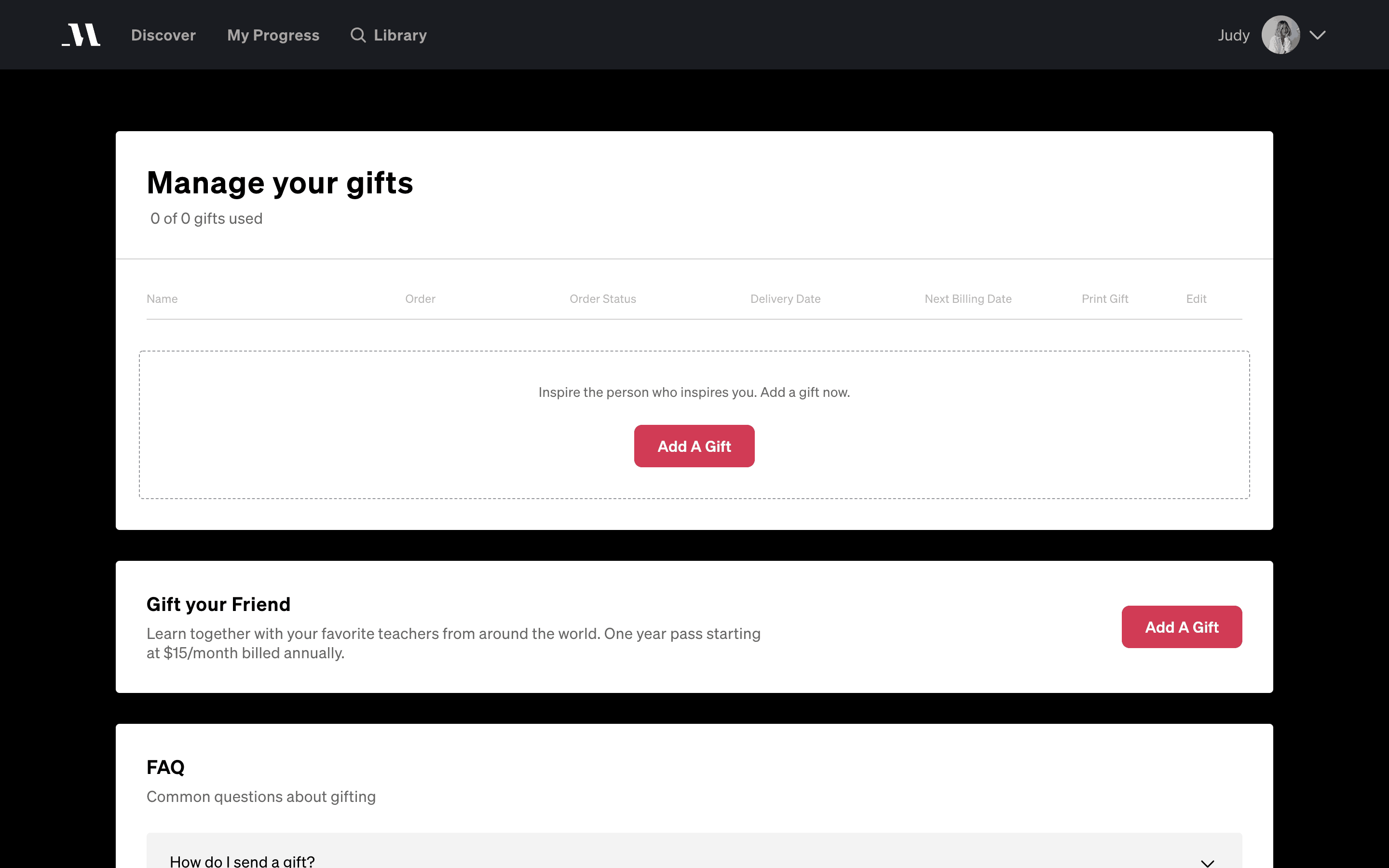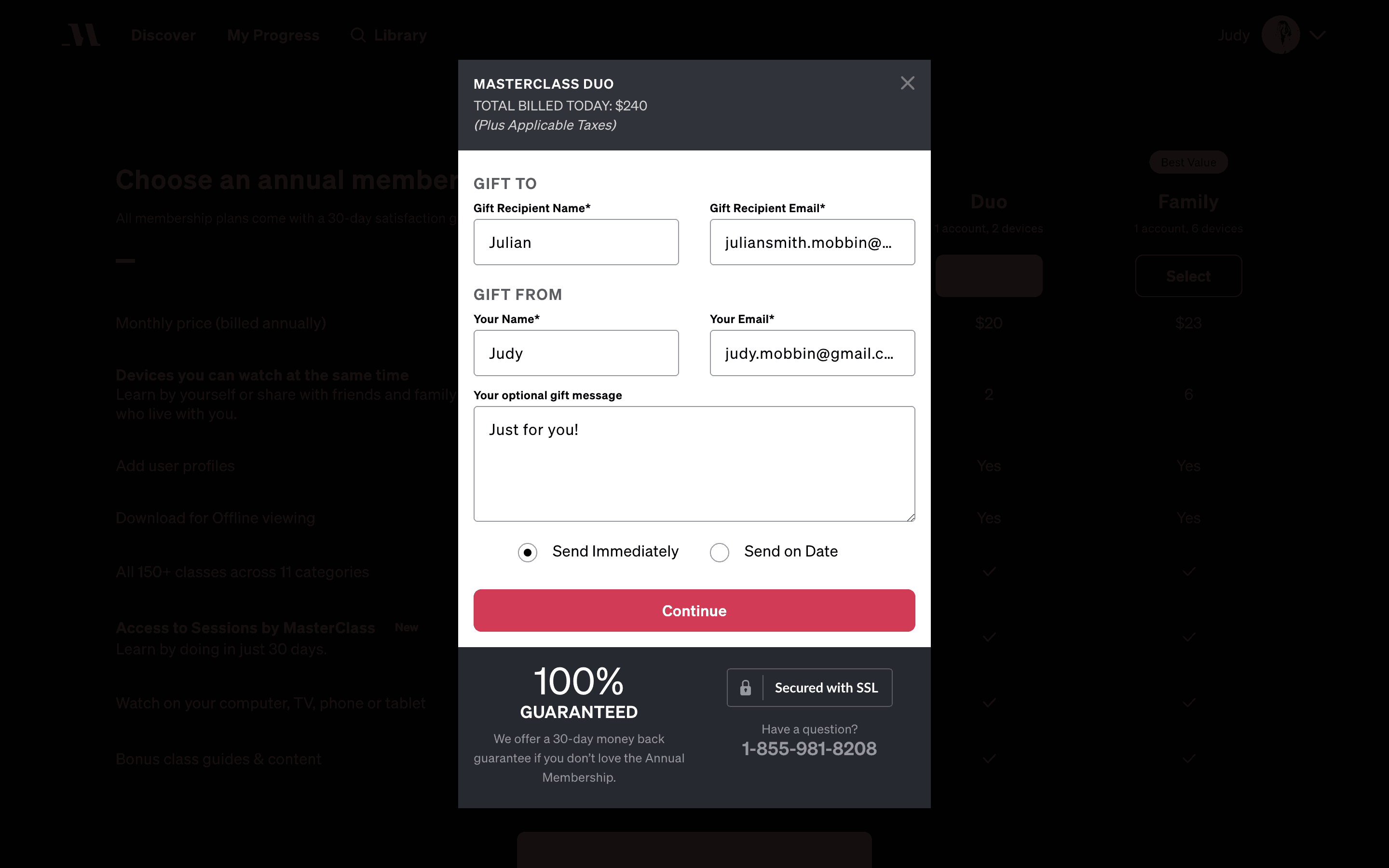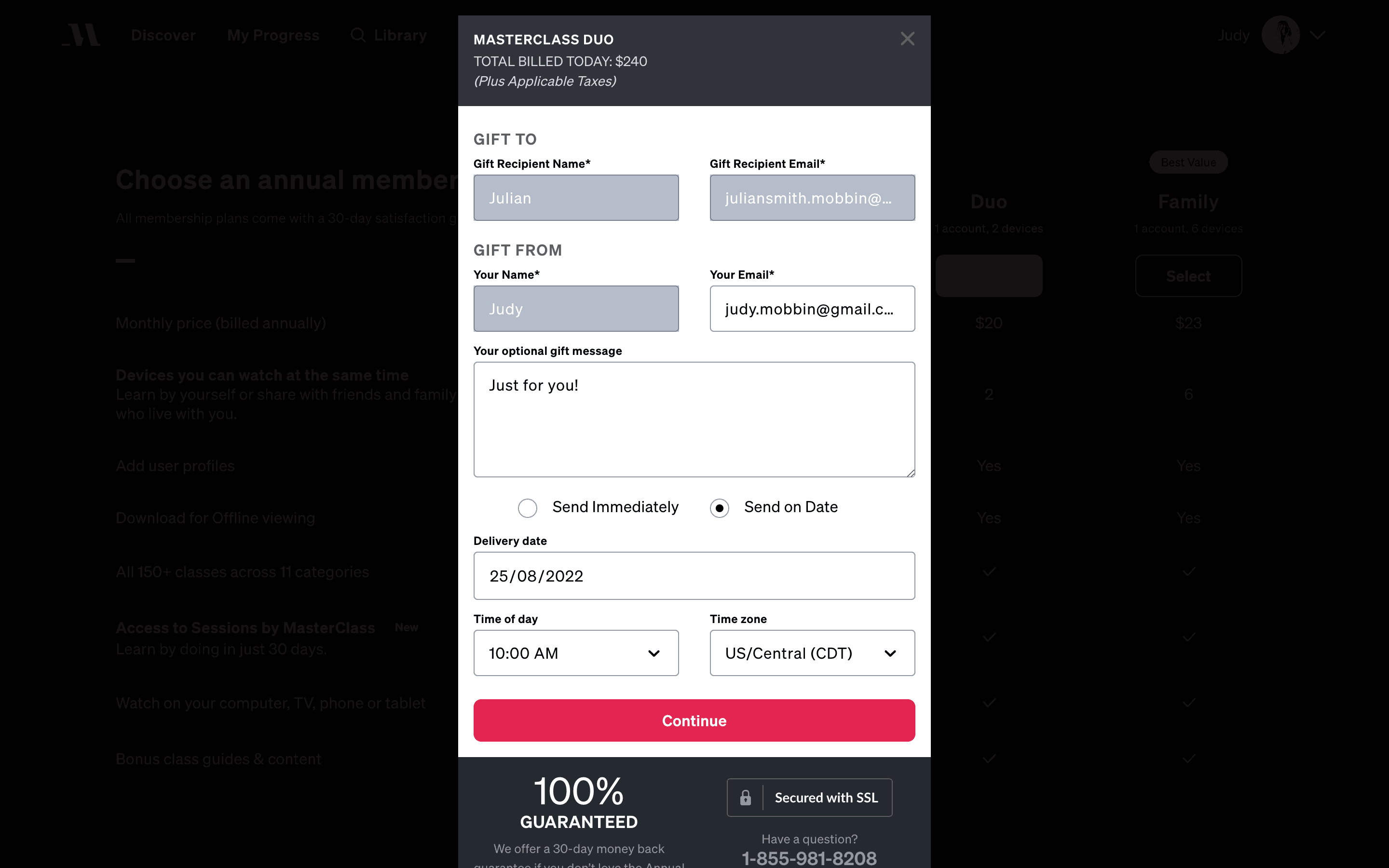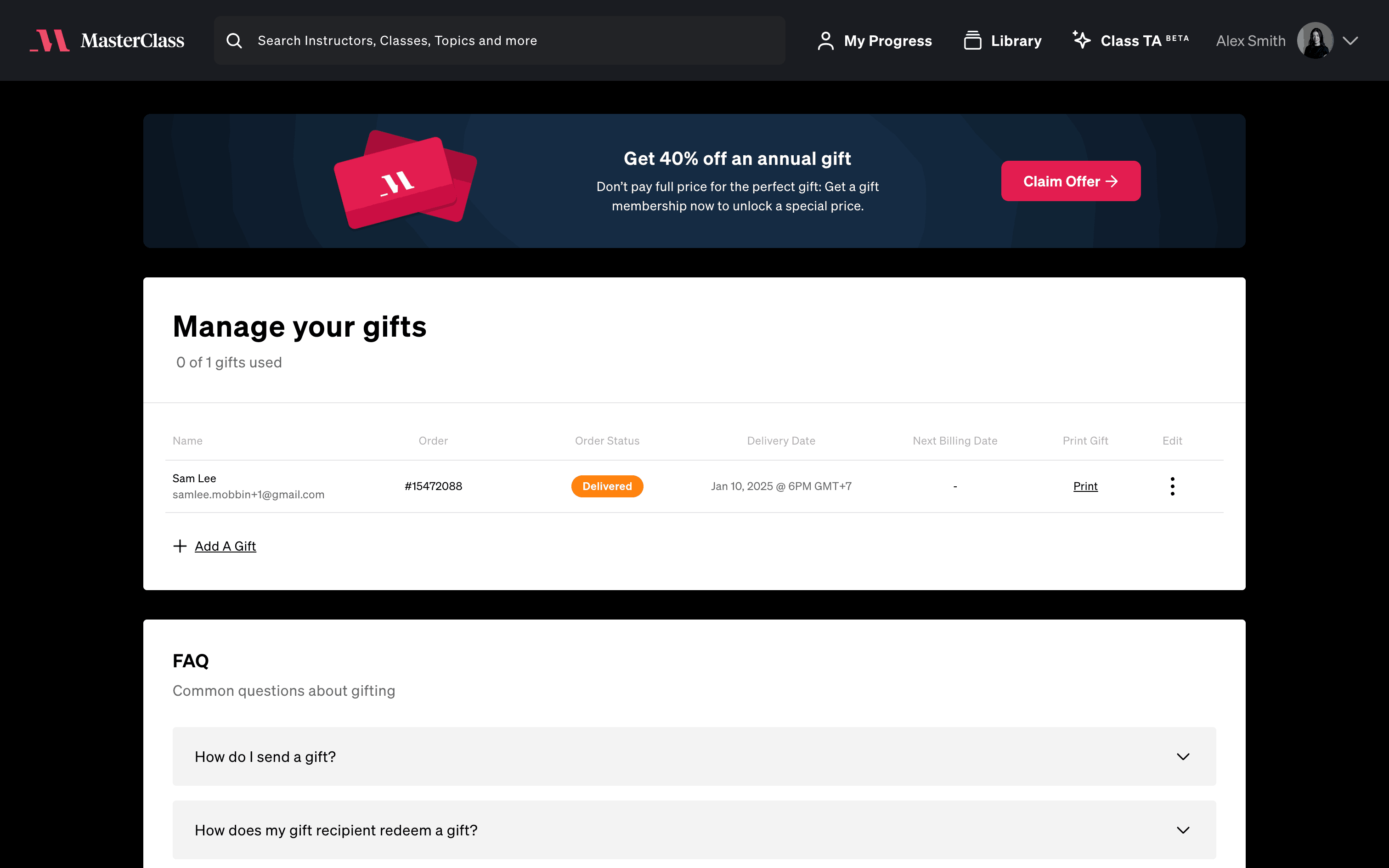 The user flow demonstrates sending a gift through Masterclass. It involves navigating to the gift management section, filling out recipient details, and confirming the gift delivery.
