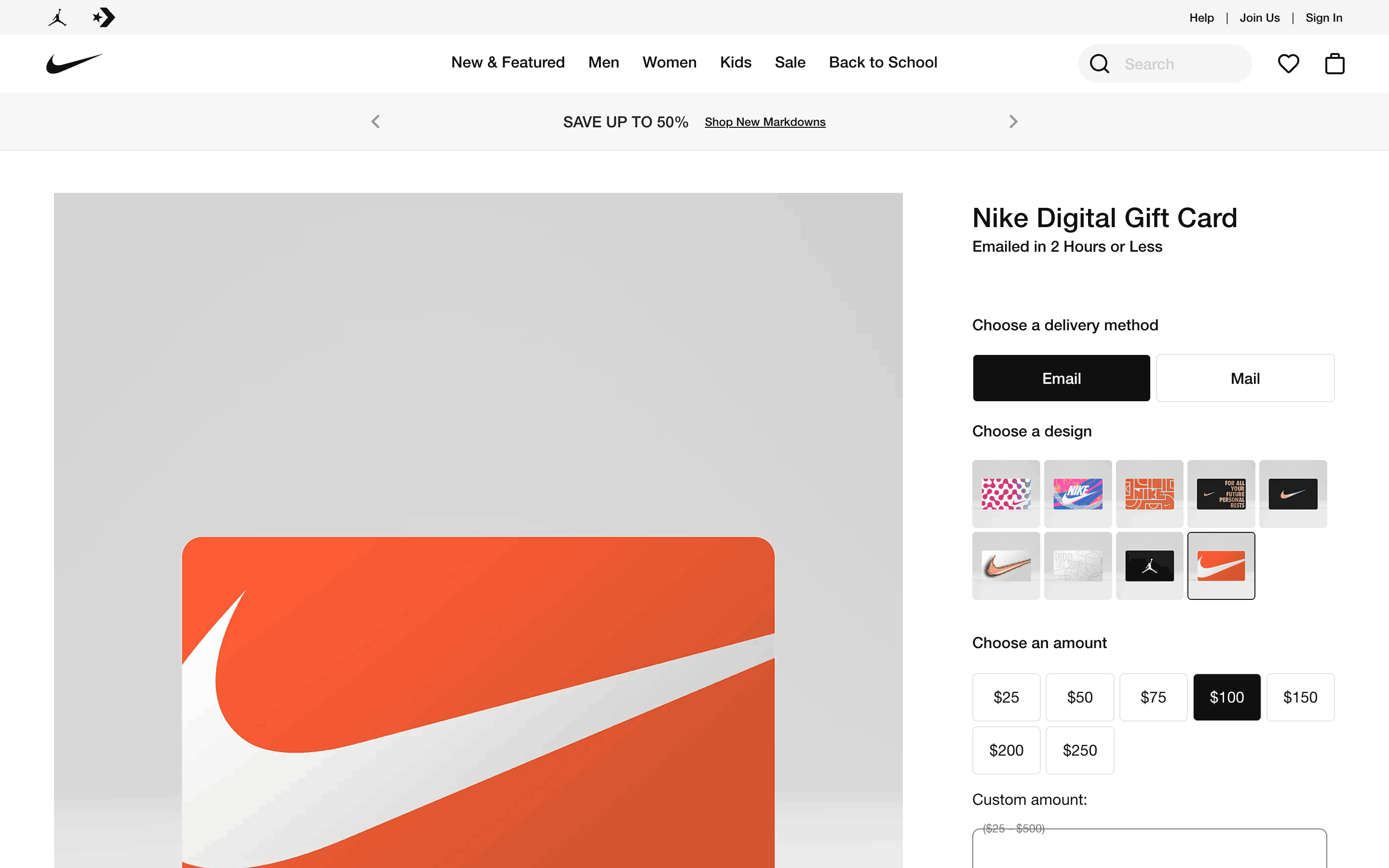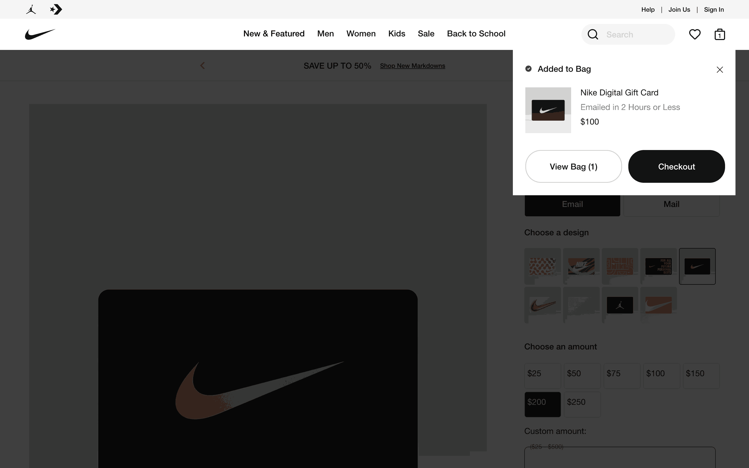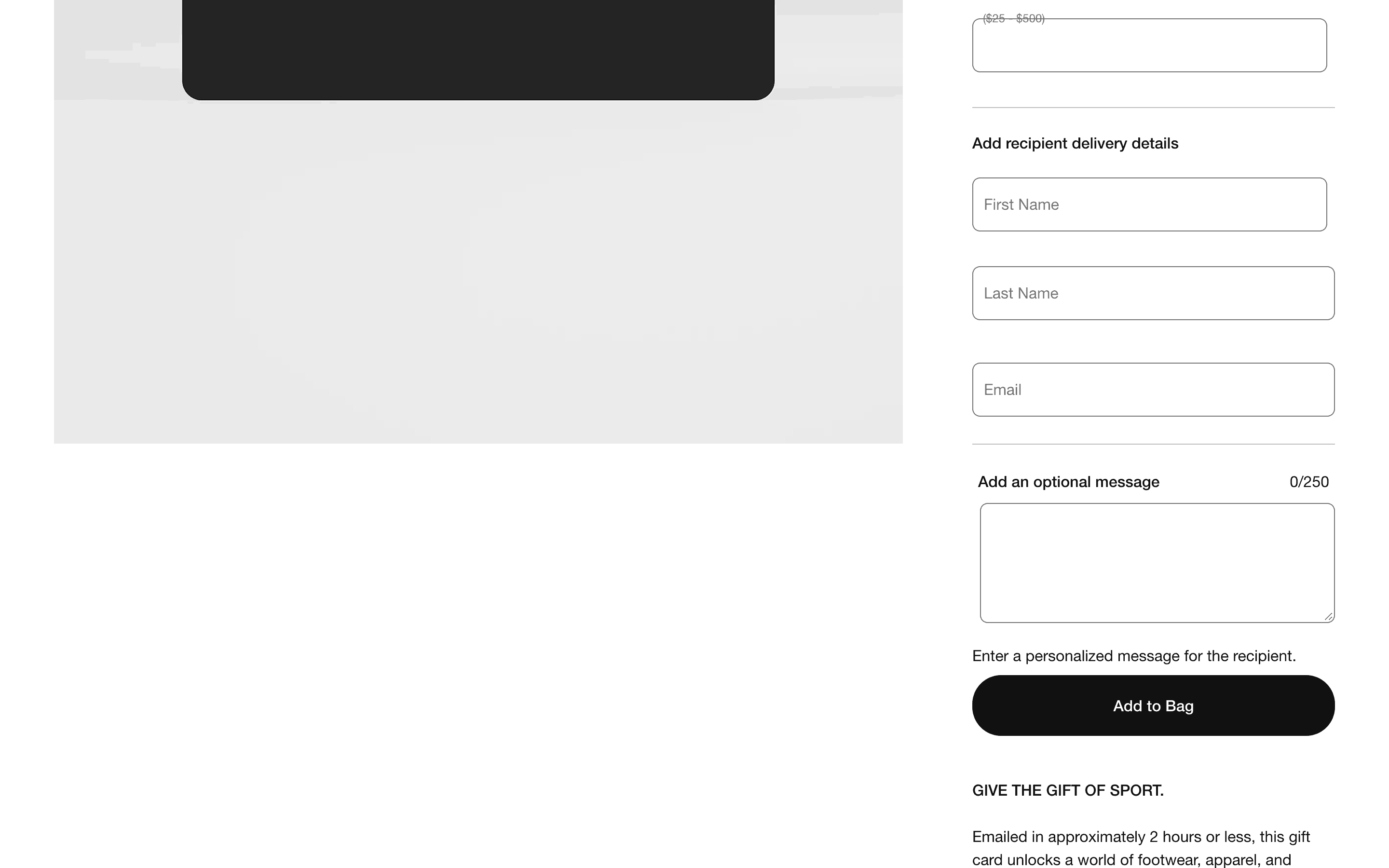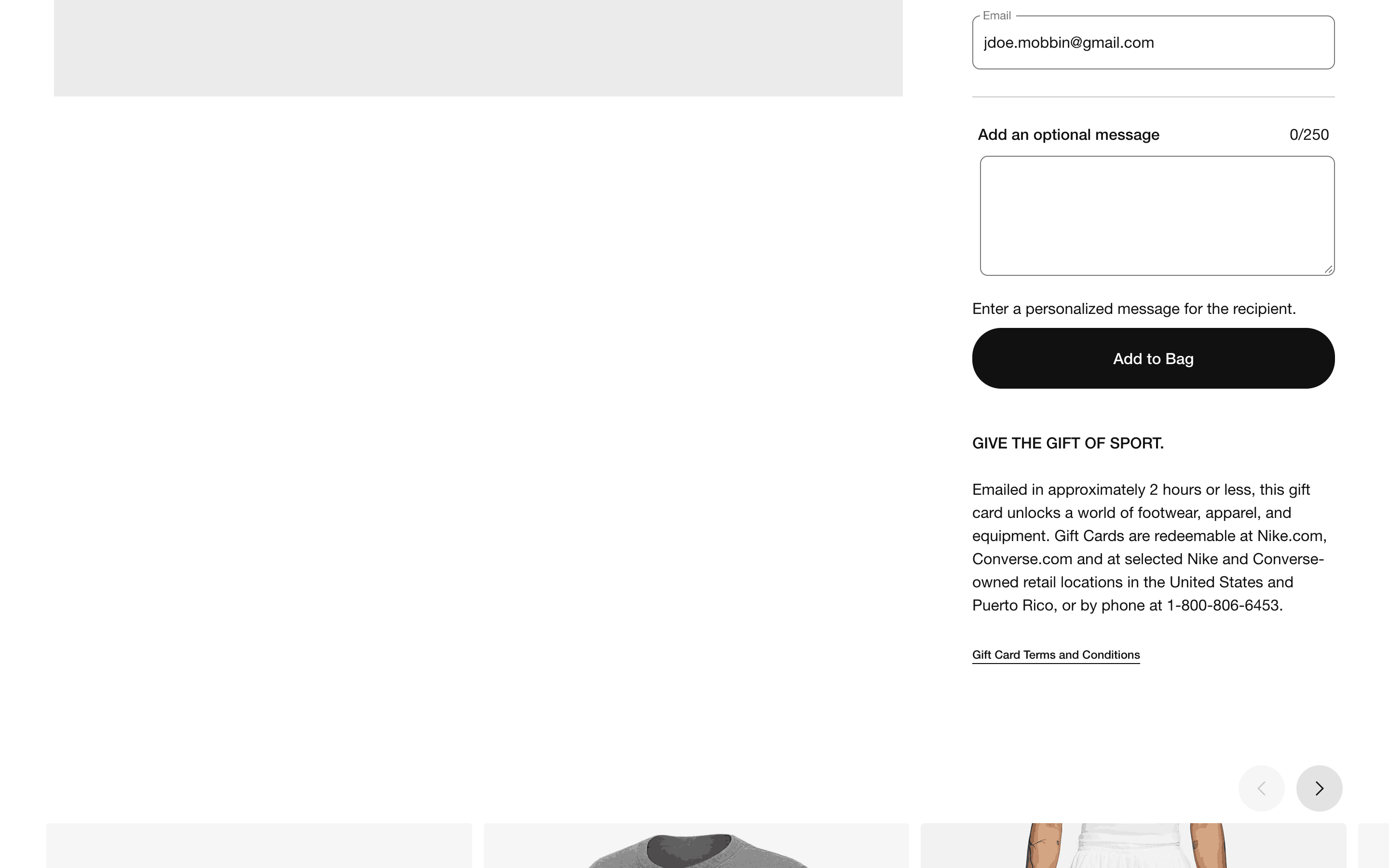 The user flow shows the process of emailing a gift card, from customization to adding it to the bag. The user selects design, amount, recipient and adds a message.