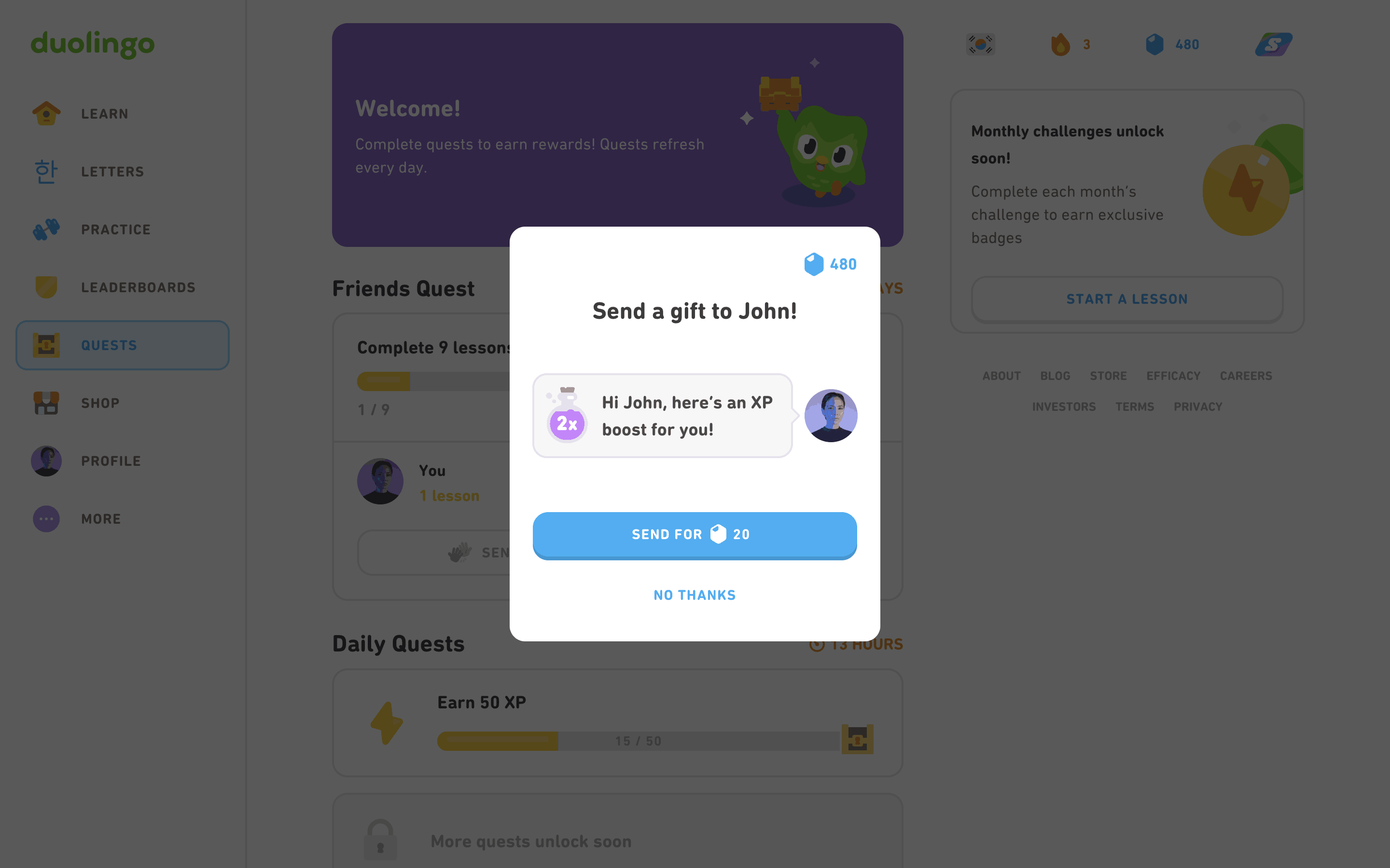 The user sends a gift to a friend. The user confirms sending the gift, and the UI updates to reflect the sent gift.