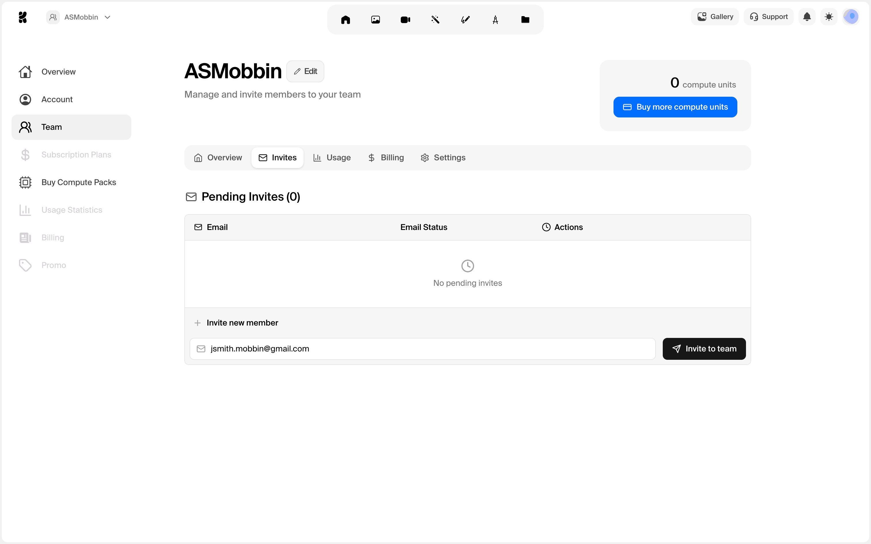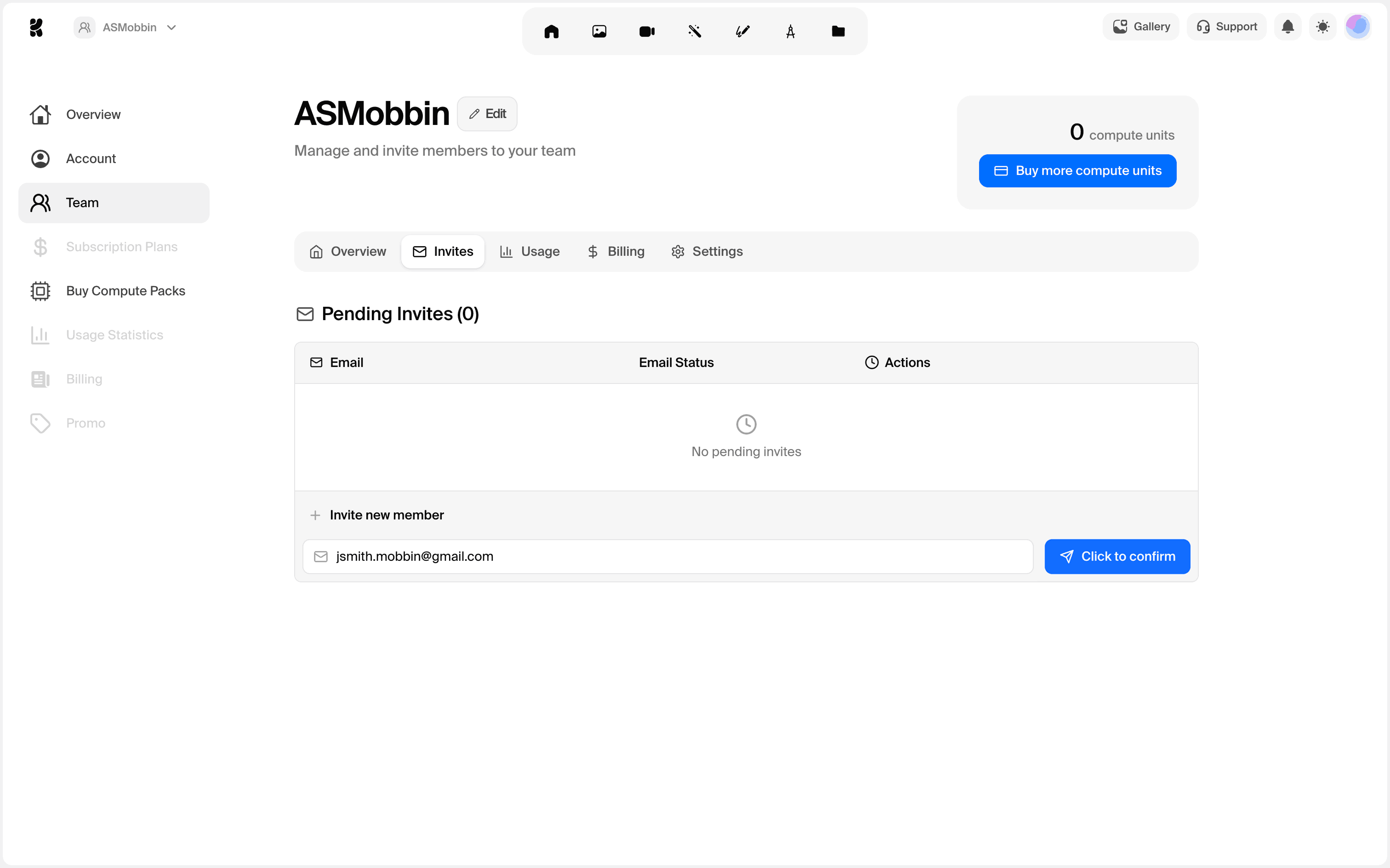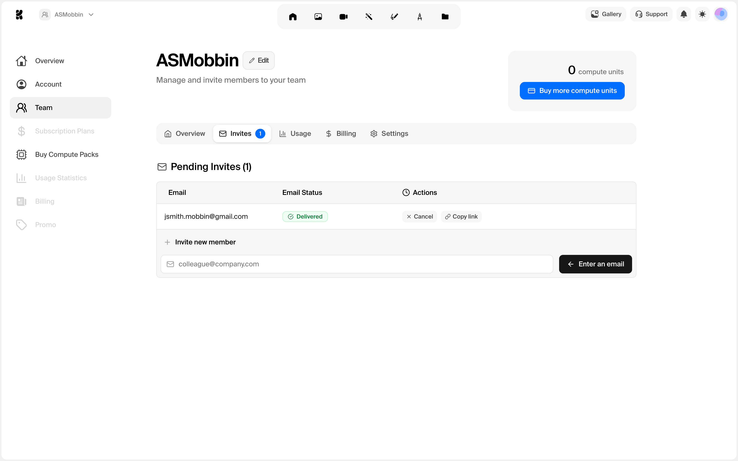 The user invites a new member to the team by entering their email and confirming the invite. The invited member then appears in the team members list.