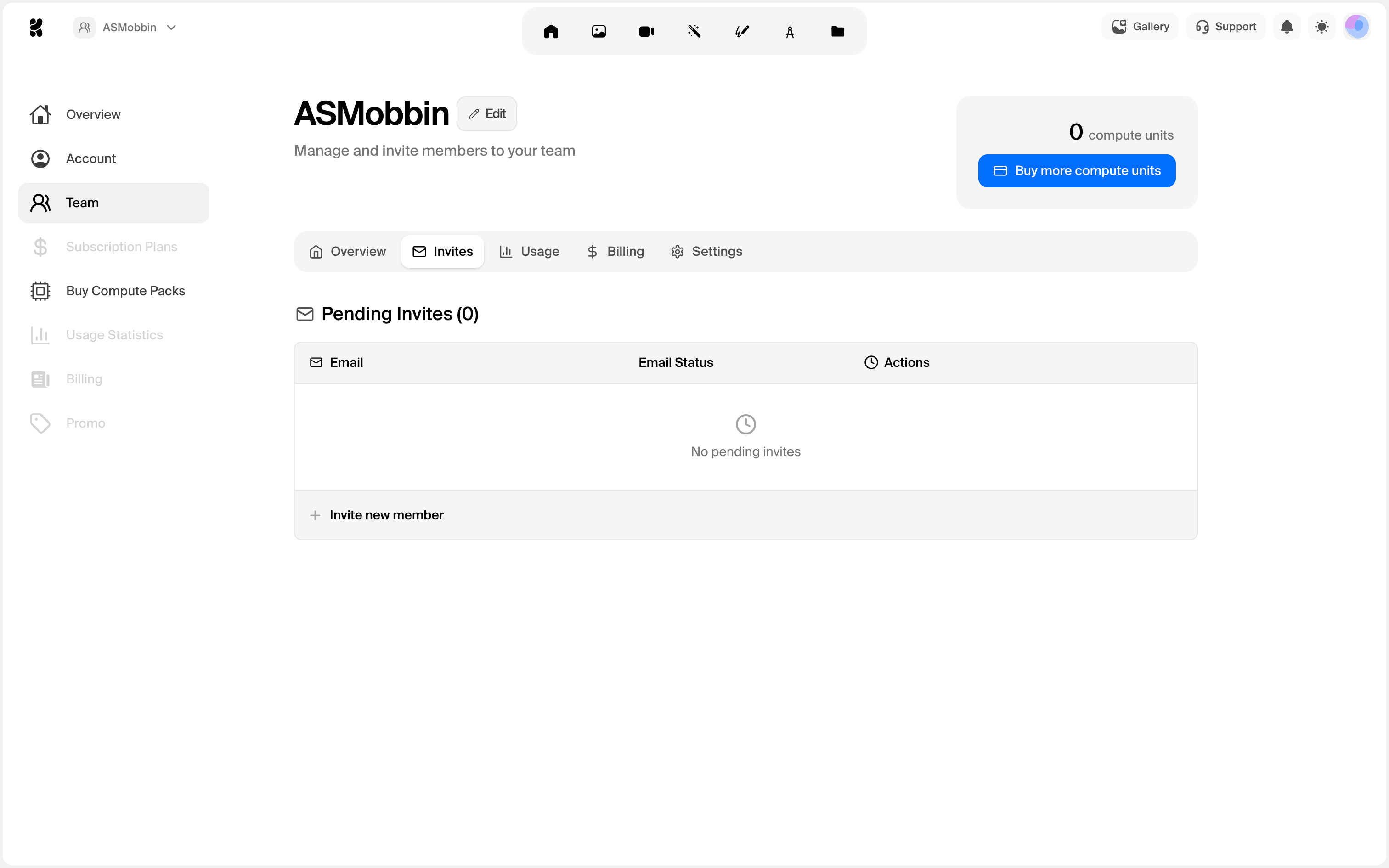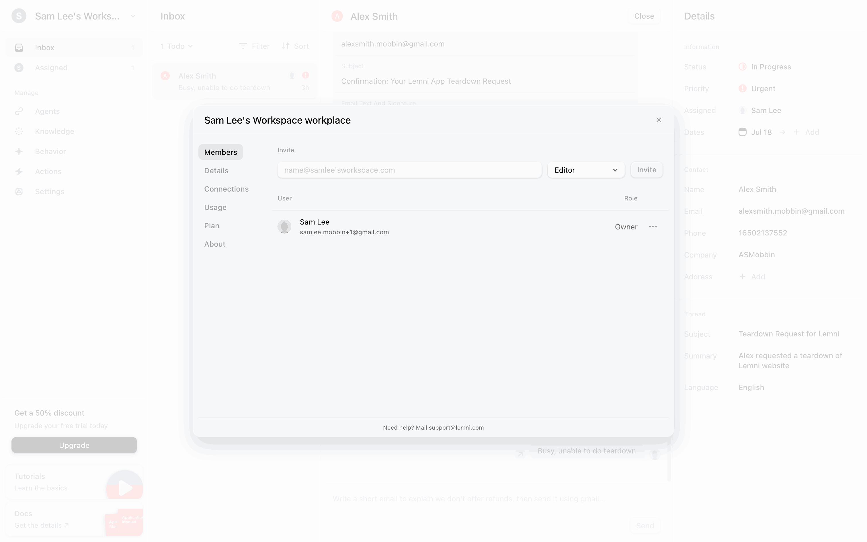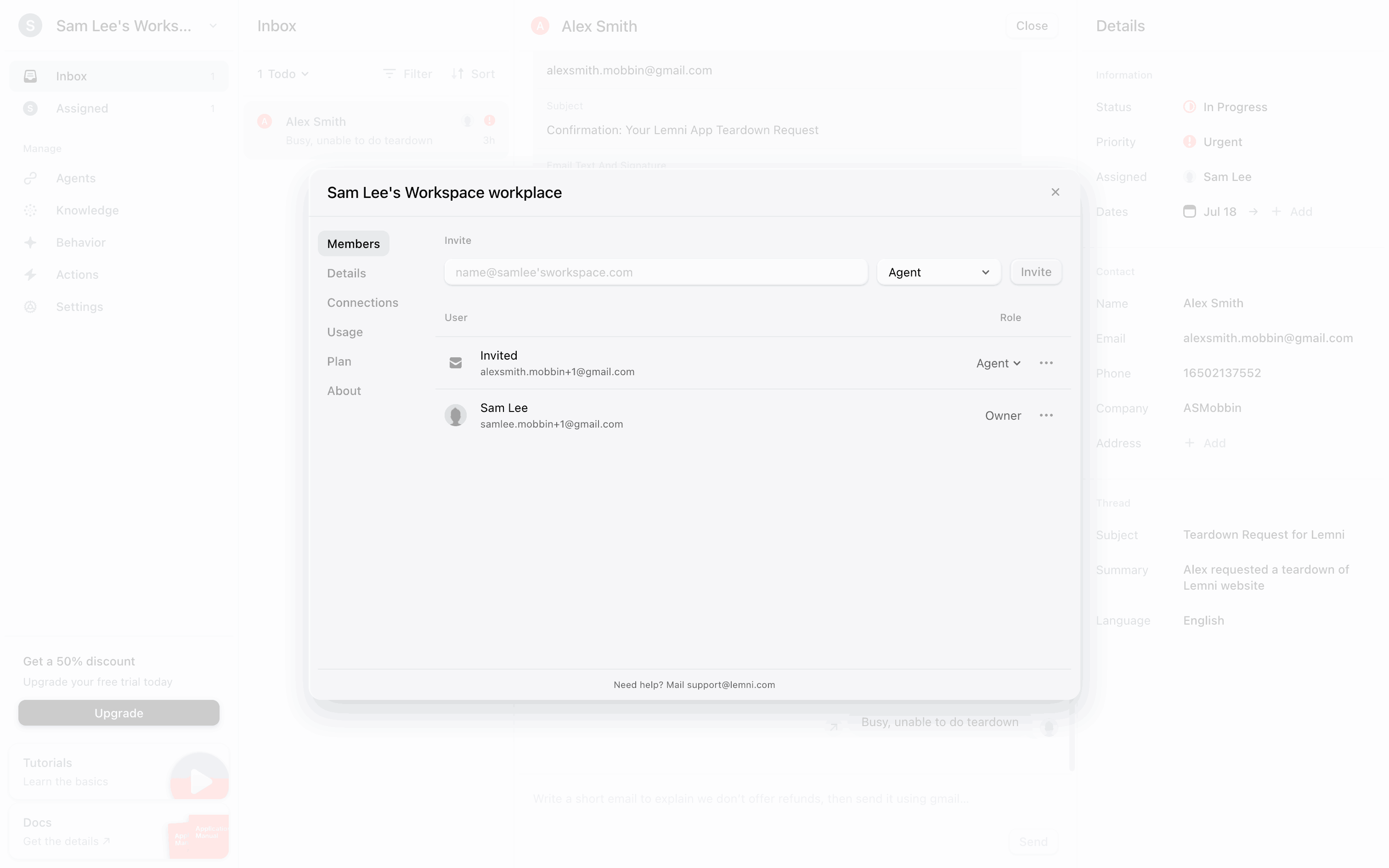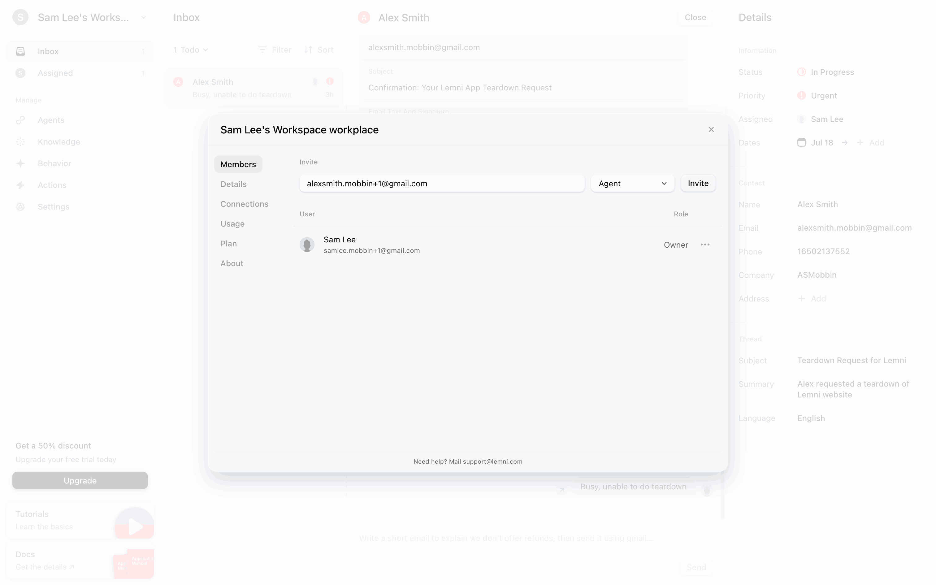 The user invites a new member to the team by entering their email and confirming the invite. The invited member then appears in the team members list.