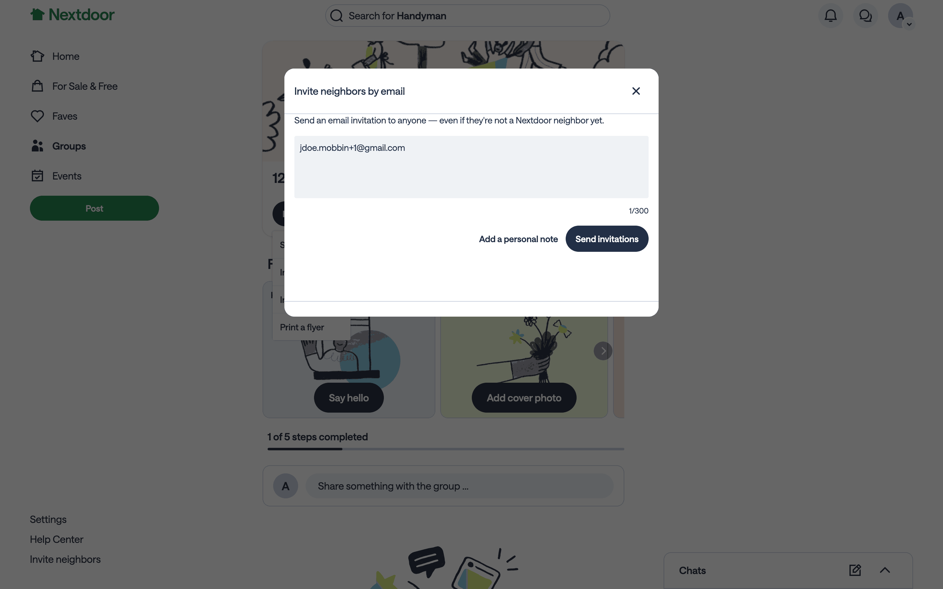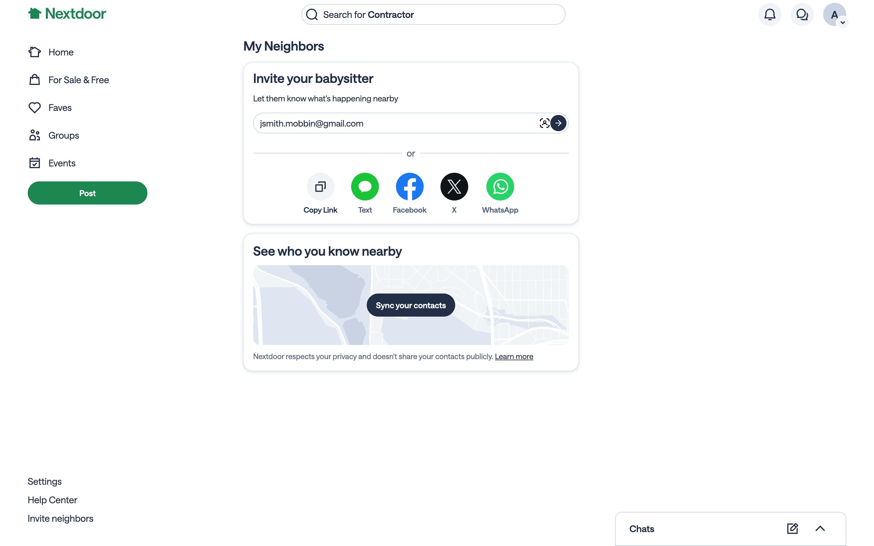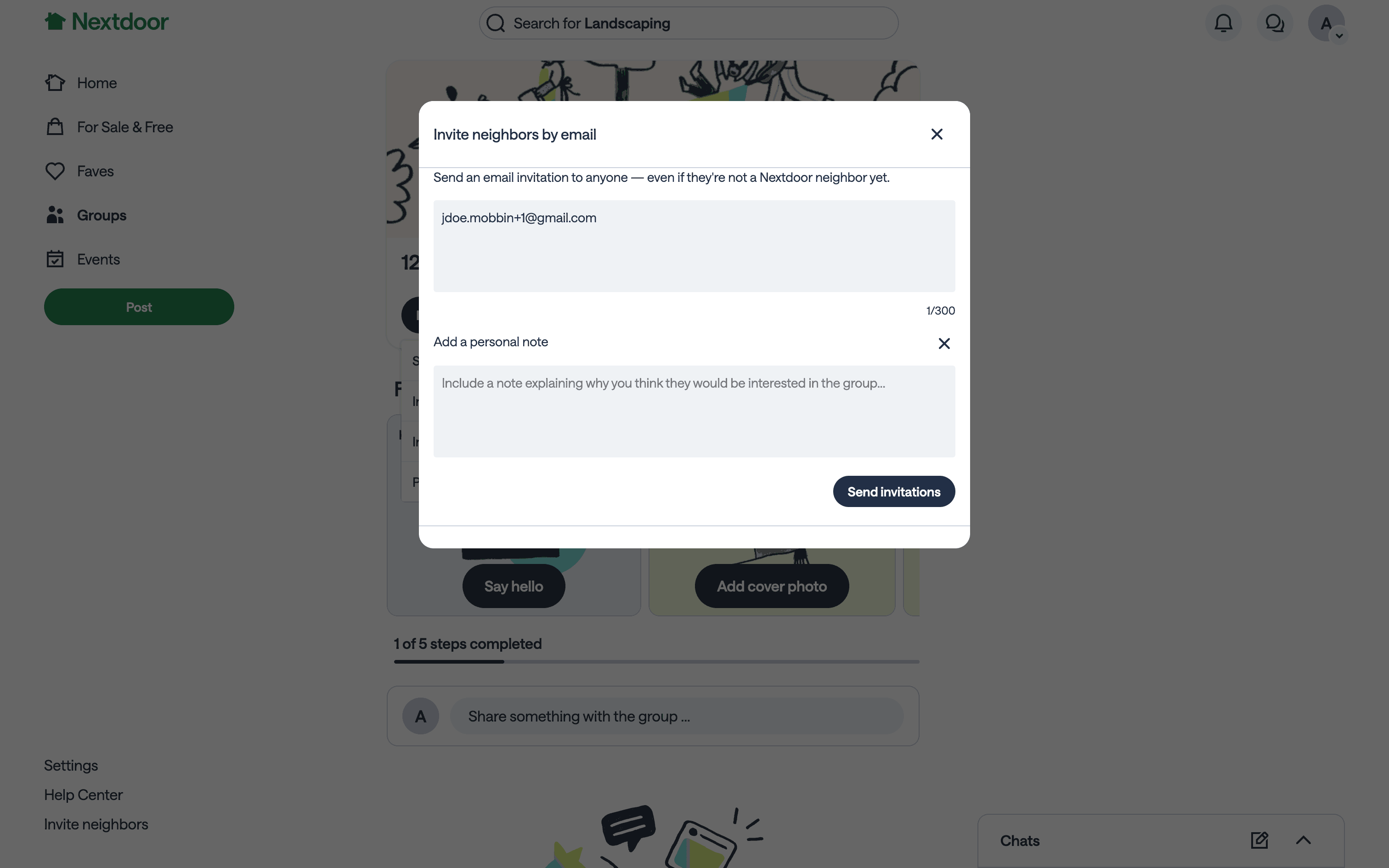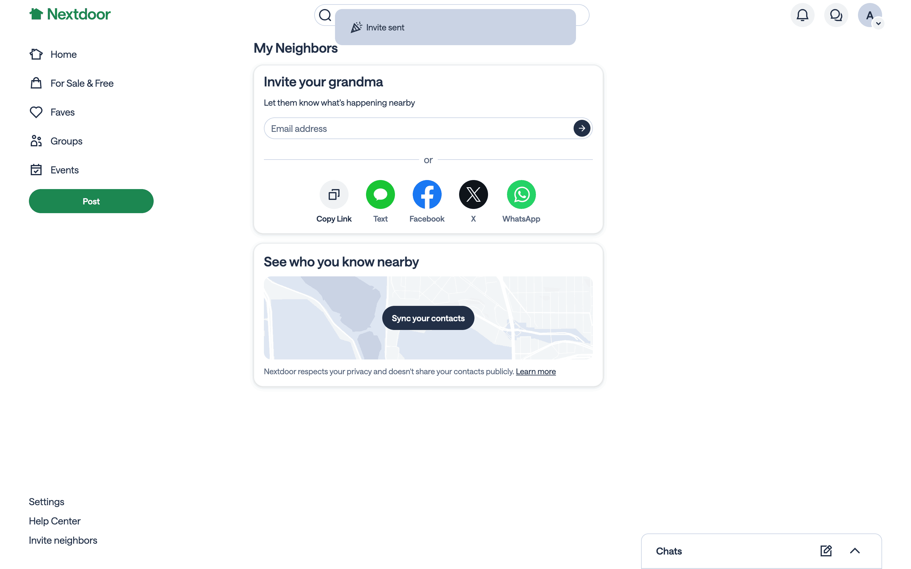 The user invites a neighbor to Nextdoor by entering their email address. A confirmation message appears after the invitation is sent.
