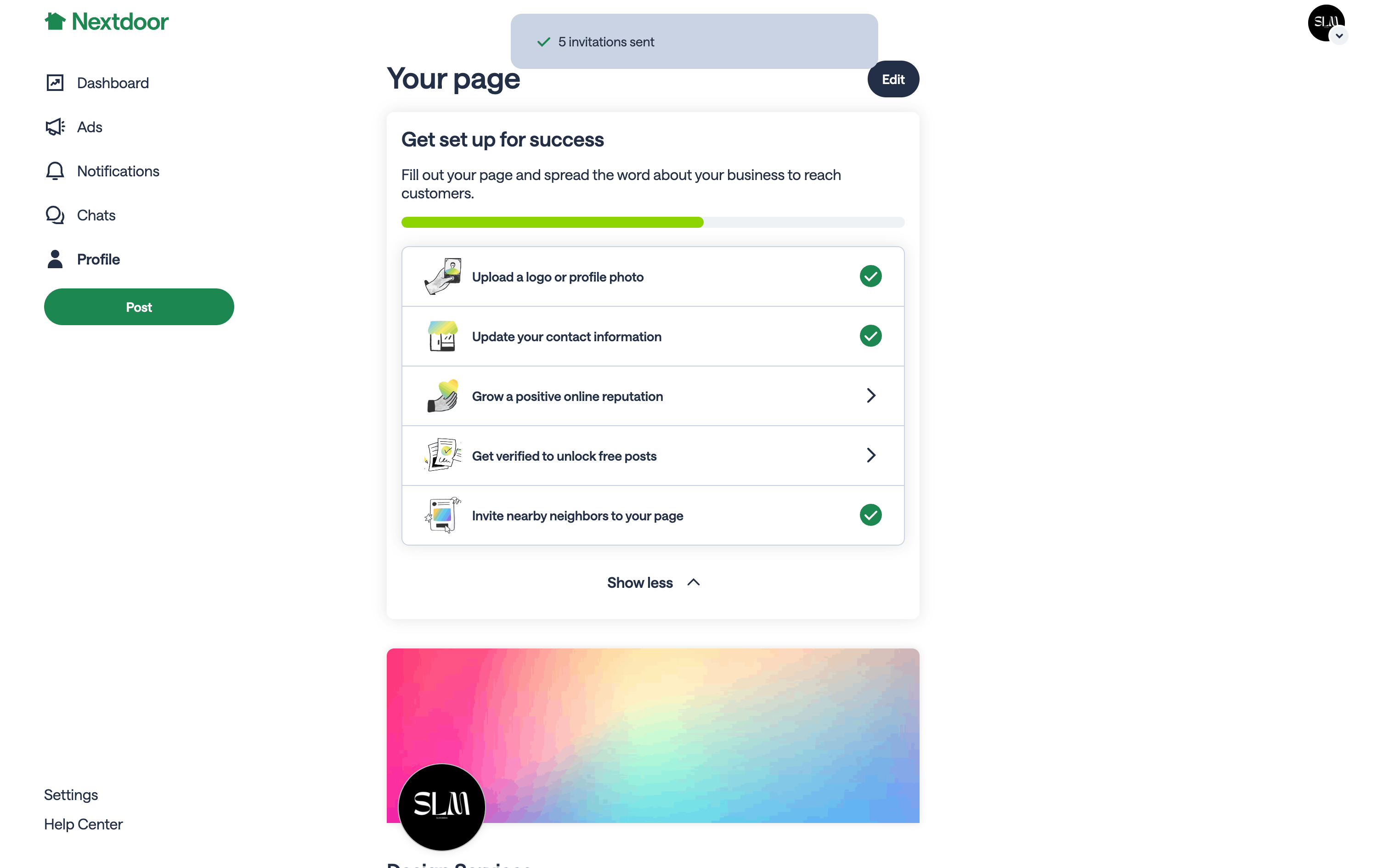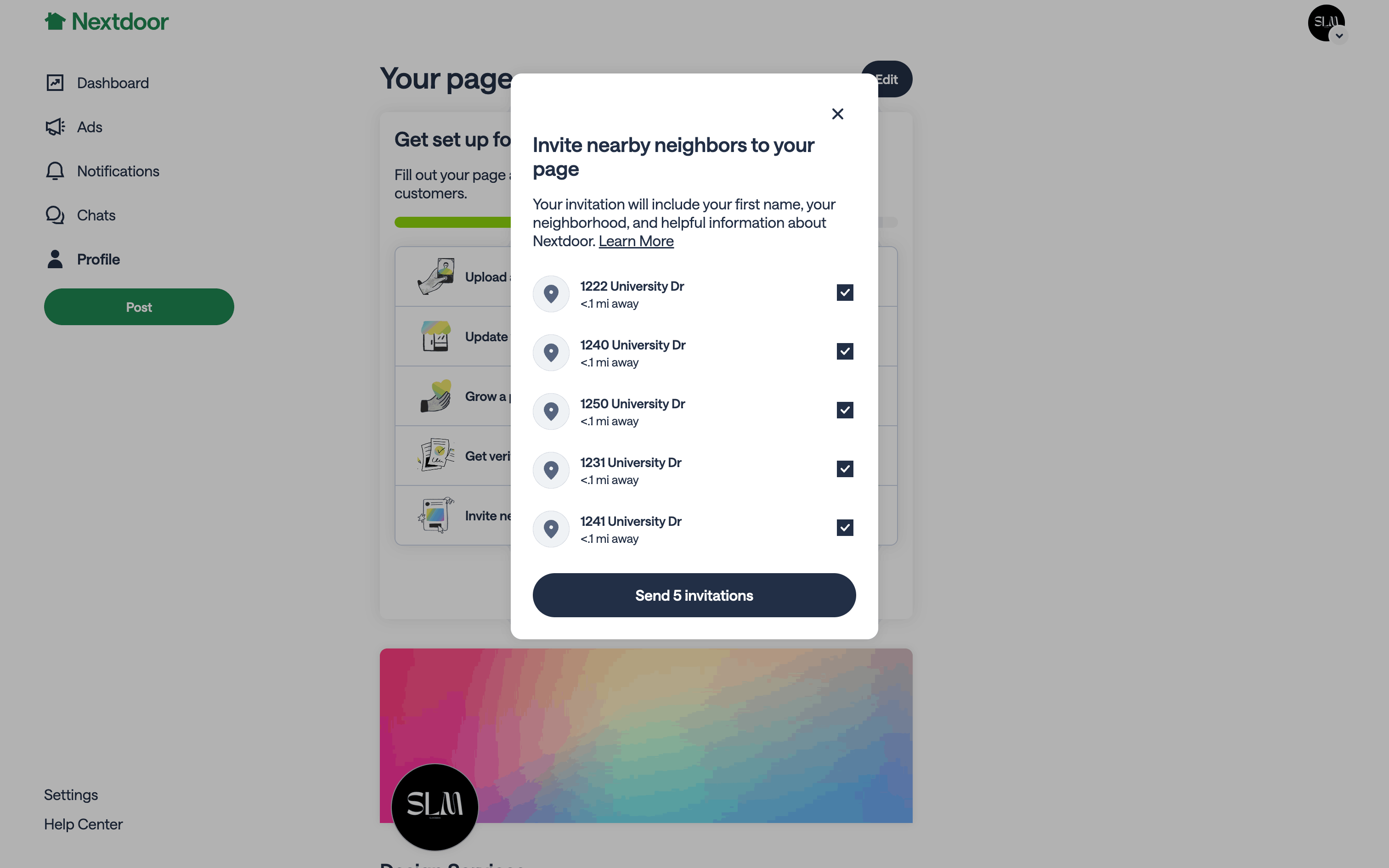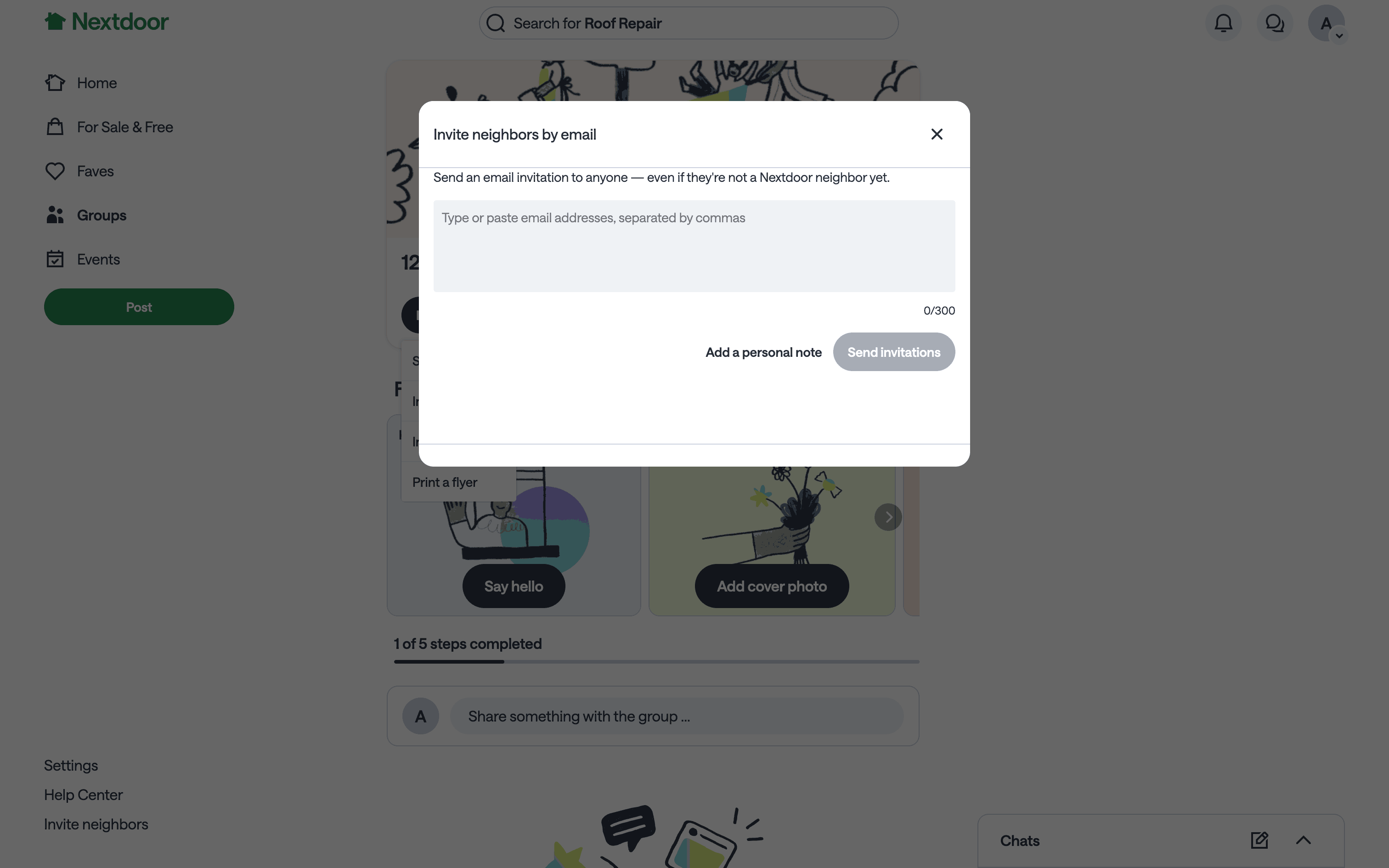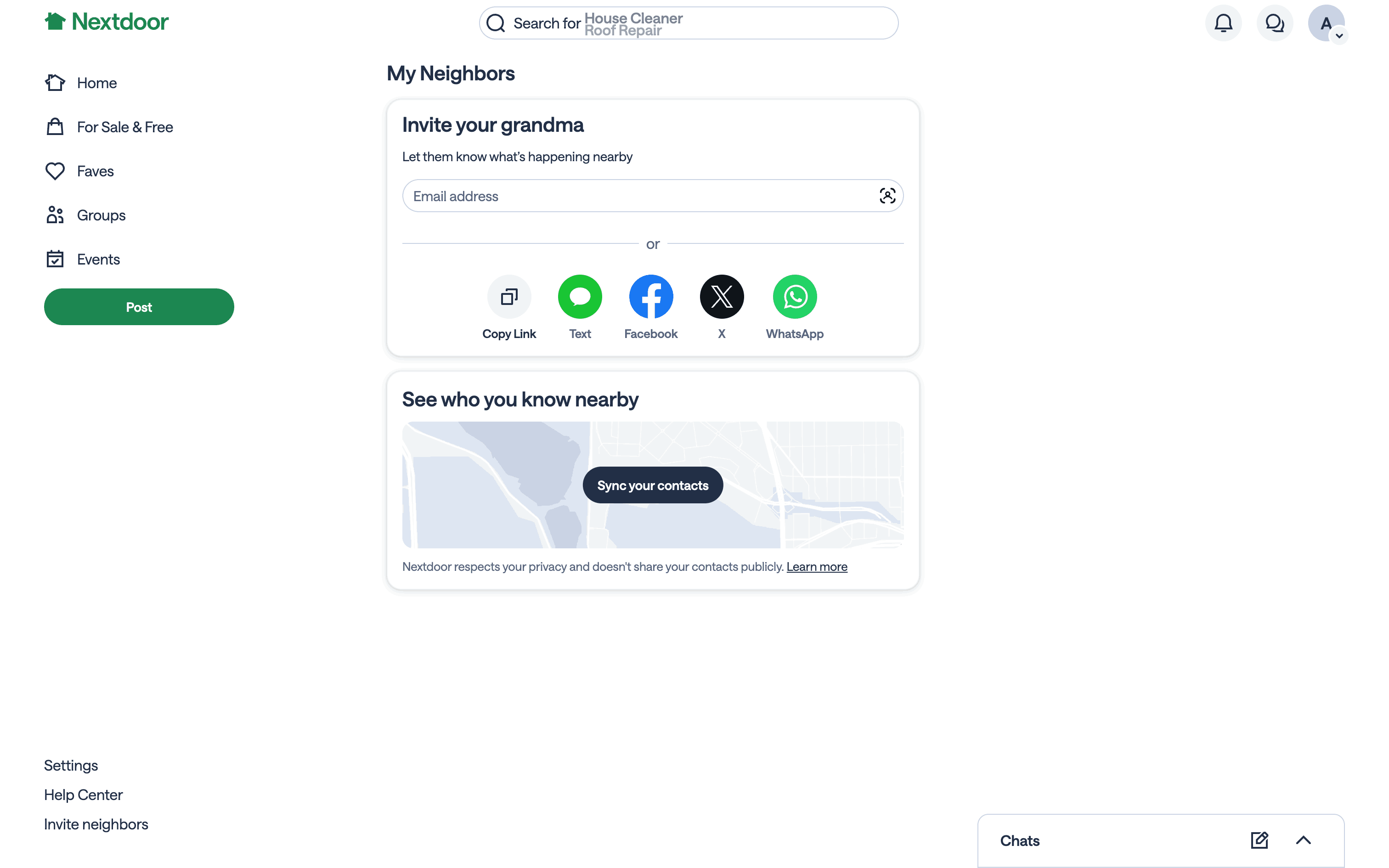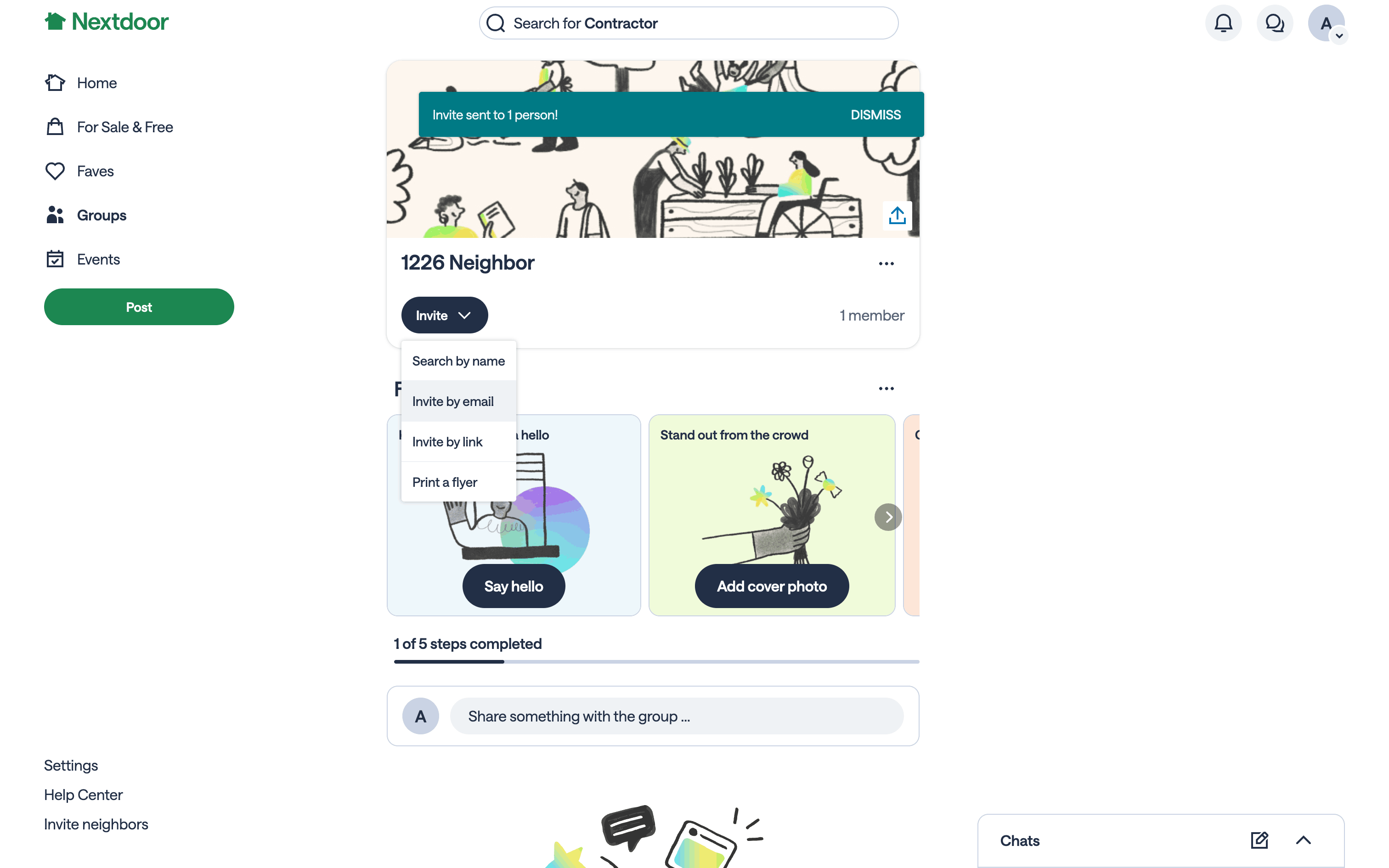 The user invites a neighbor to Nextdoor by entering their email address. A confirmation message appears after the invitation is sent.