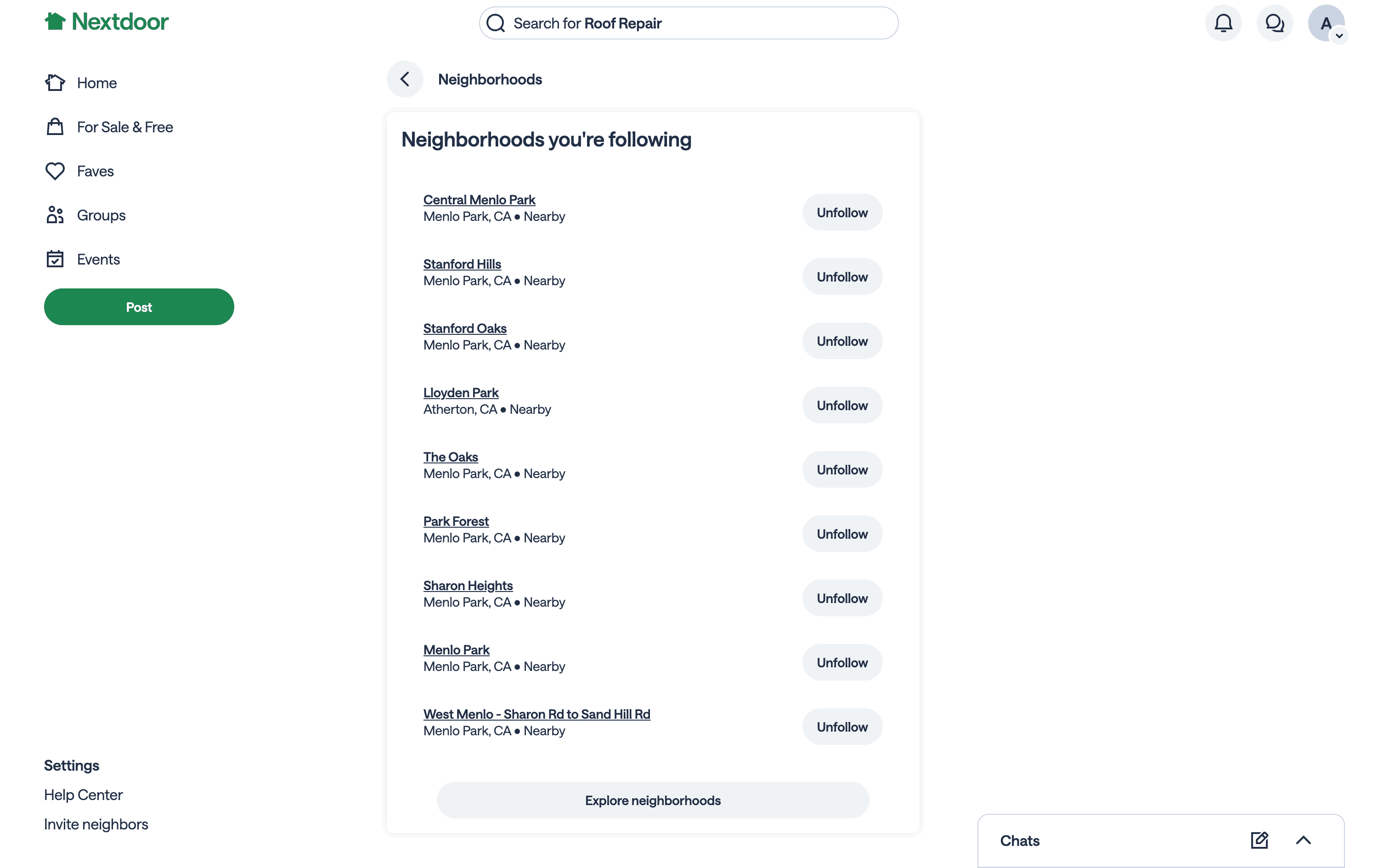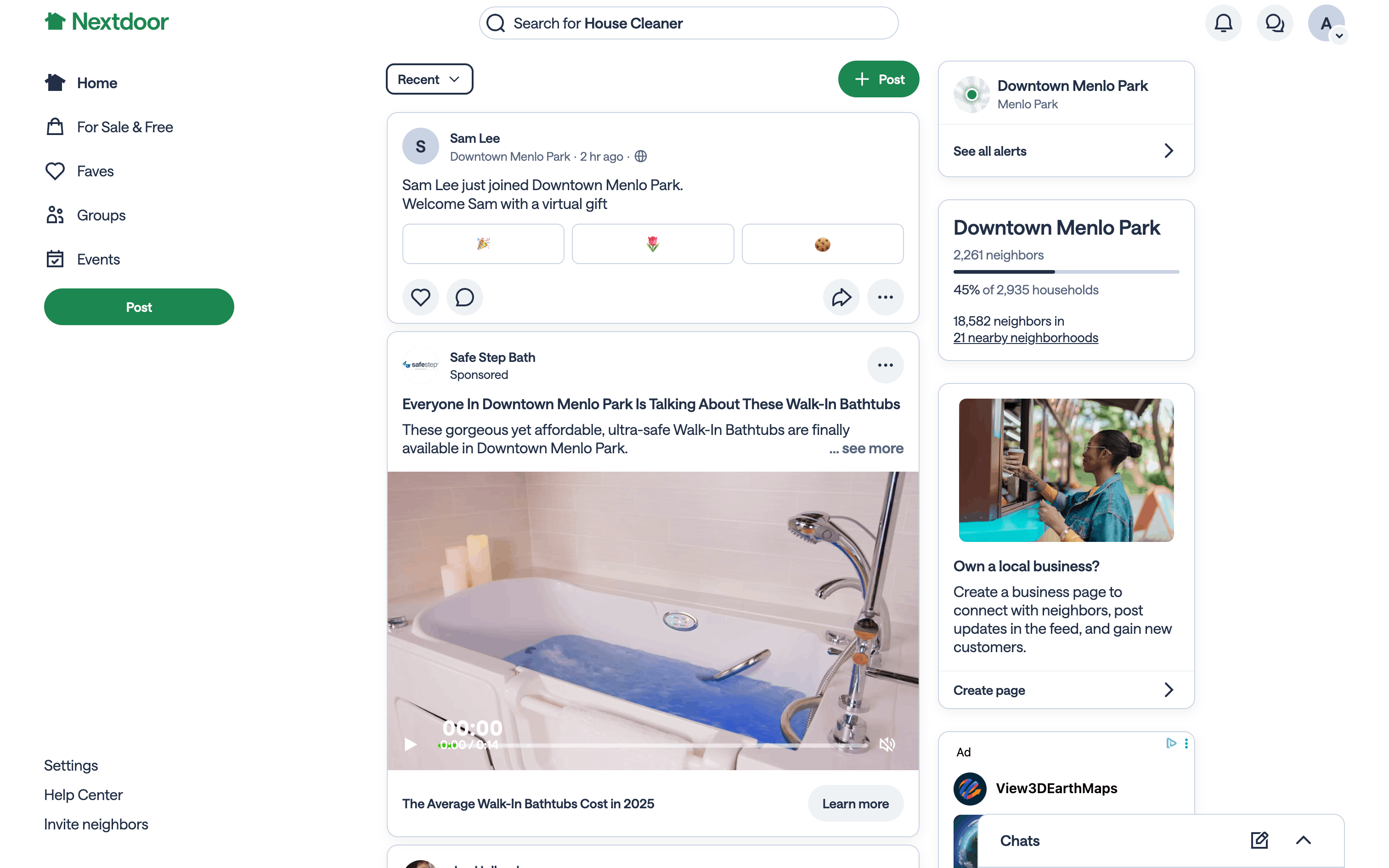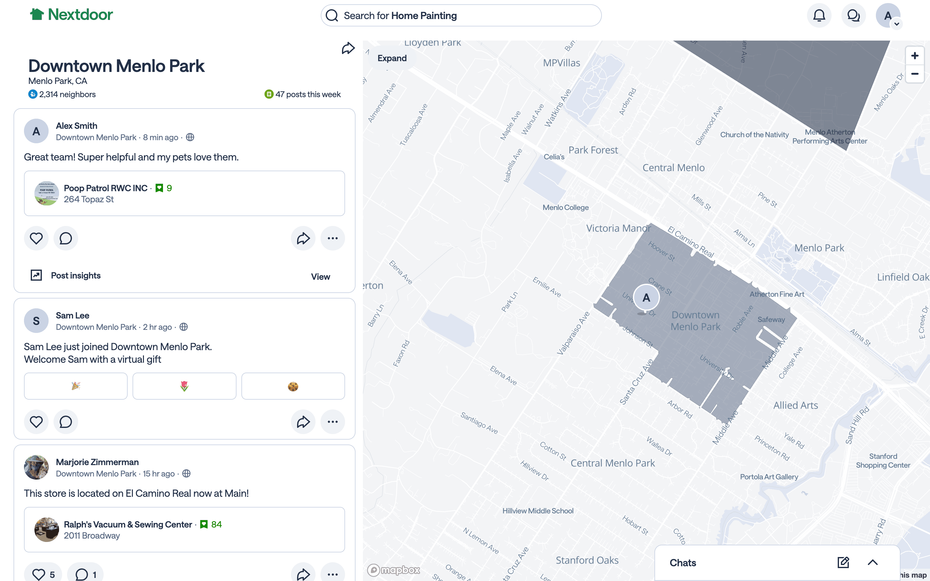 The user starts on the Nextdoor feed with an invitation prompt, then navigates to the main feed, followed neighborhoods, and a map view. The initial invitation focus is lost.