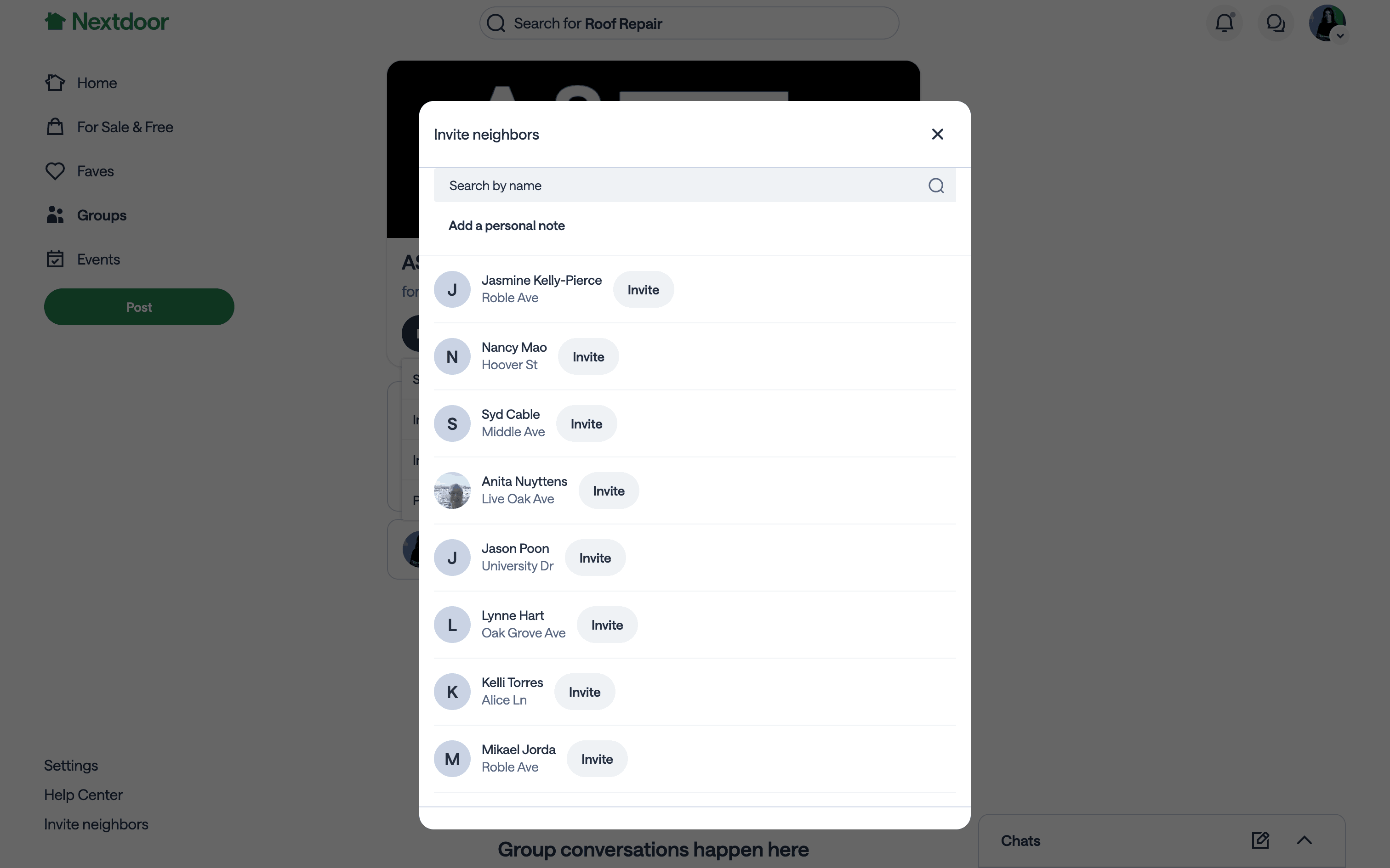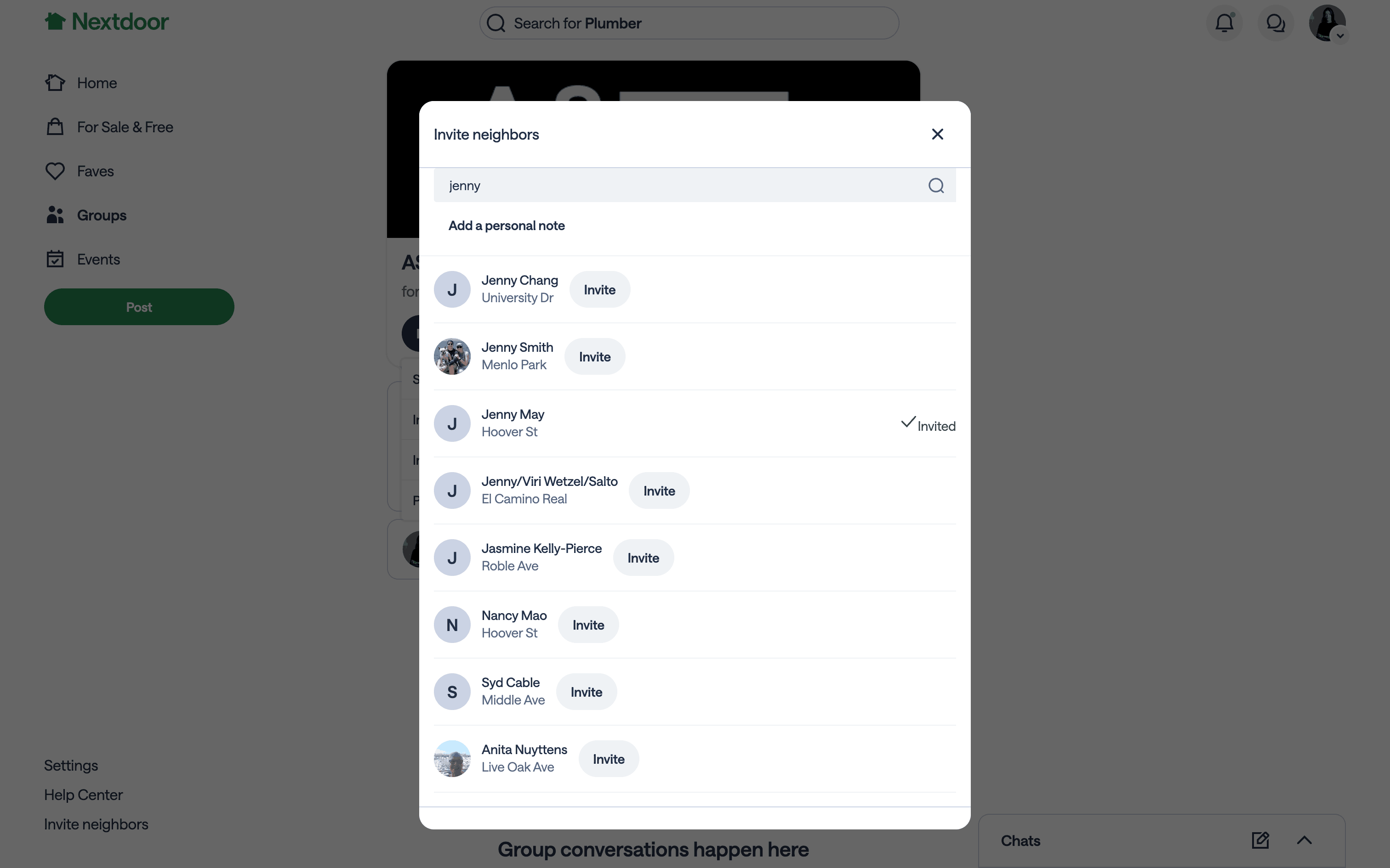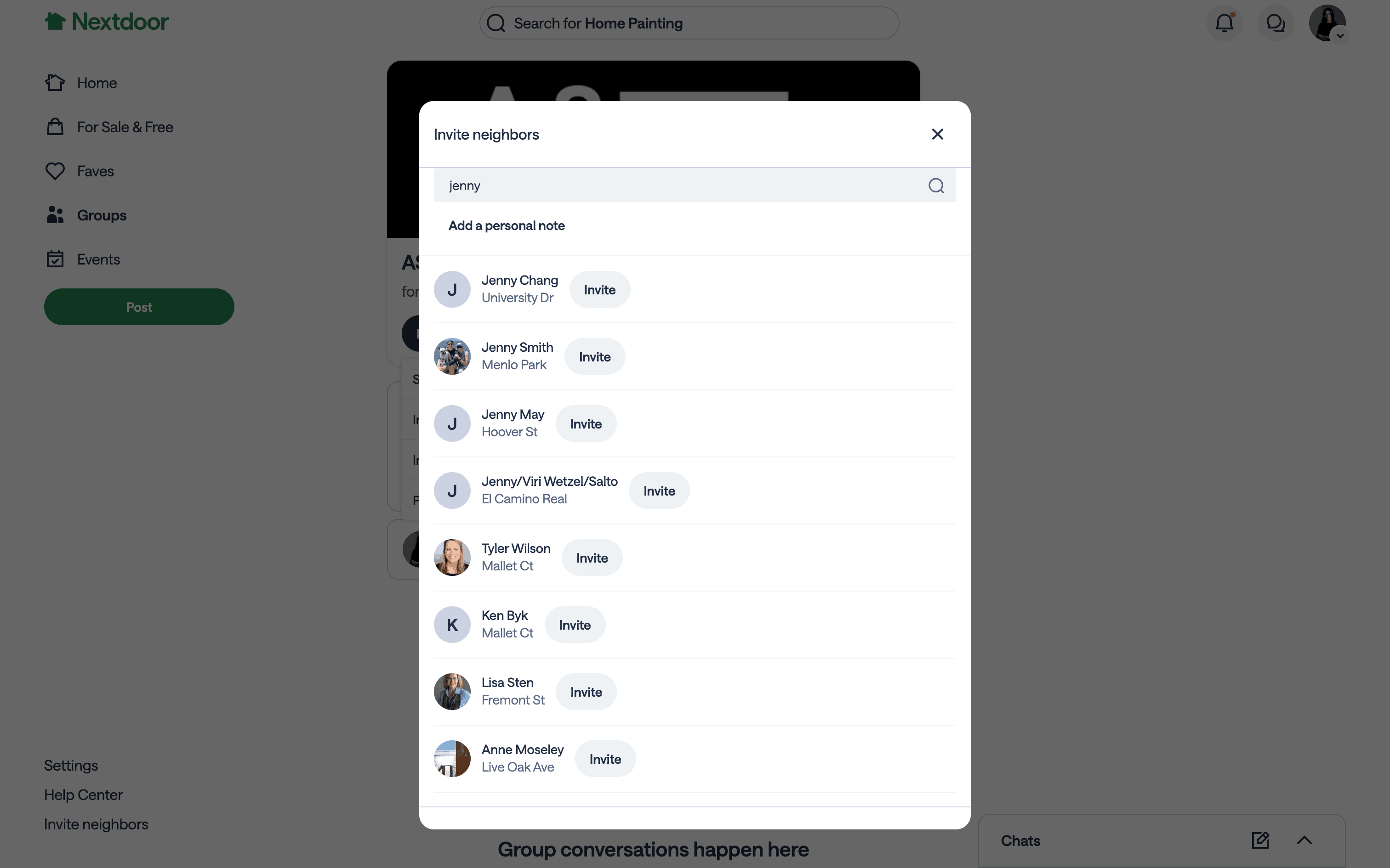 The user flow demonstrates inviting a neighbor to a group by searching for their name. It shows the invite confirmation after the user sends the invite.