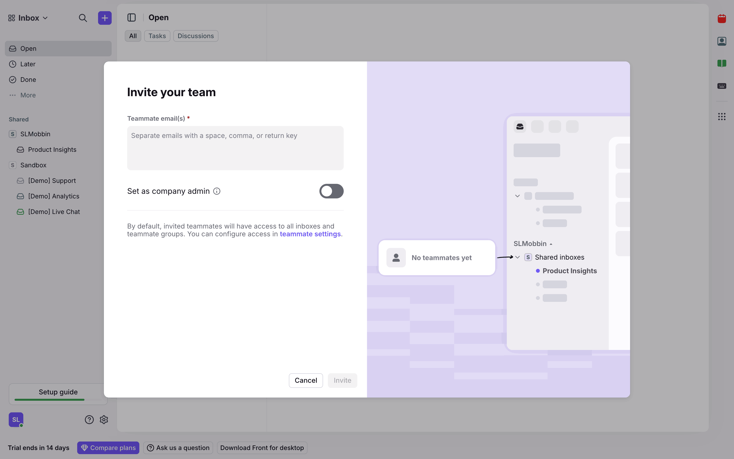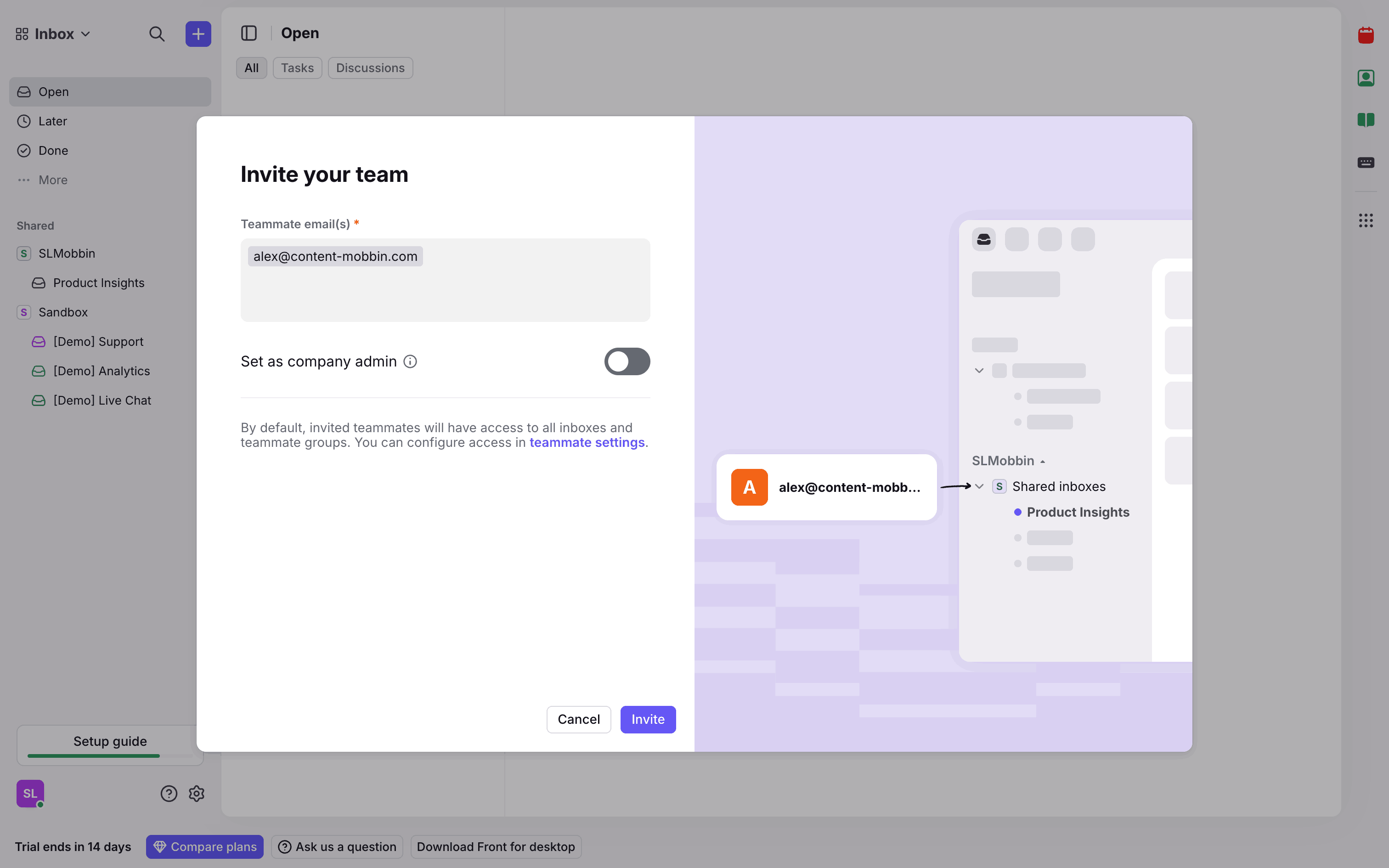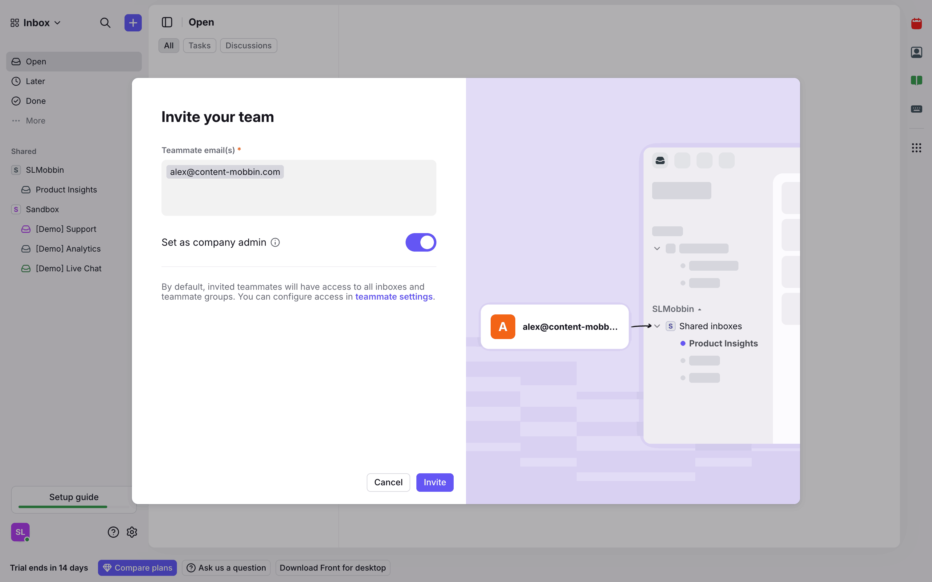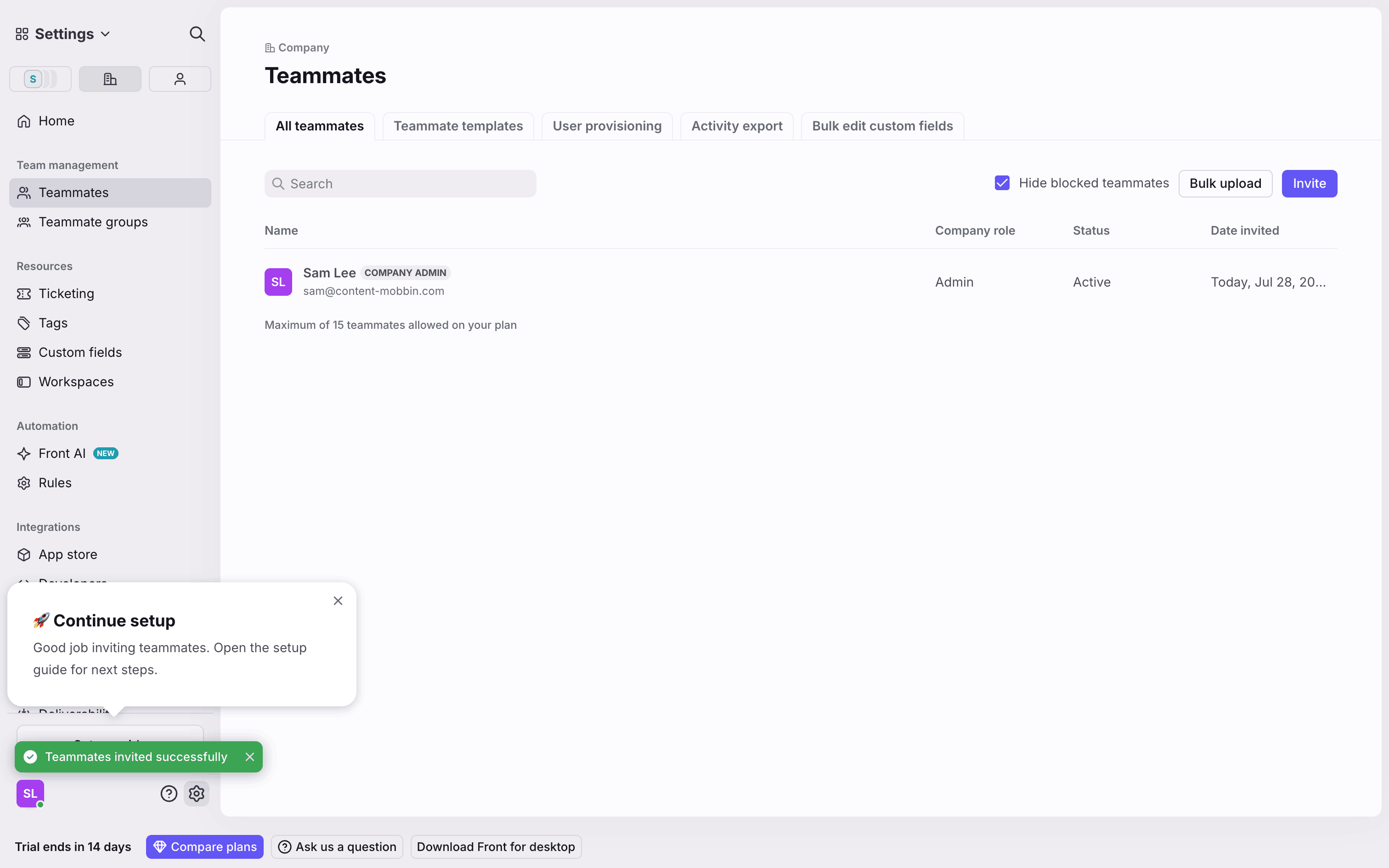 The user invites a teammate by entering their email and setting admin privileges. The user is then redirected to the teammates page, which confirms the invitation.