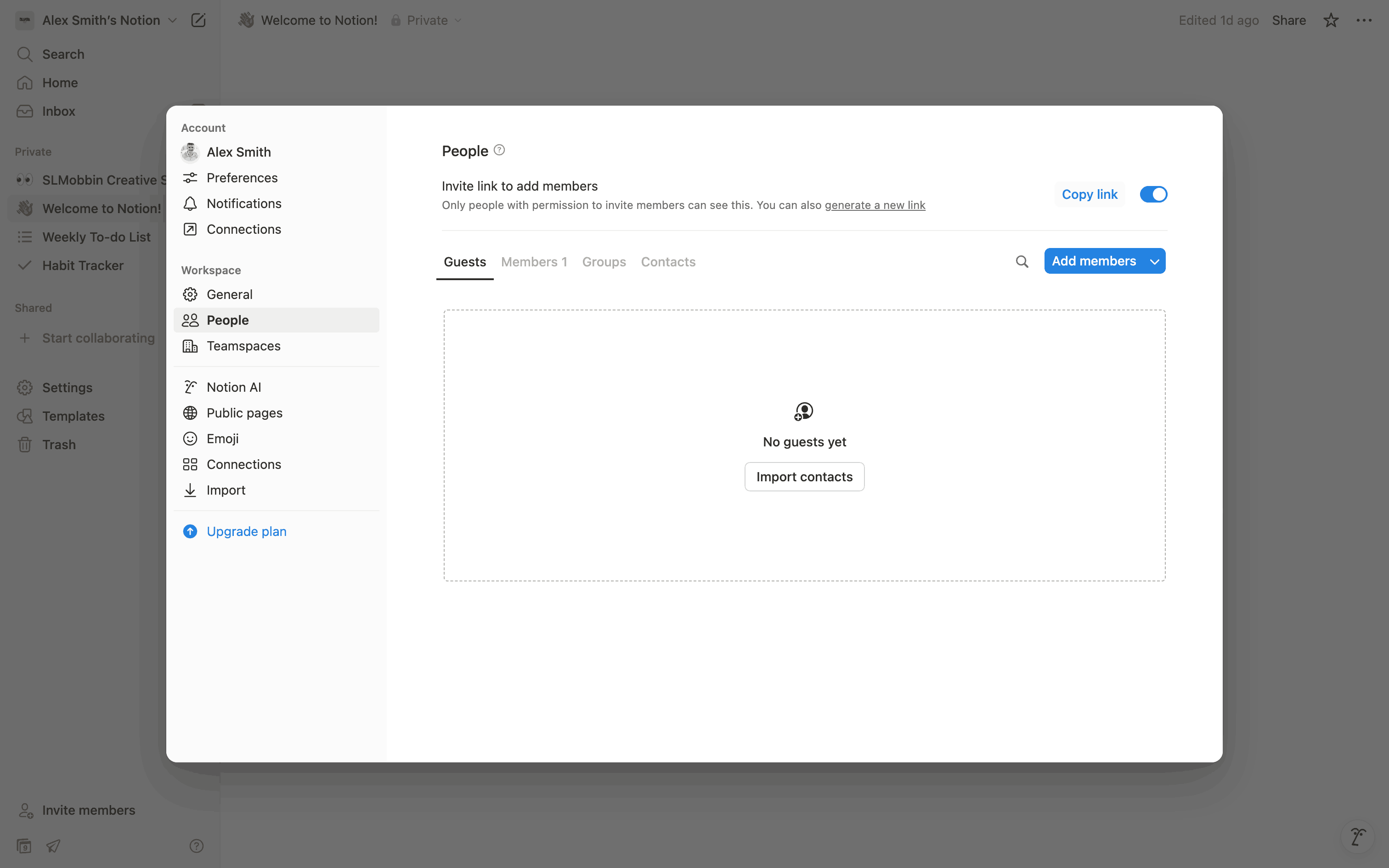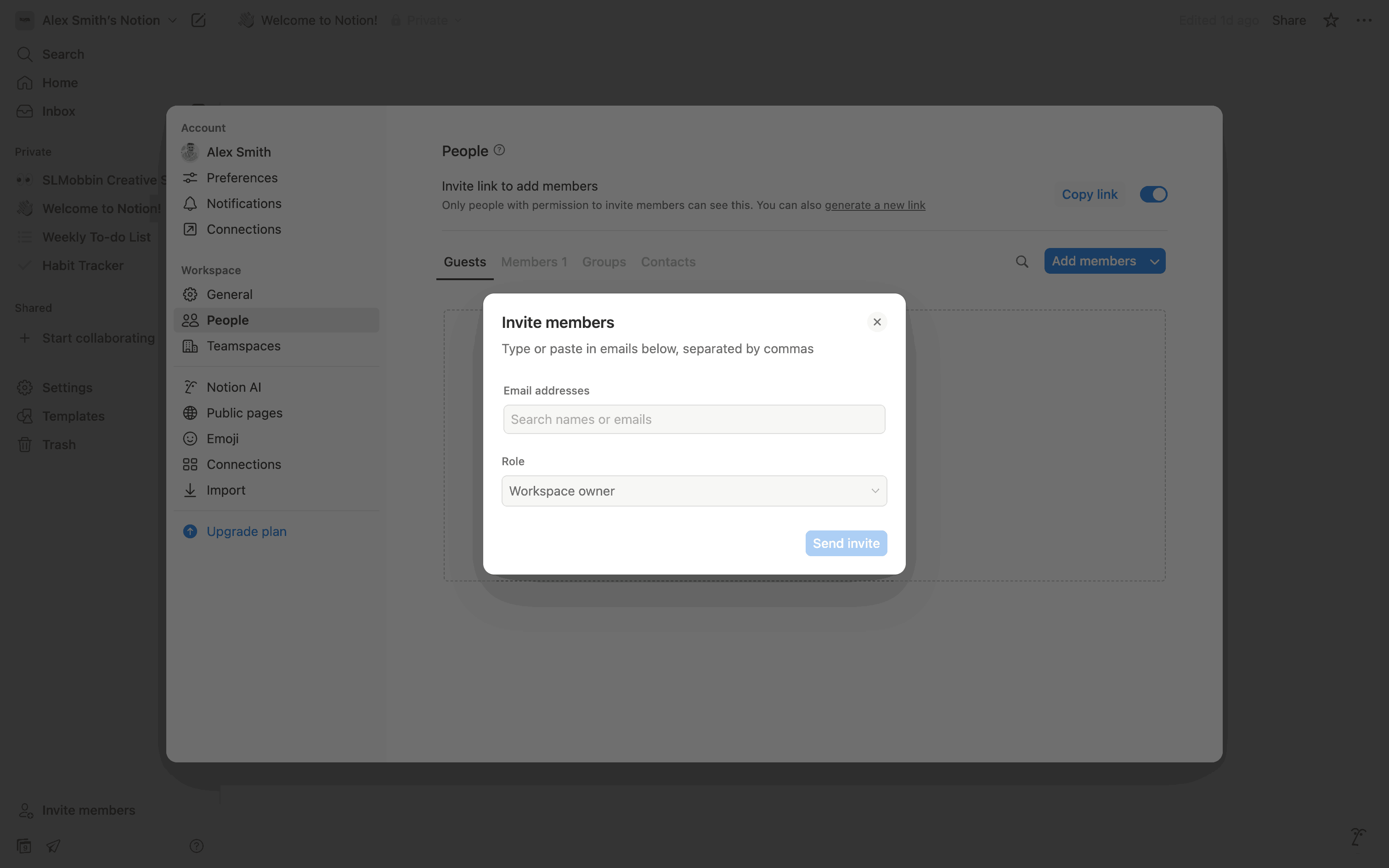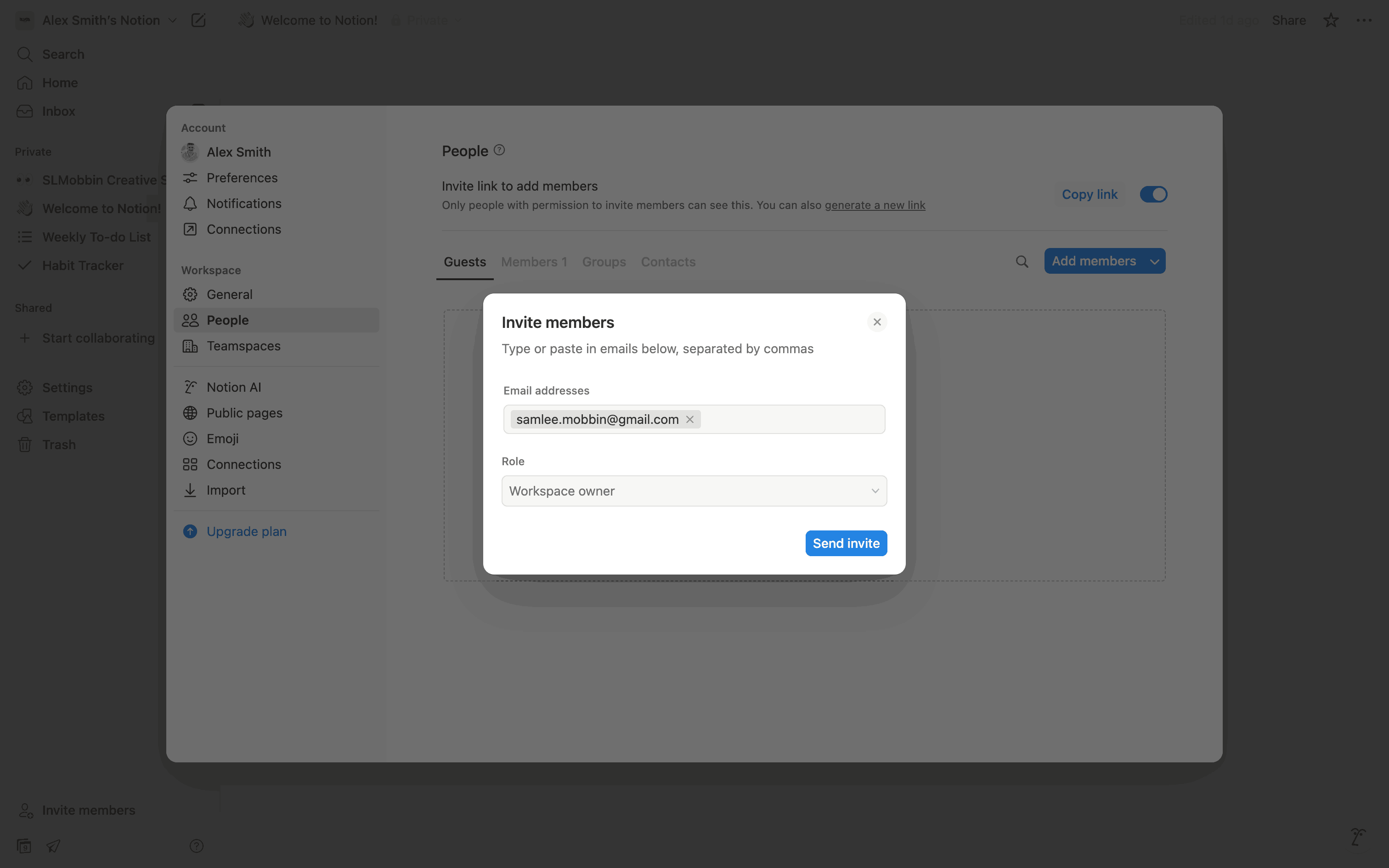 The user invites a new member by entering their email and role. The invited member is then displayed in the members list.