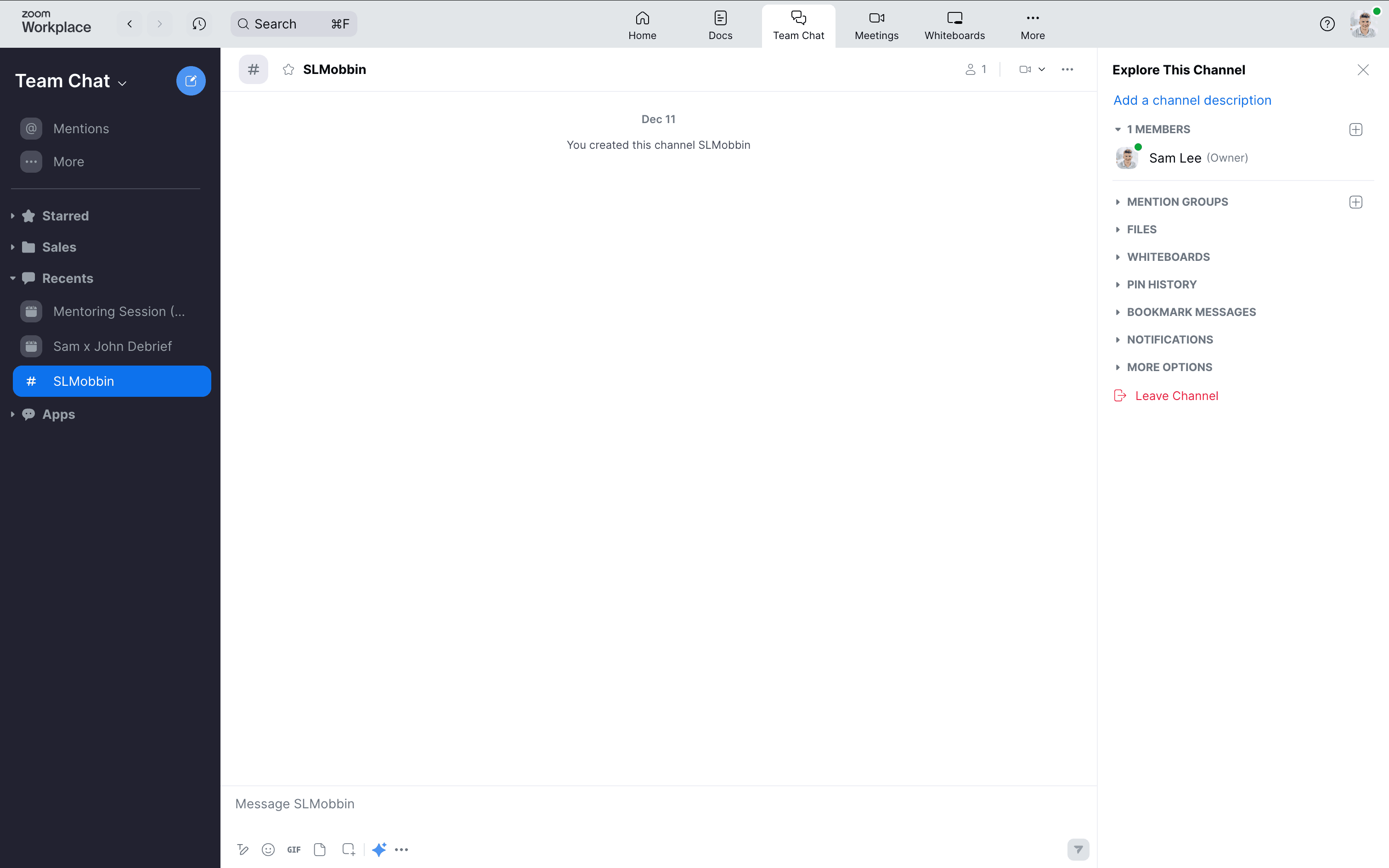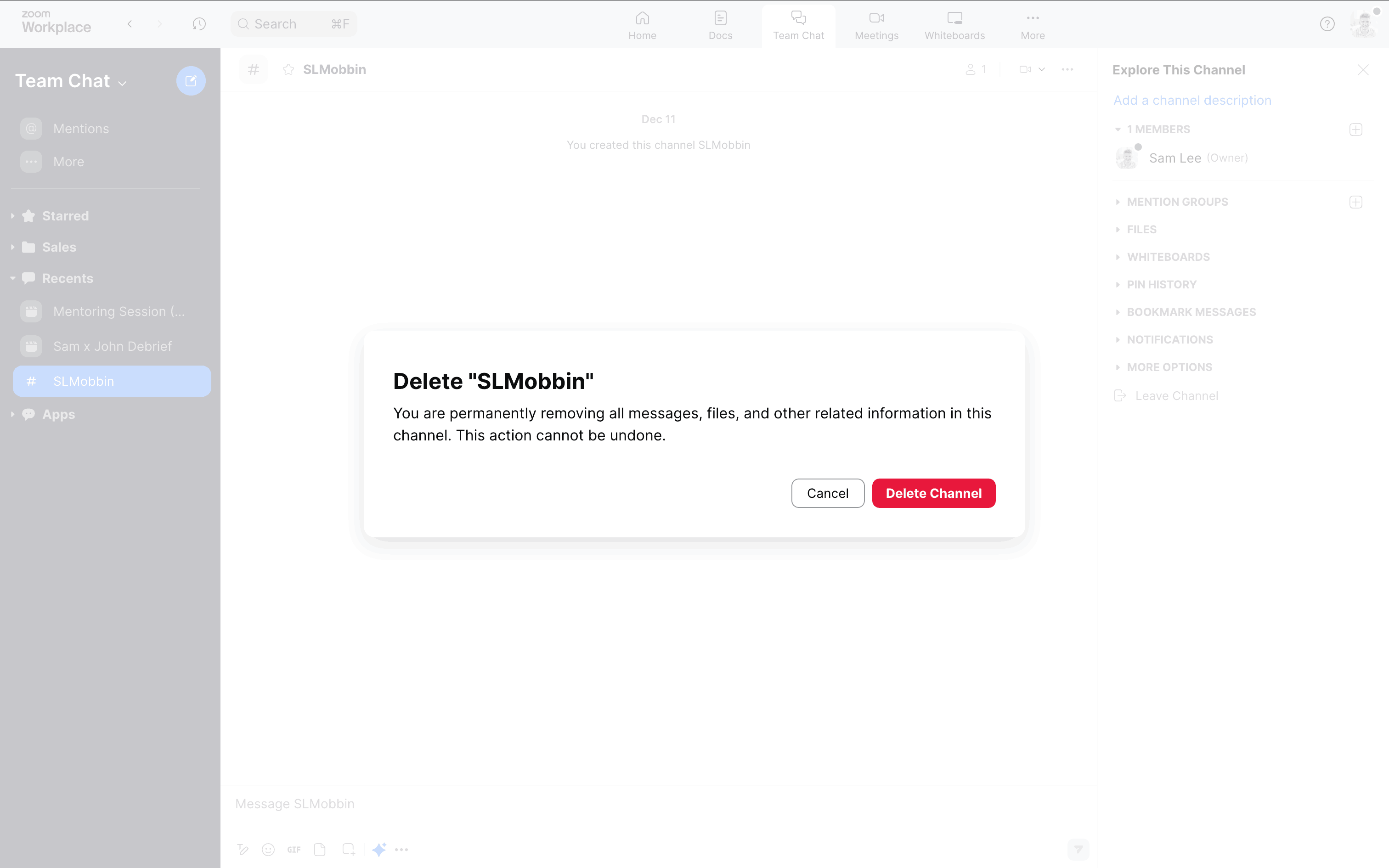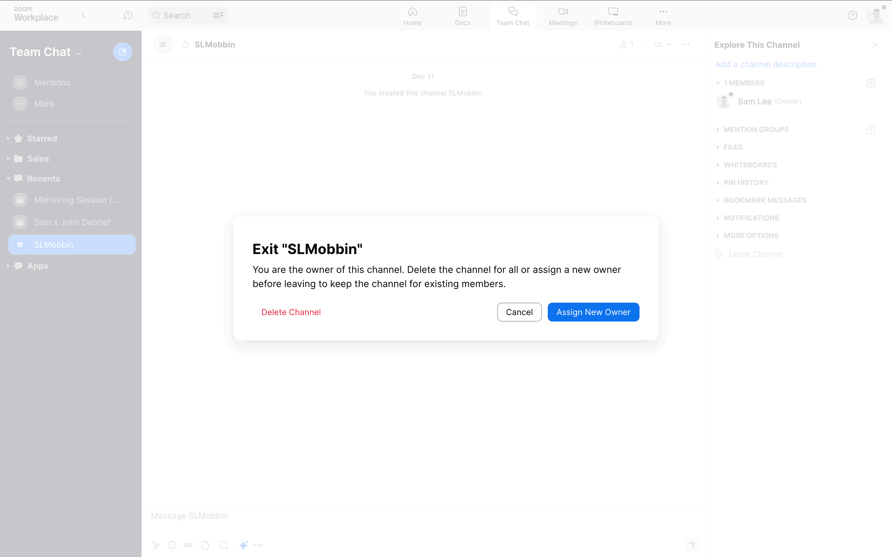 The user attempts to leave a channel, faces confirmation prompts due to ownership, and ends up in a different channel. The flow showcases the steps to leave or delete a channel.