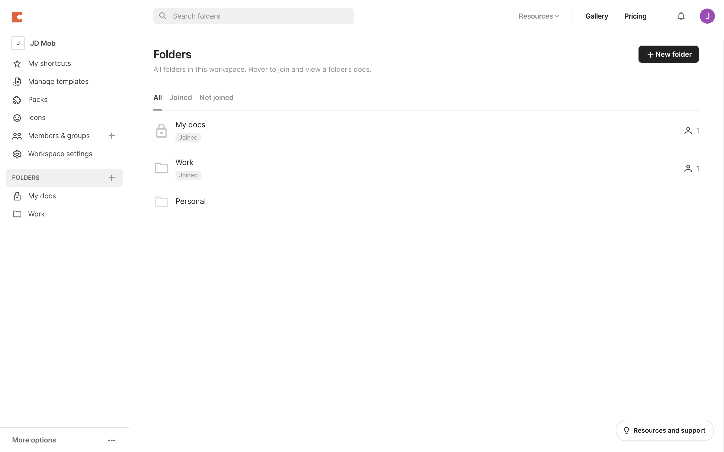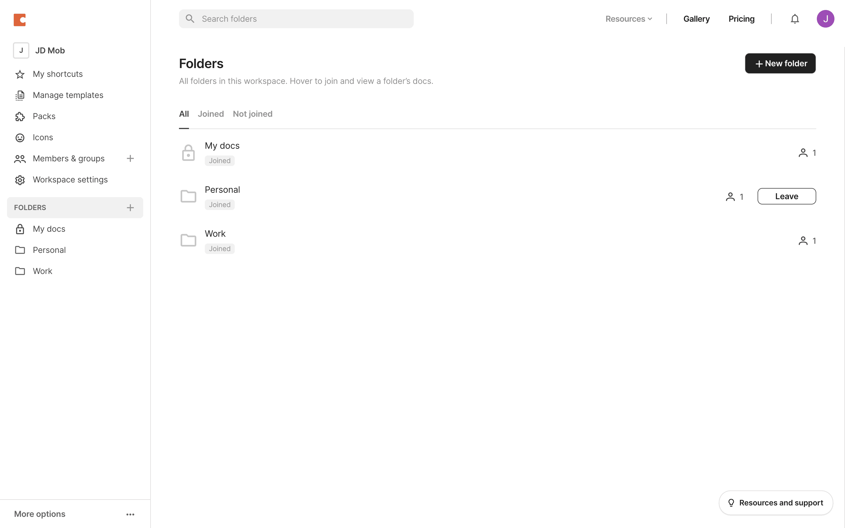 The user views a list of joined folders, selects a folder, and then leaves that folder. The folder is then removed from the list.