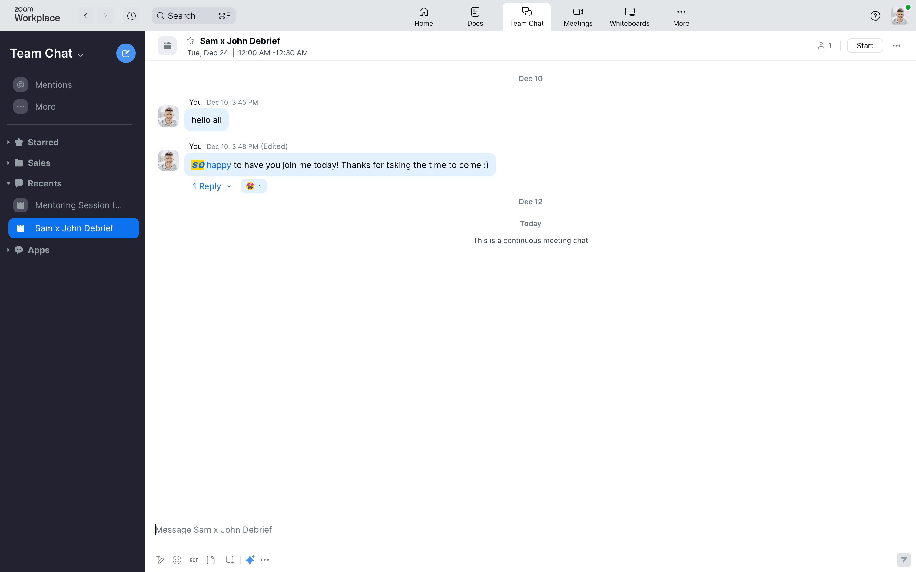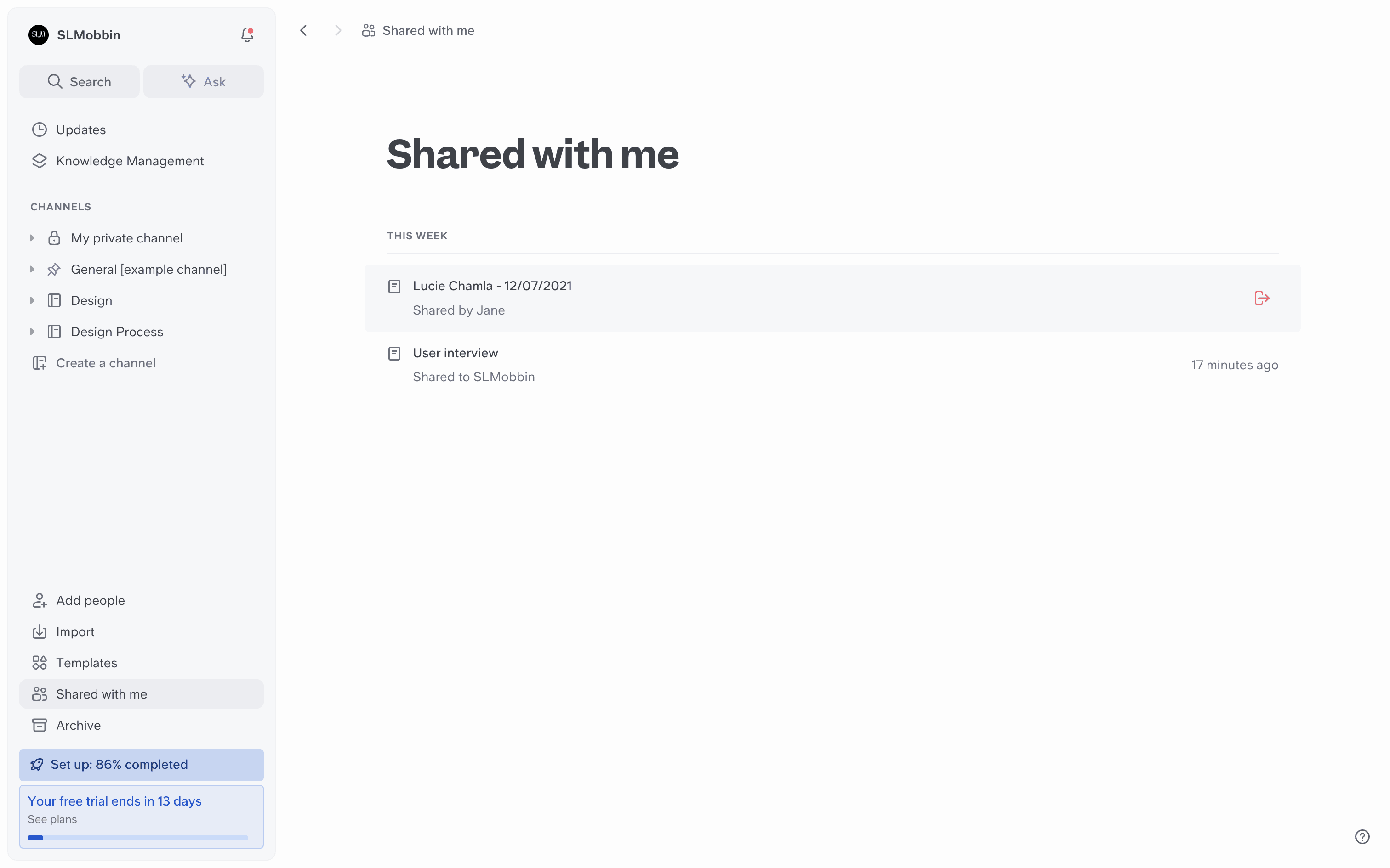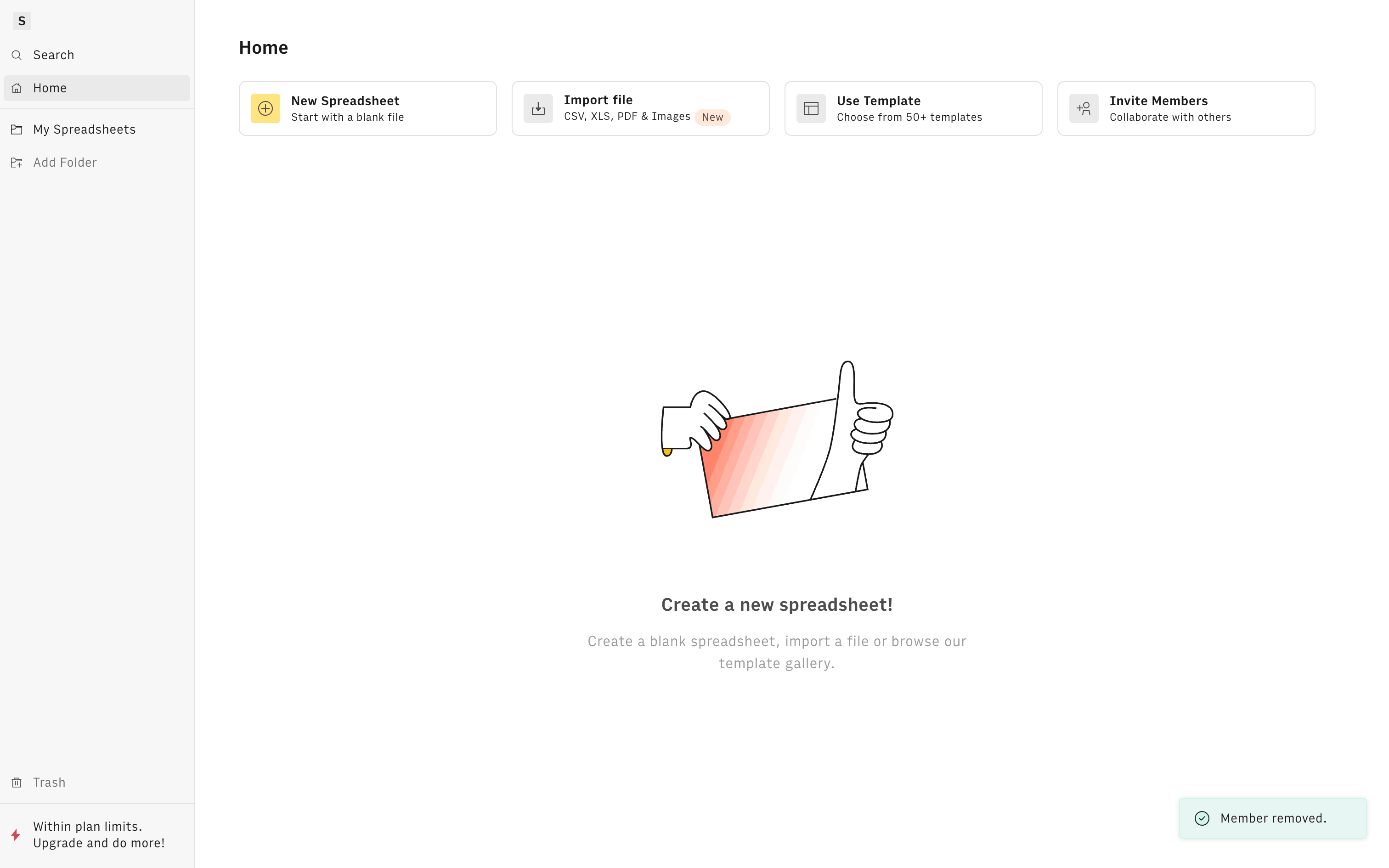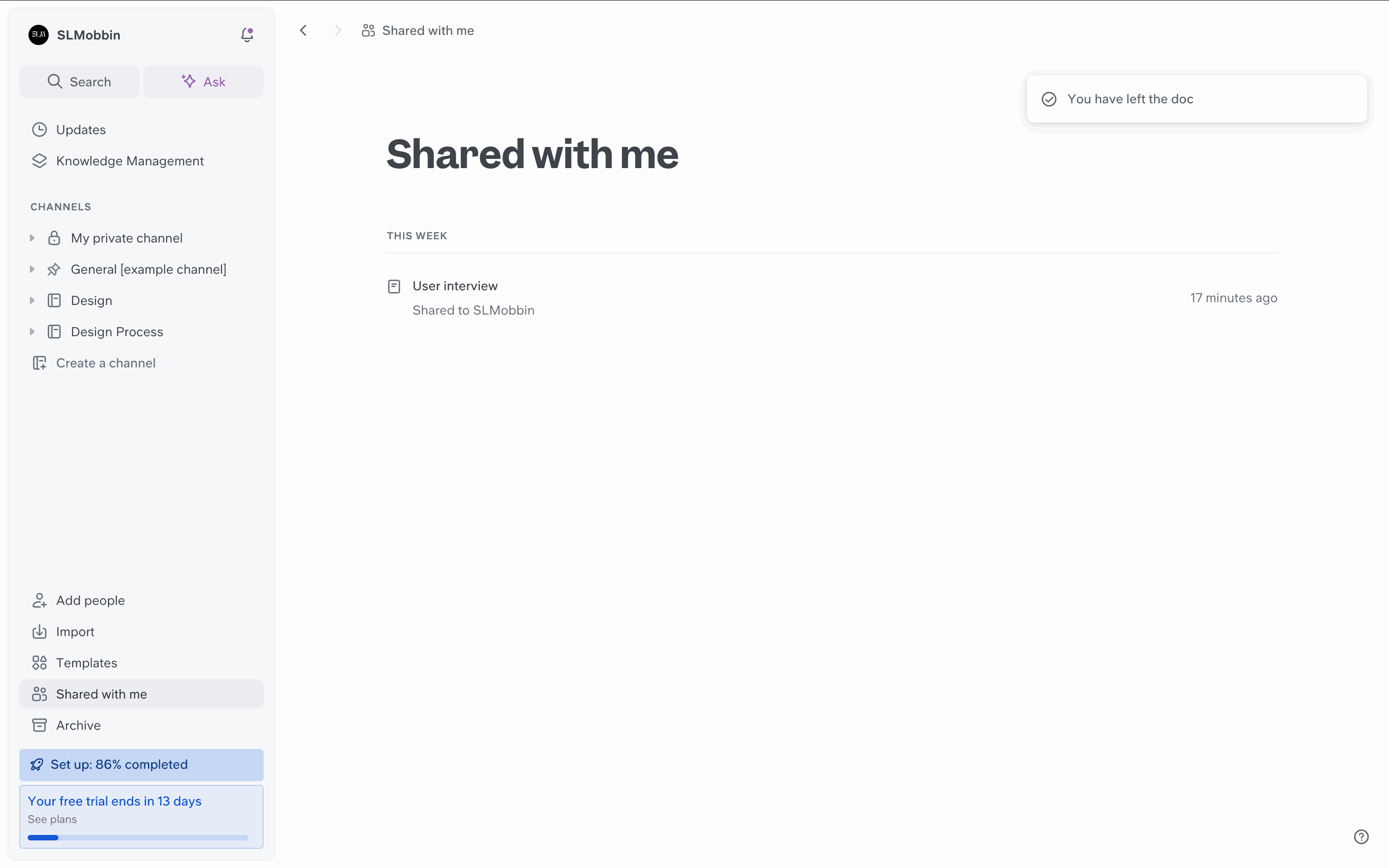 The user navigates from the workspace home page to leaving the workspace. This results in an empty home page with a confirmation message.