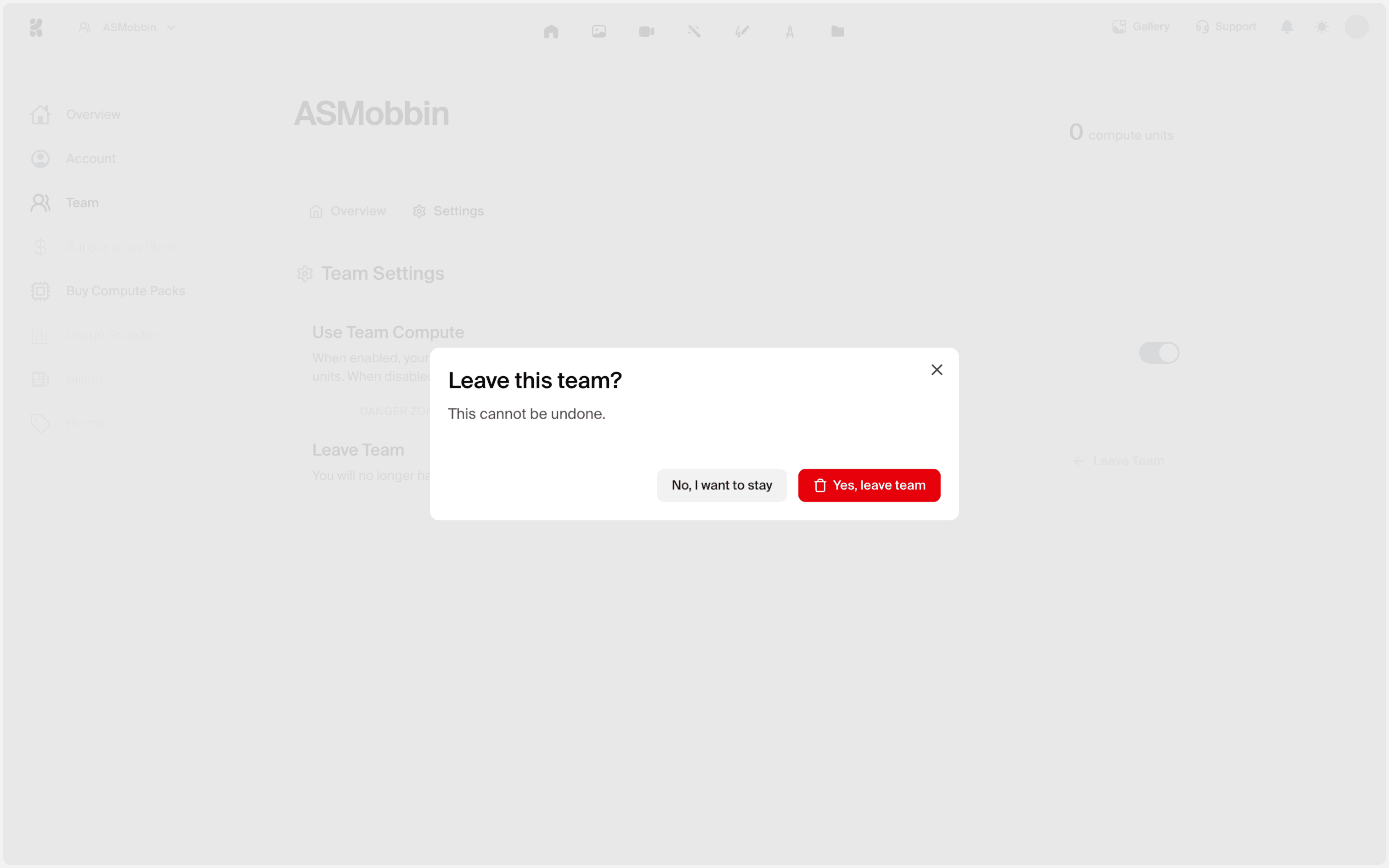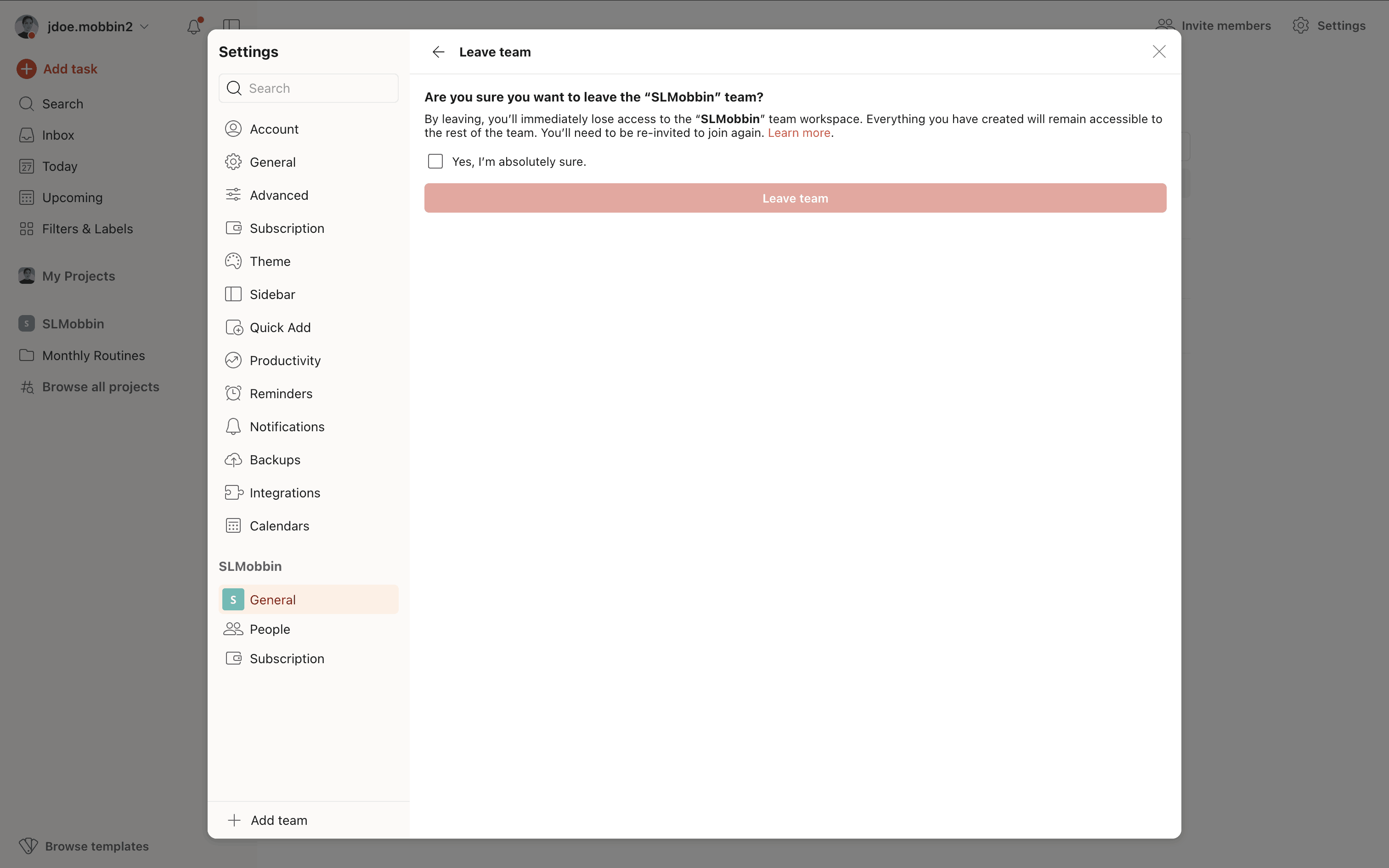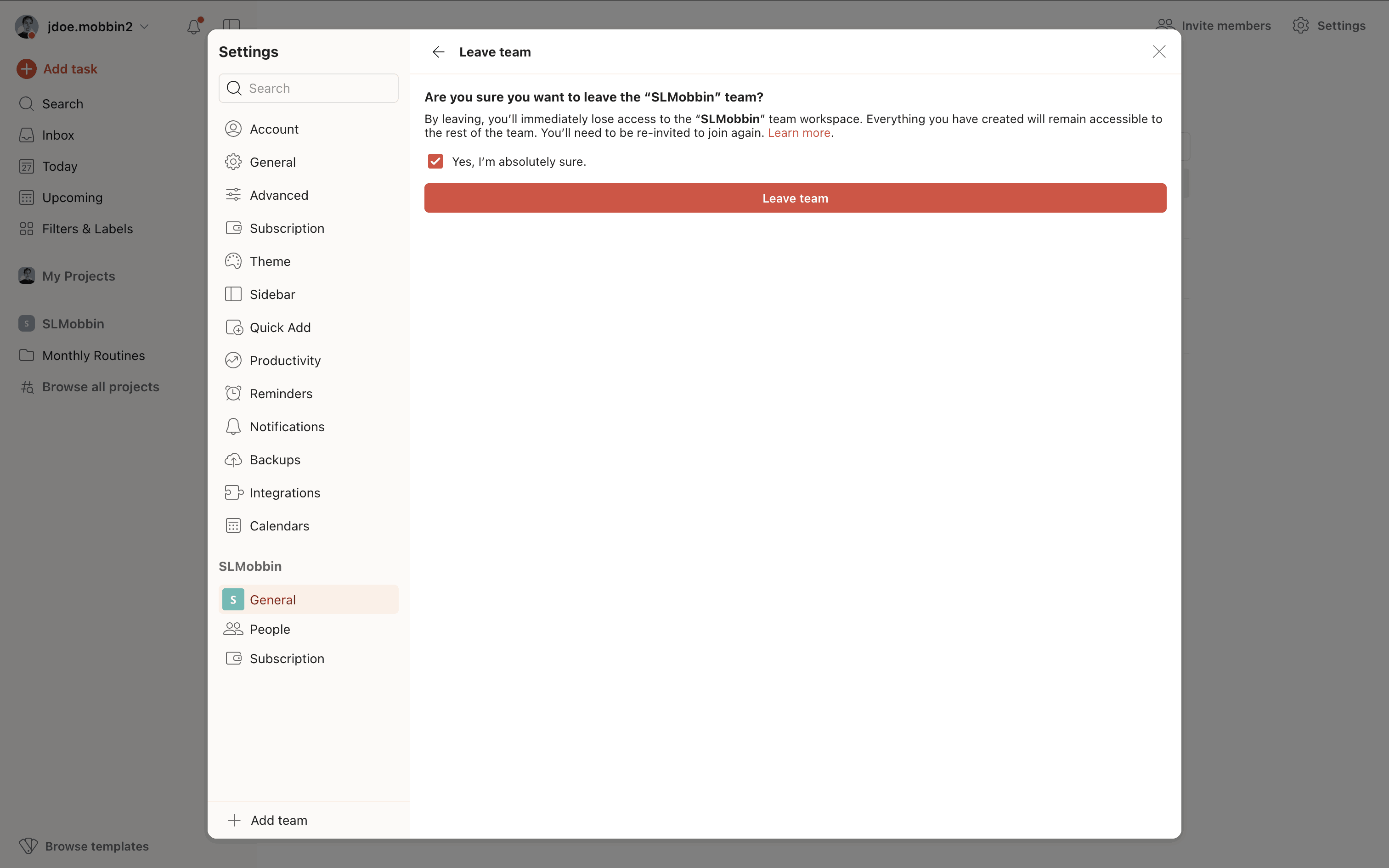 The user navigates to team settings, confirms leaving the team via a confirmation dialog, and is then redirected to the task view with a confirmation message.