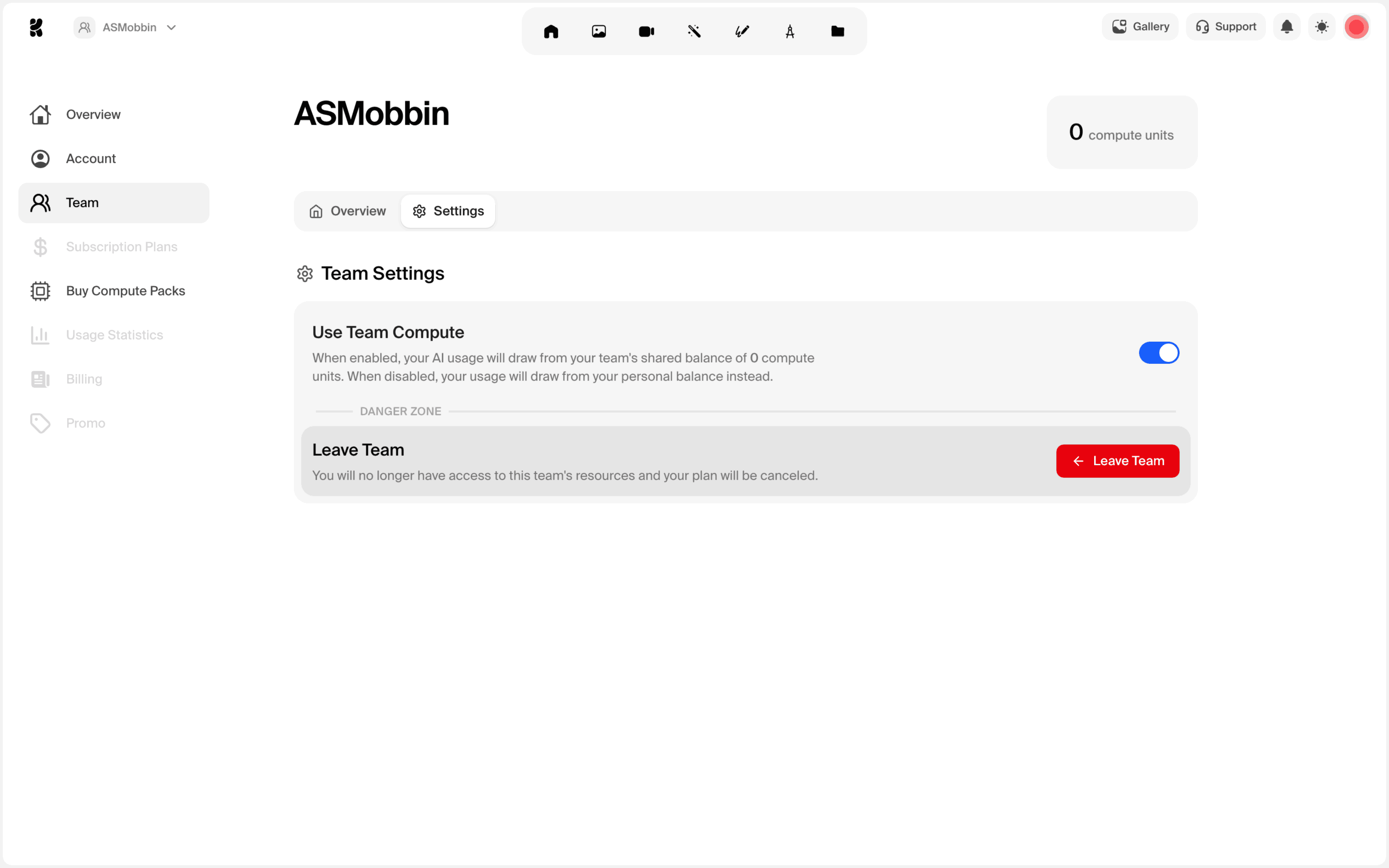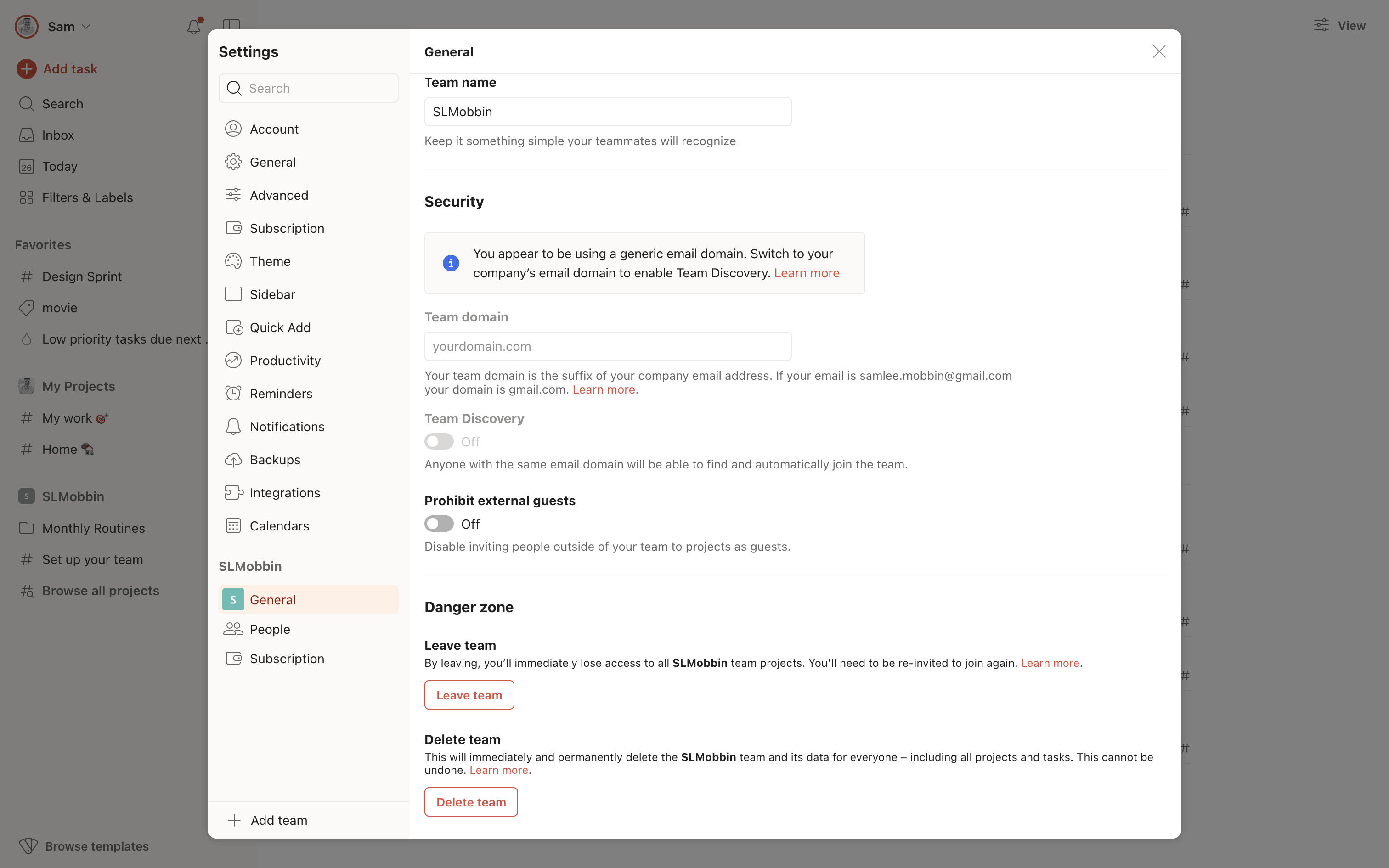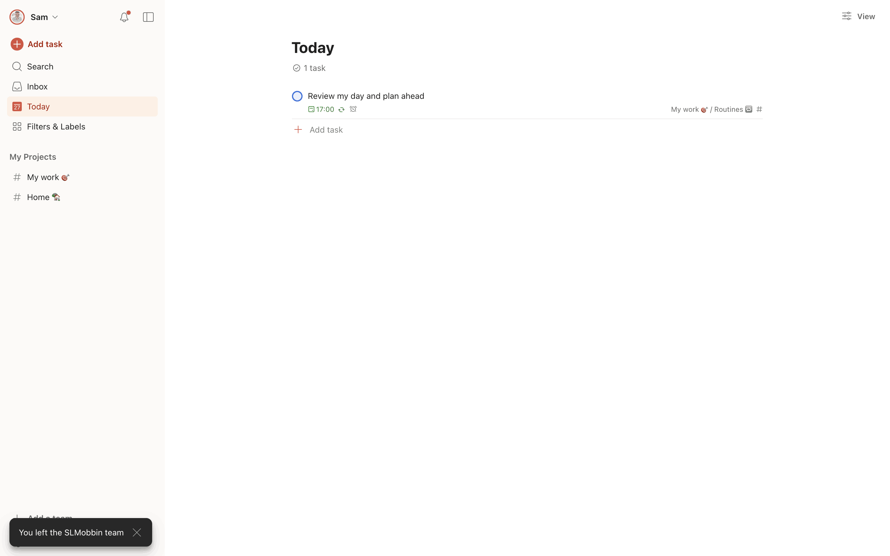The user navigates to team settings, confirms leaving the team via a confirmation dialog, and is then redirected to the task view with a confirmation message.
