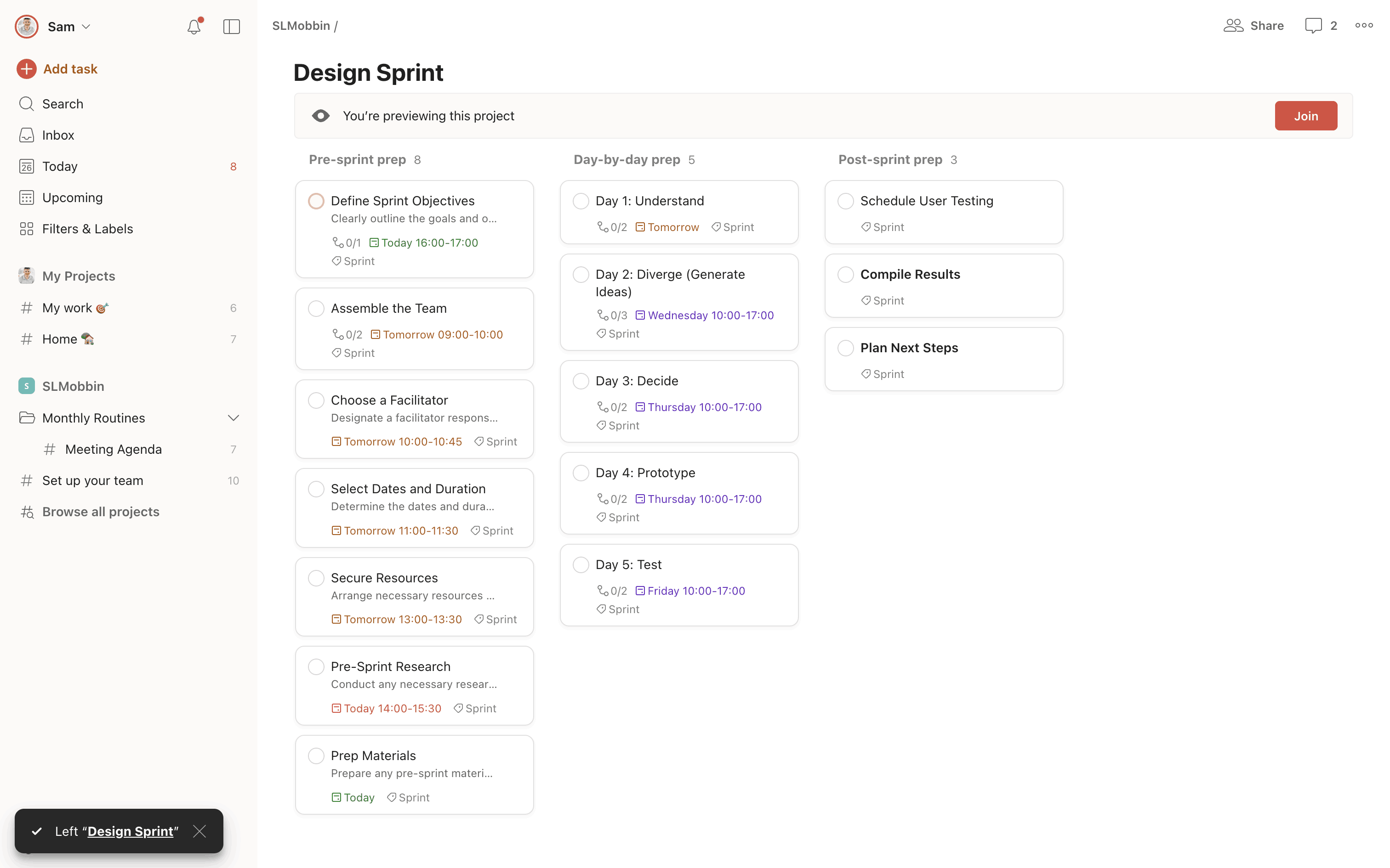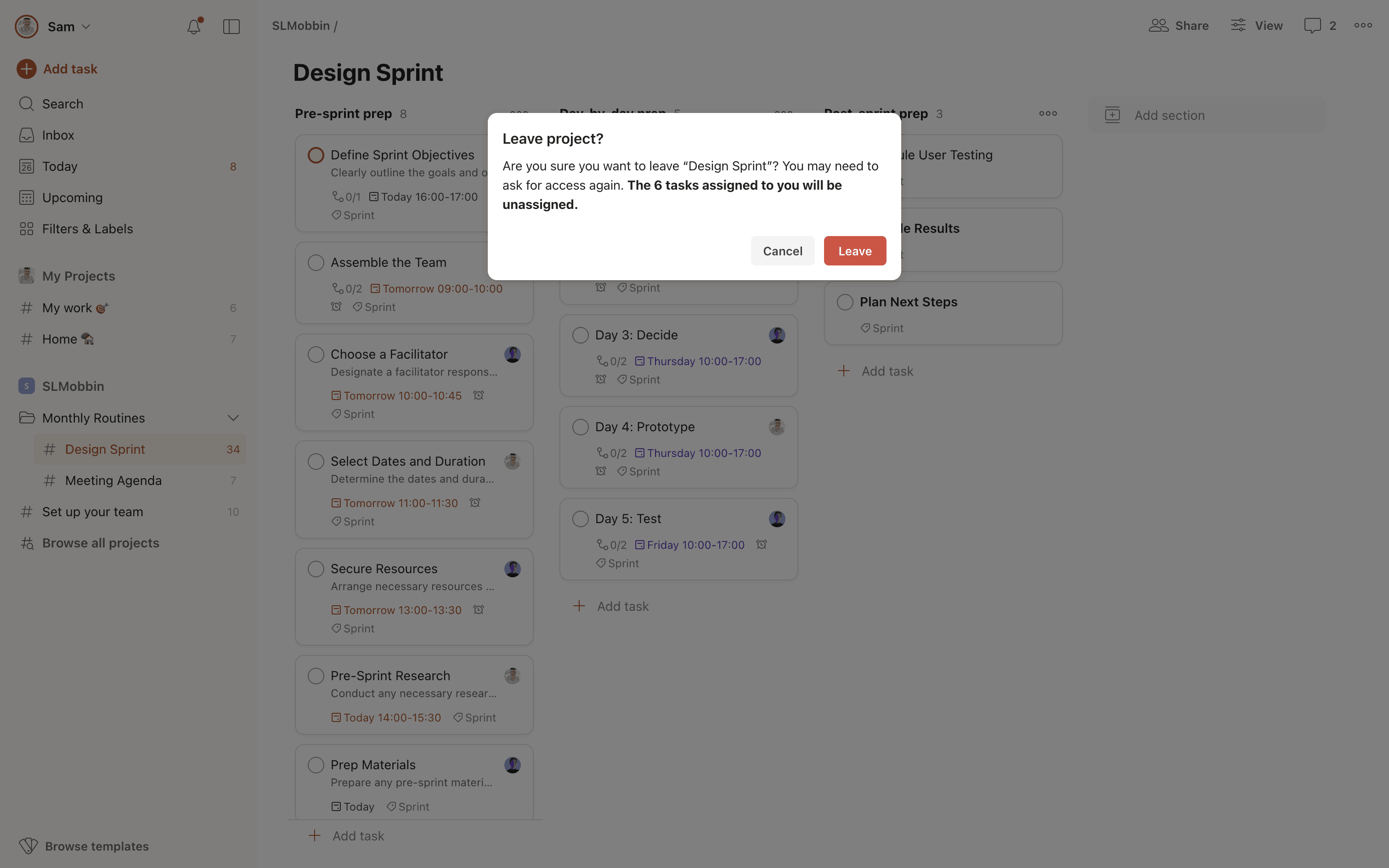 The user initiates the process of leaving a project, confirms their decision via a dialog, and ends up on a project preview screen. The user can rejoin the project from the preview screen.
