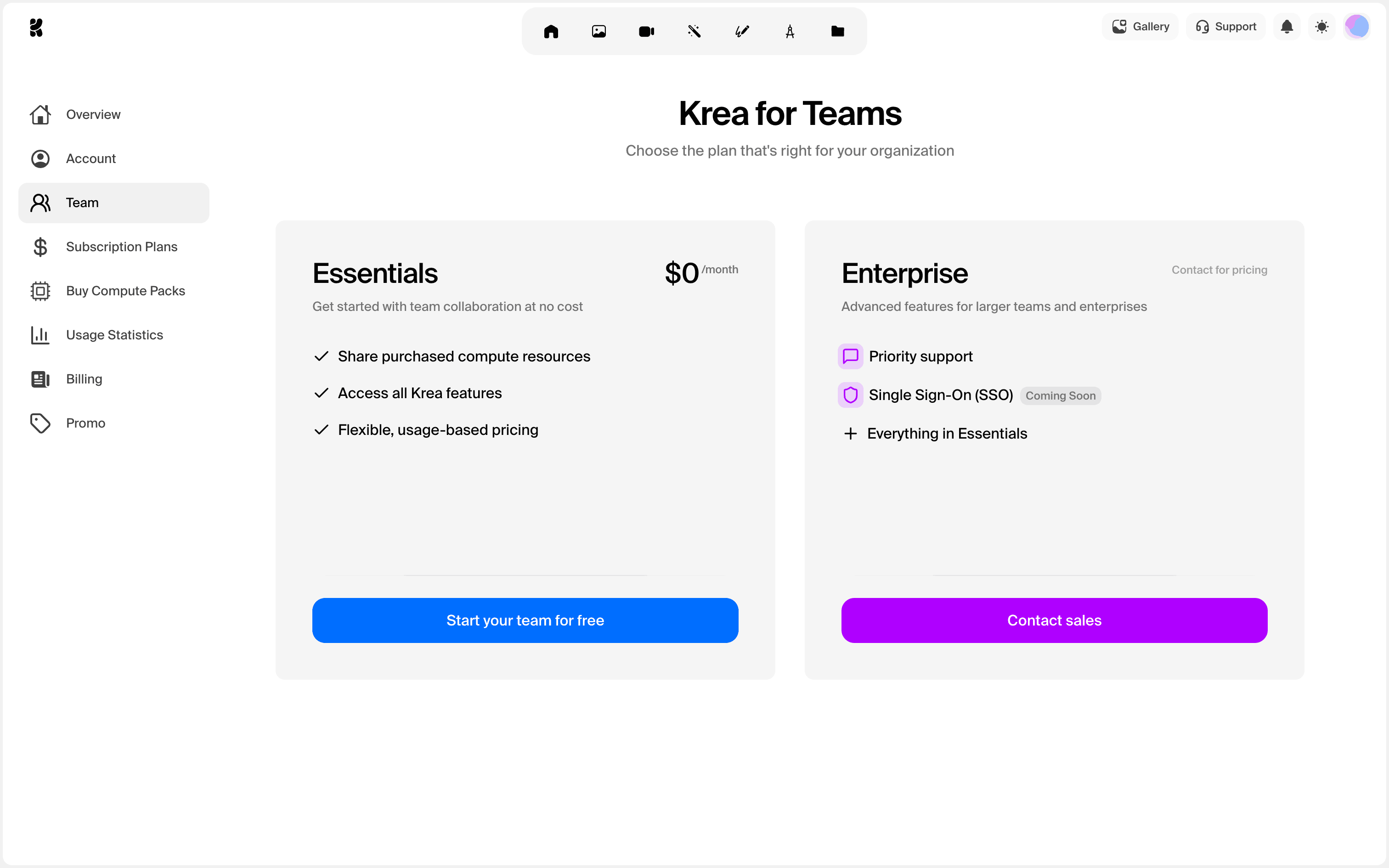 The user navigates to team settings, confirms leaving the team, and is then presented with team plan options. The flow depicts a user leaving a team and being prompted to start a new one.