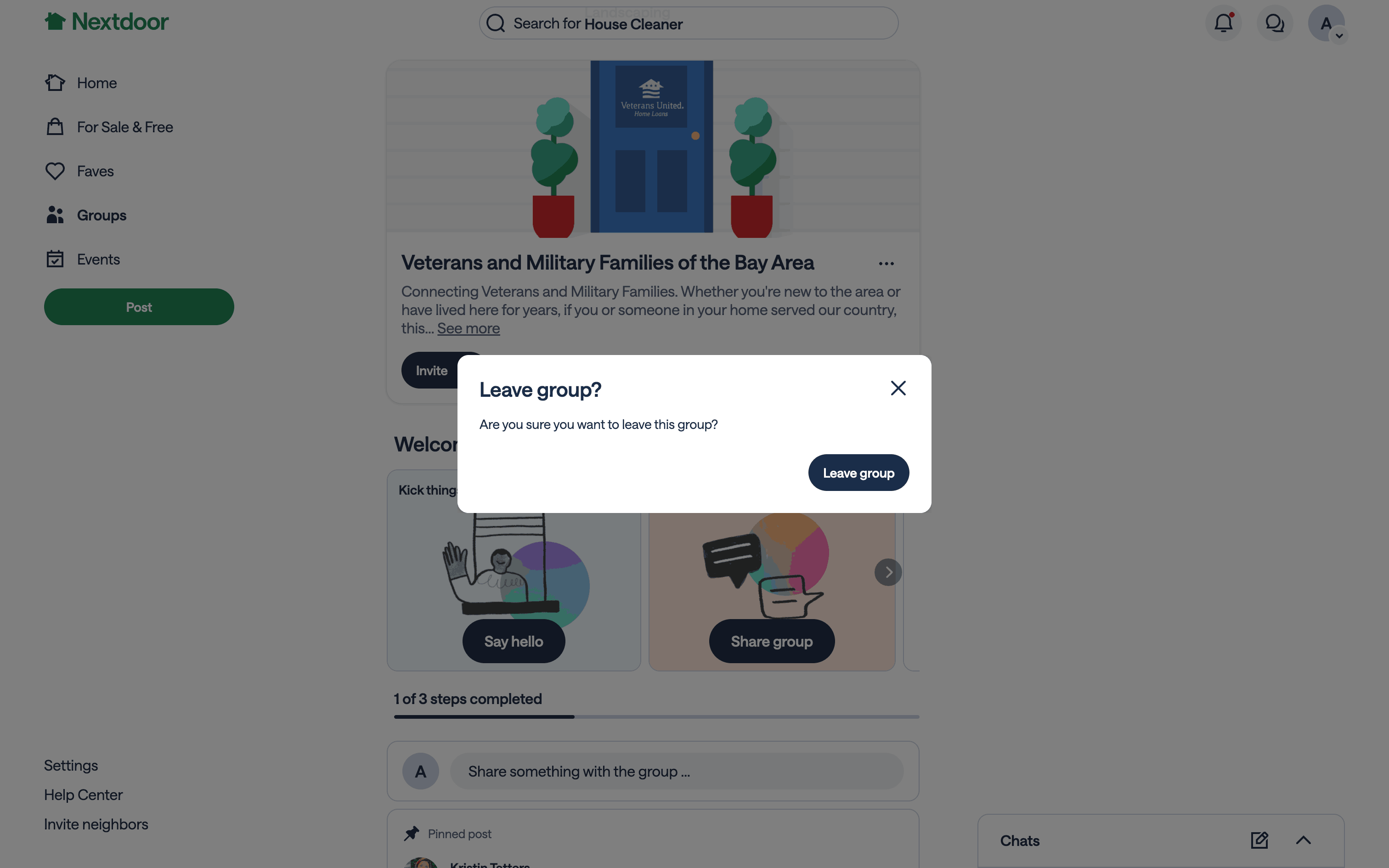 The user navigates to a group page, selects the option to leave the group, confirms their decision, and successfully leaves the group.